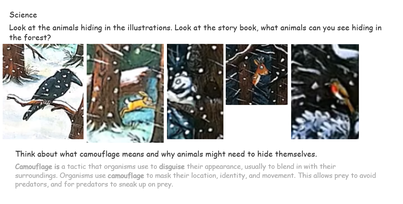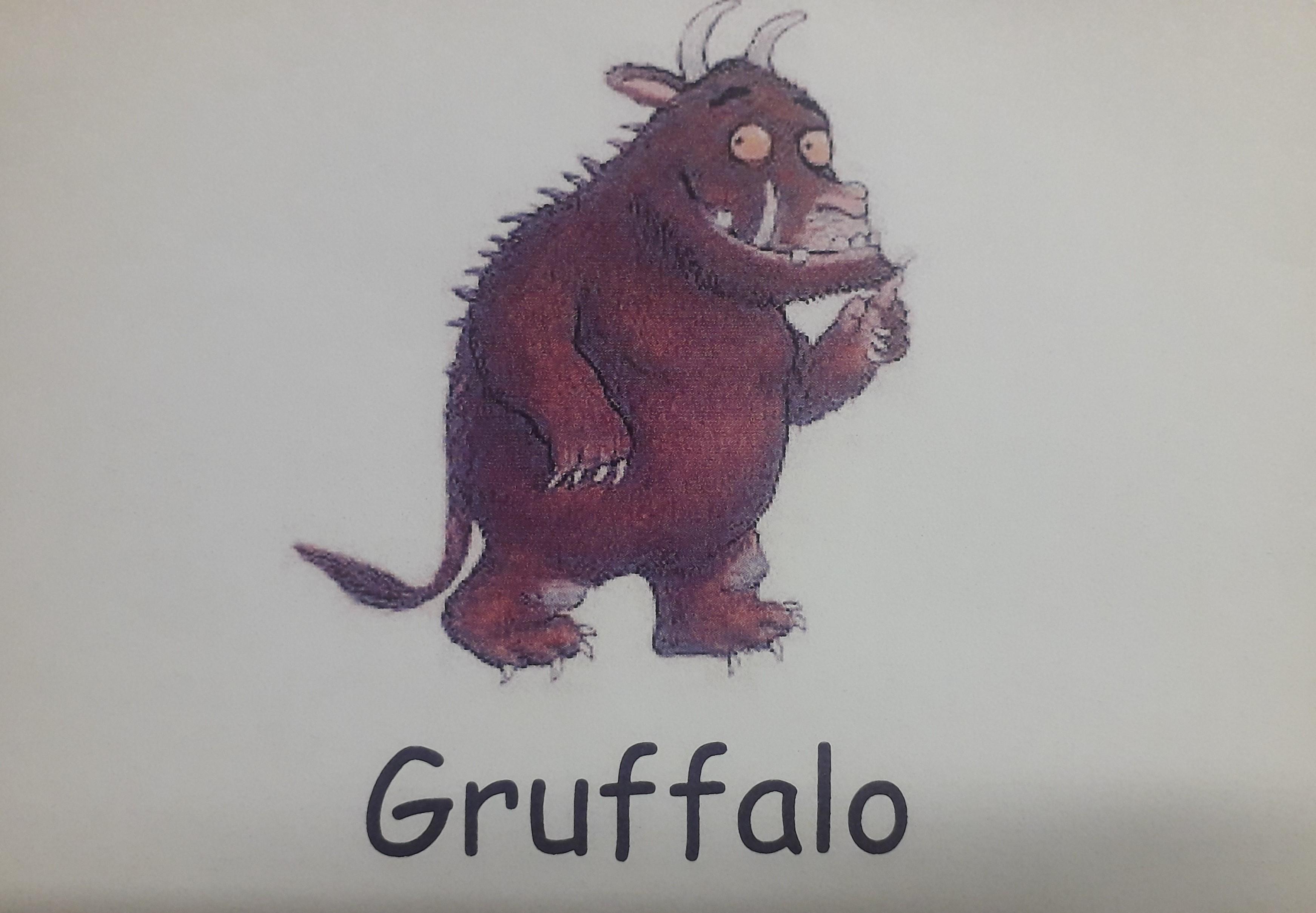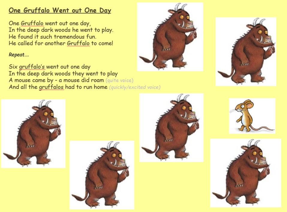 In your child's remote learning pack this week - there are some pictures of the characters. Show your child these characters one by one – naming each one in turn. Encourage your child to repeat the character's name. Encourage your child to make the sound of each animal e.g. mouse - squeak, snake - hiss, owl - hooting, Gruffalo - growling etc.