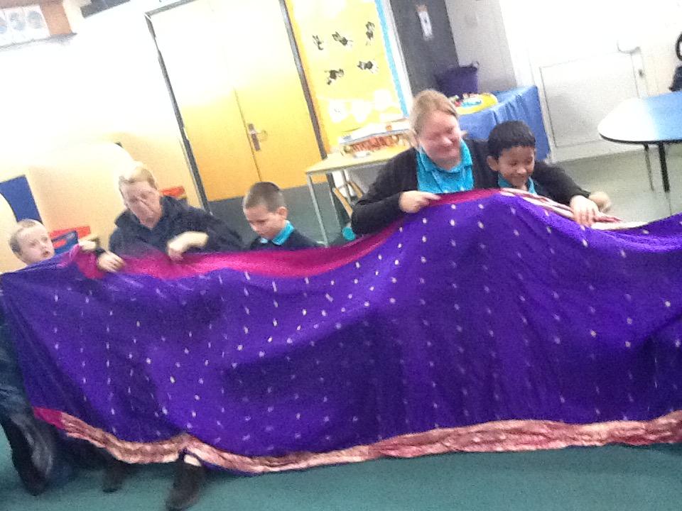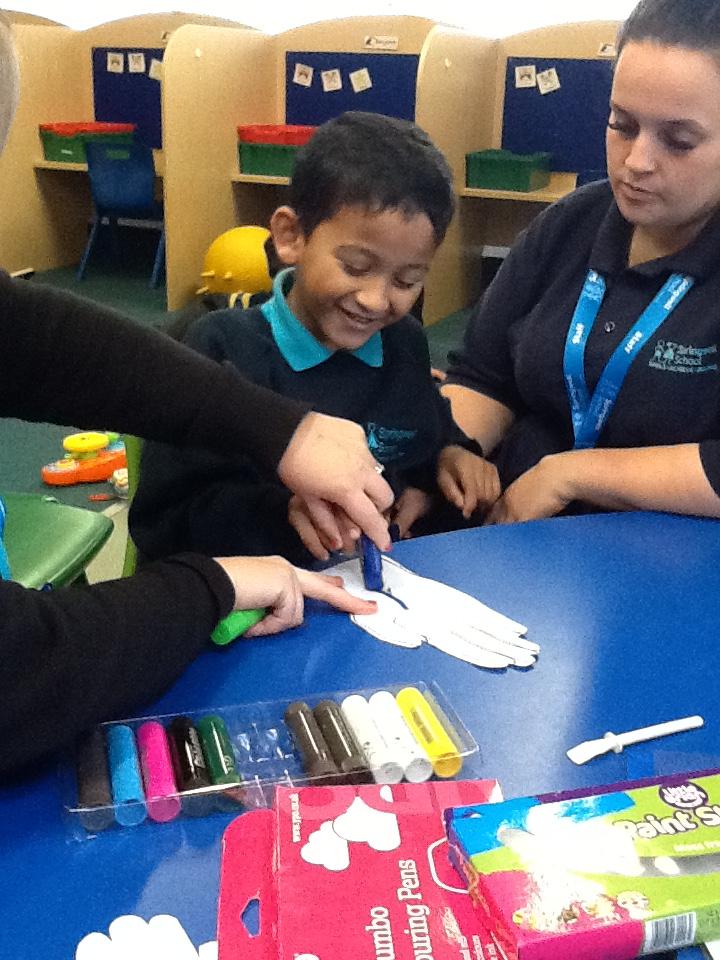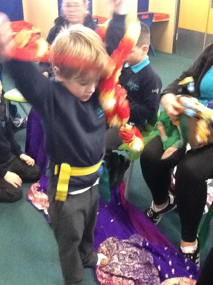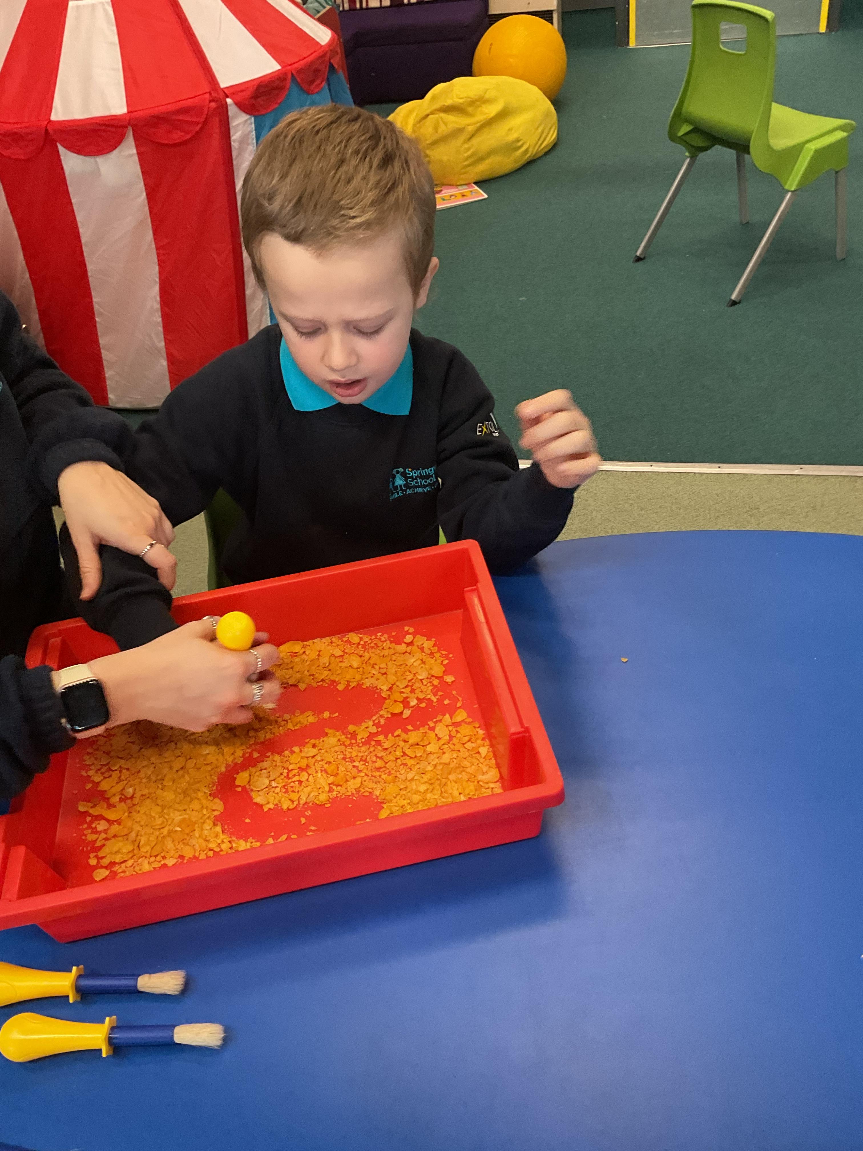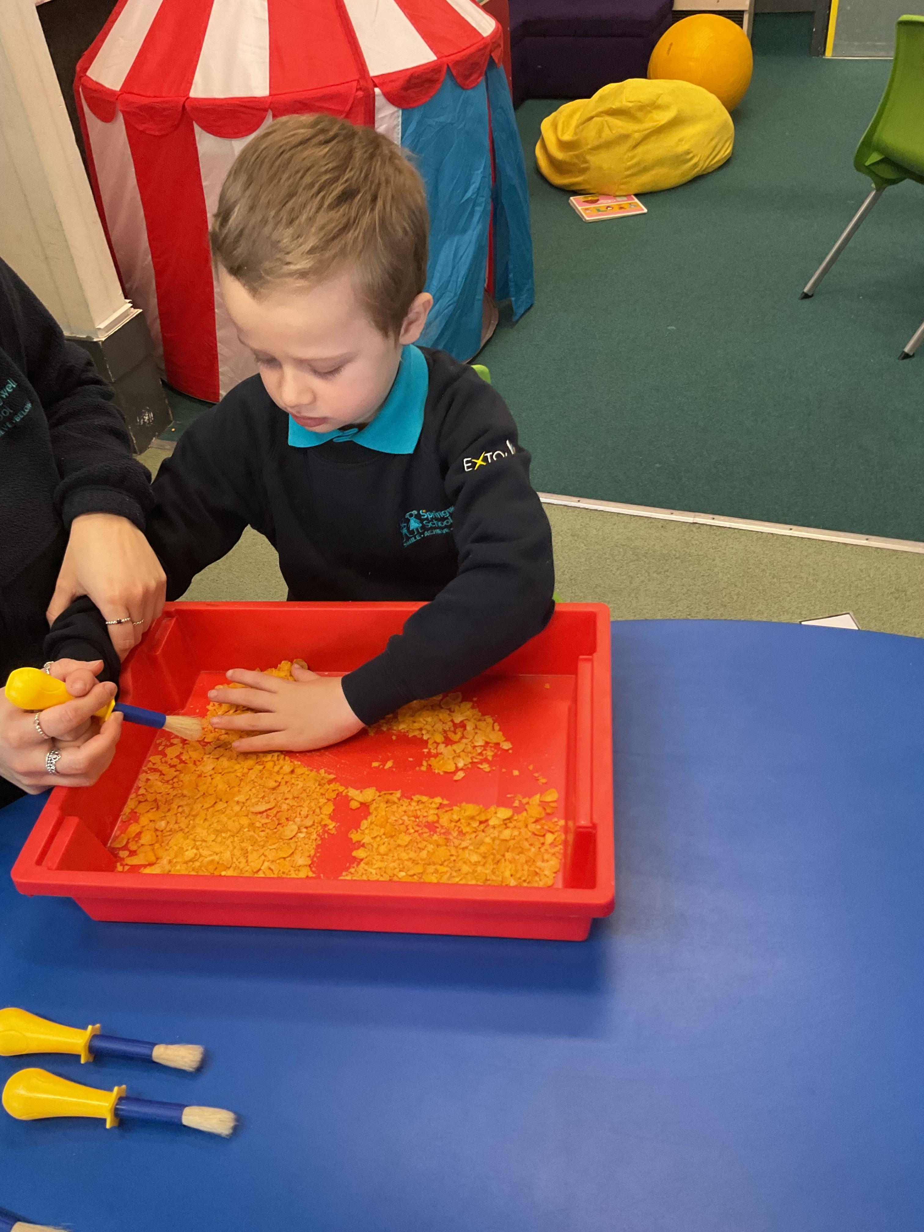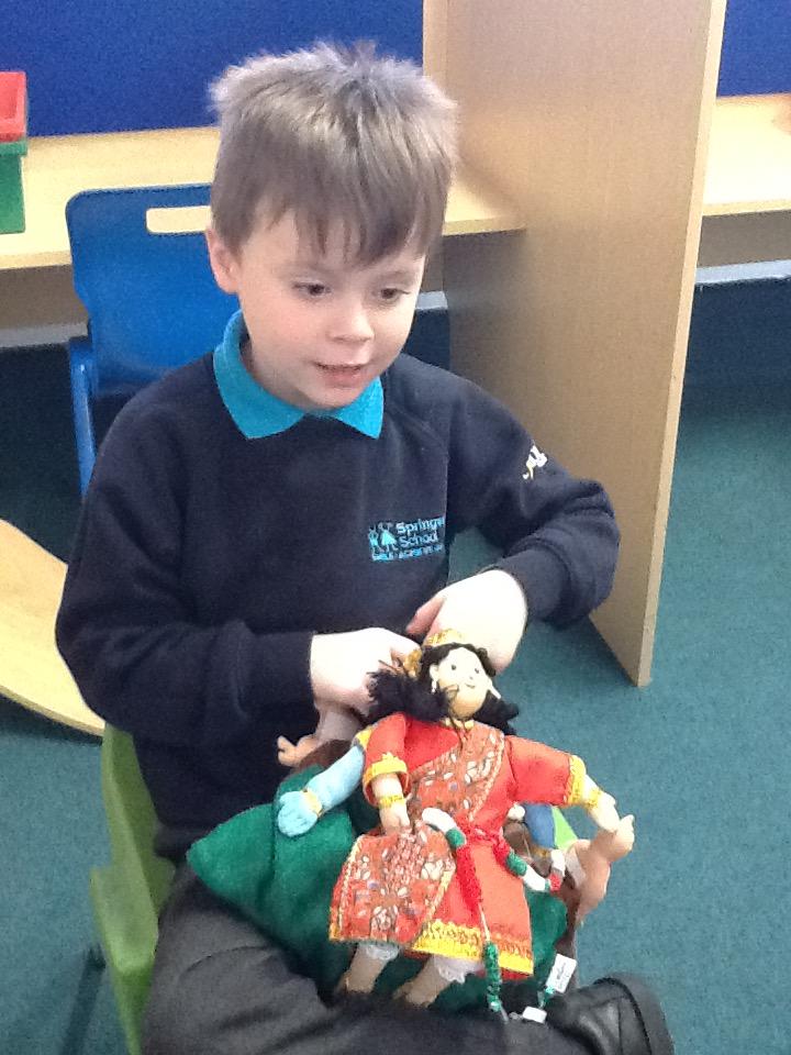 Today we have been celebrating Diwali, we have been learning about the Gods and dressed up in the costumes and explored the props whilst listening to 'The Hindu Story of Rama and Sita'. We have also been exploring the patterns that are associated with Diwali and created our own Mehndi patterns on hands and also explored a Rangoli pattern in the tuff tray.