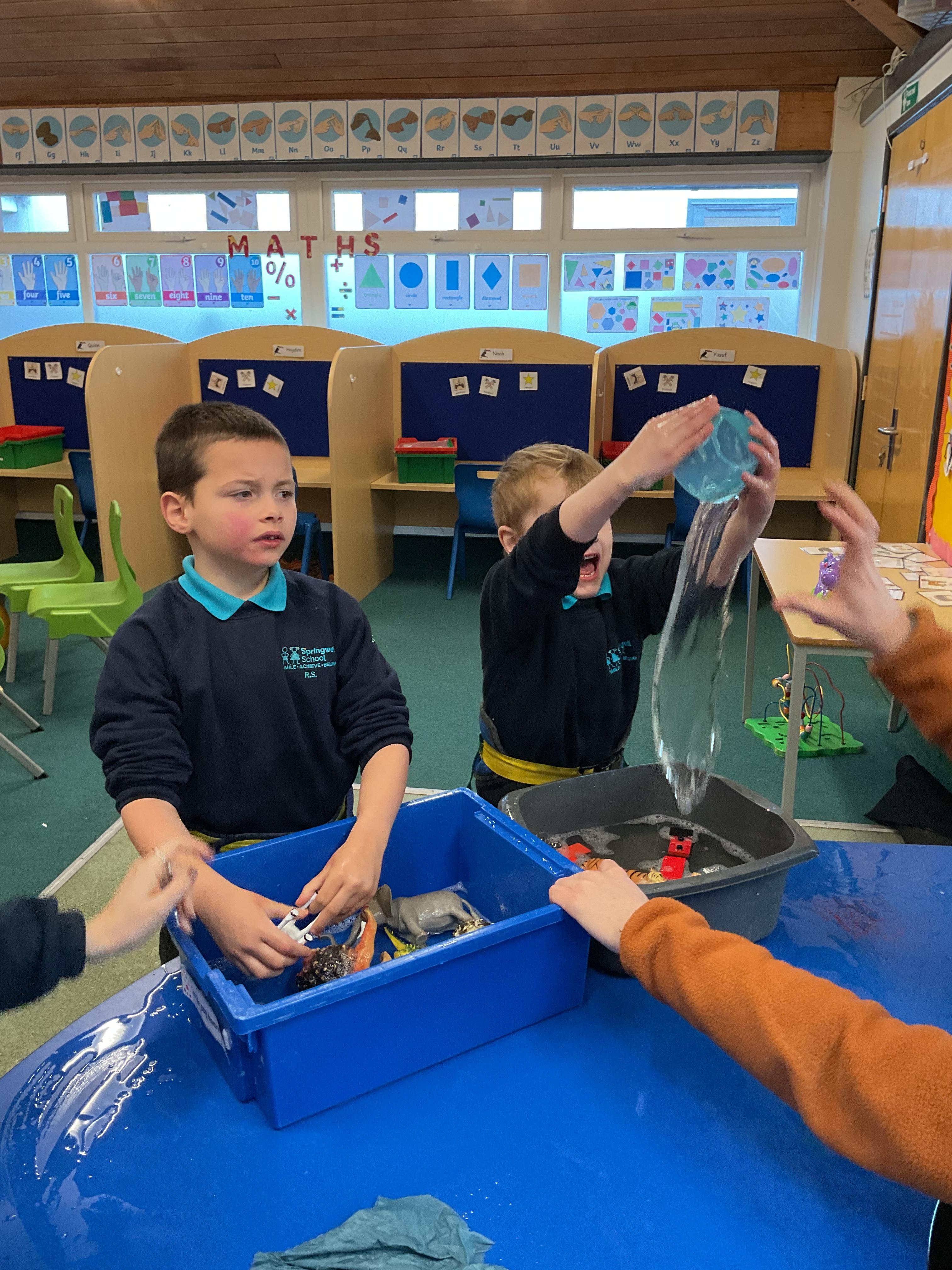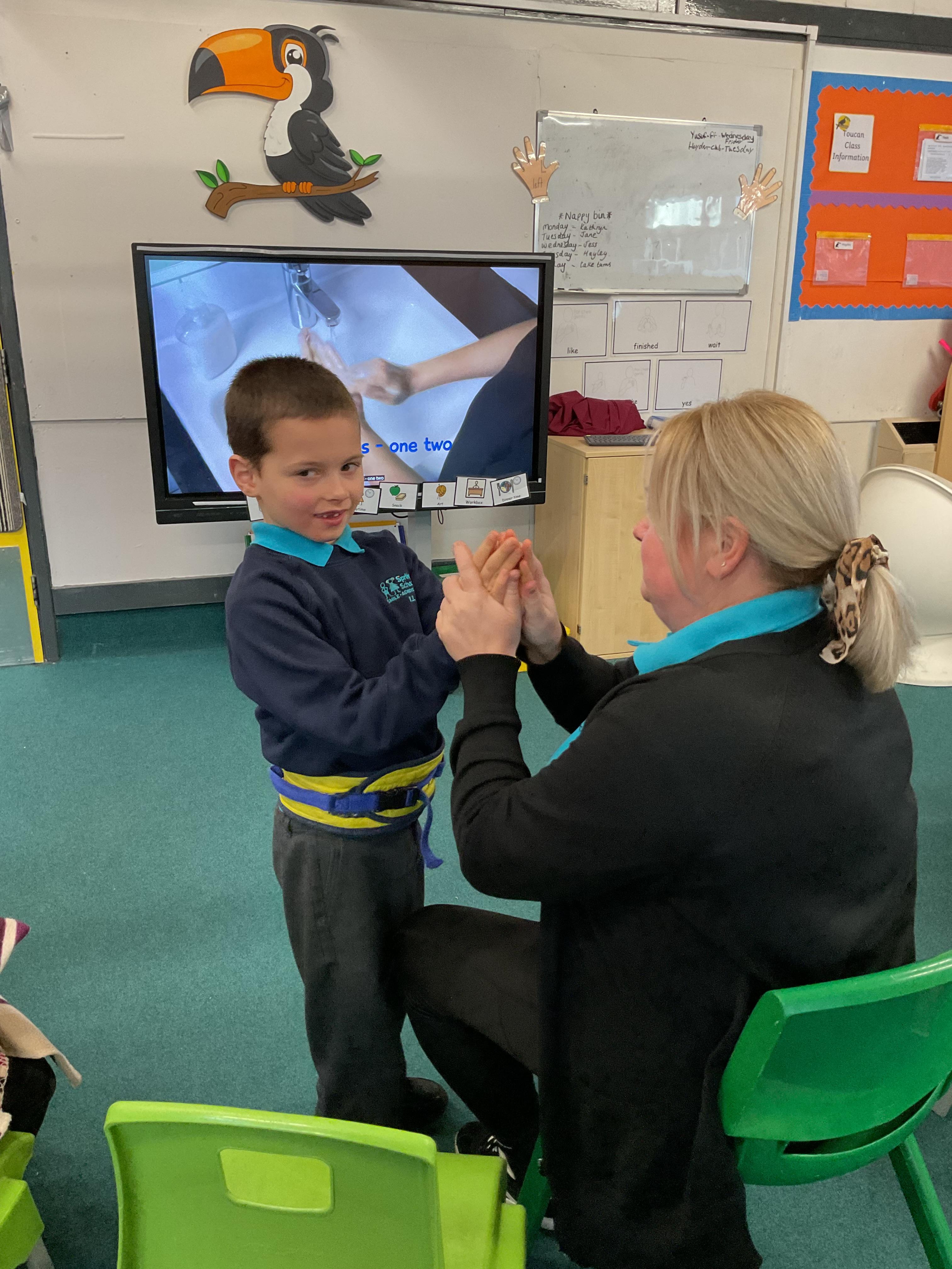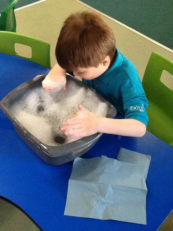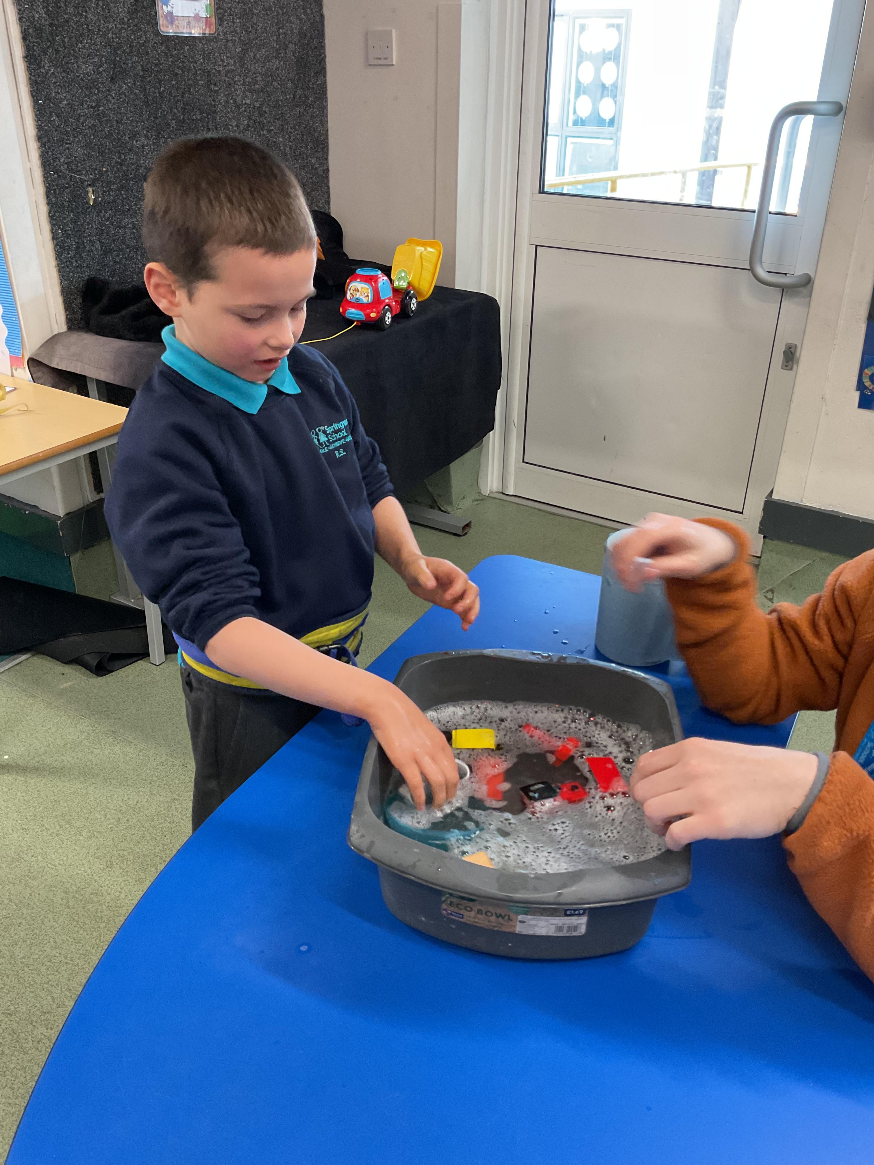 Today we have been practising washing our hands. We used glitter to represent the germs then washed it all off using soap and water. We did very well and then enjoyed washing our toys in the water afterwards.