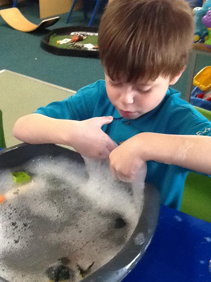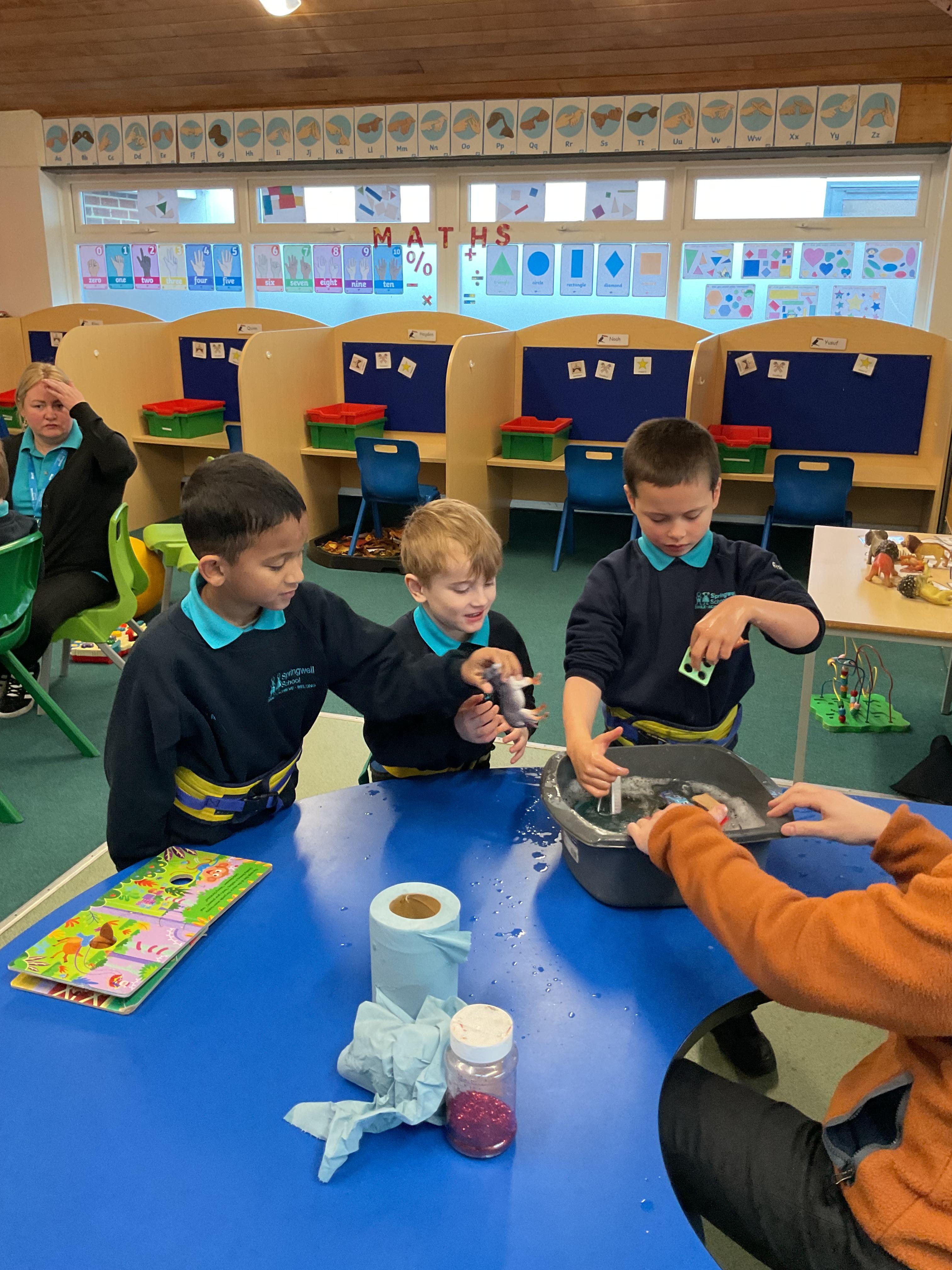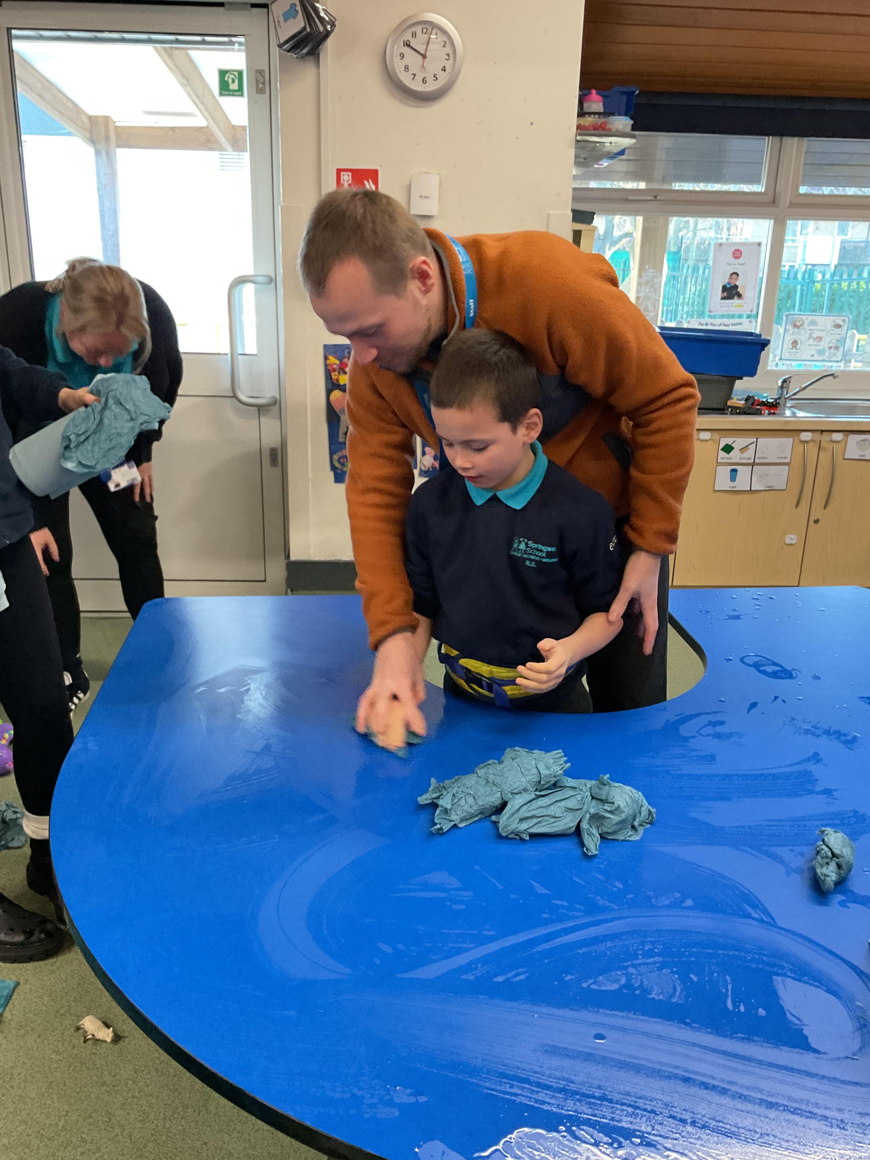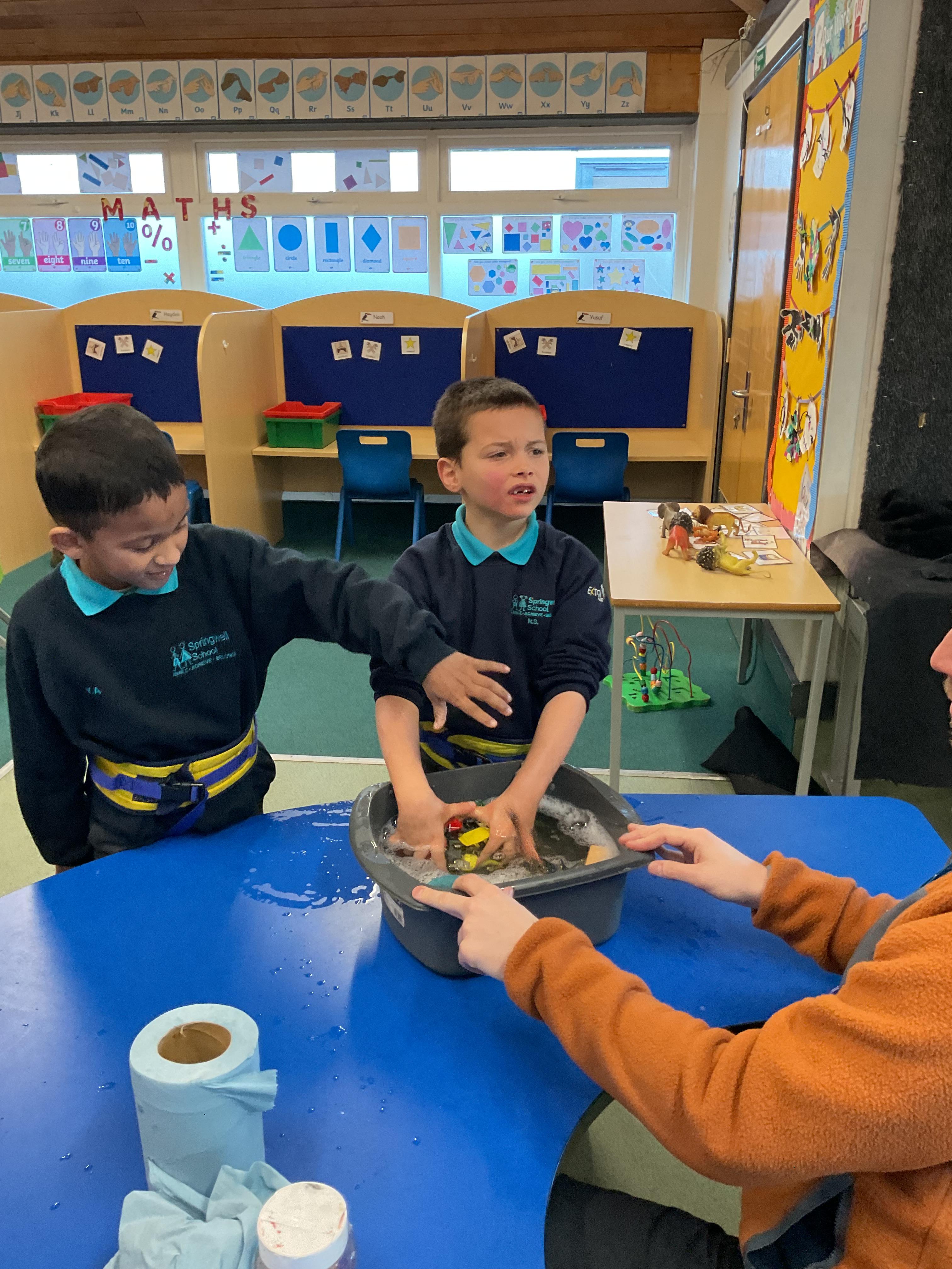 Today we have been practising washing our hands. We used glitter to represent the germs then washed it all off using soap and water. We did very well and then enjoyed washing our toys in the water afterwards.