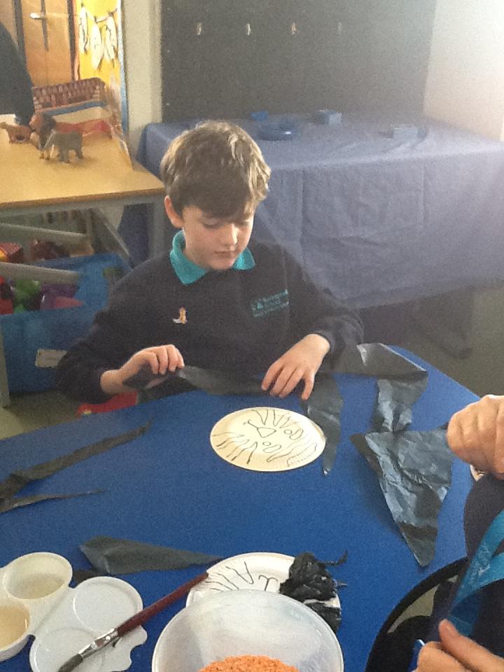 Today we made tiger faces, which links to our story 'spot goes to the circus'. We used paper plates, tissue paper and lentils. We ripped up black tissue paper to glue for the stripes and then poured the lentils on top to make the orange fur.