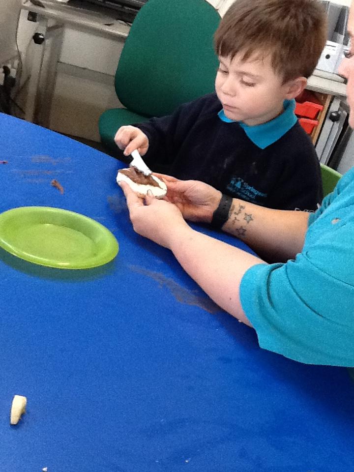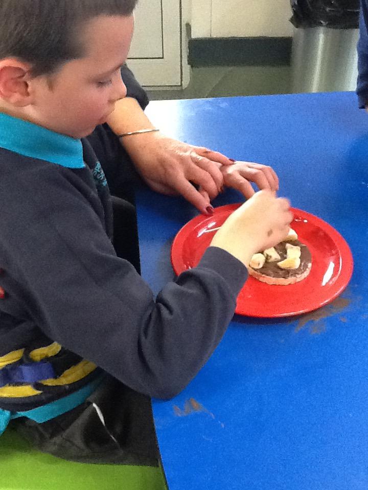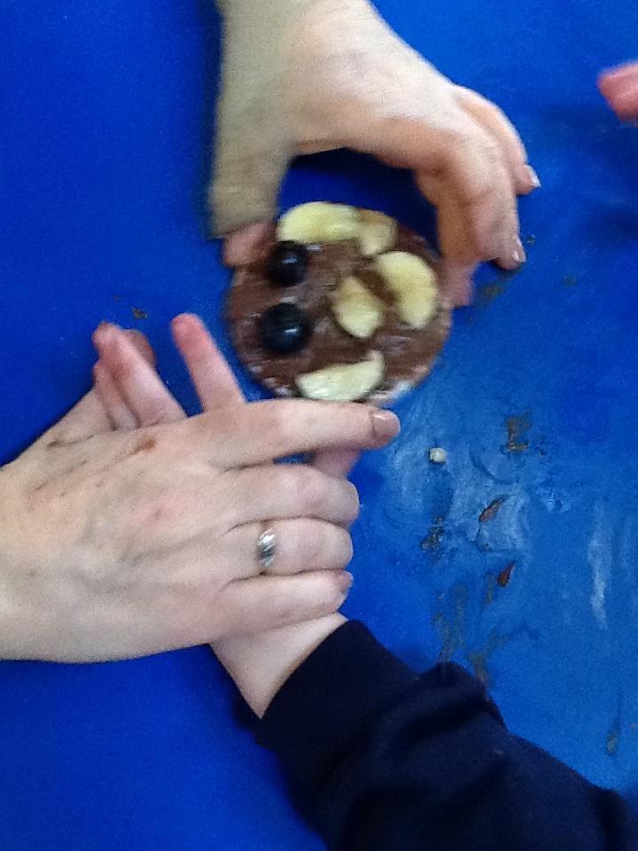 Today we made monkey rice cakes. We use our fine motor skills to spread the nutella onto the cakes and places the banana and blueberries on top to make the monkeys face. We even got to taste them at snack time they were delicious!