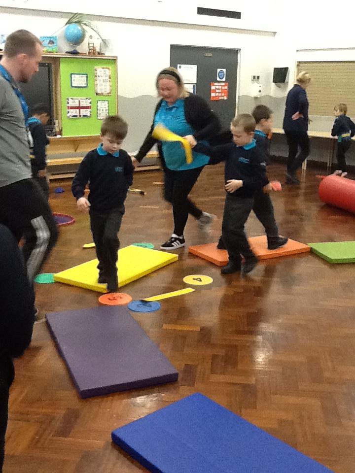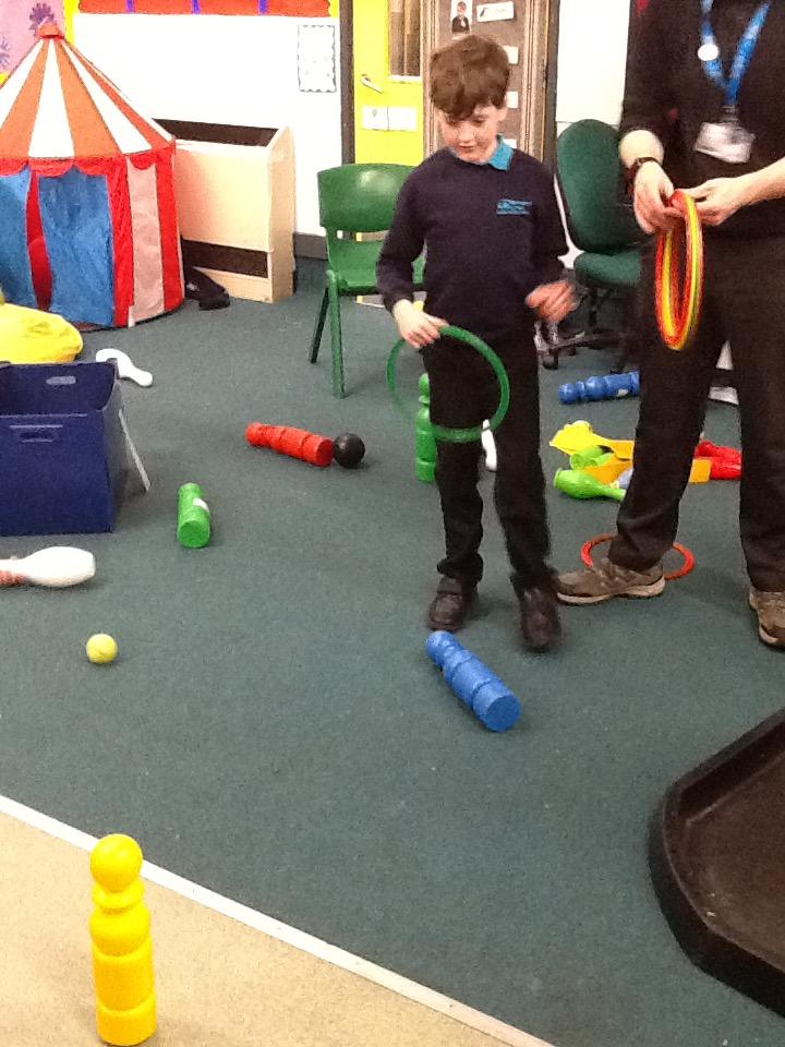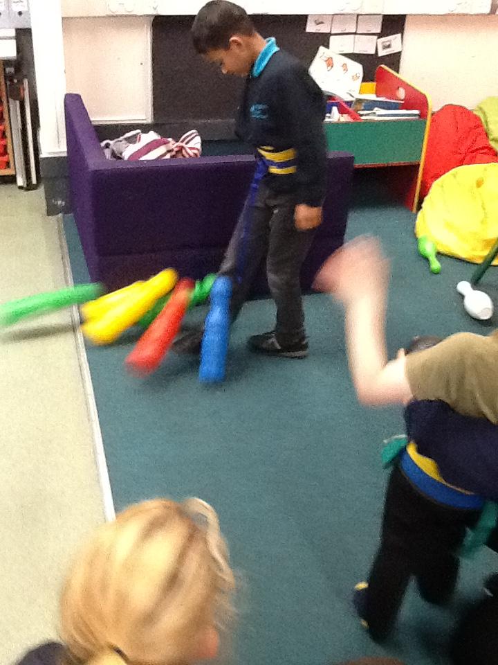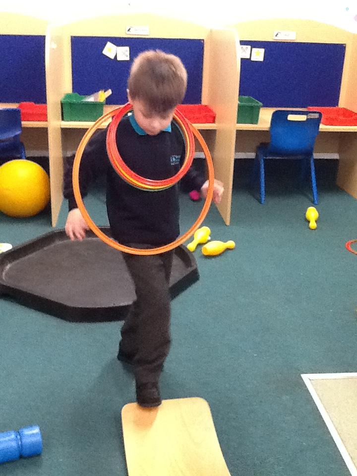Today we set up lots of activites in the hall to explore, we were using our gross motor skills to run, jump, throw and catch.