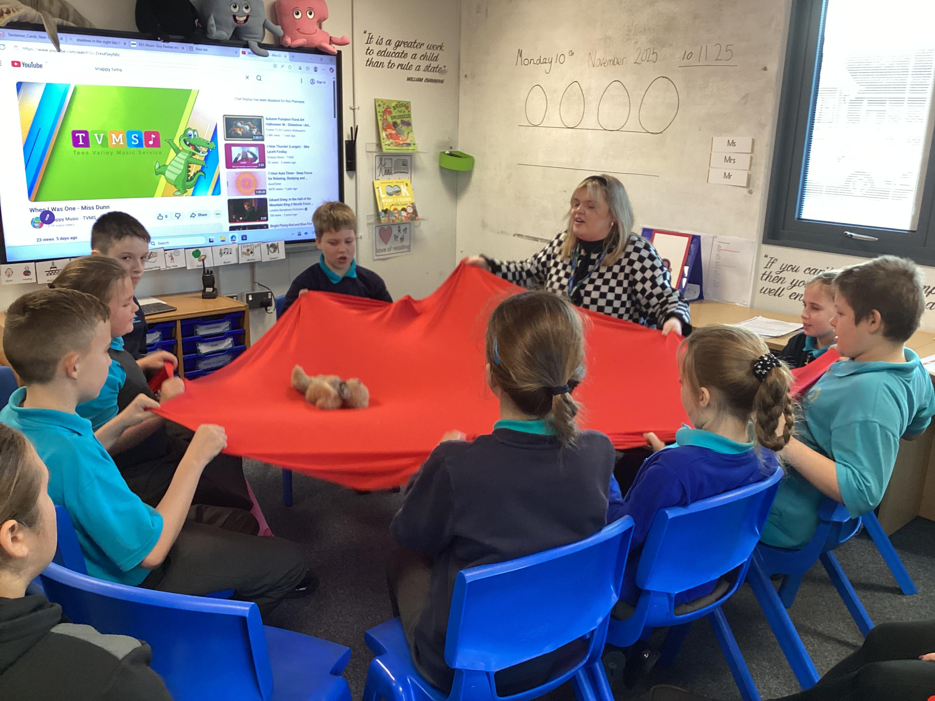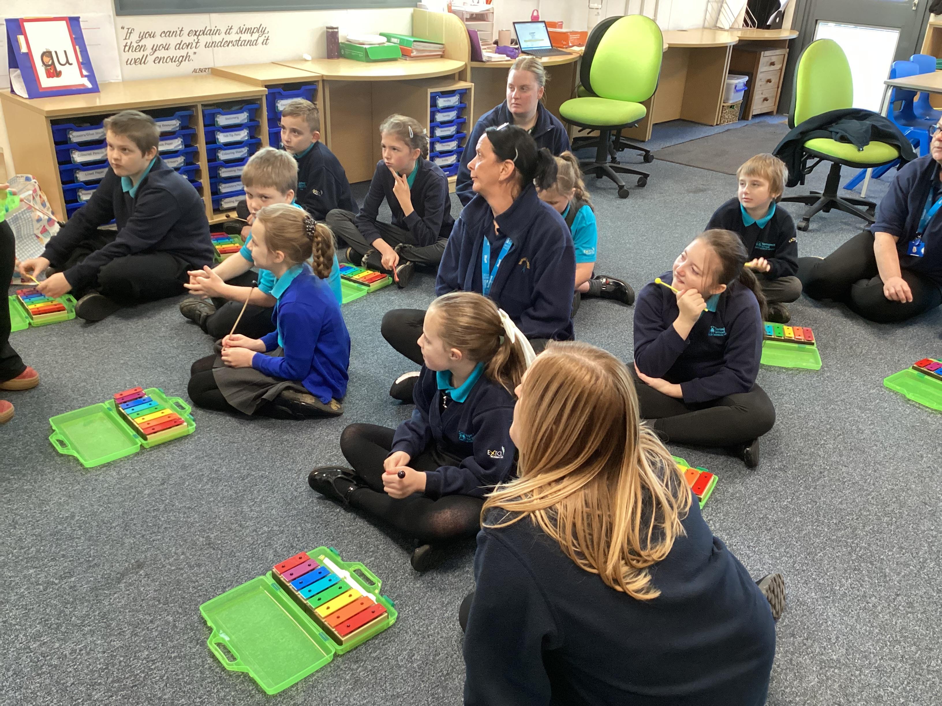 Monday 24th November 2025 - Music. We are lucky to have Becky from Tees Valley Music Service working with us at the moment. We have sand a variety of songs, learnt to take turns when singing and recently started playing the glockenspiel along to songs.