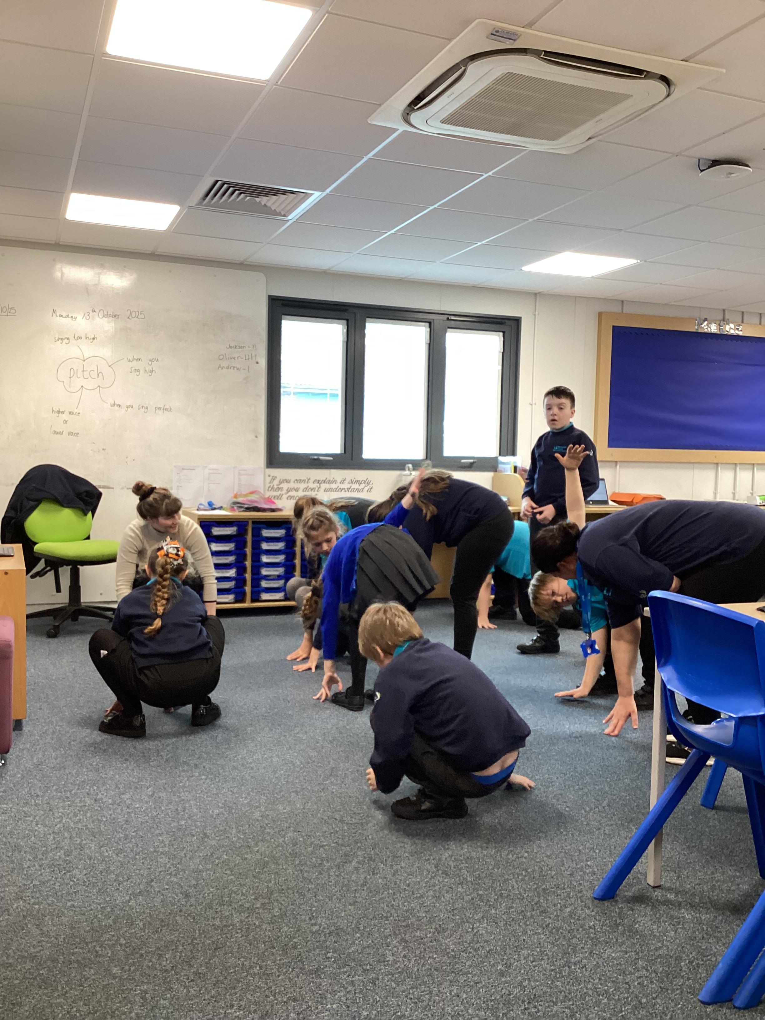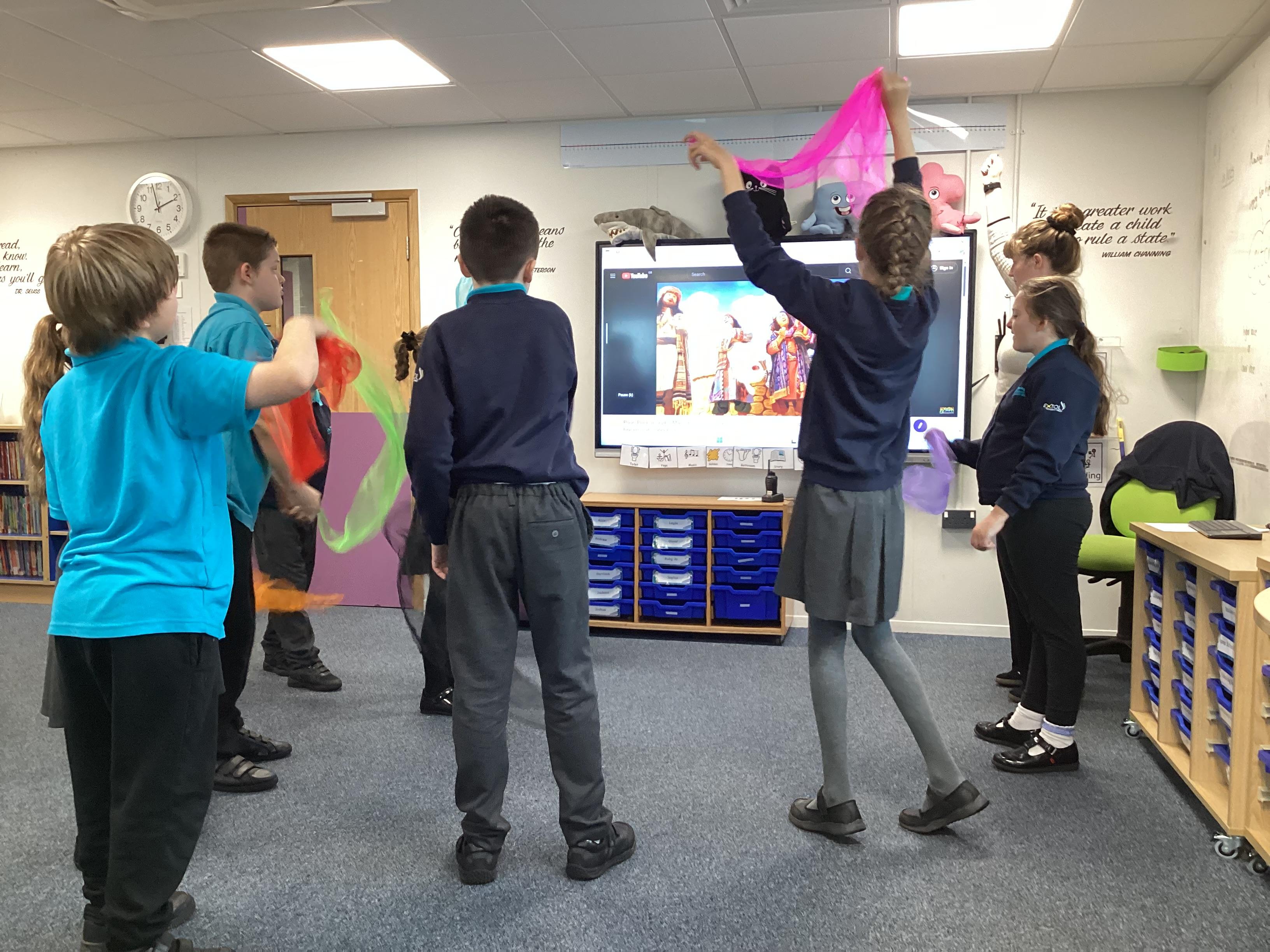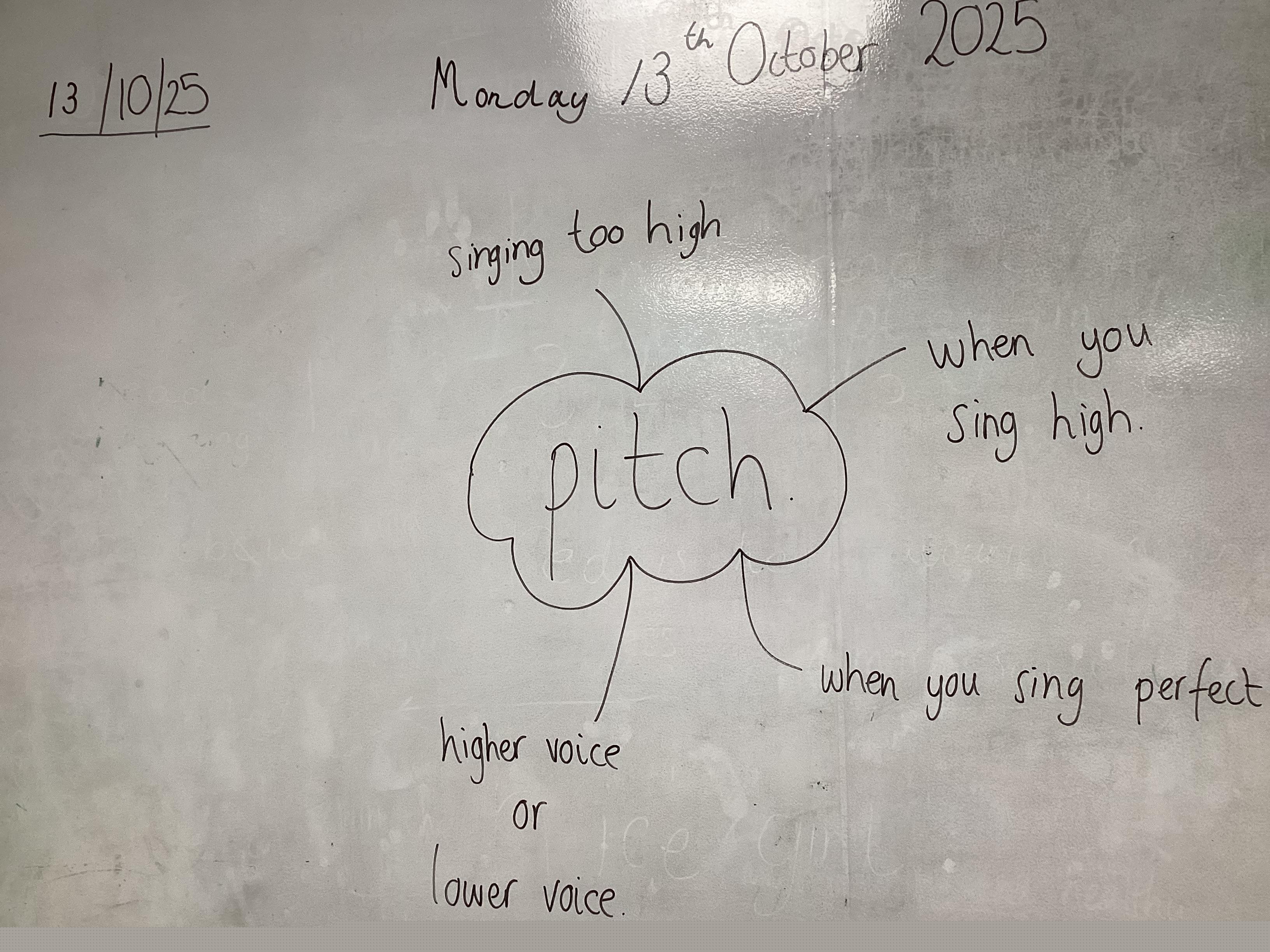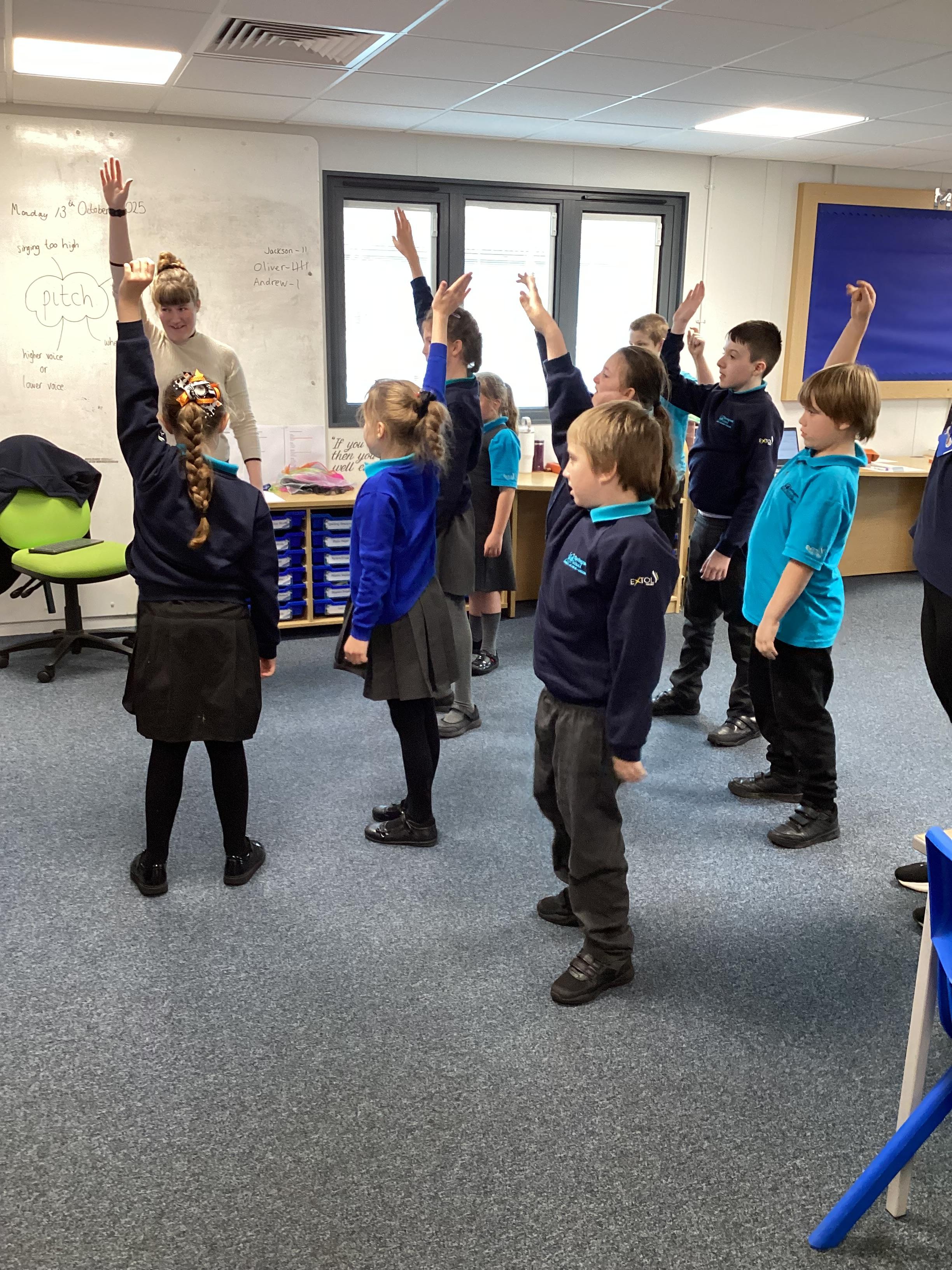 Monday 13th October 2025 - In Music today, we have been learning about pitch. We practiced standing tall for high pitch and crouching low for low pitch. We then listened to 'Joseph's Coat', 'Joseph's Dreams' and 'Poor, Poor Joseph' from Joseph and His Technicoloured Dreamcoat, using coloured materials to show high and low pitch in the songs.