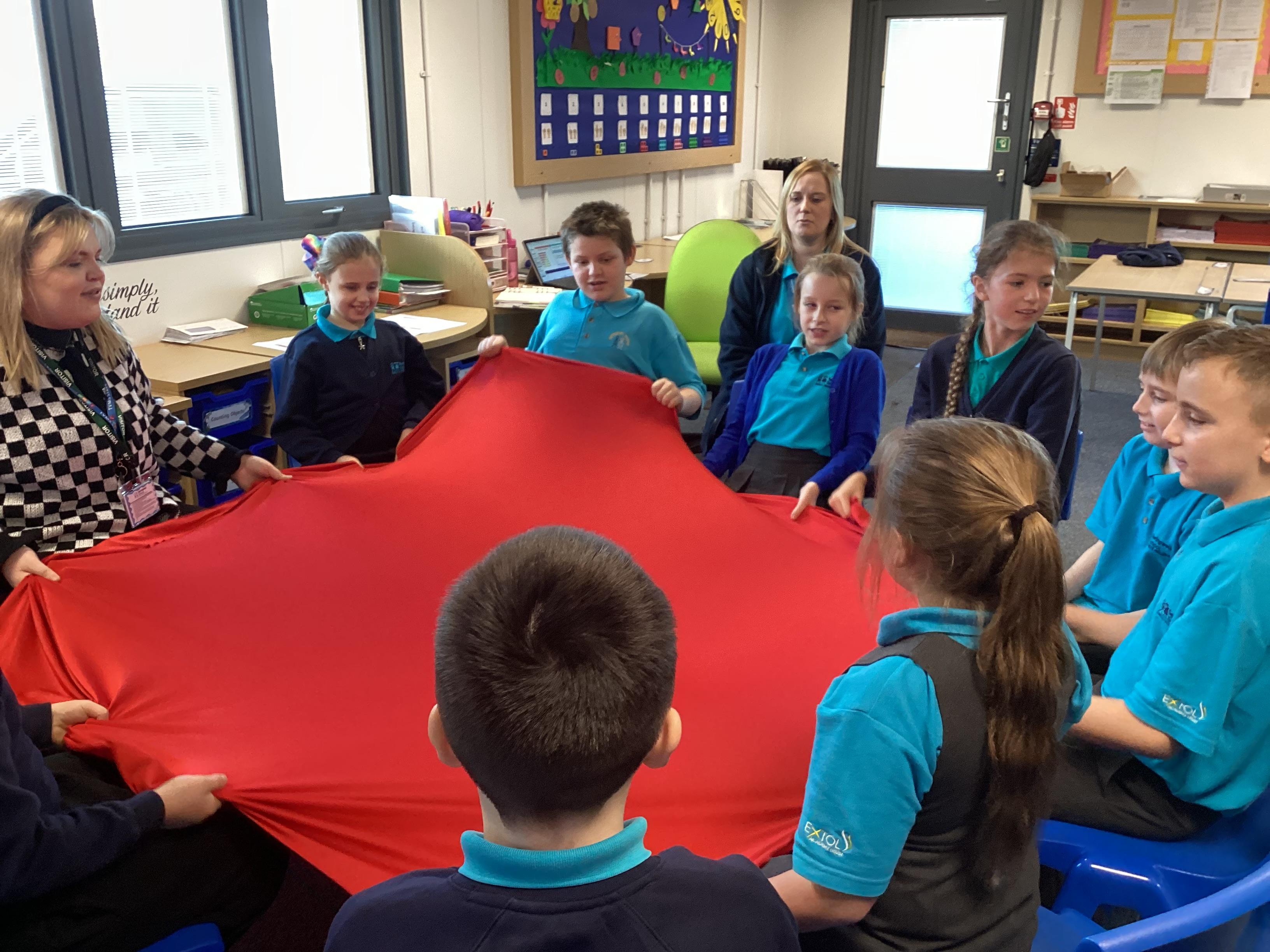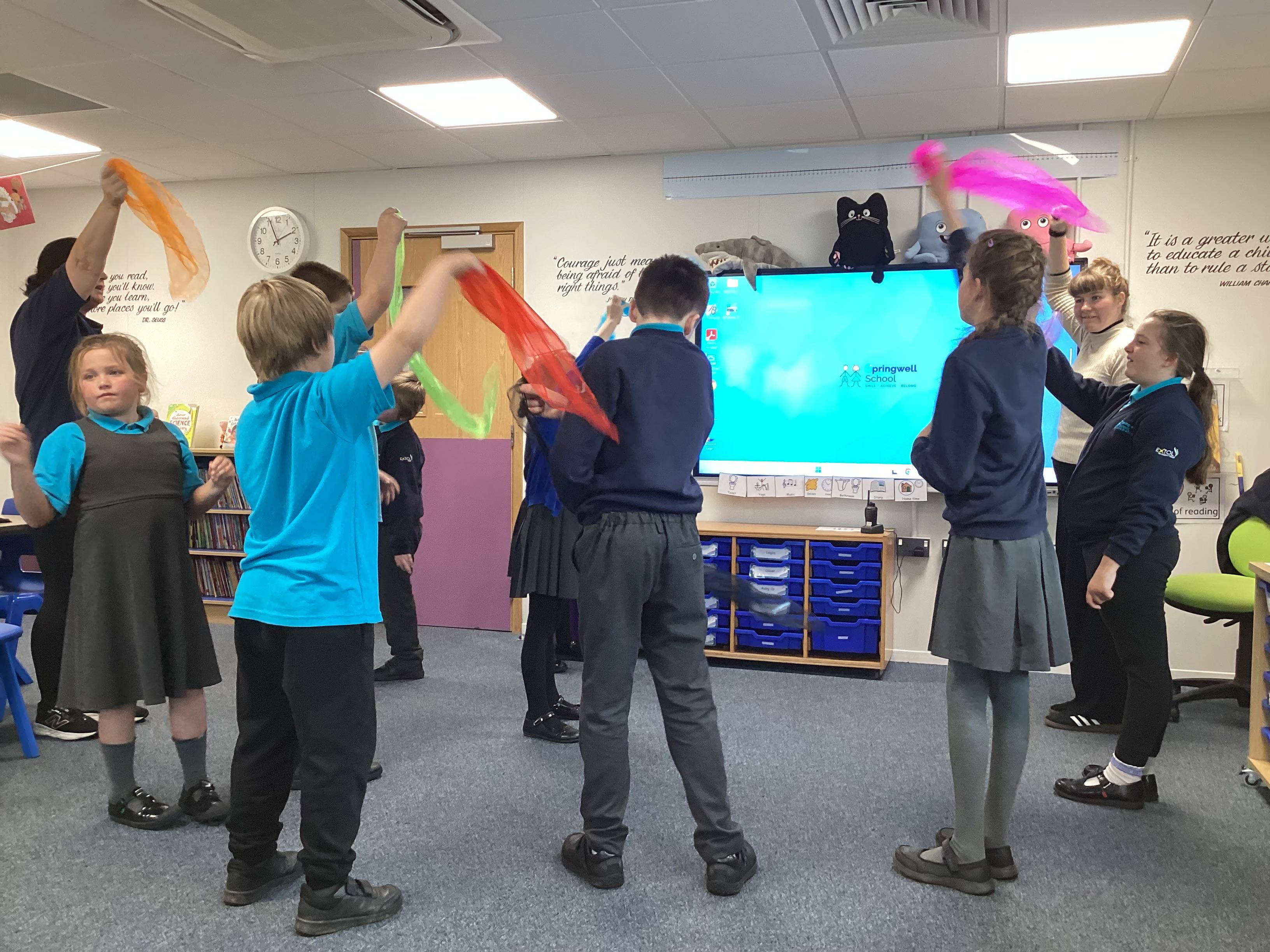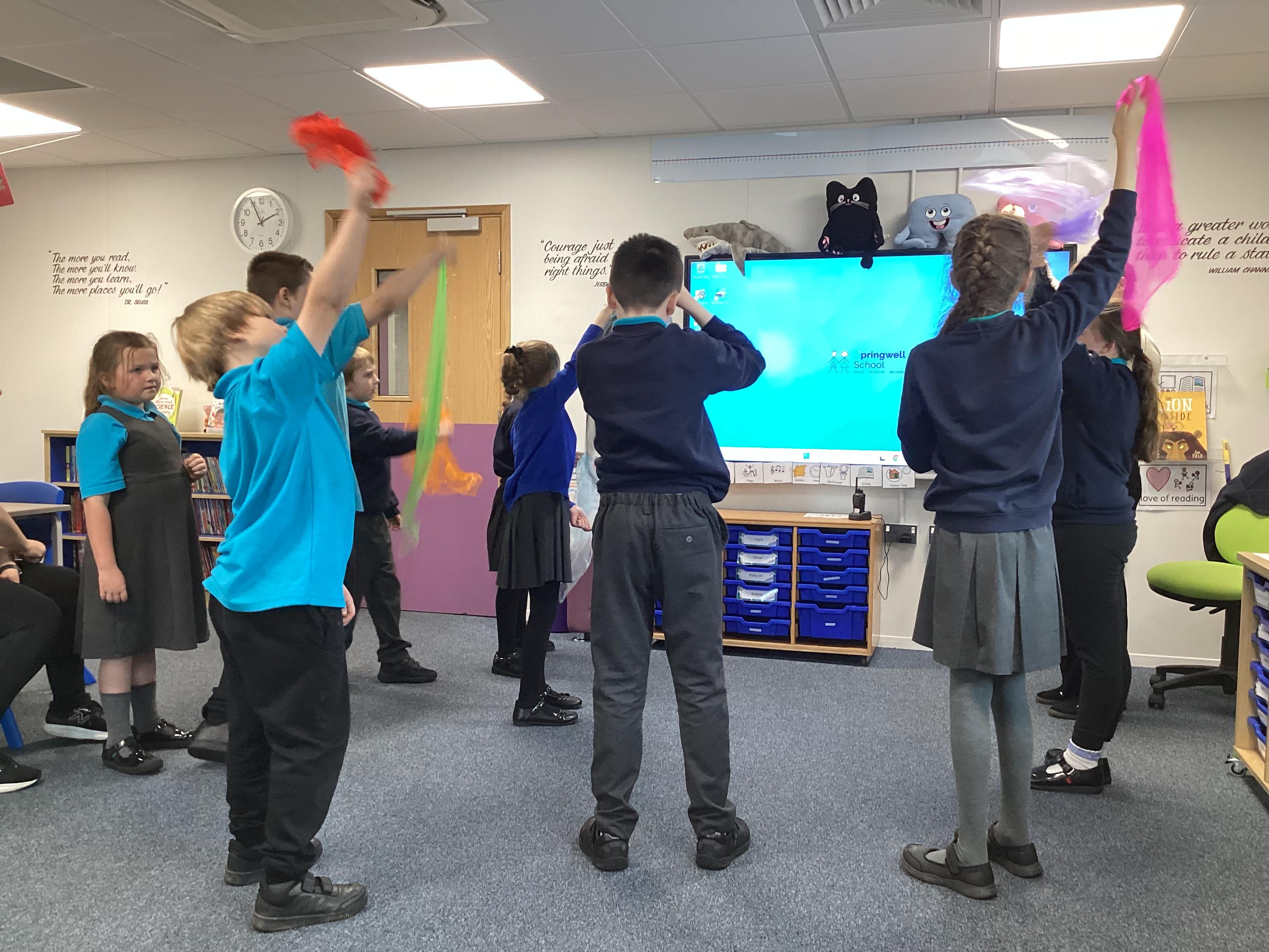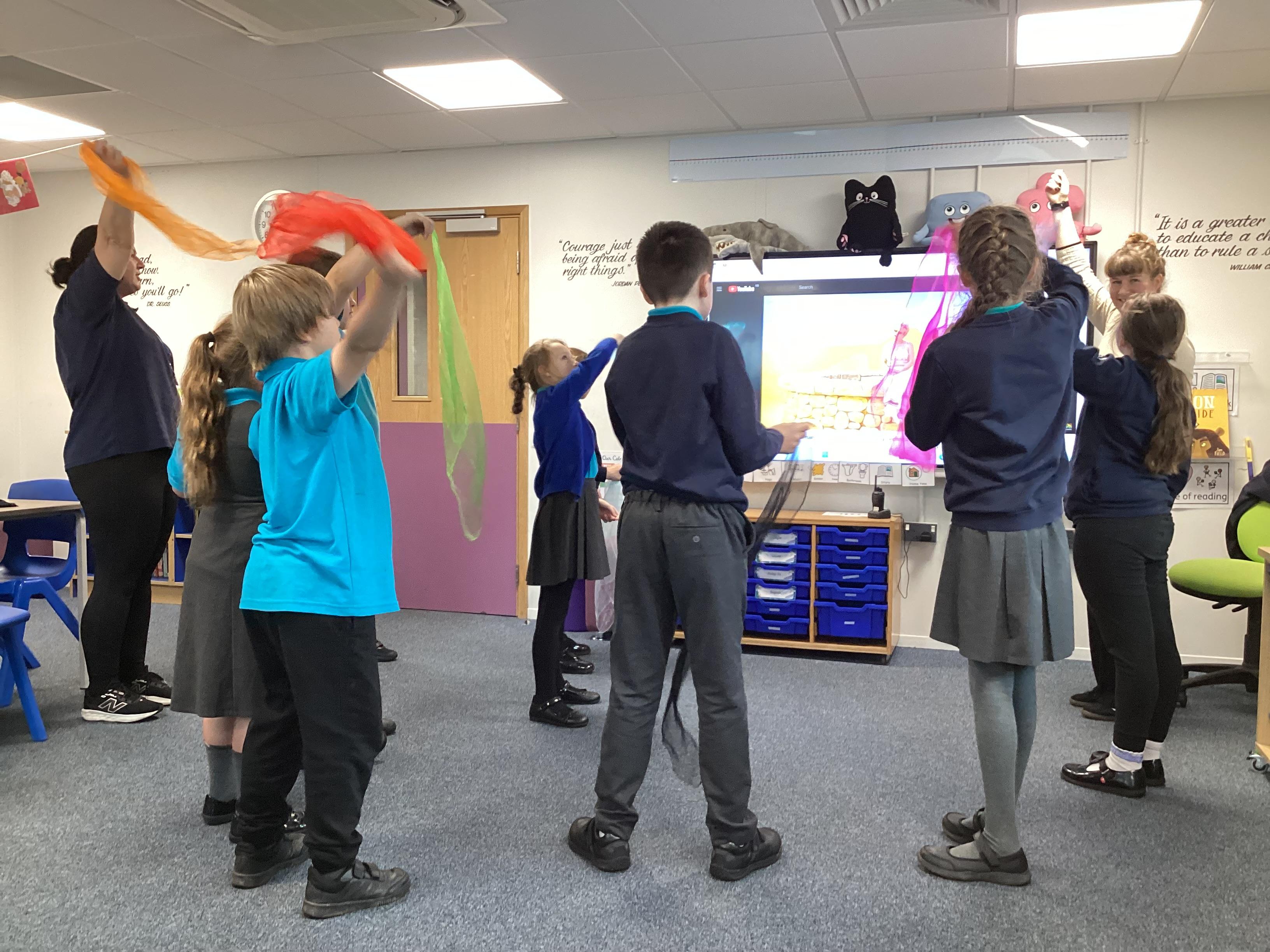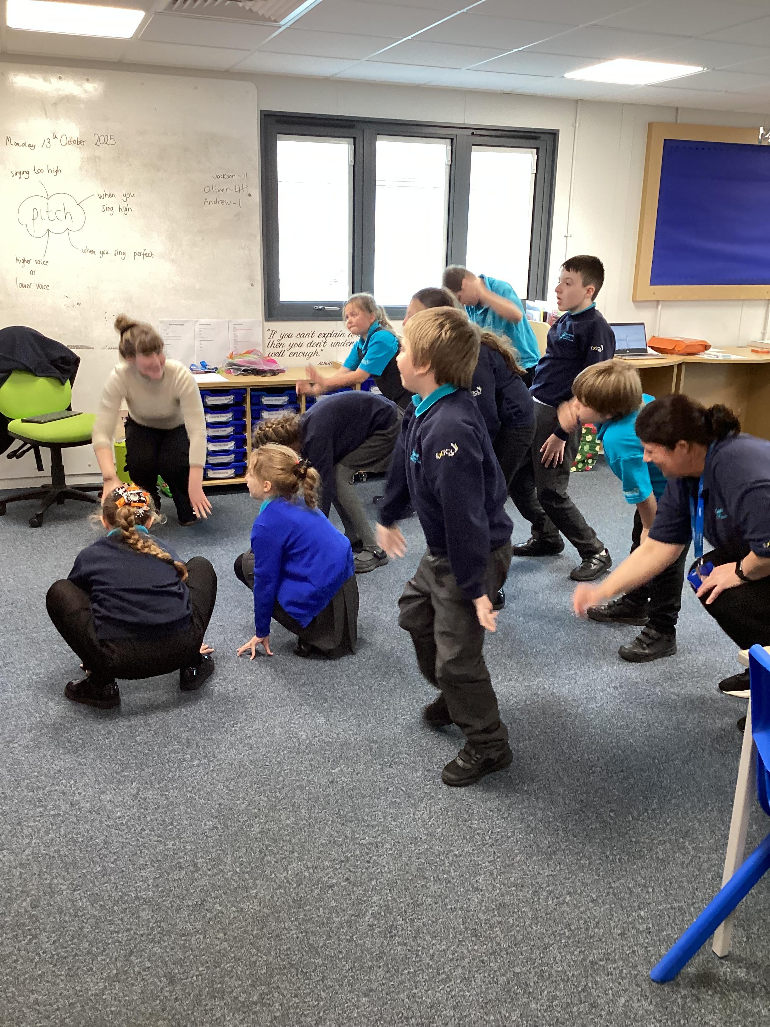 Monday 13th October 2025 - In Music today, we have been learning about pitch. We practiced standing tall for high pitch and crouching low for low pitch. We then listened to 'Joseph's Coat', 'Joseph's Dreams' and 'Poor, Poor Joseph' from Joseph and His Technicoloured Dreamcoat, using coloured materials to show high and low pitch in the songs.