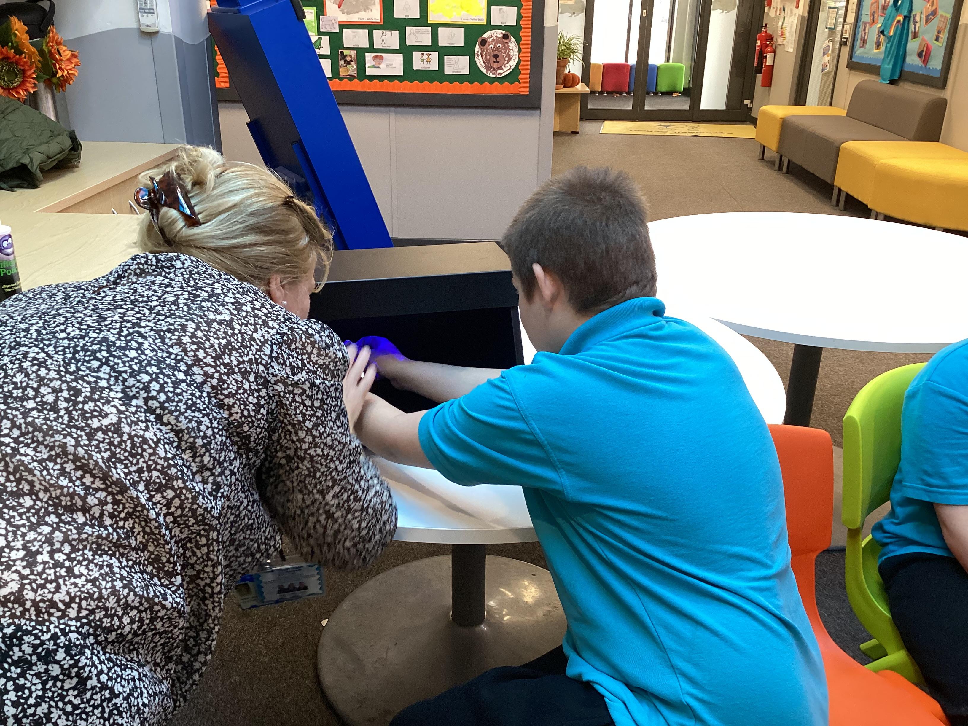 Tuesday 4th November 2025 - In PSHRE today we worked with the school nurse, Sheila, to understand how important it is to wash our hands carefully. We explored what can happen if germs and dirt remain on the hands. We looked at our hands under the ultraviolet light to see if we'd done a thorough job. .