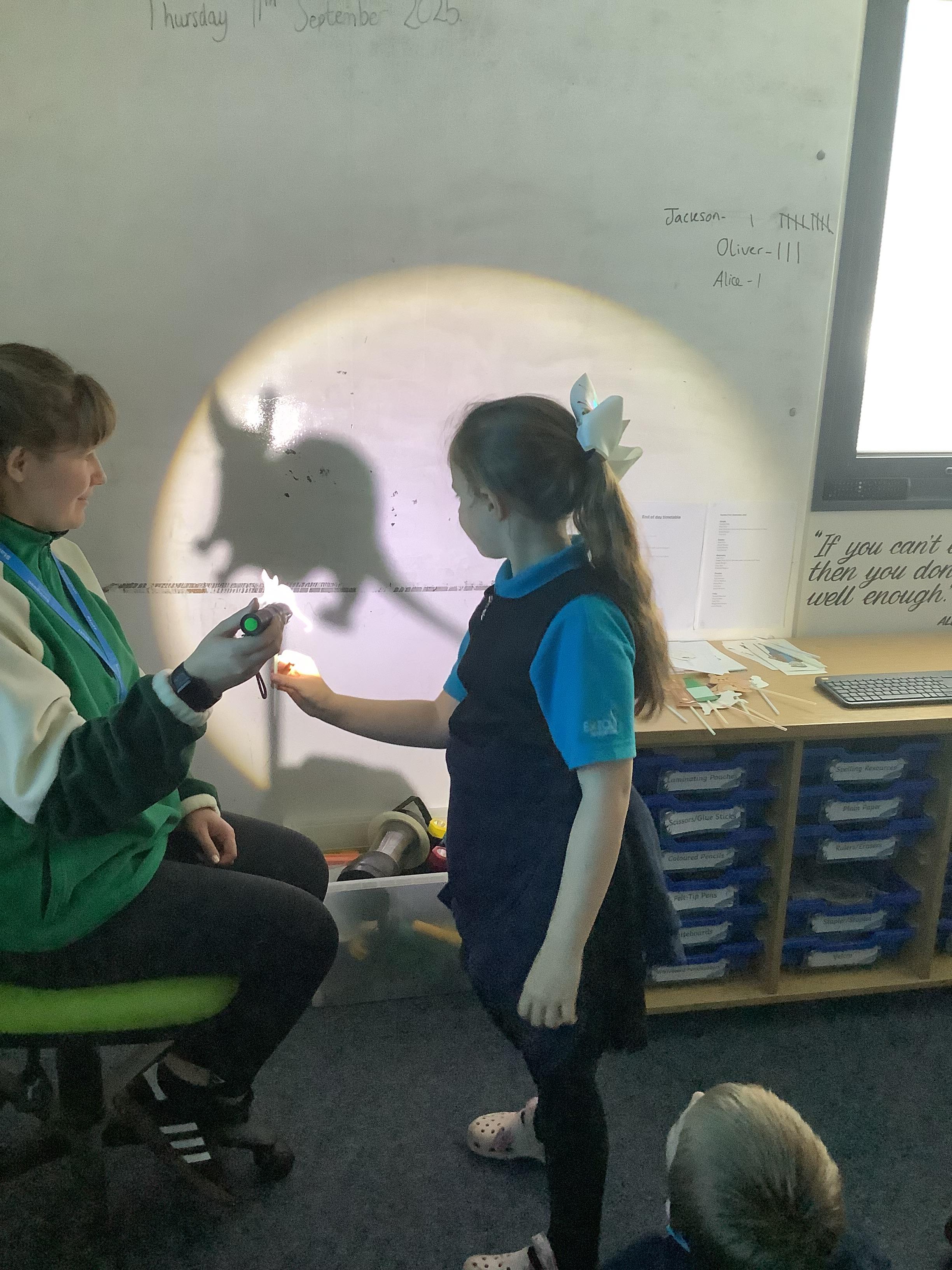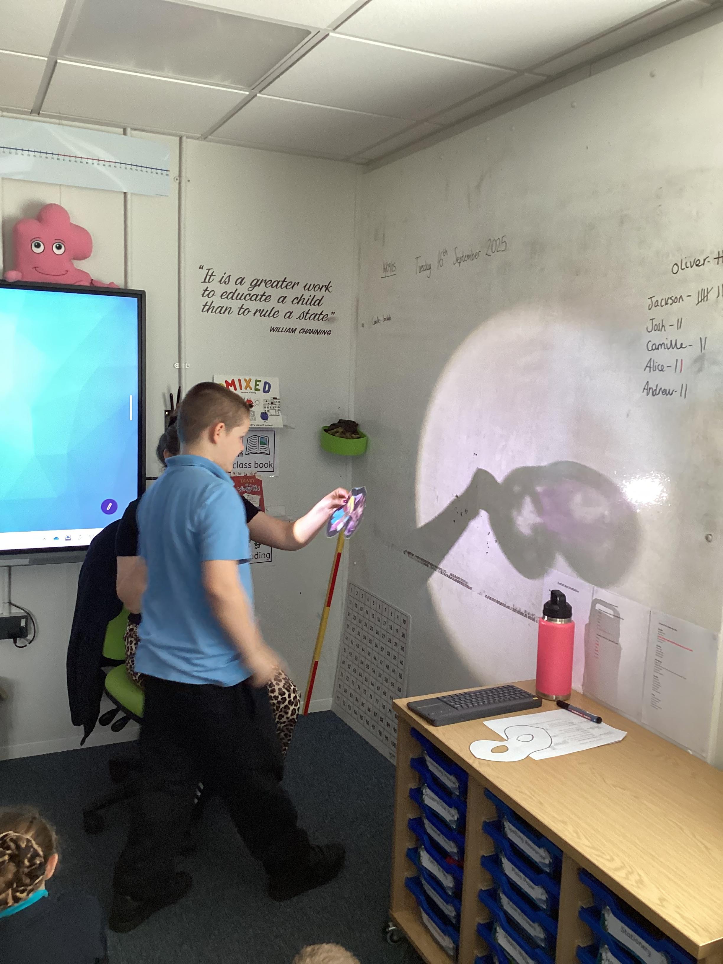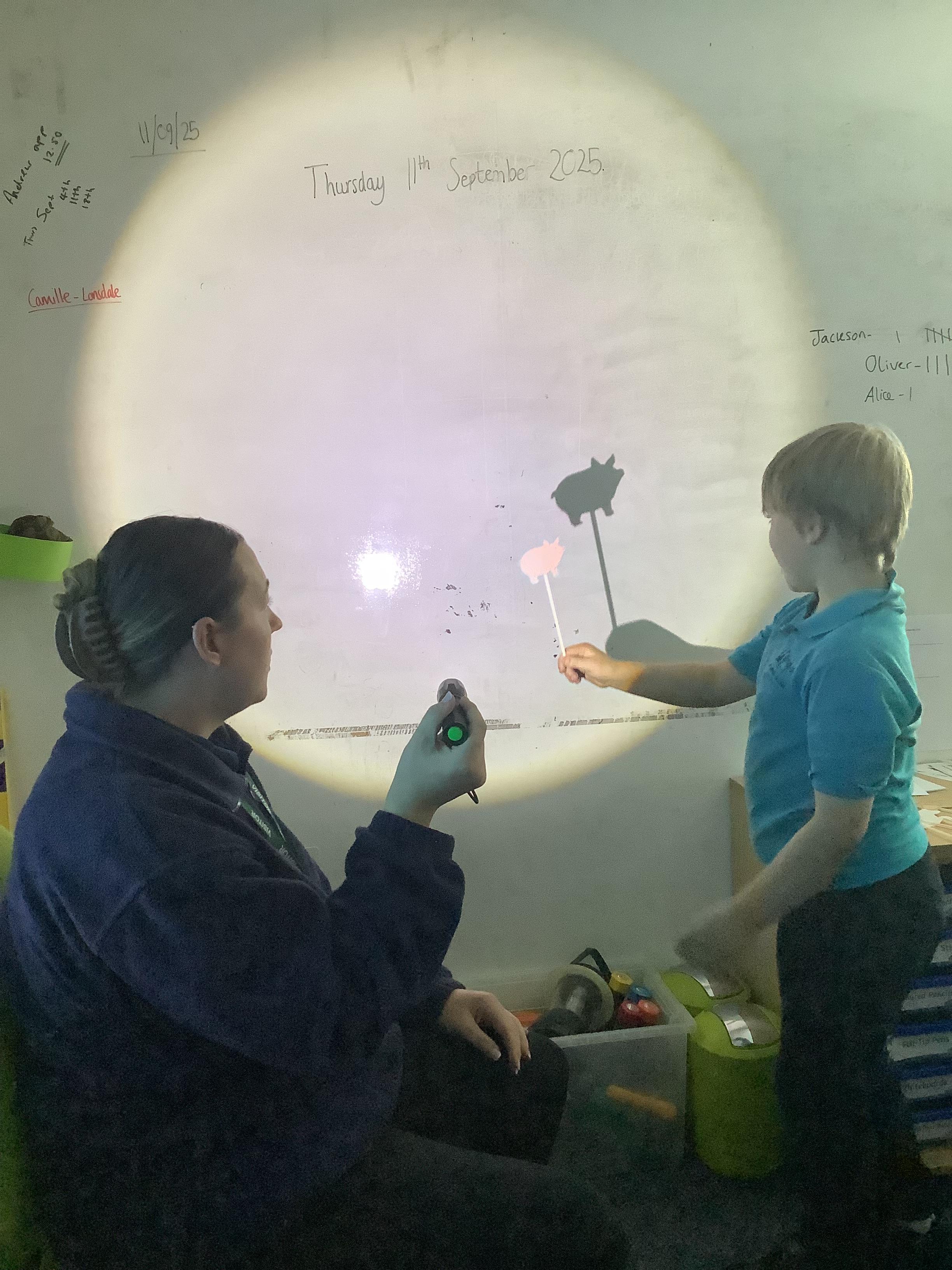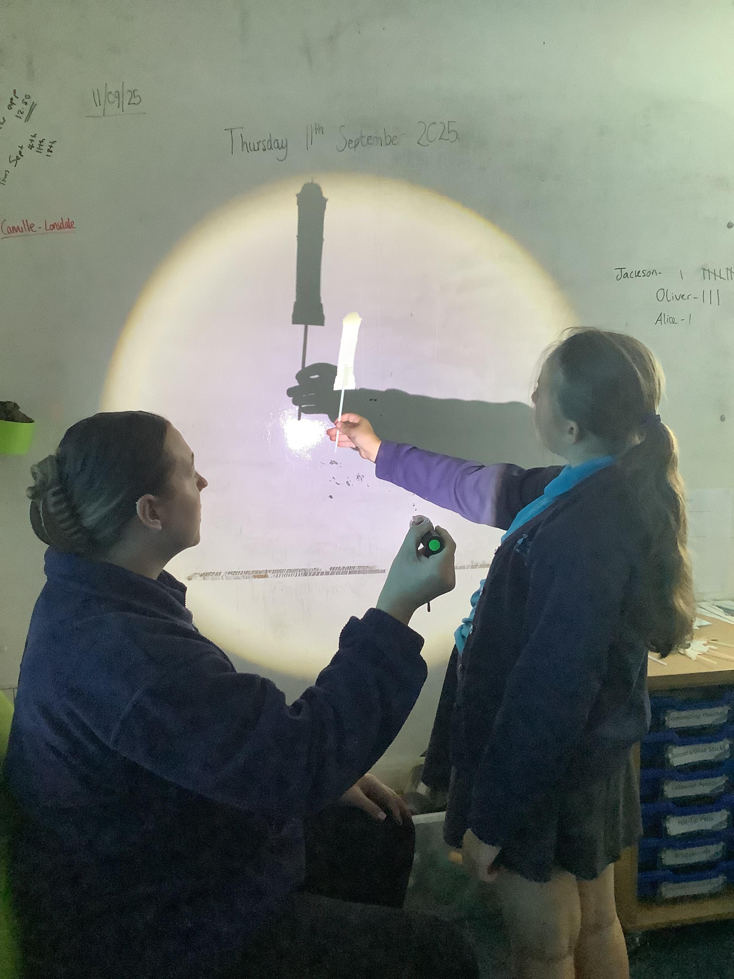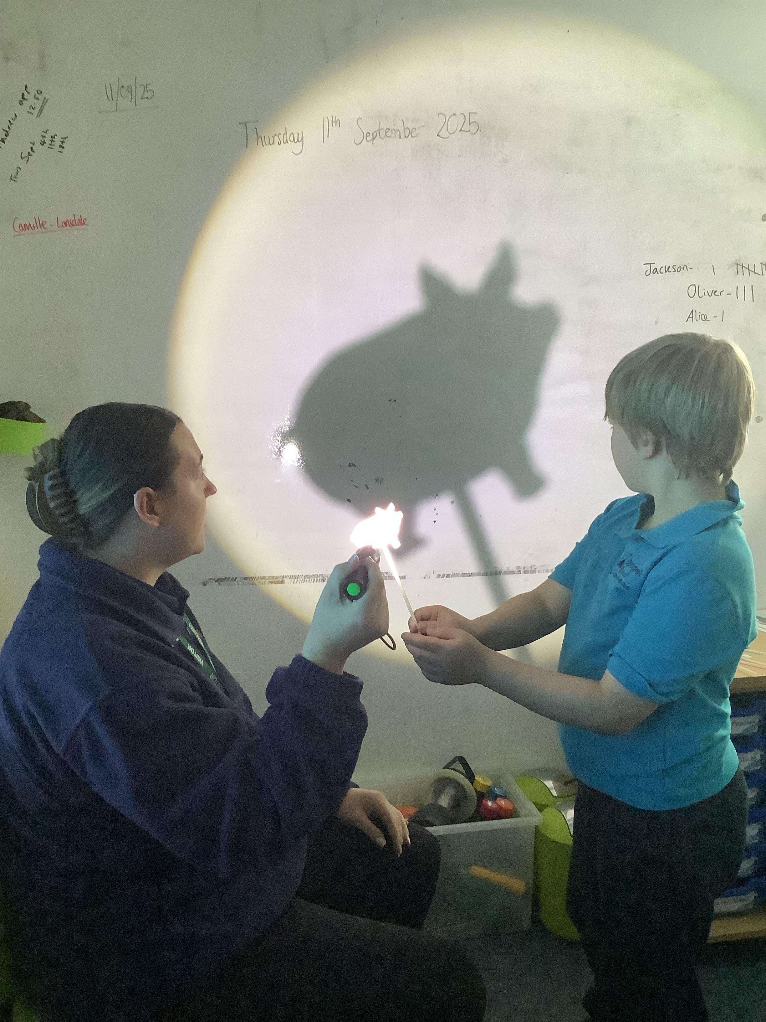 Thursday 11th September 2025 - In Science today, we focused on how we can make shadows bigger and smaller. We do this by moving the stick puppet closer (bigger) and further away (smaller) from the light source.
