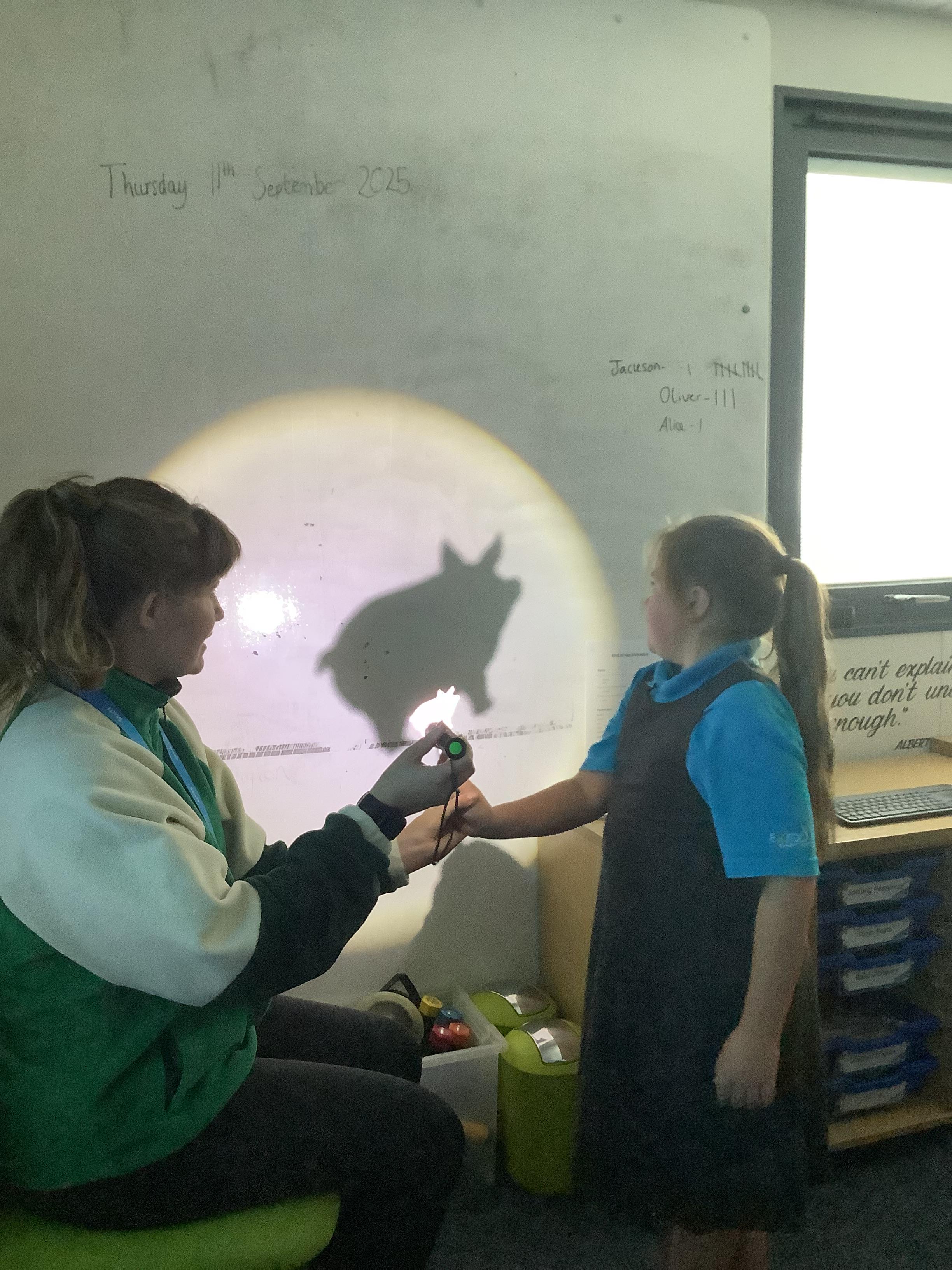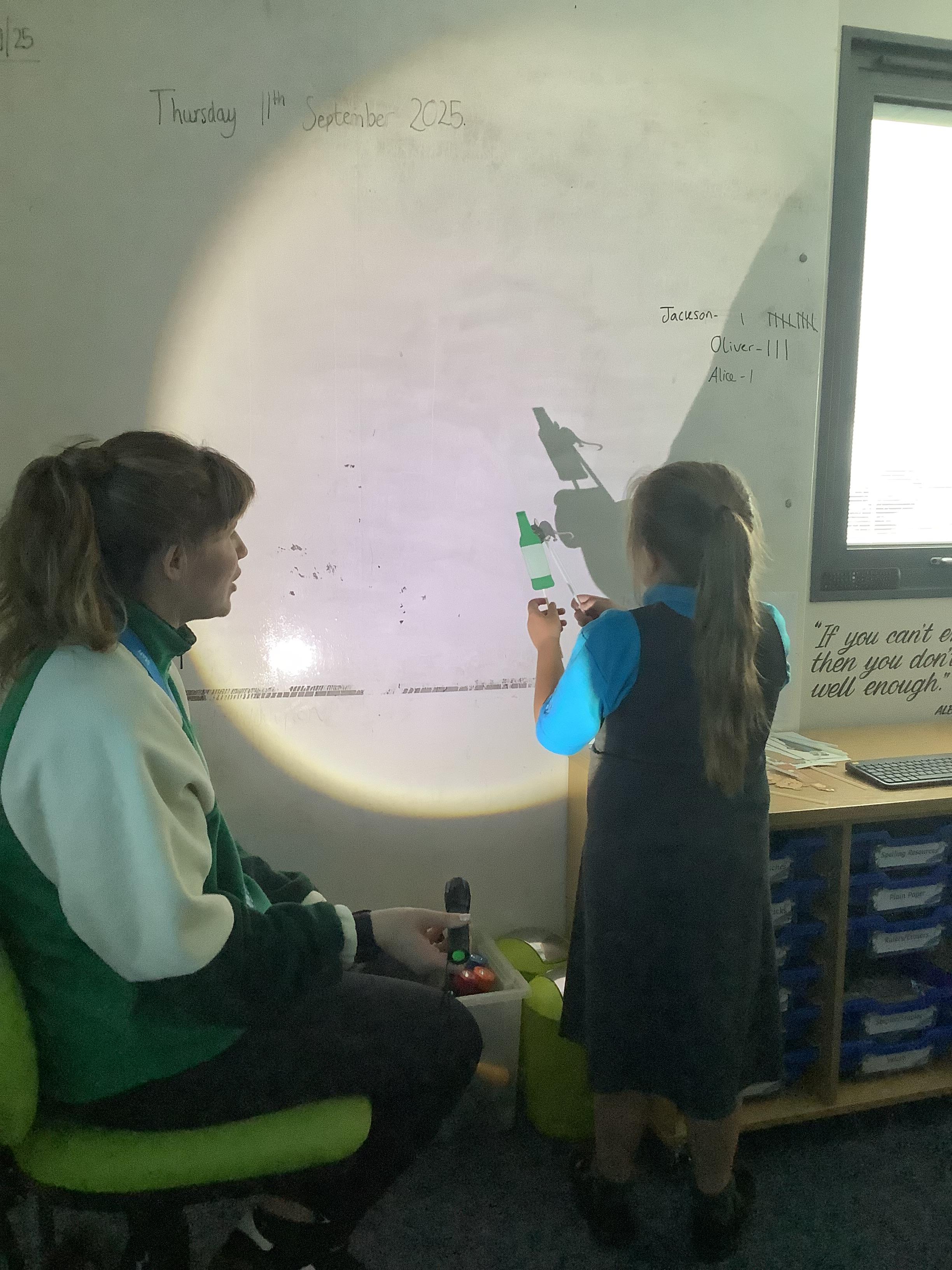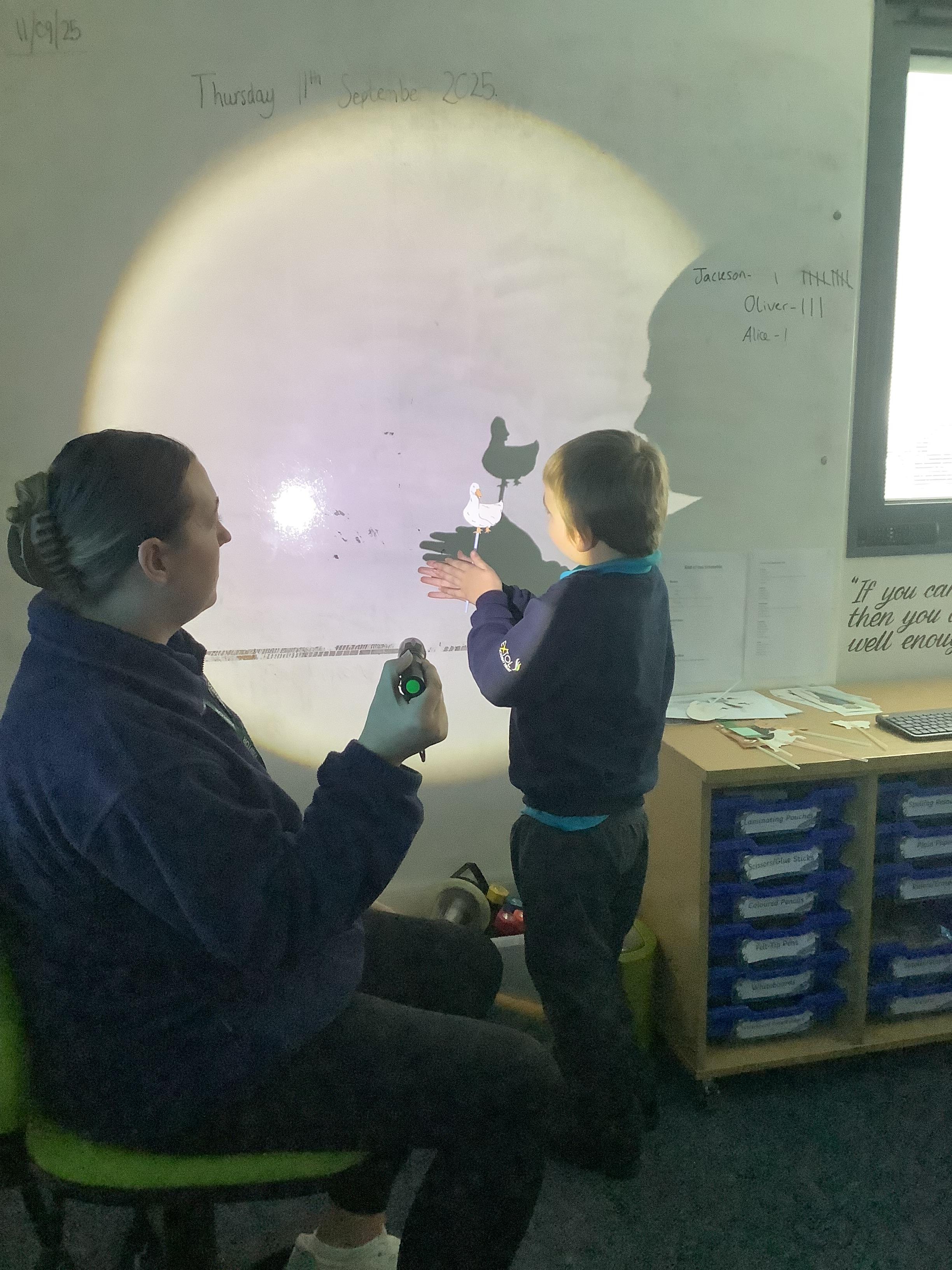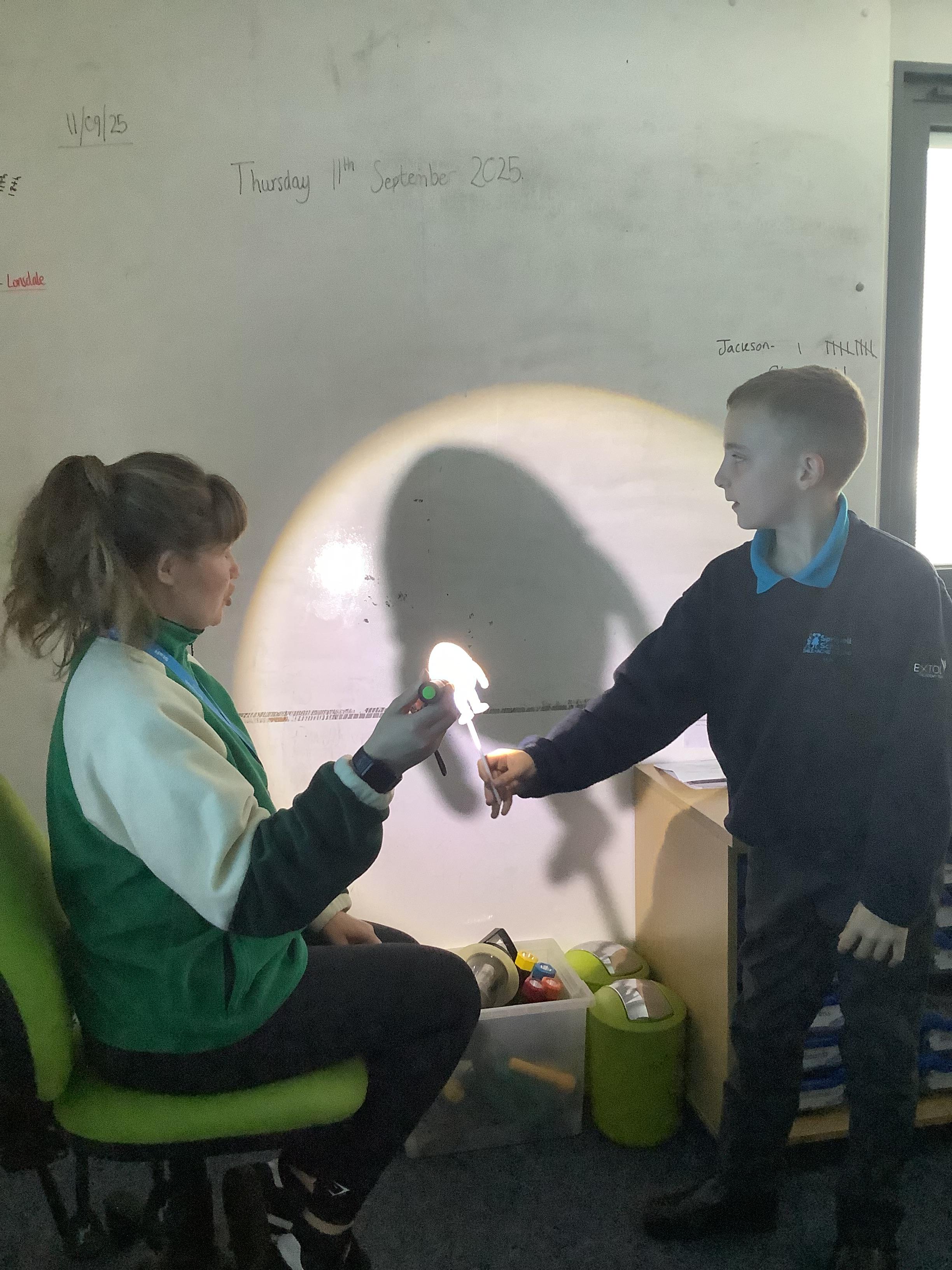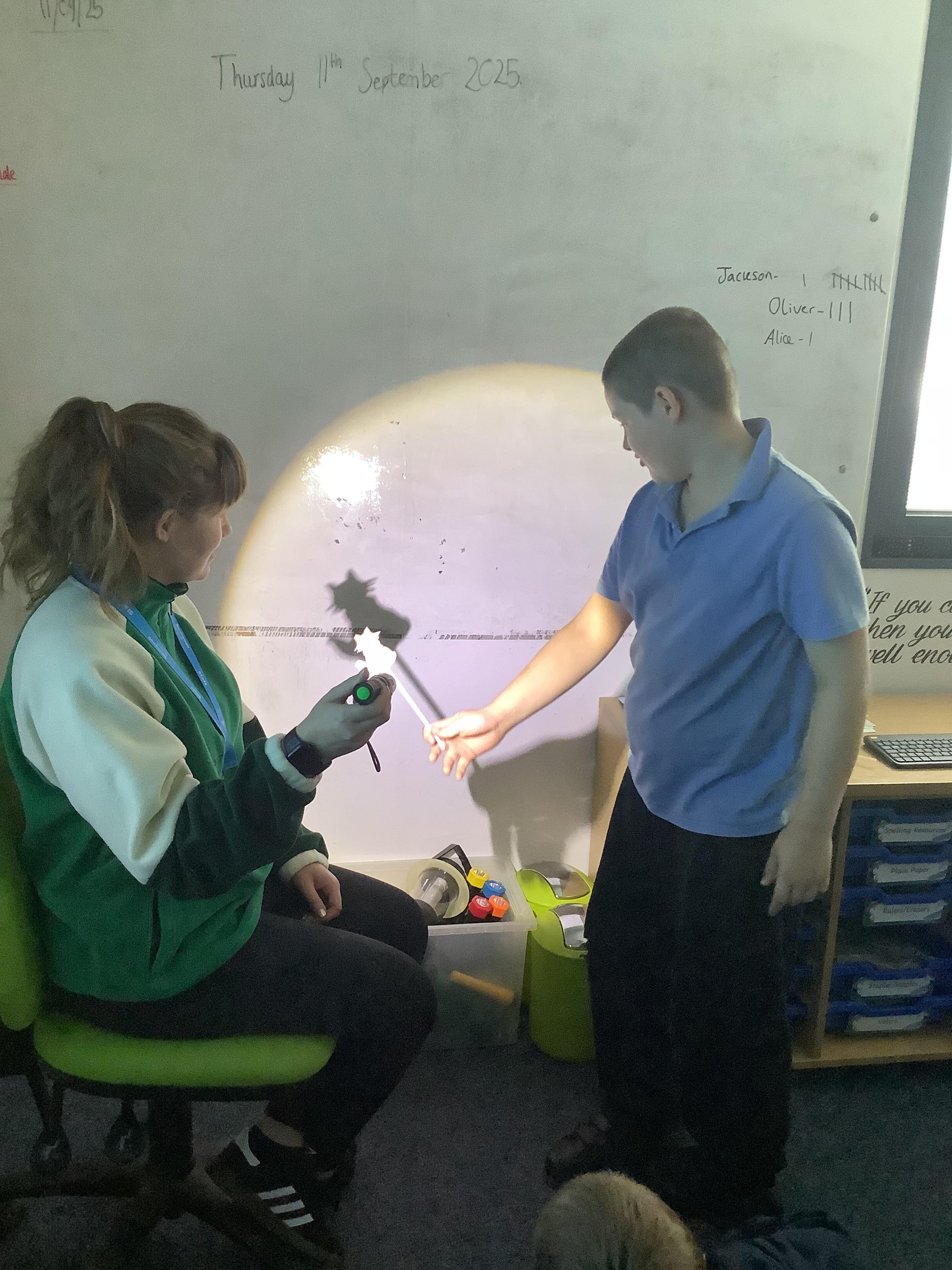 Thursday 11th September 2025 - In Science today, we focused on how we can make shadows bigger and smaller. We do this by moving the stick puppet closer (bigger) and further away (smaller) from the light source.