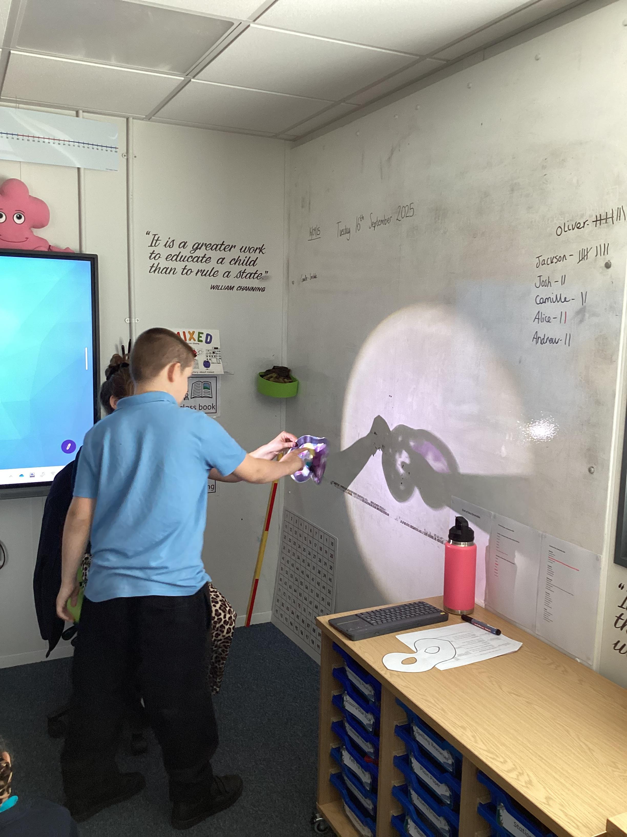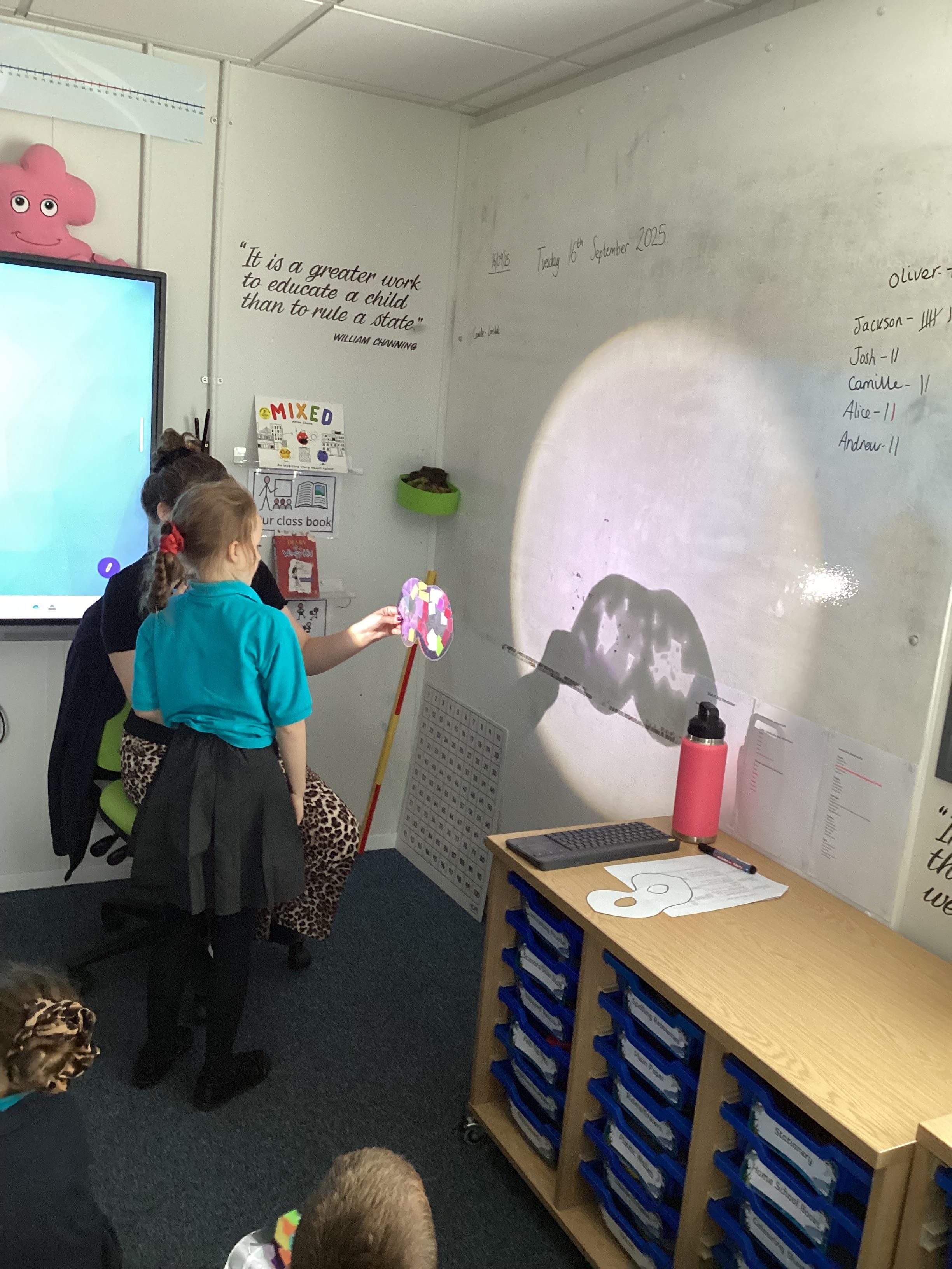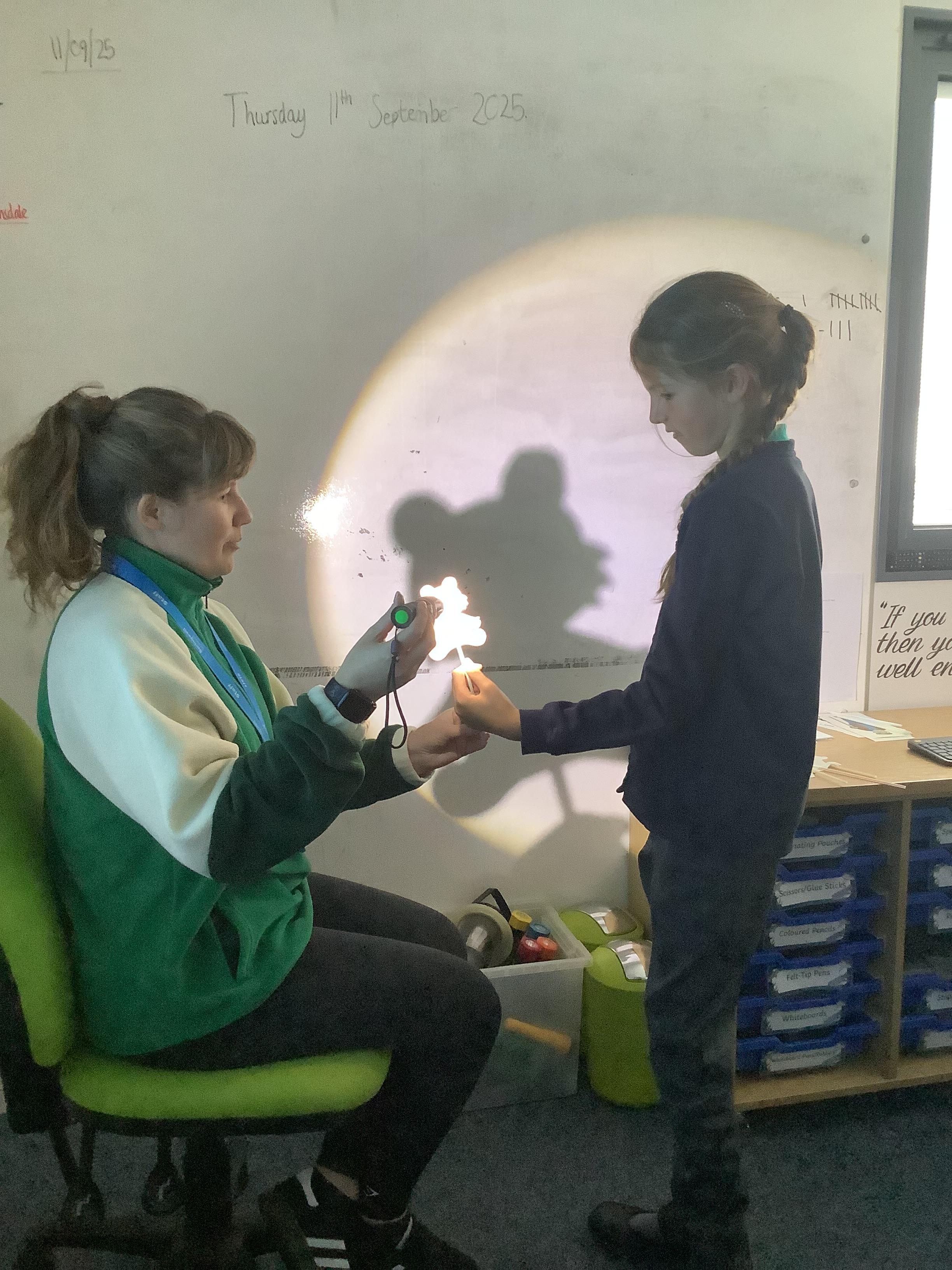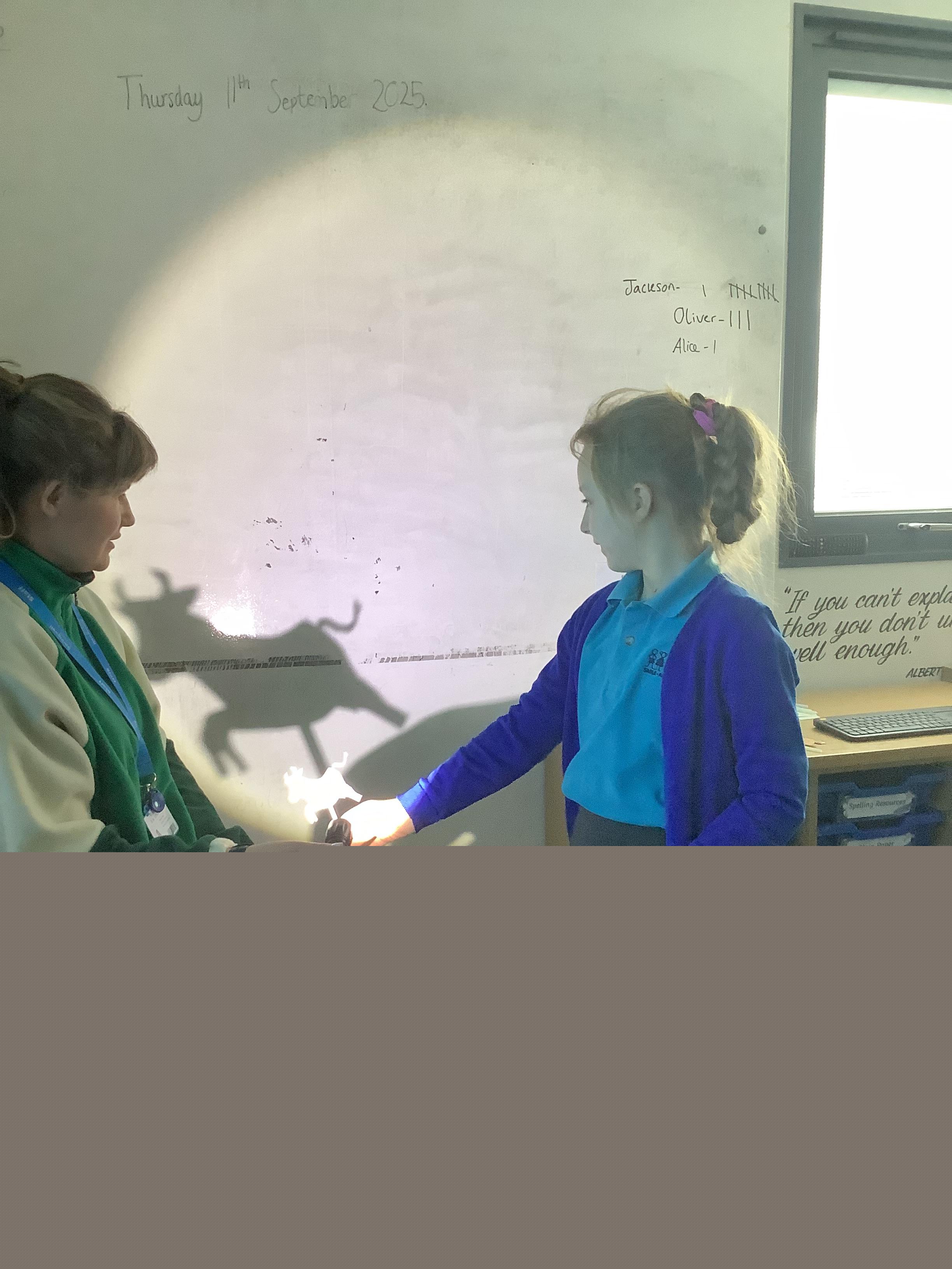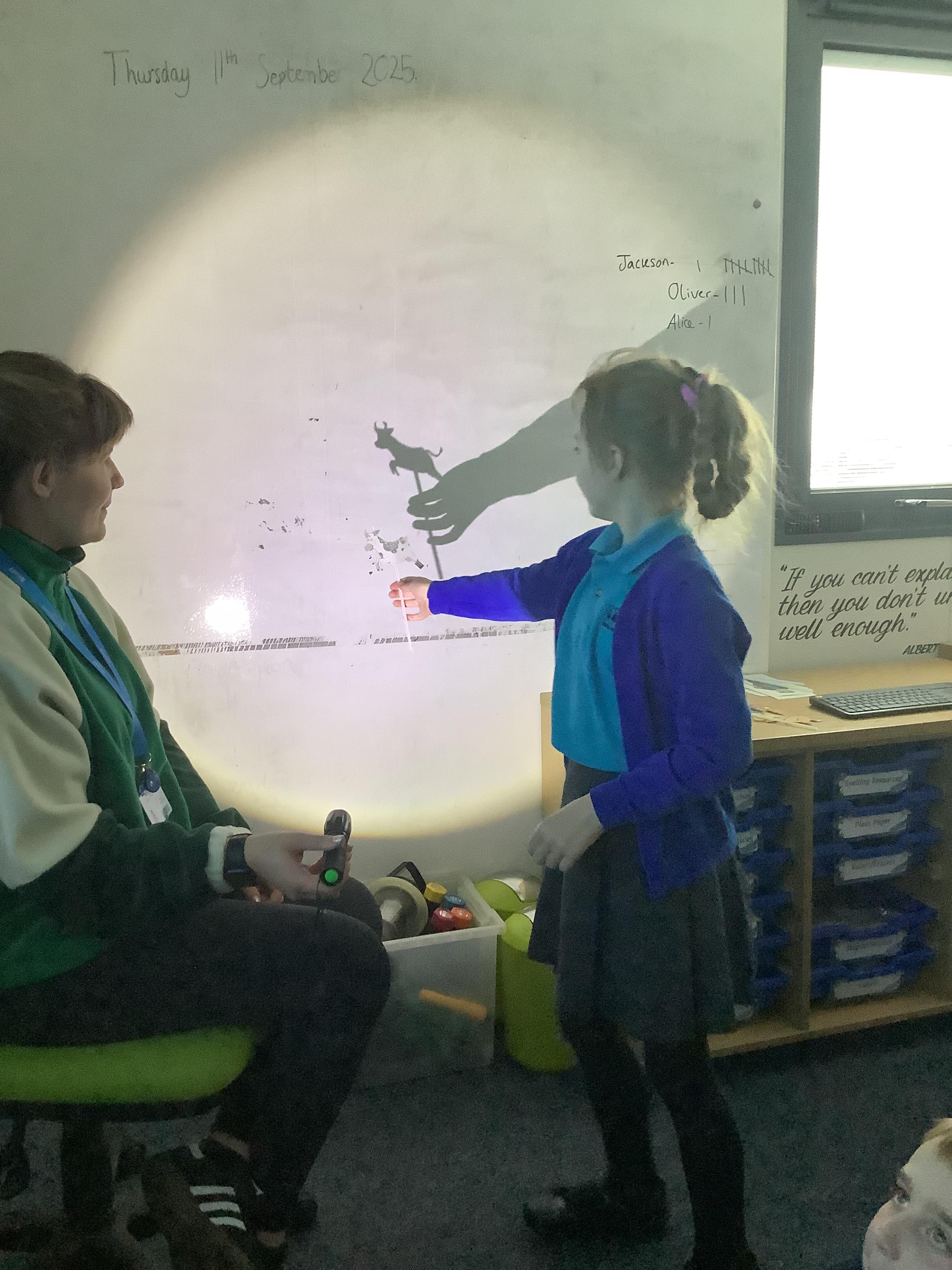 Thursday 11th September 2025 - In Science today, we focused on how we can make shadows bigger and smaller. We do this by moving the stick puppet closer (bigger) and further away (smaller) from the light source.