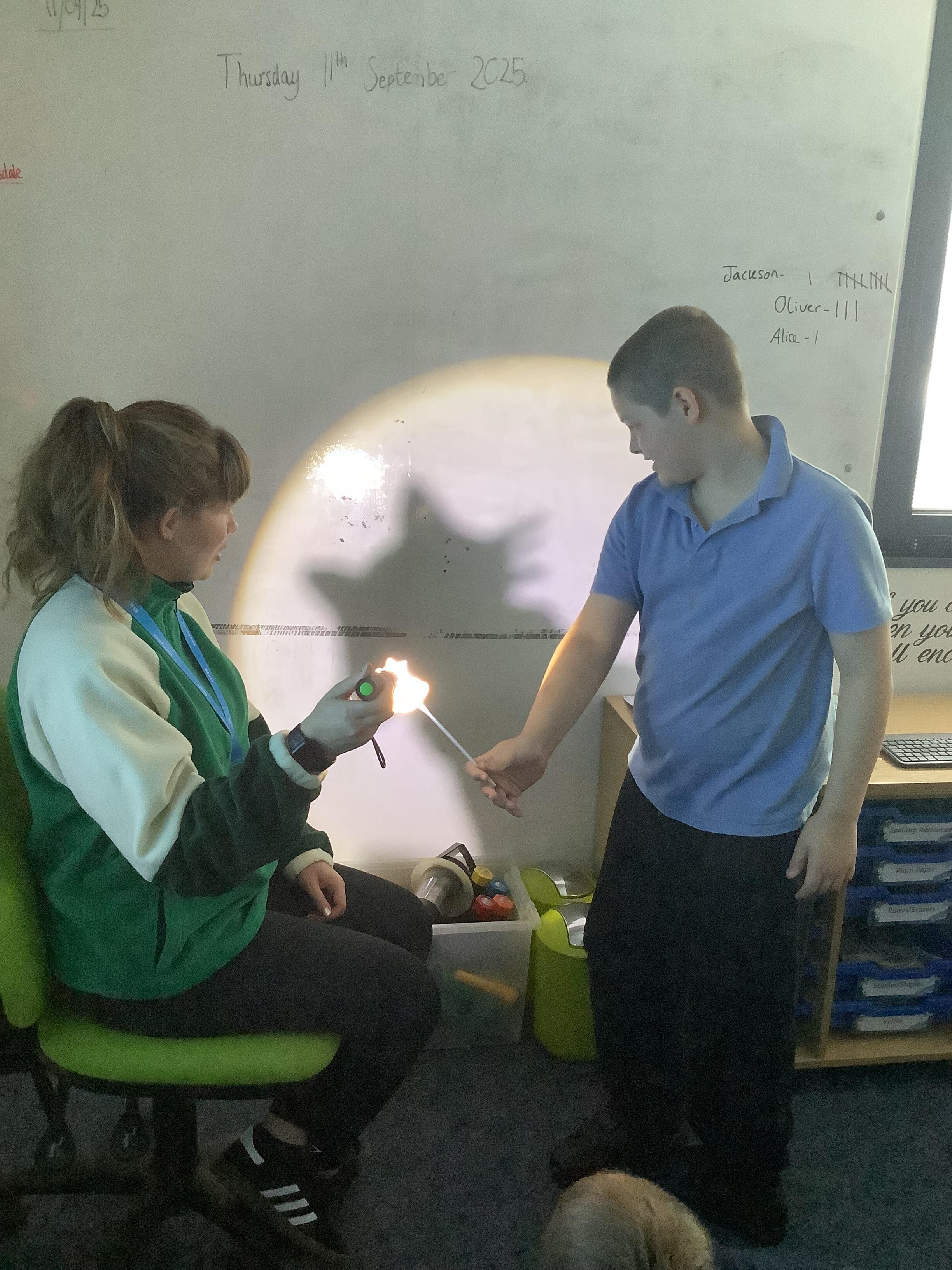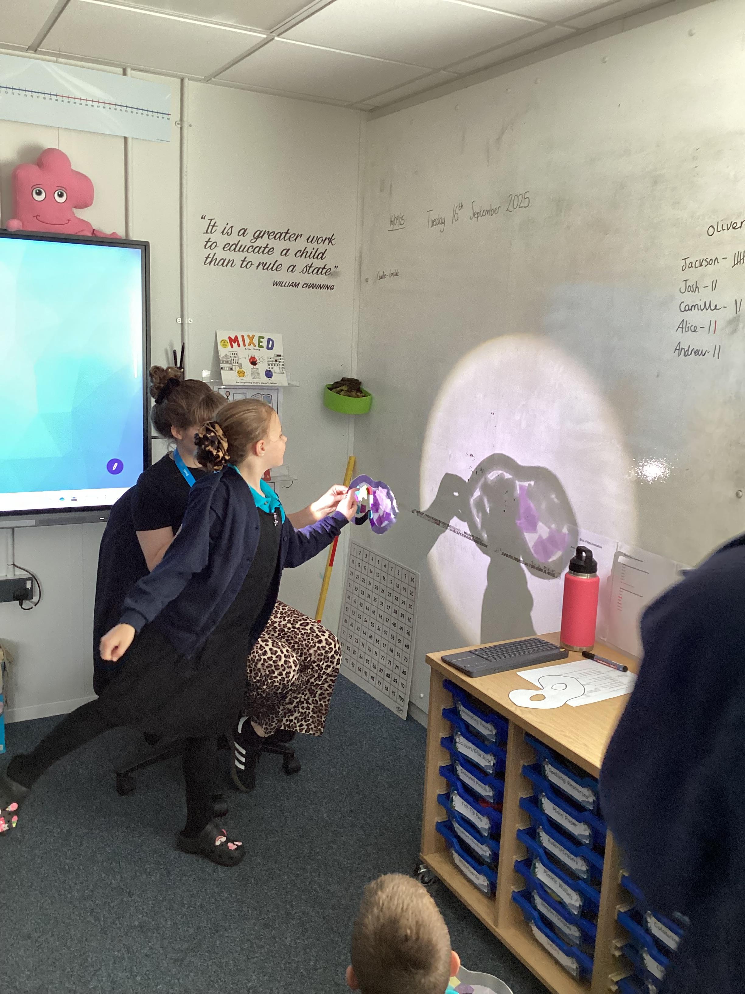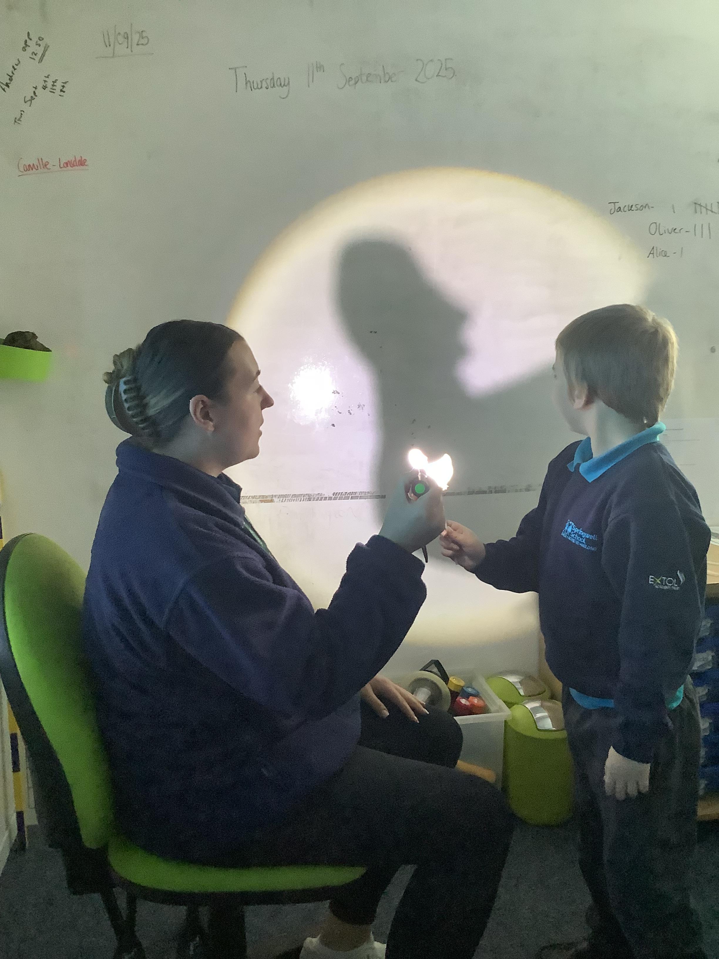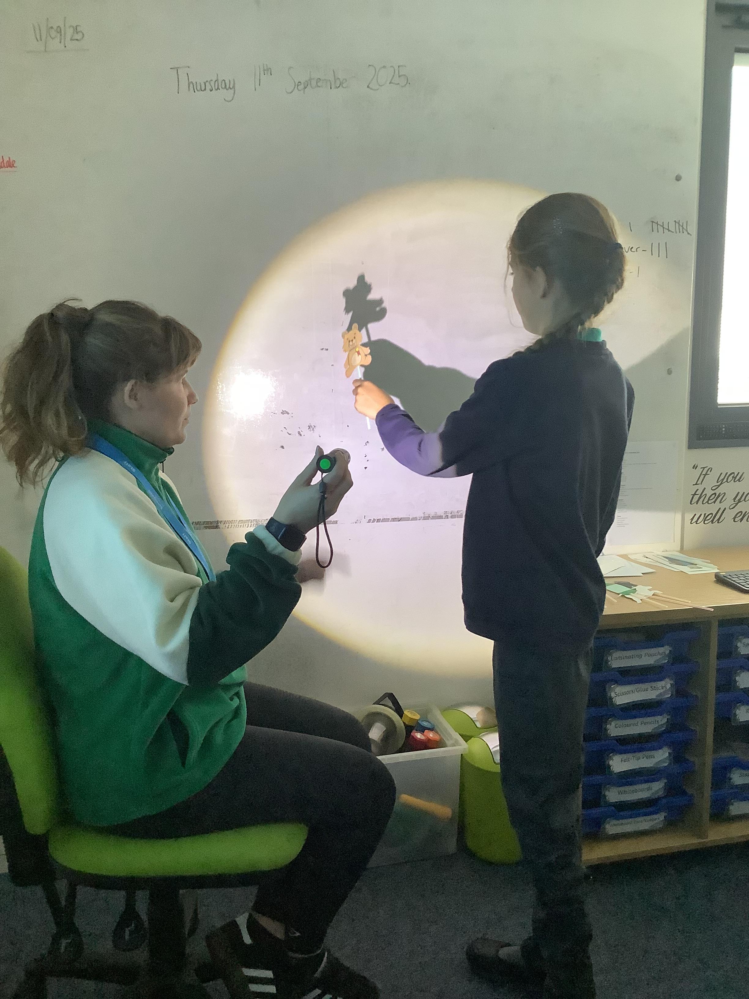 Thursday 11th September 2025 - In Science today, we focused on how we can make shadows bigger and smaller. We do this by moving the stick puppet closer (bigger) and further away (smaller) from the light source.