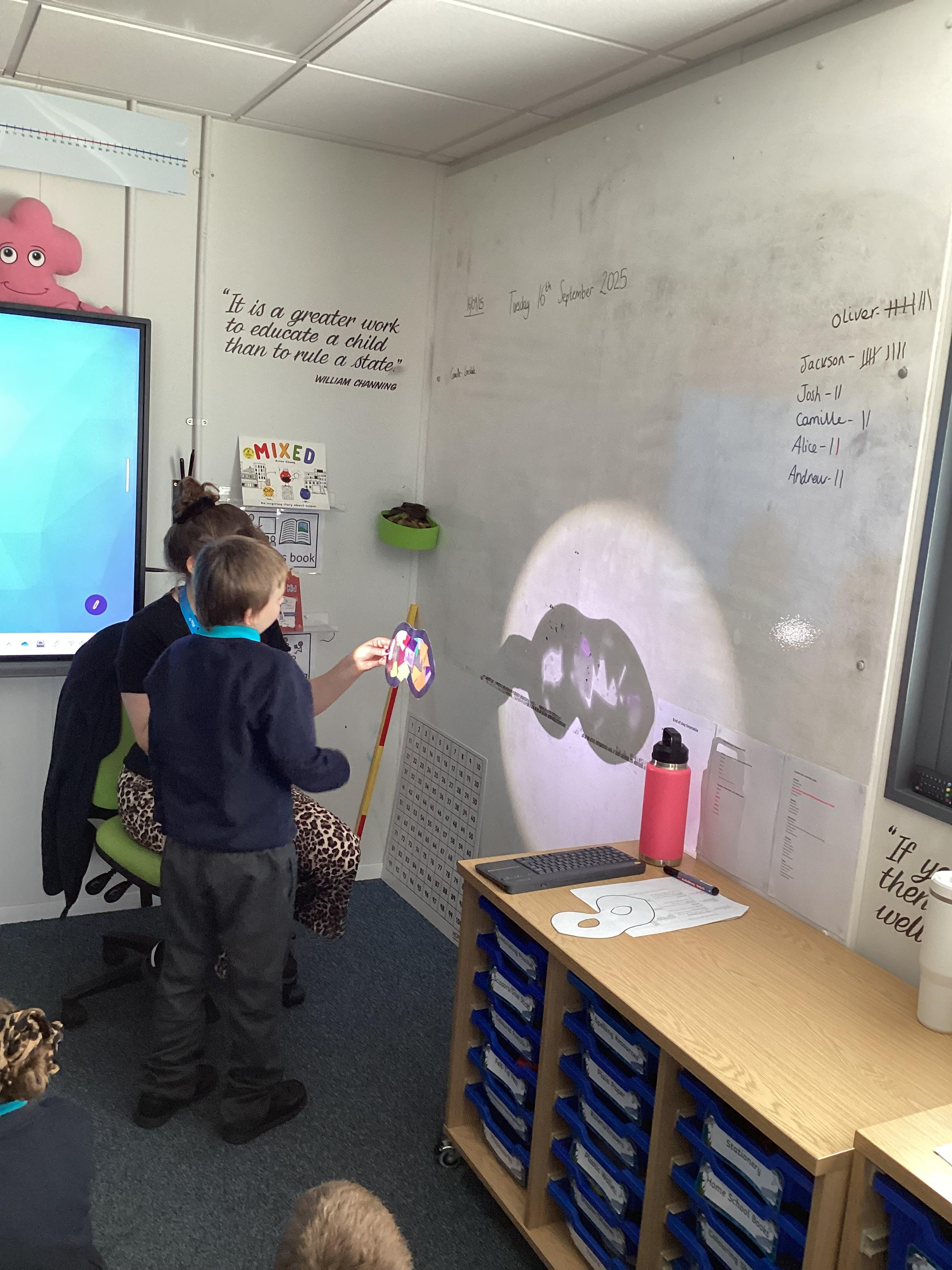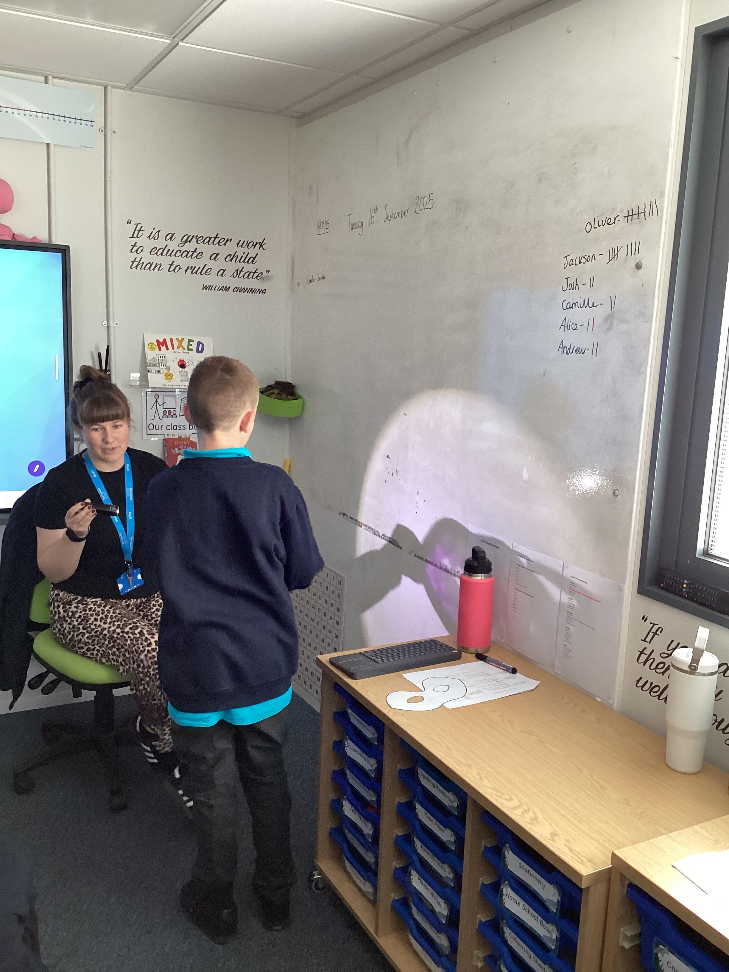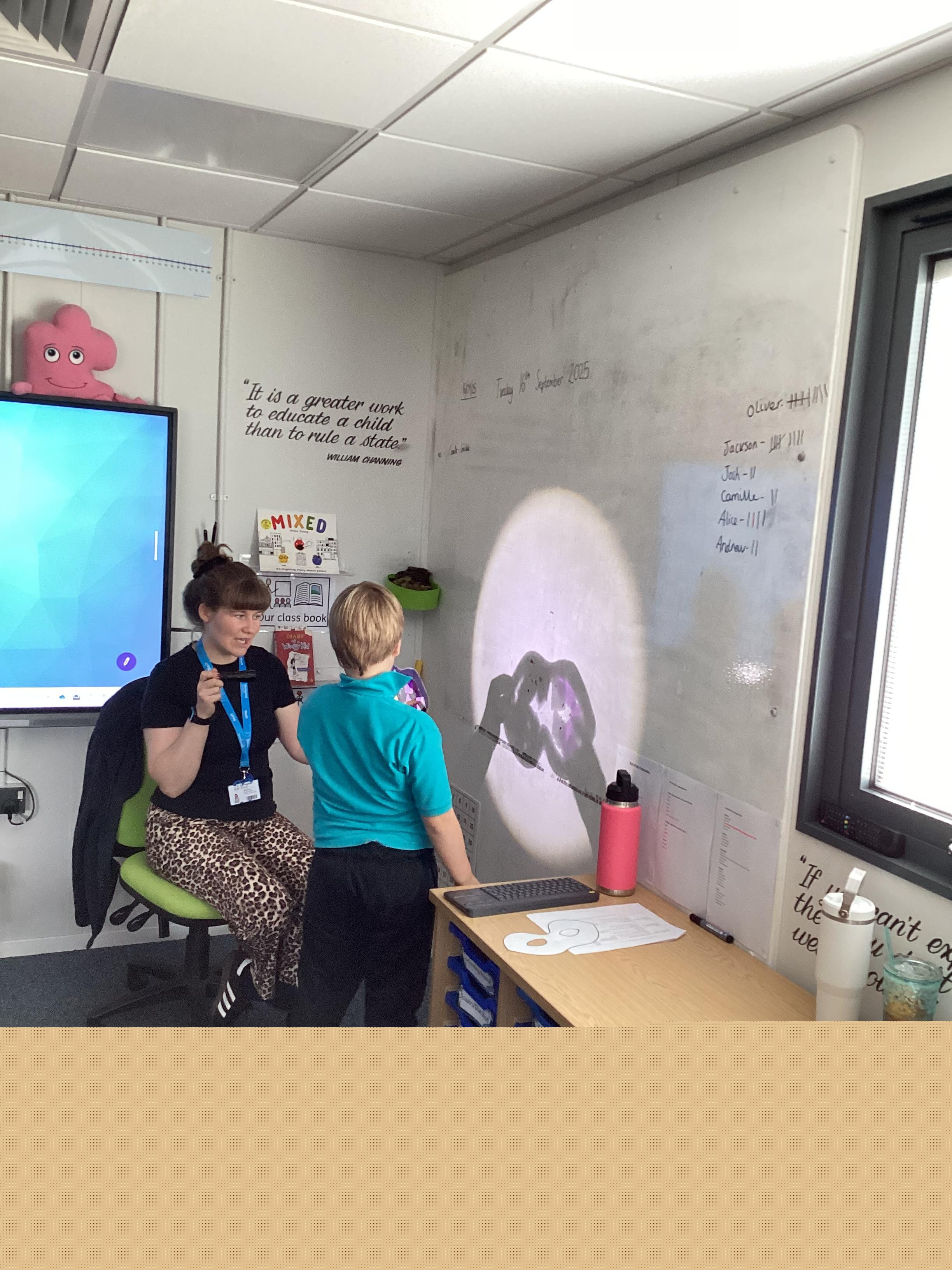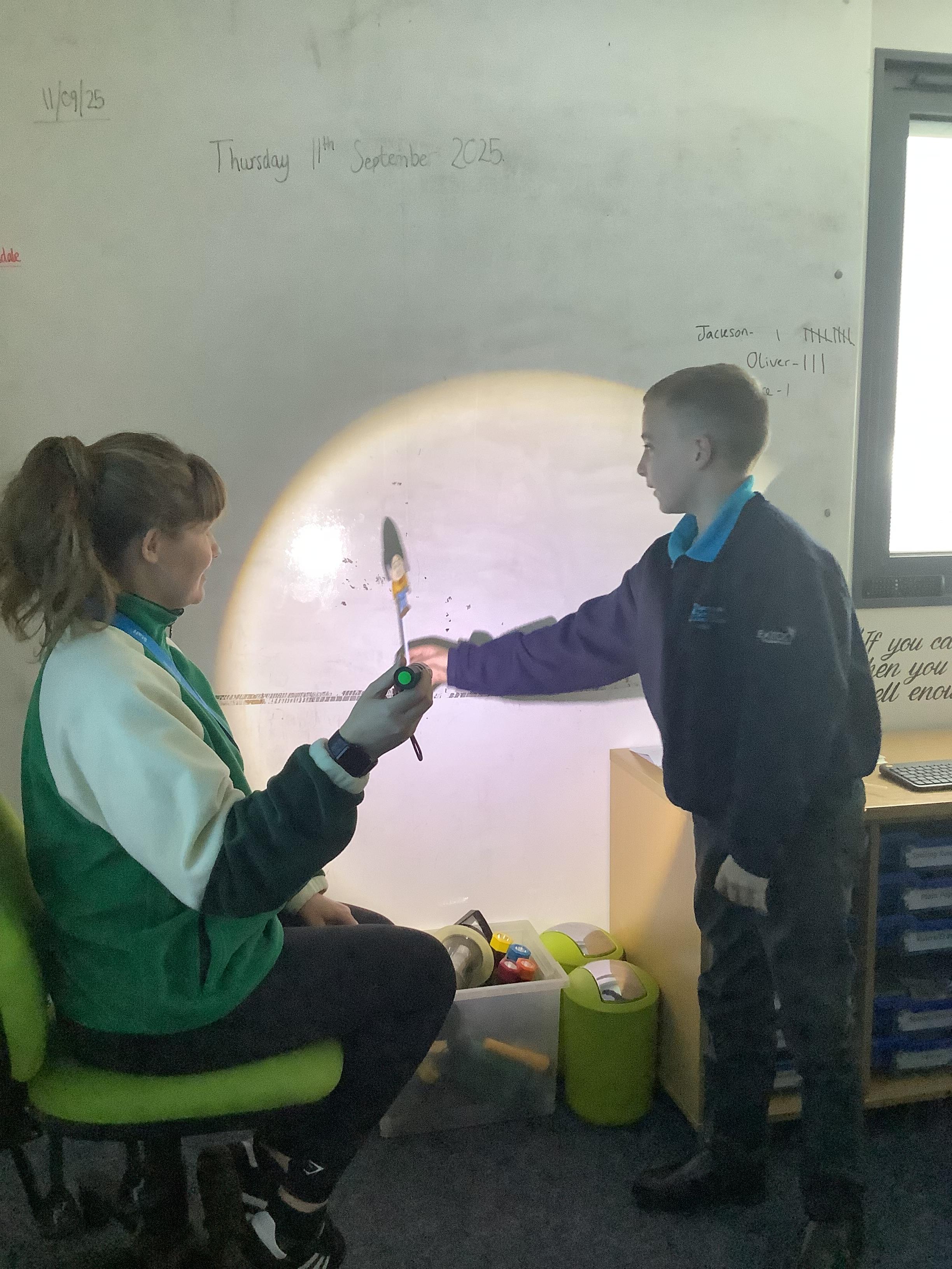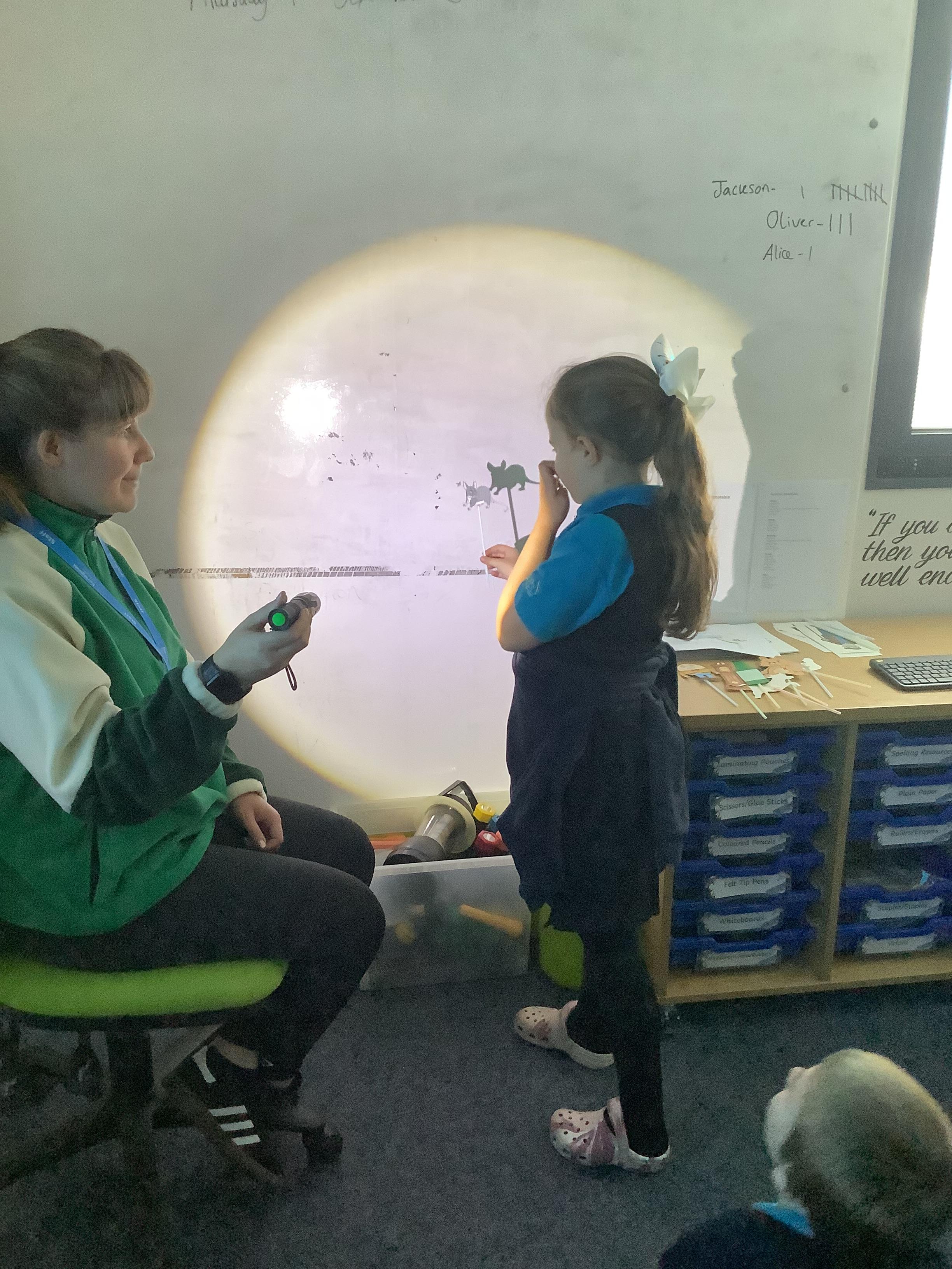 Thursday 11th September 2025 - In Science today, we focused on how we can make shadows bigger and smaller. We do this by moving the stick puppet closer (bigger) and further away (smaller) from the light source.