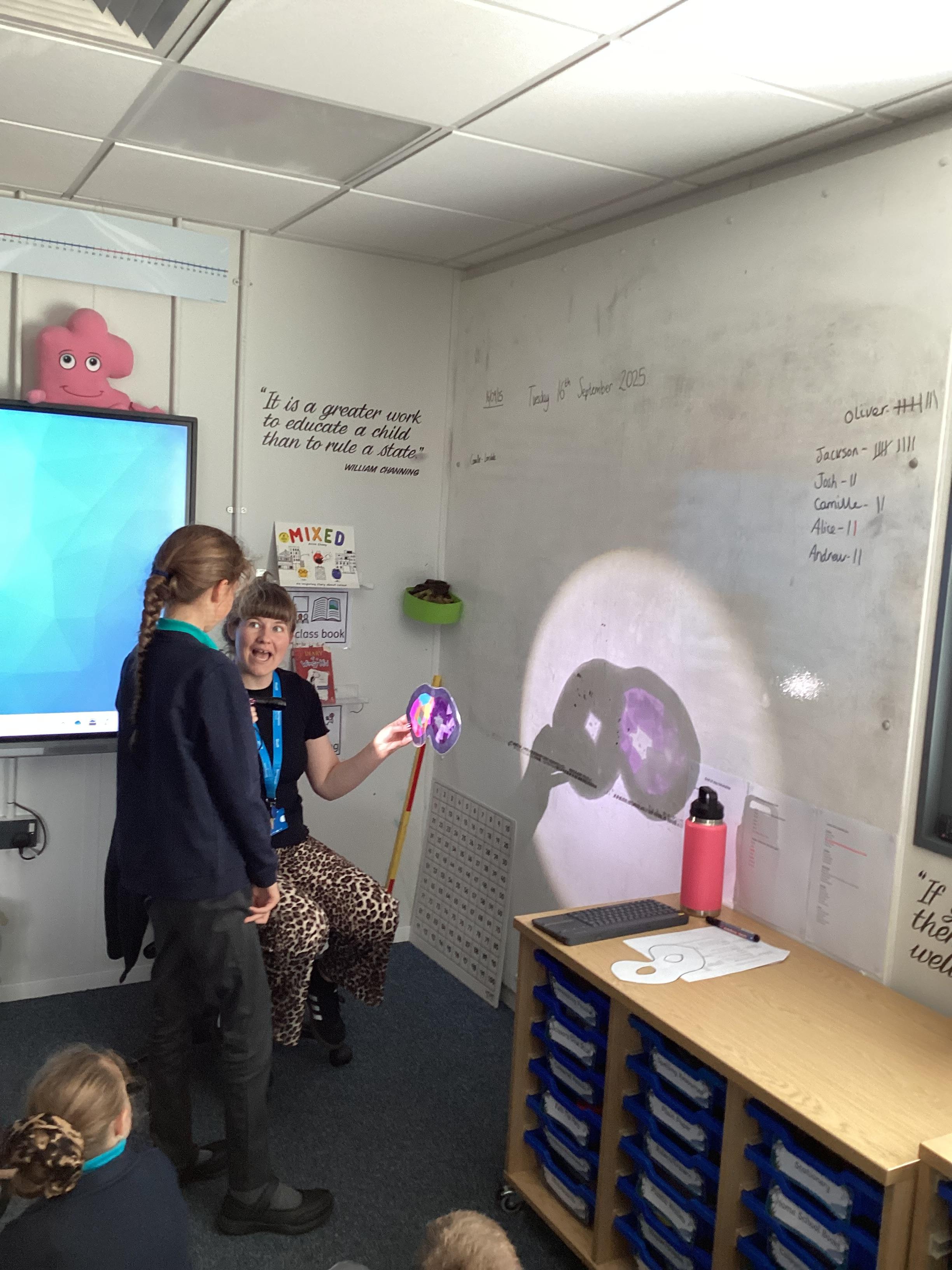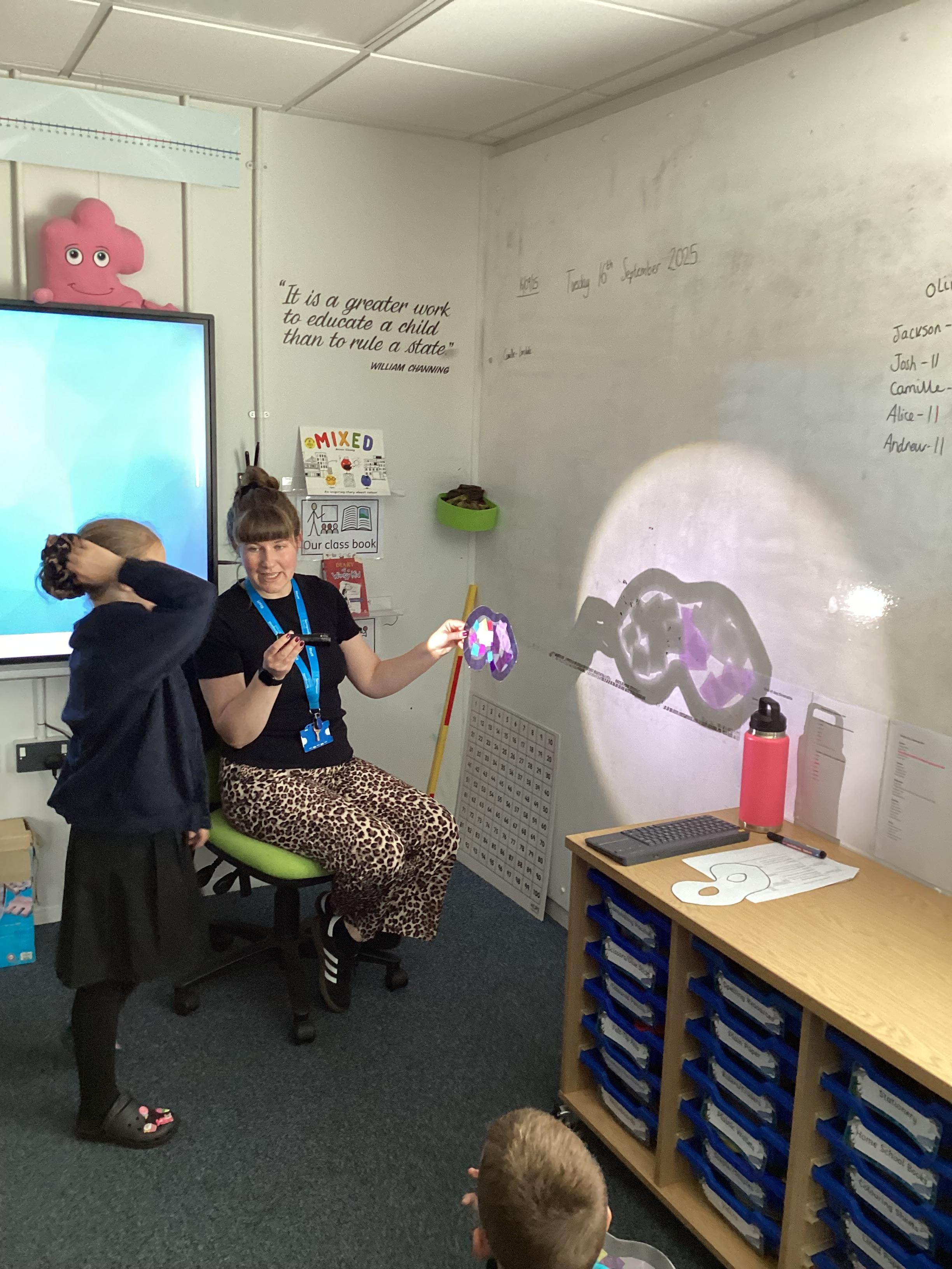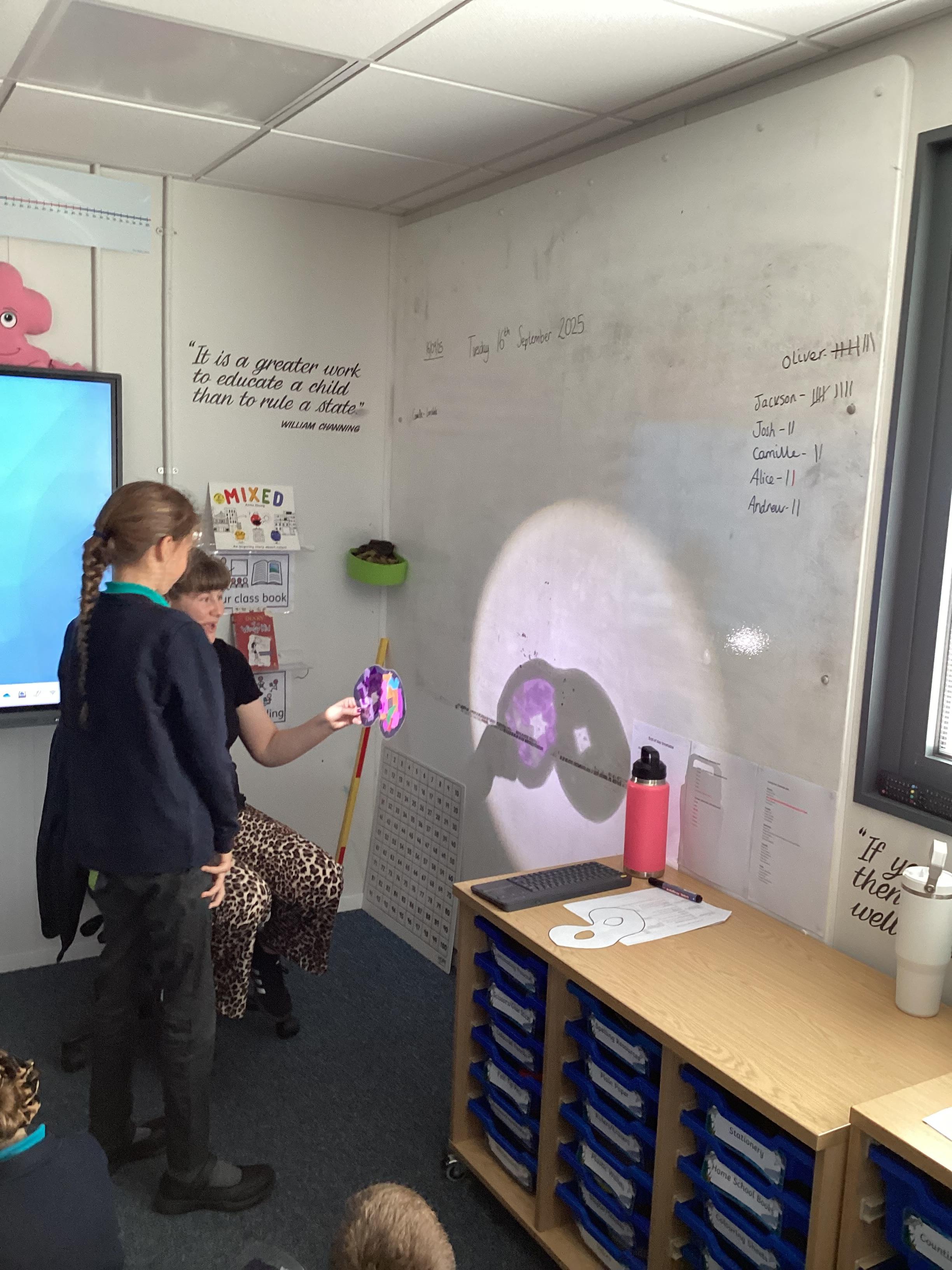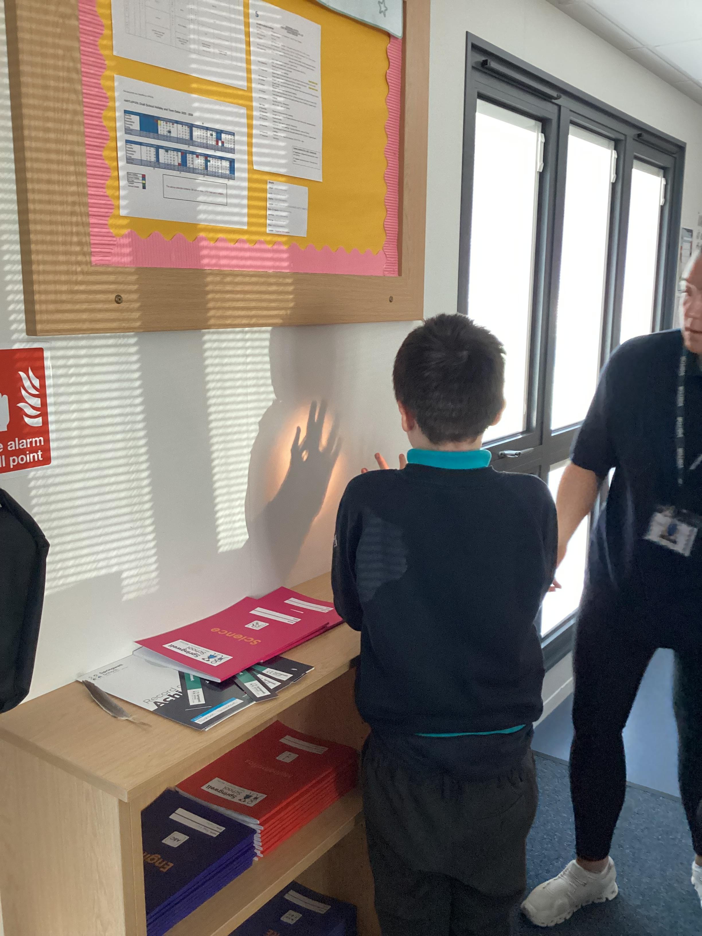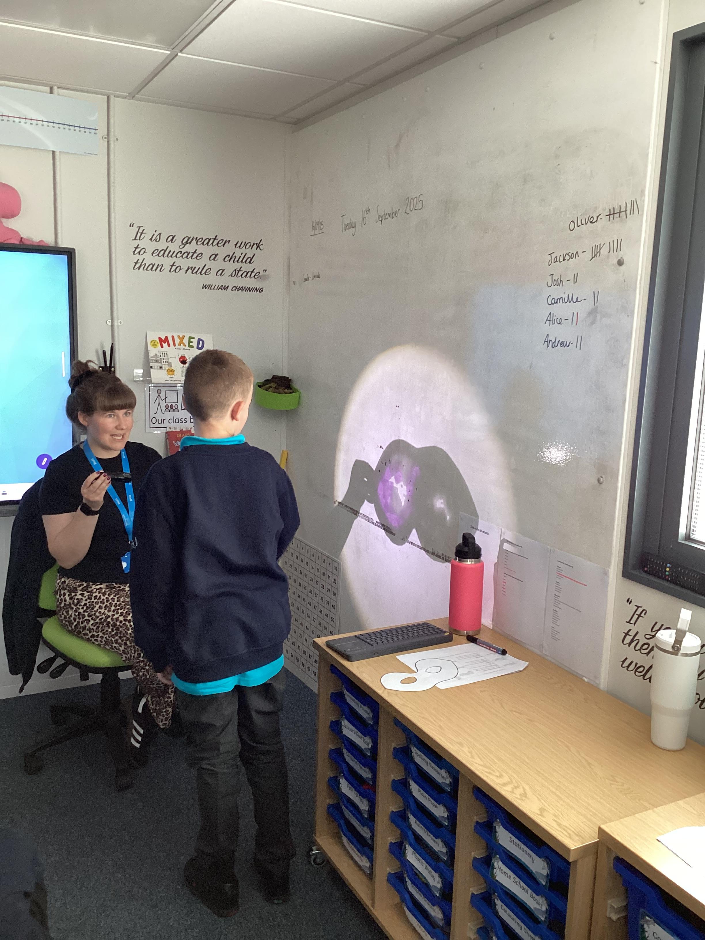 Thursday 11th September 2025 - In Science today, we focused on how we can make shadows bigger and smaller. We do this by moving the stick puppet closer (bigger) and further away (smaller) from the light source.