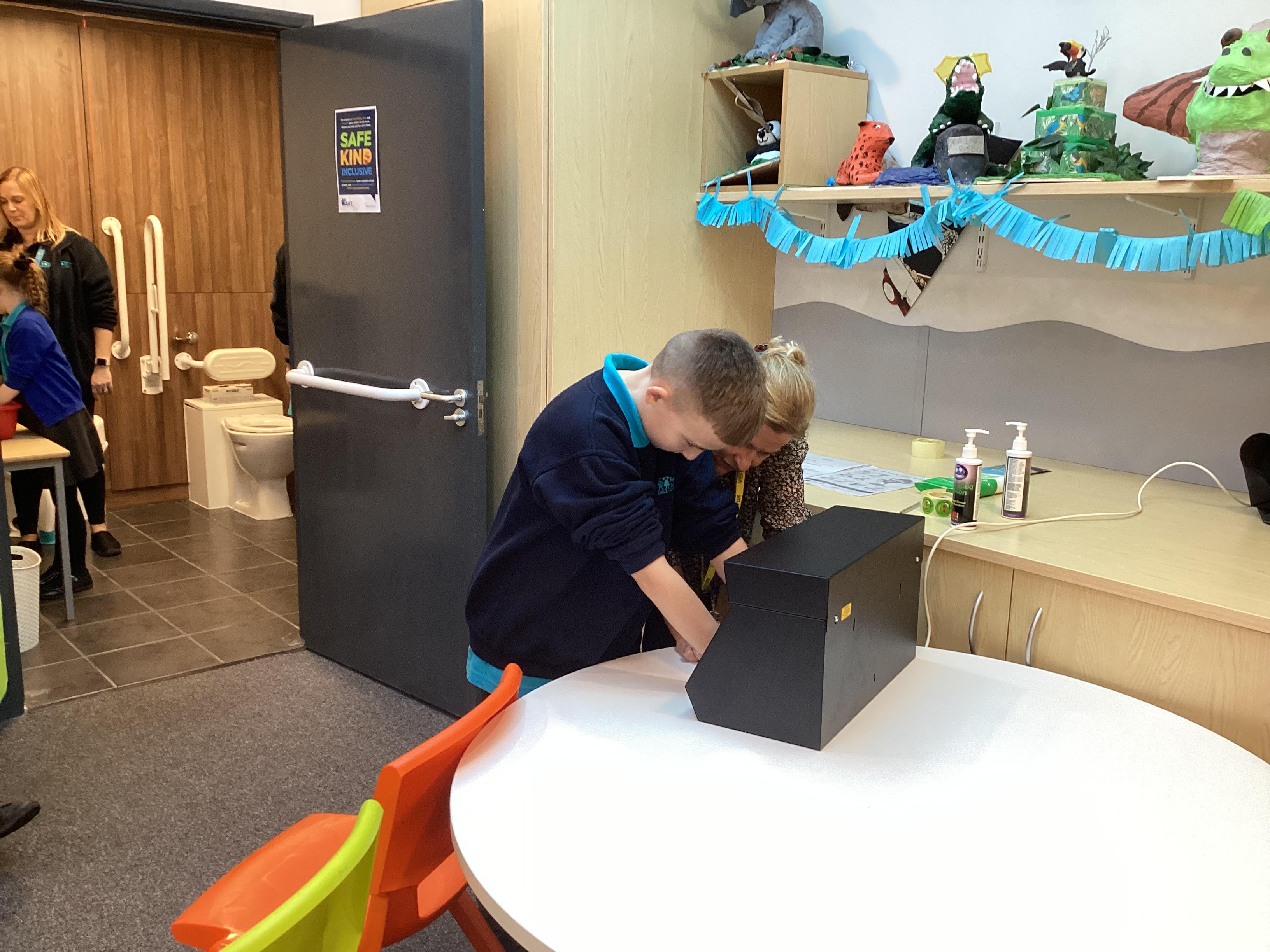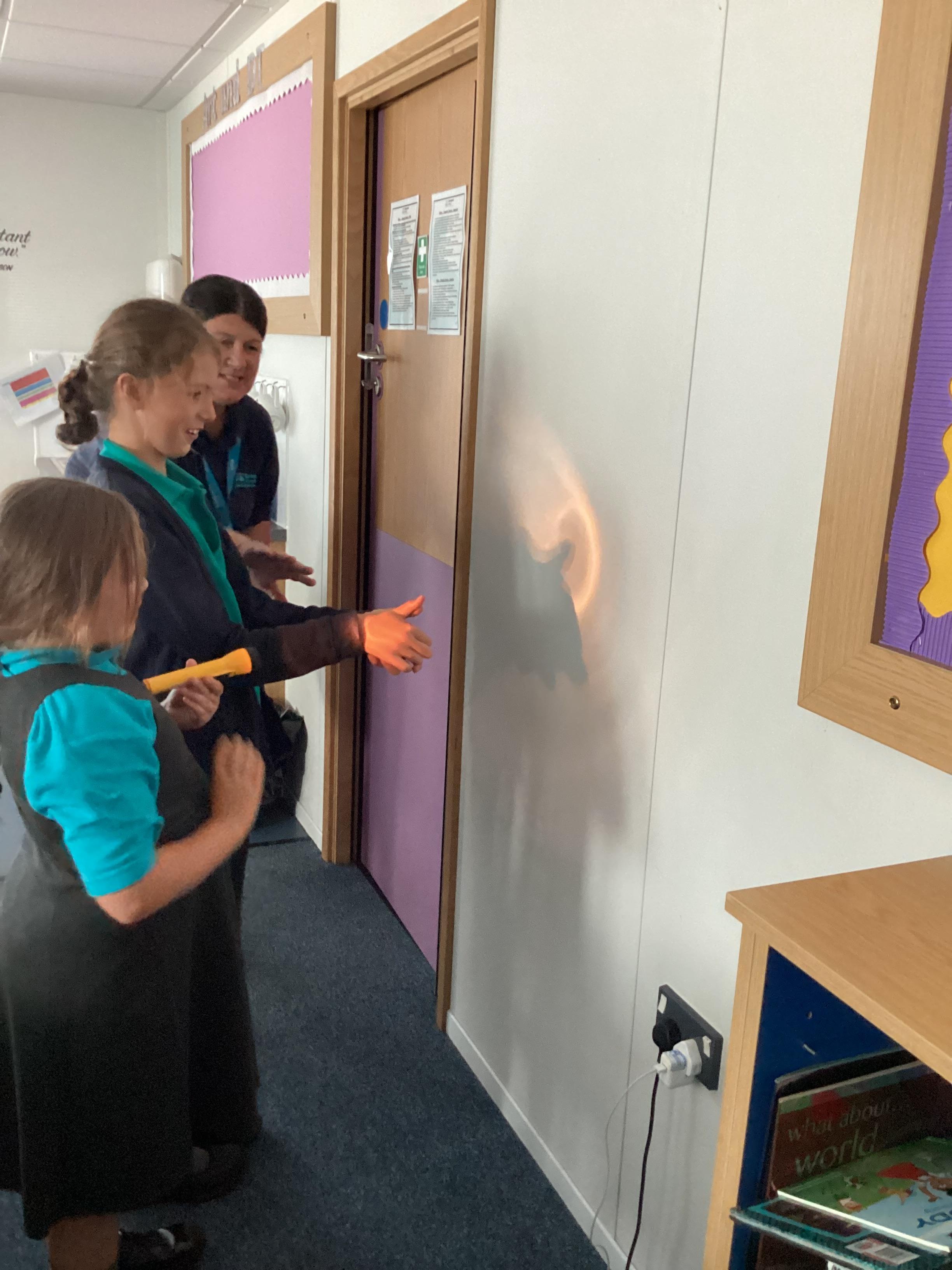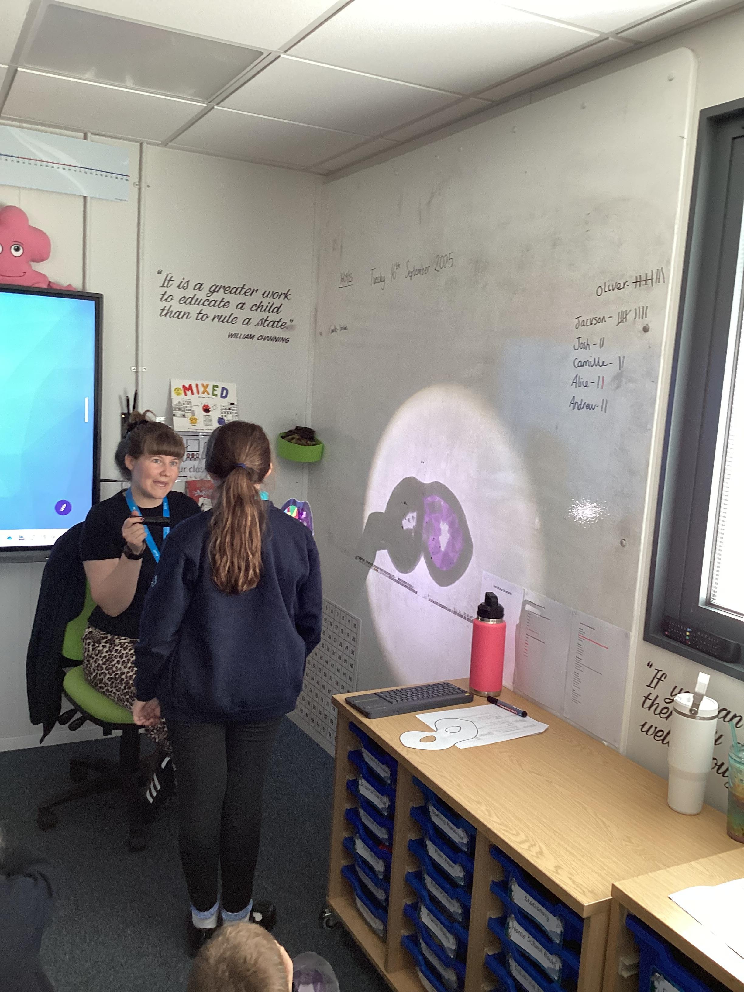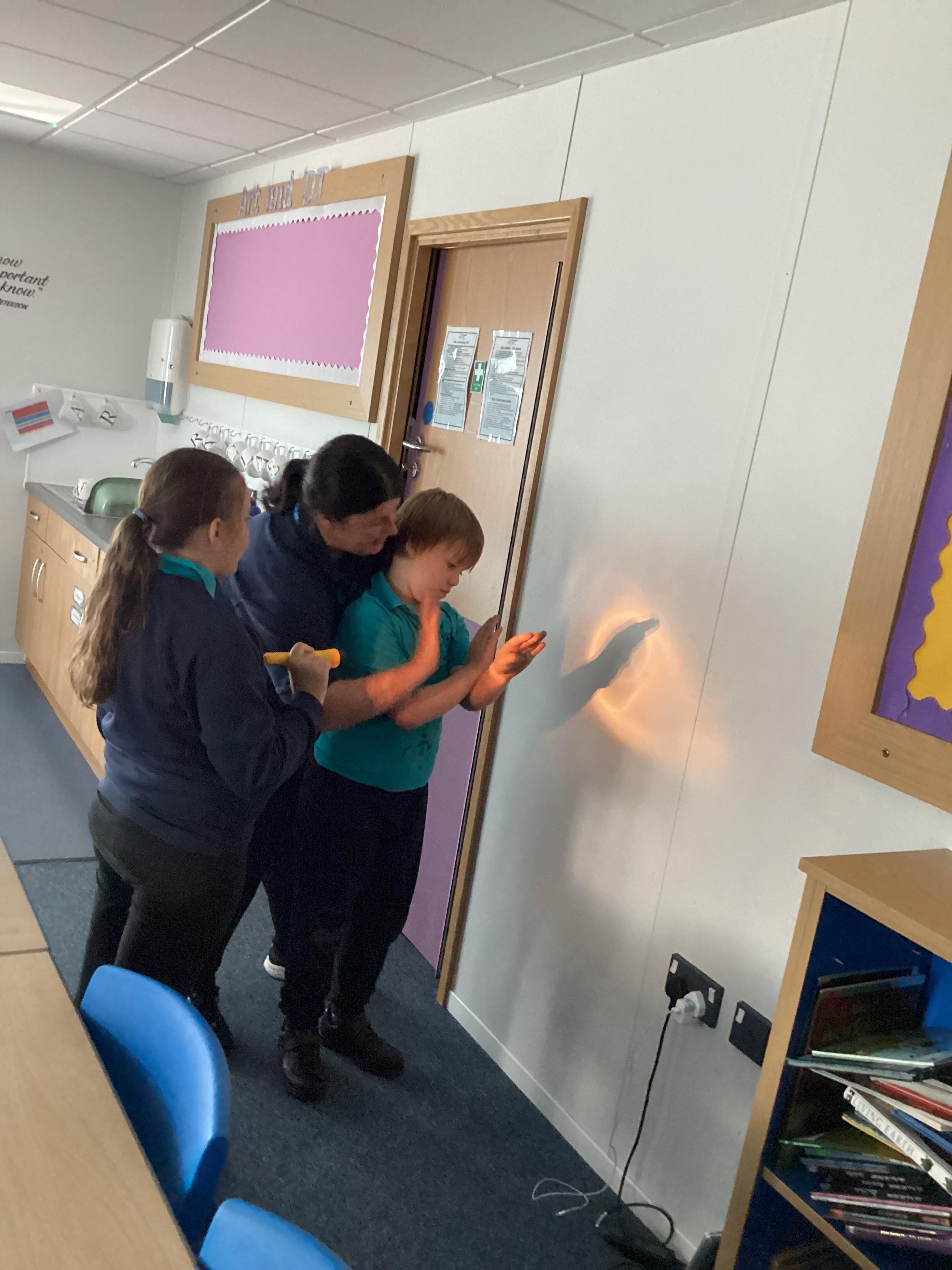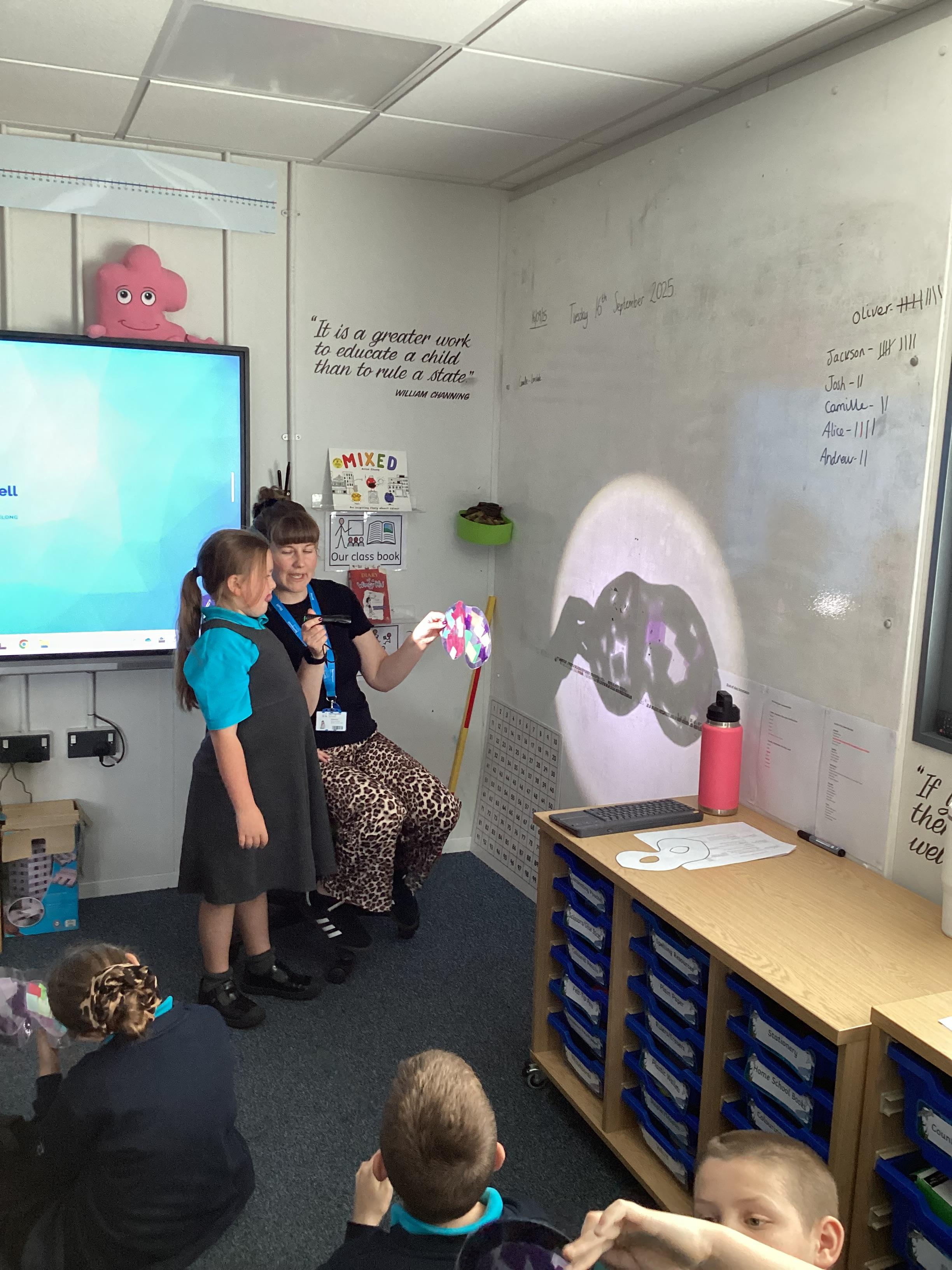 Thursday 11th September 2025 - In Science today, we focused on how we can make shadows bigger and smaller. We do this by moving the stick puppet closer (bigger) and further away (smaller) from the light source.