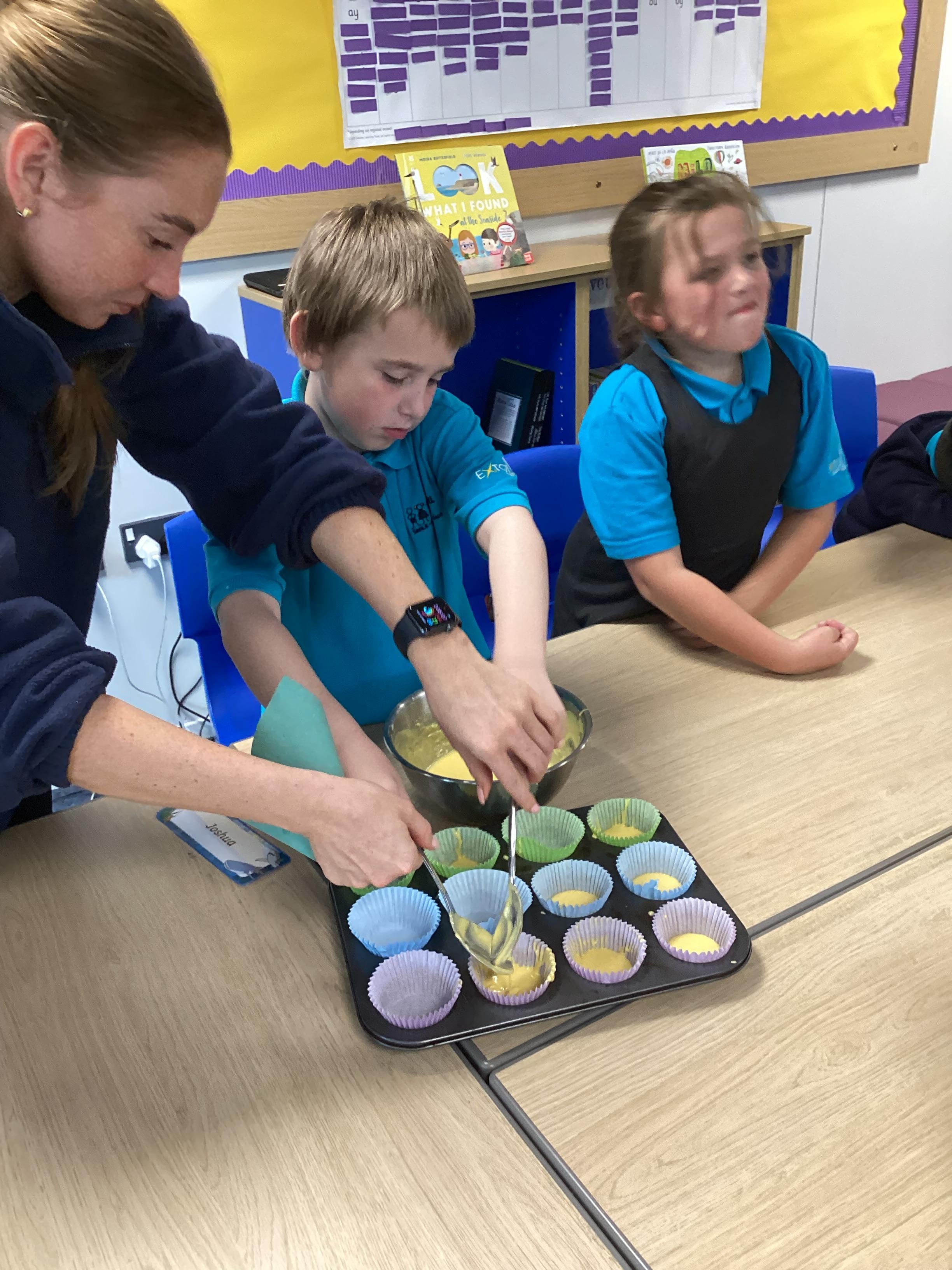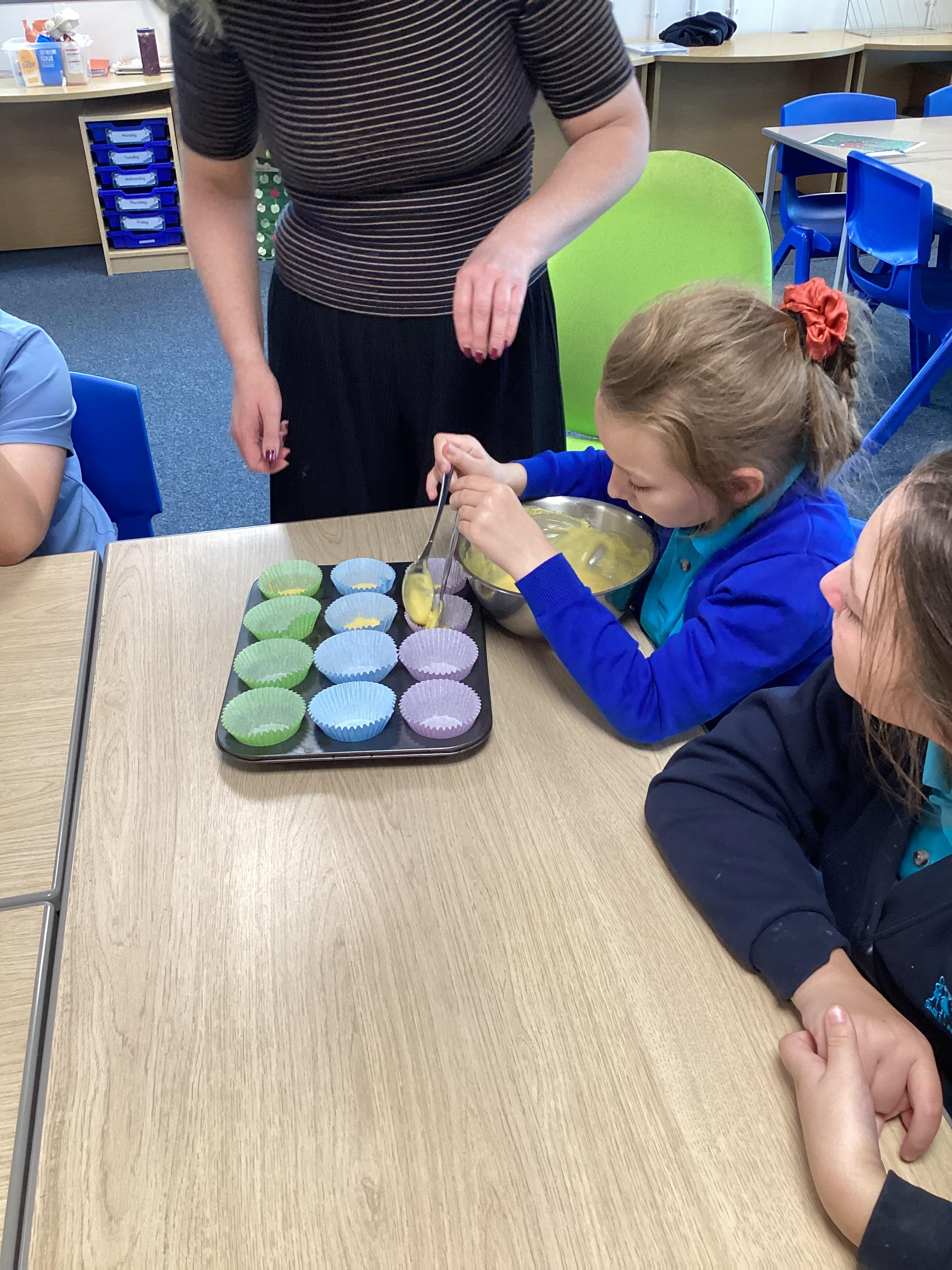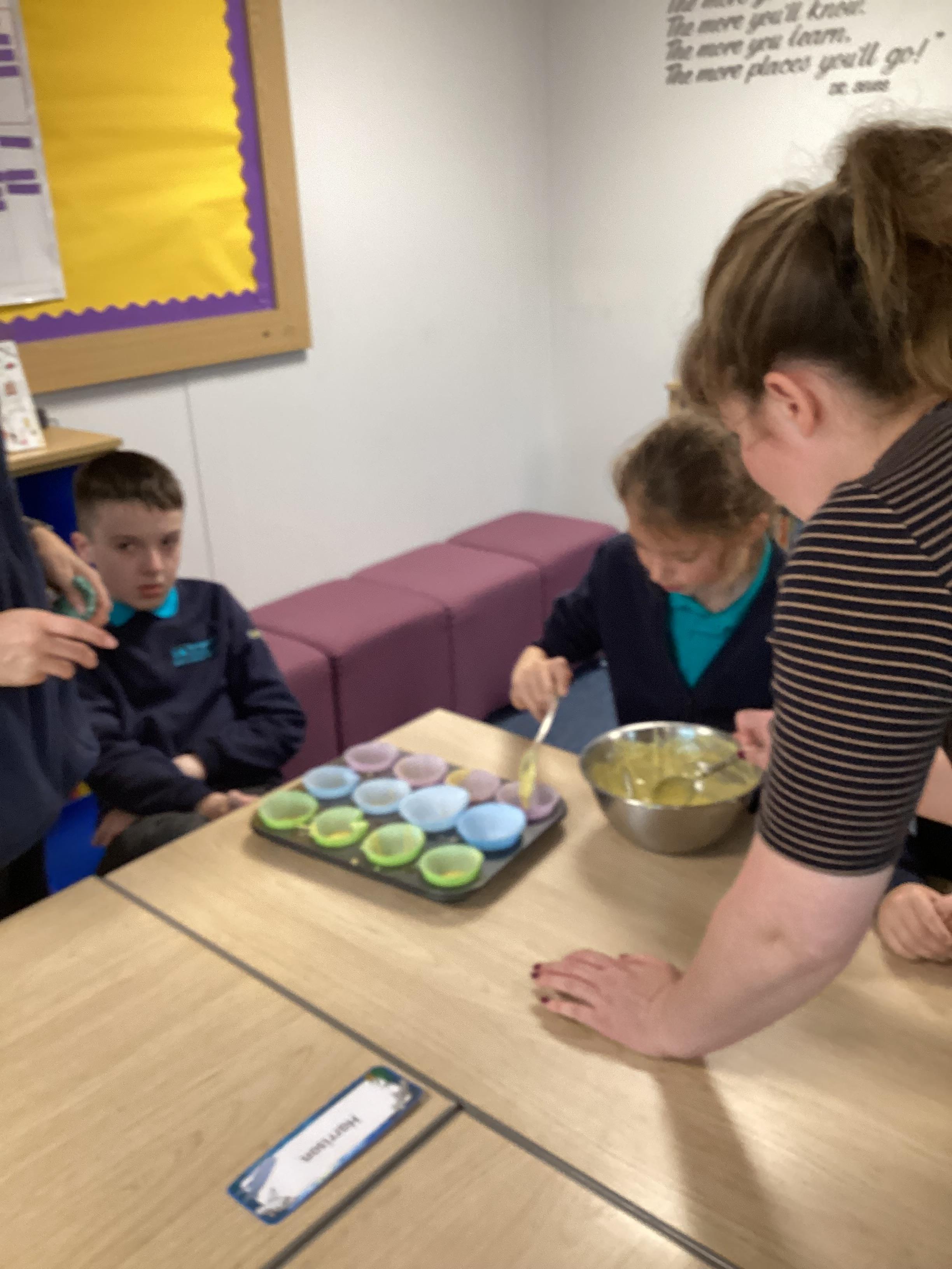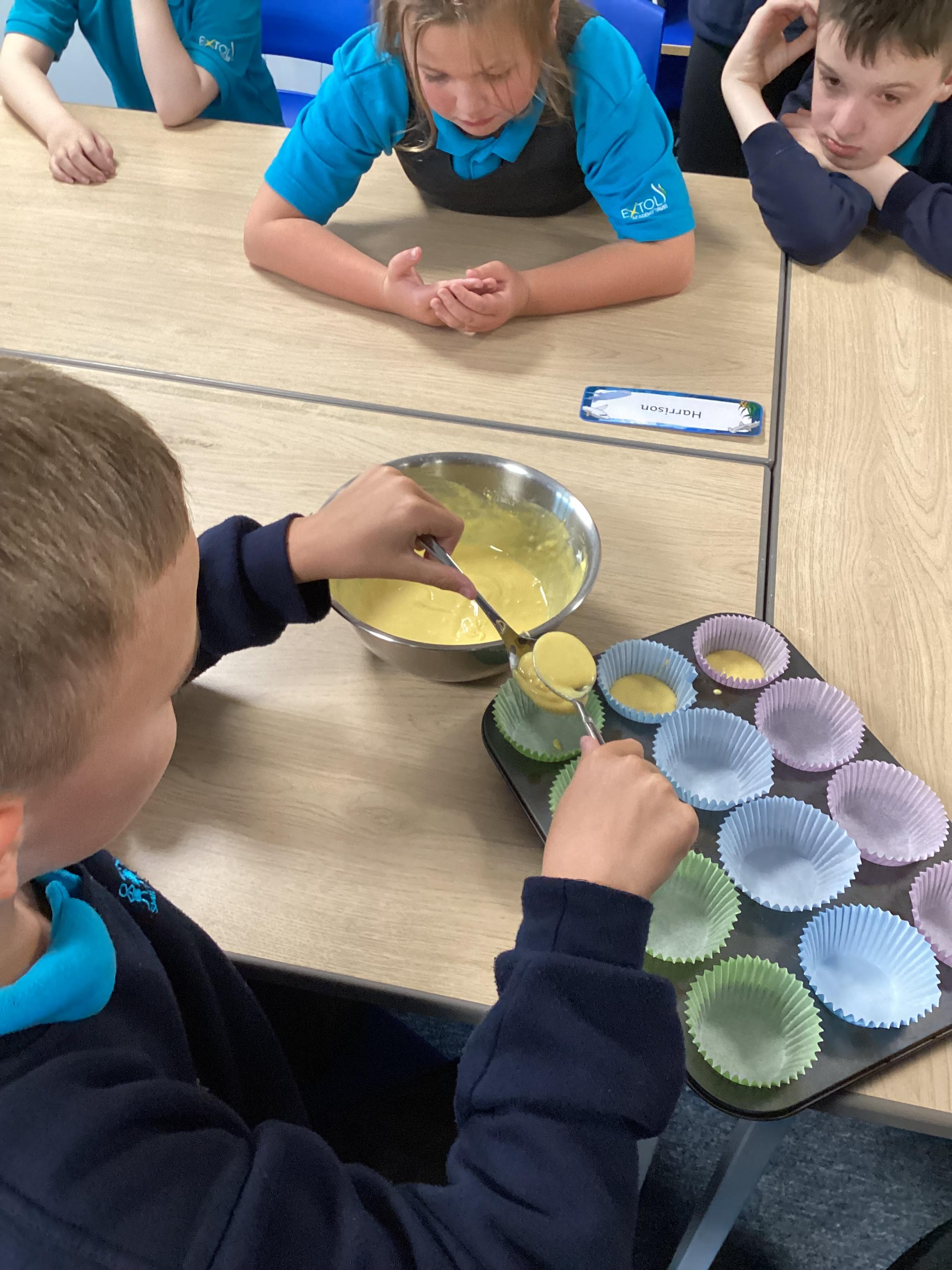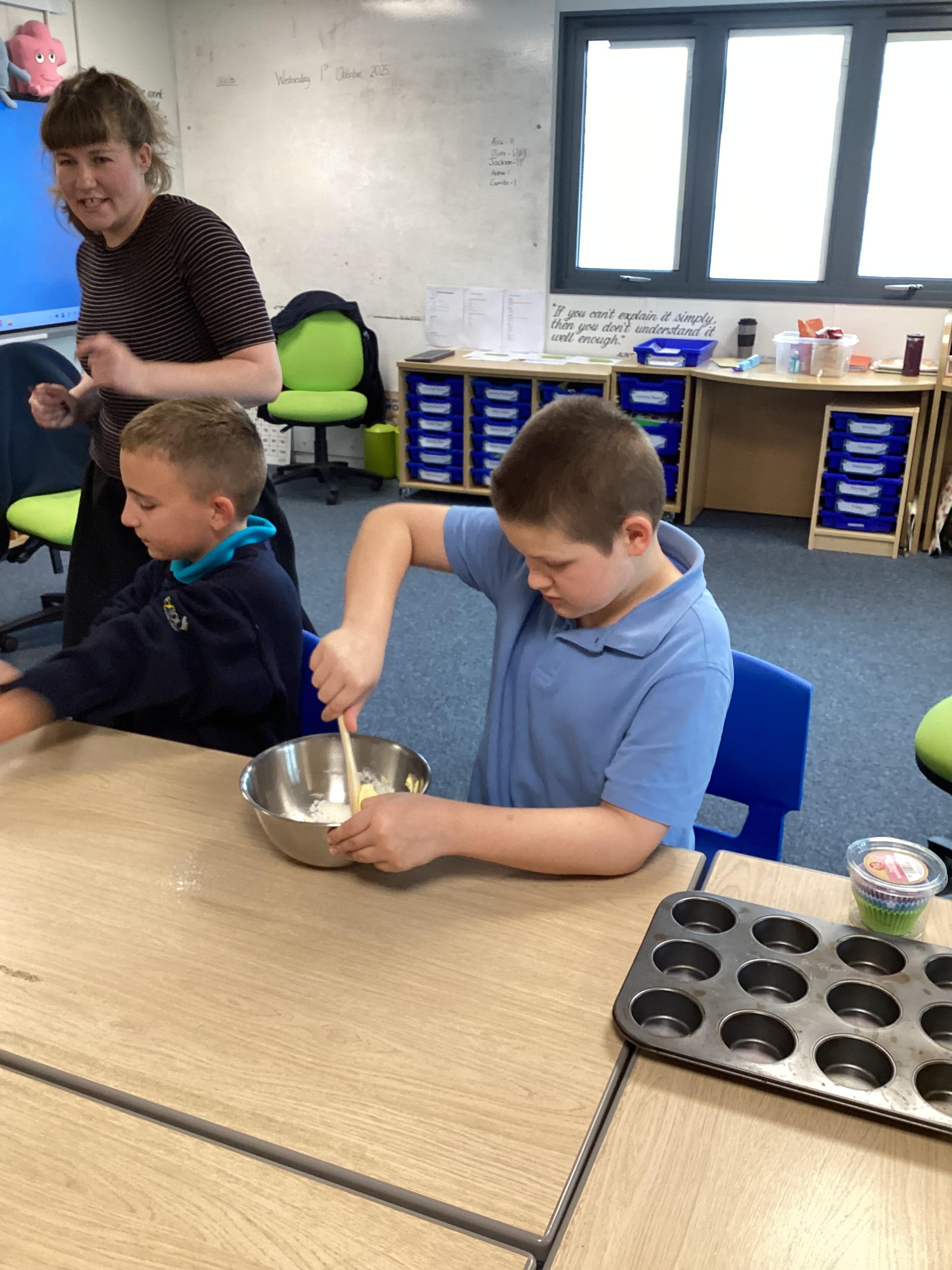 Wednesday 1st October 2025 - In Cookery today, we made some cakes. We took our time measuring out the ingredients. We then took turns to mix the ingredients and put the mixture into the cake cases.