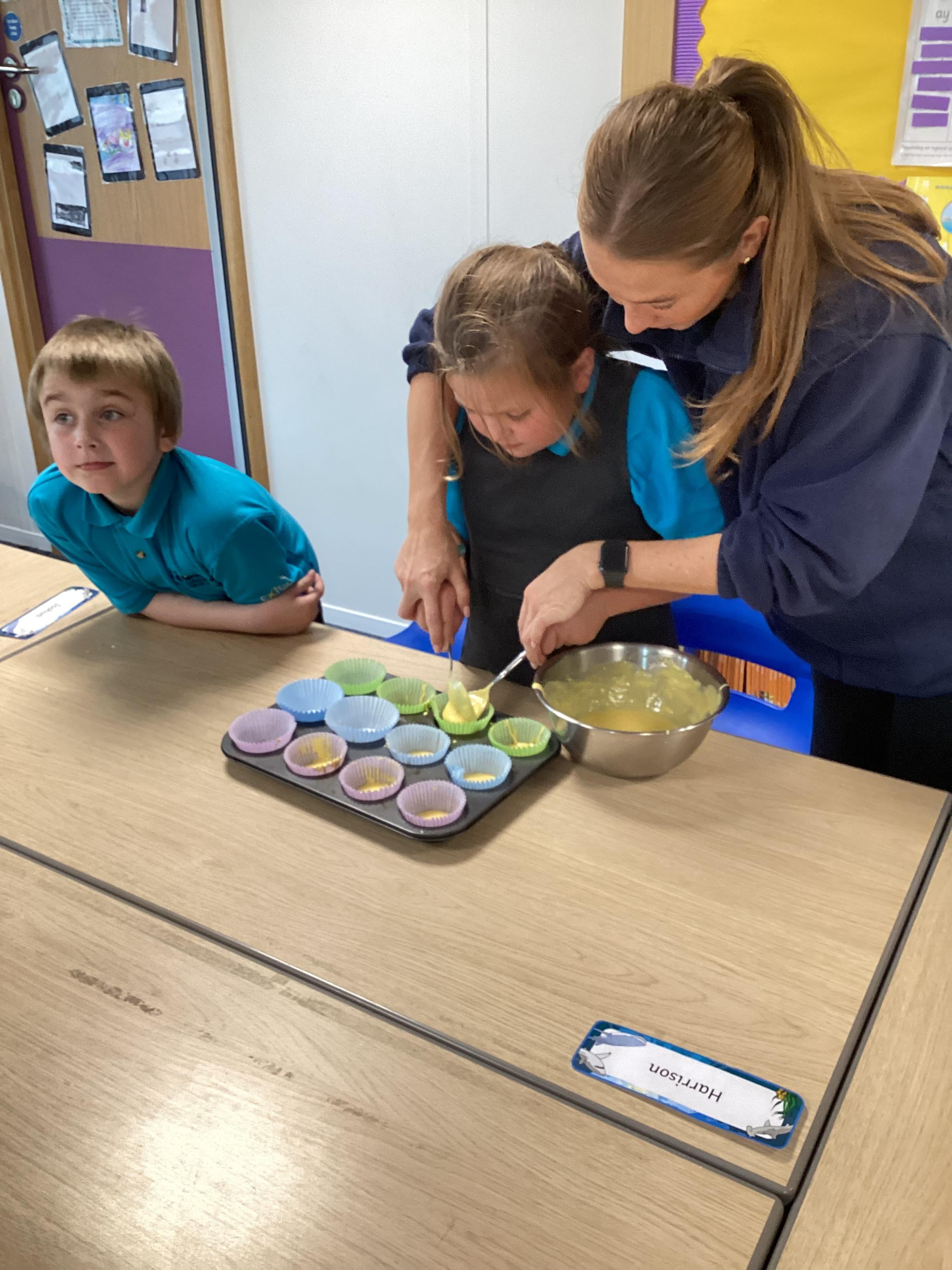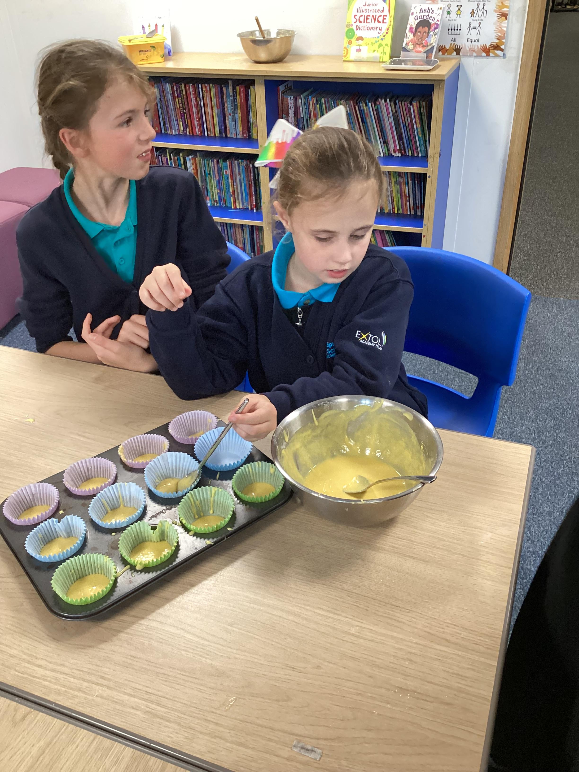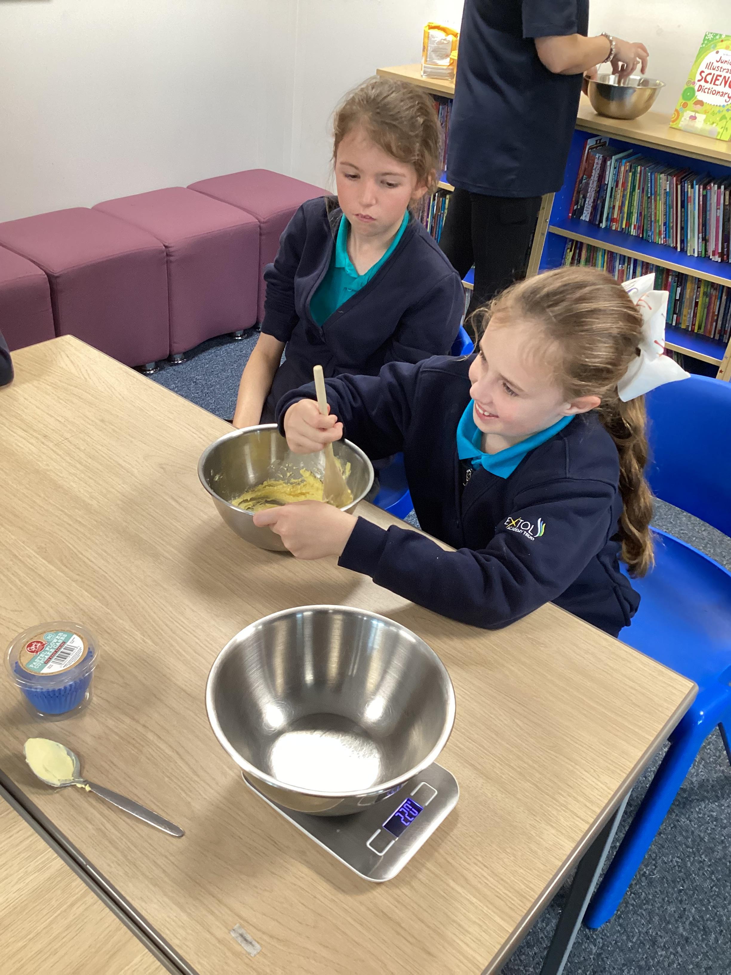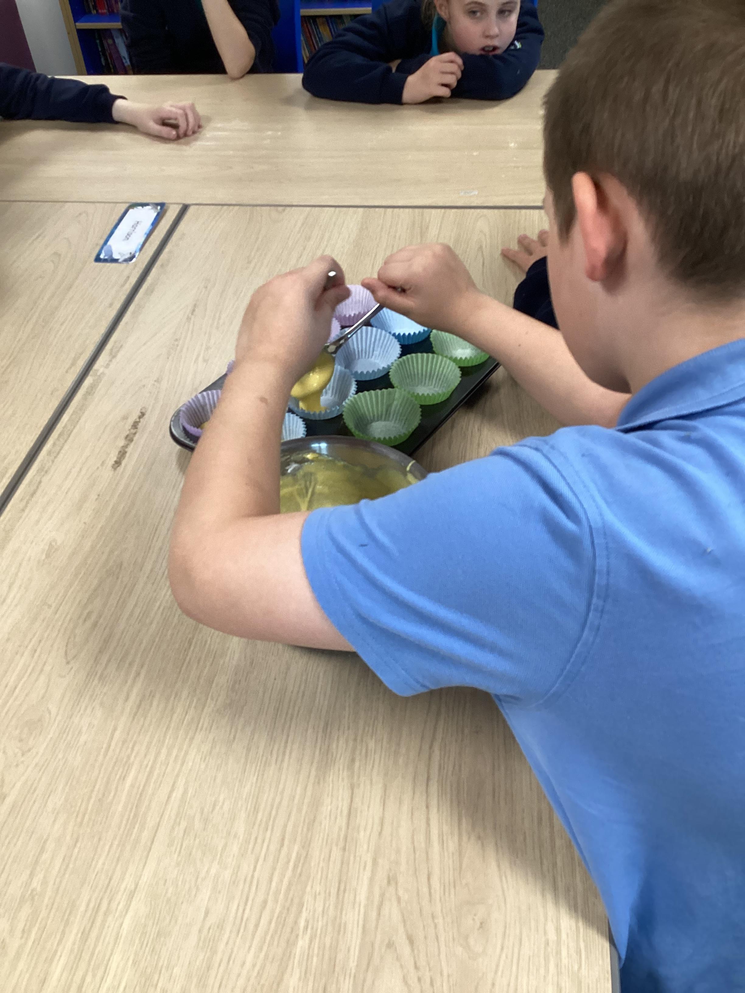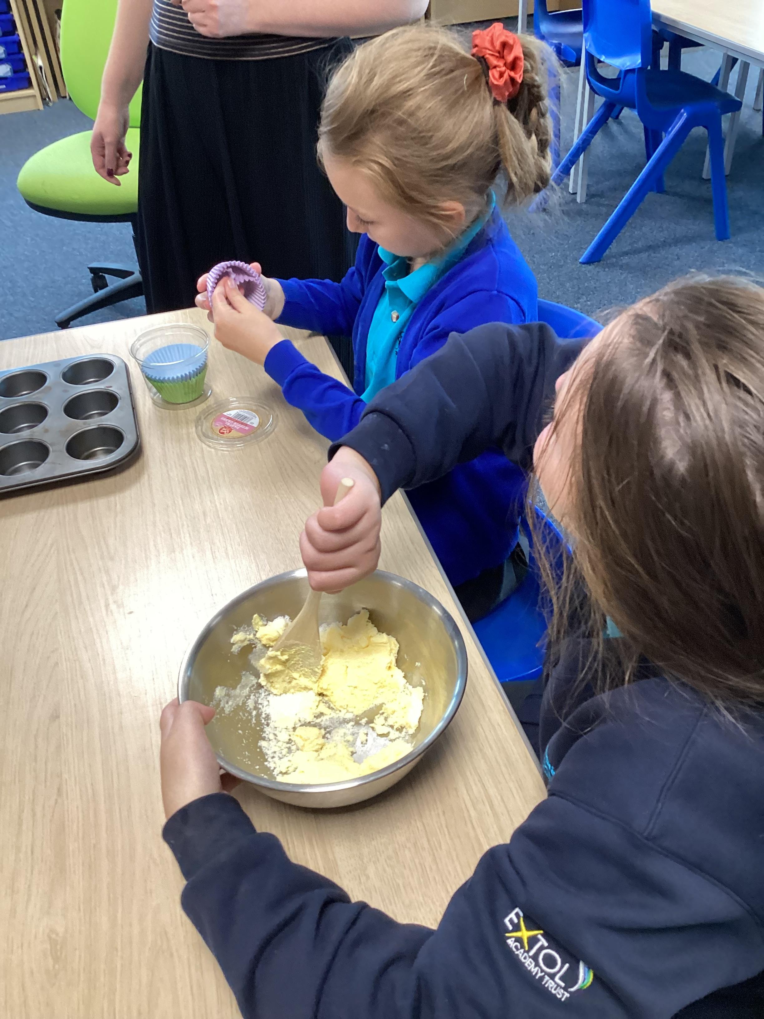 Wednesday 1st October 2025 - In Cookery today, we made some cakes. We took our time measuring out the ingredients. We then took turns to mix the ingredients and put the mixture into the cake cases.