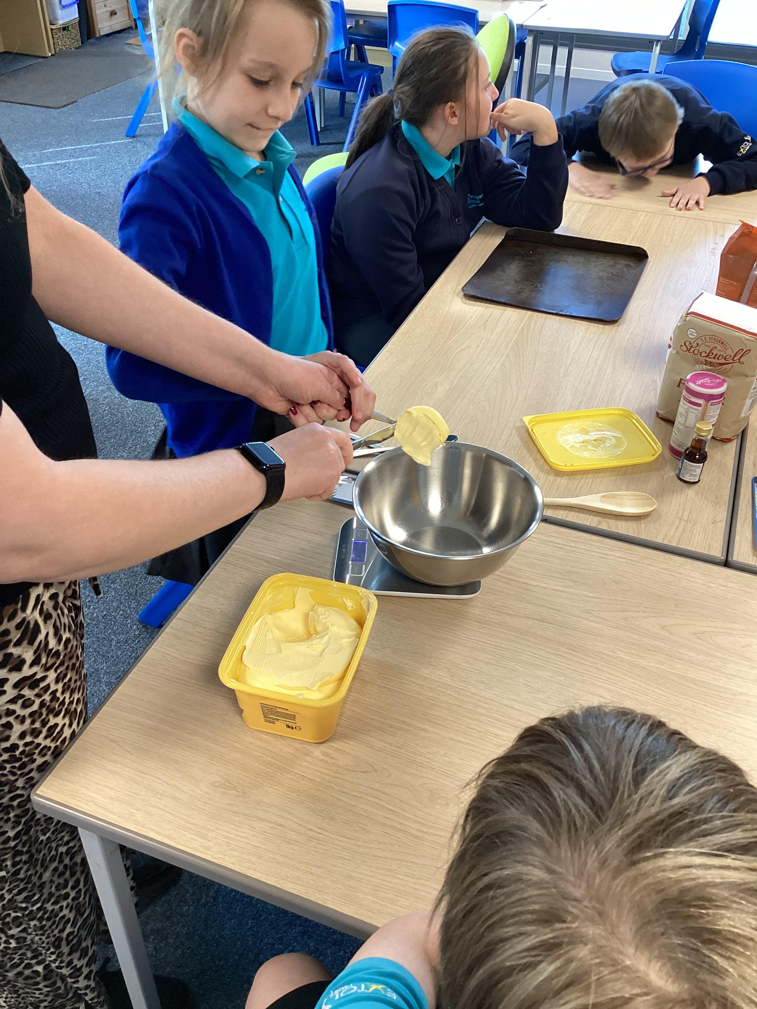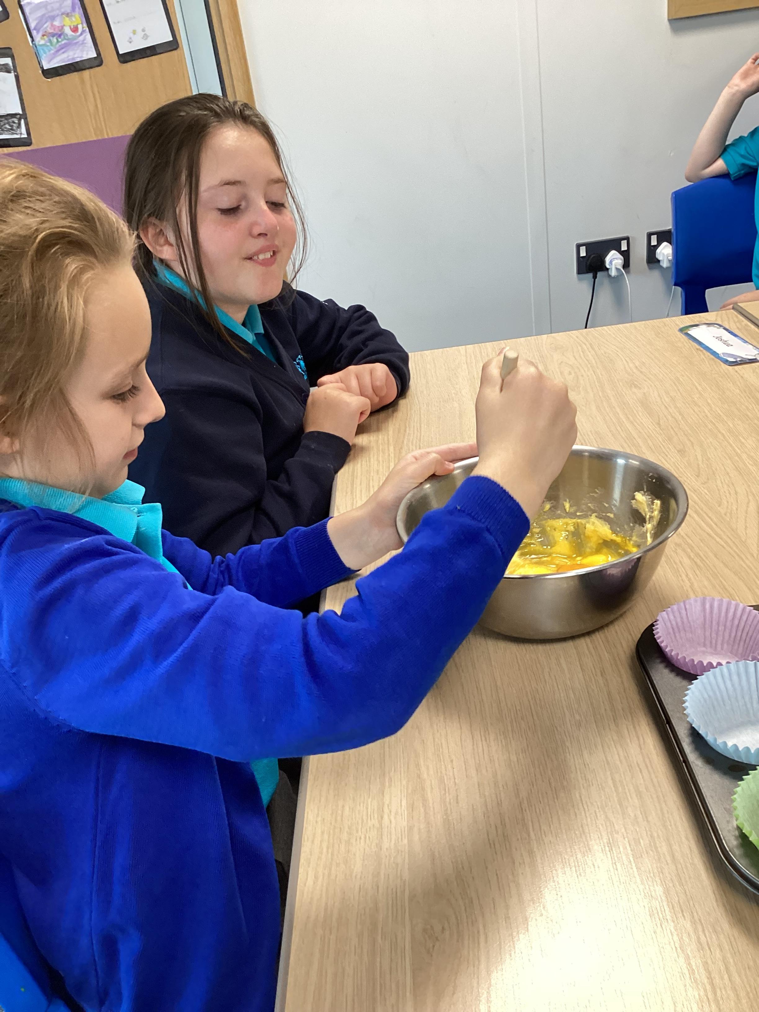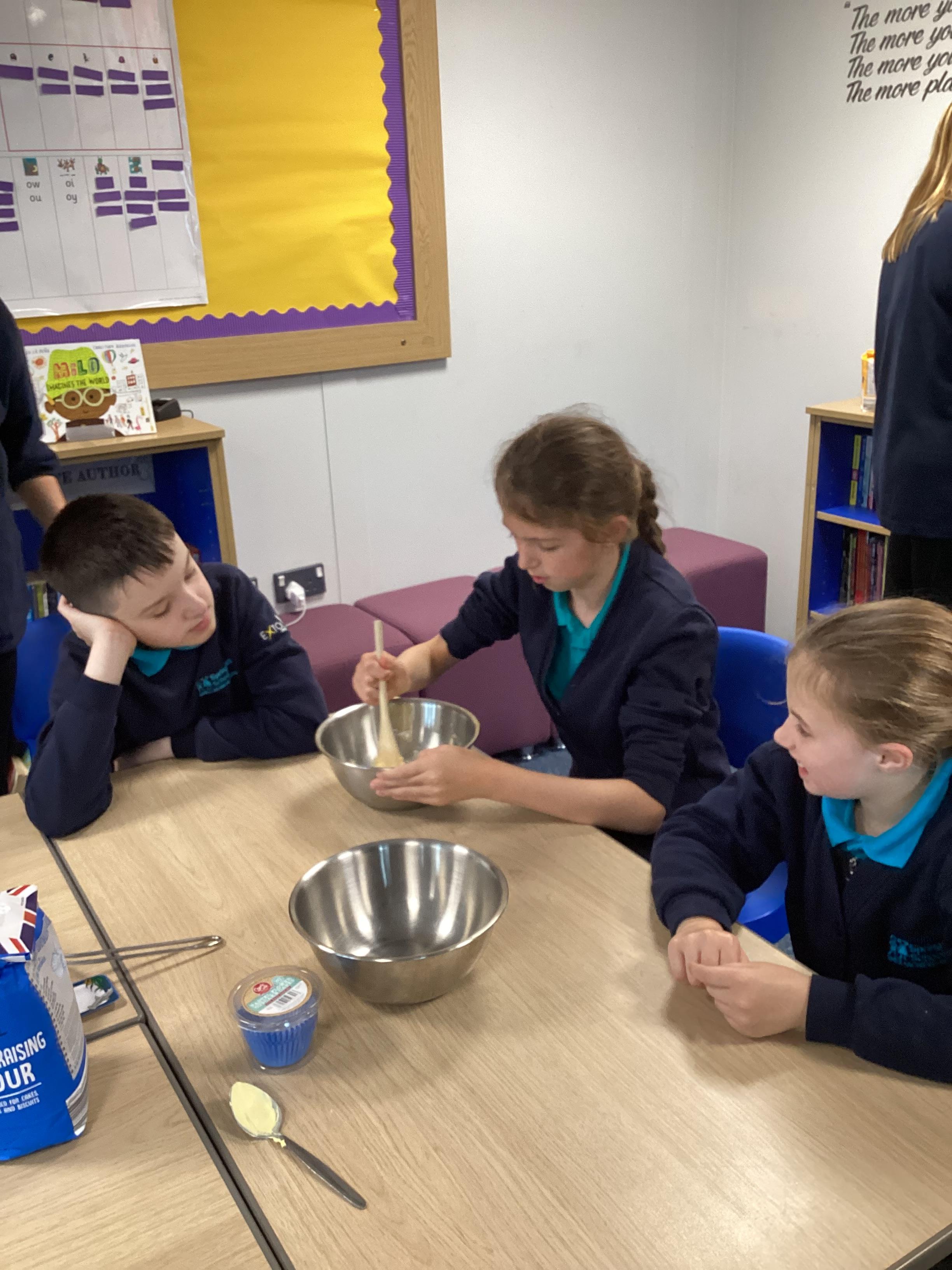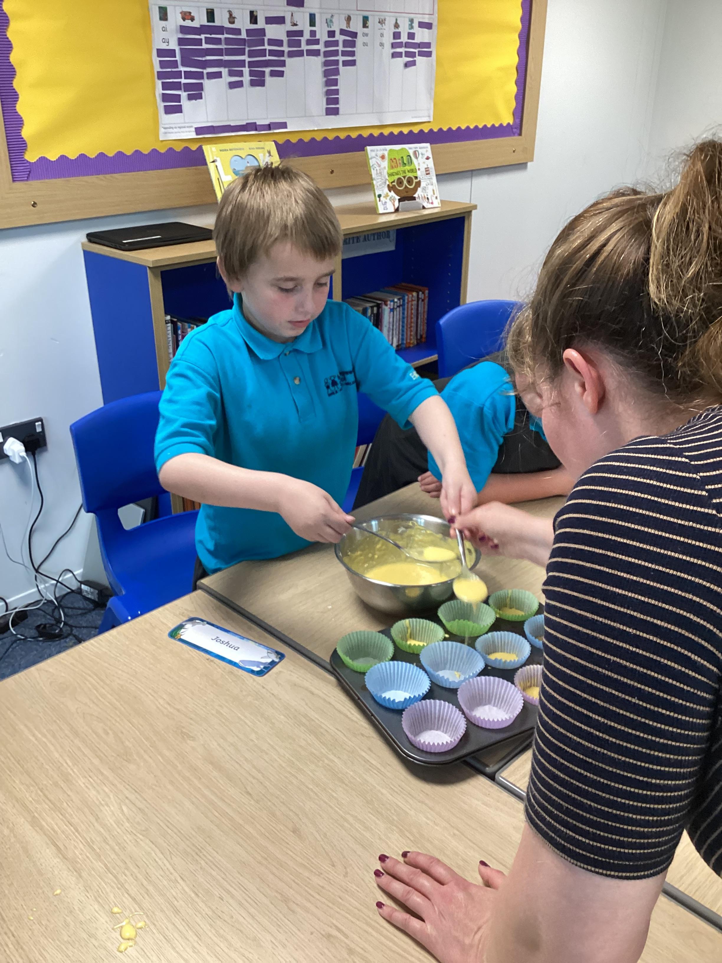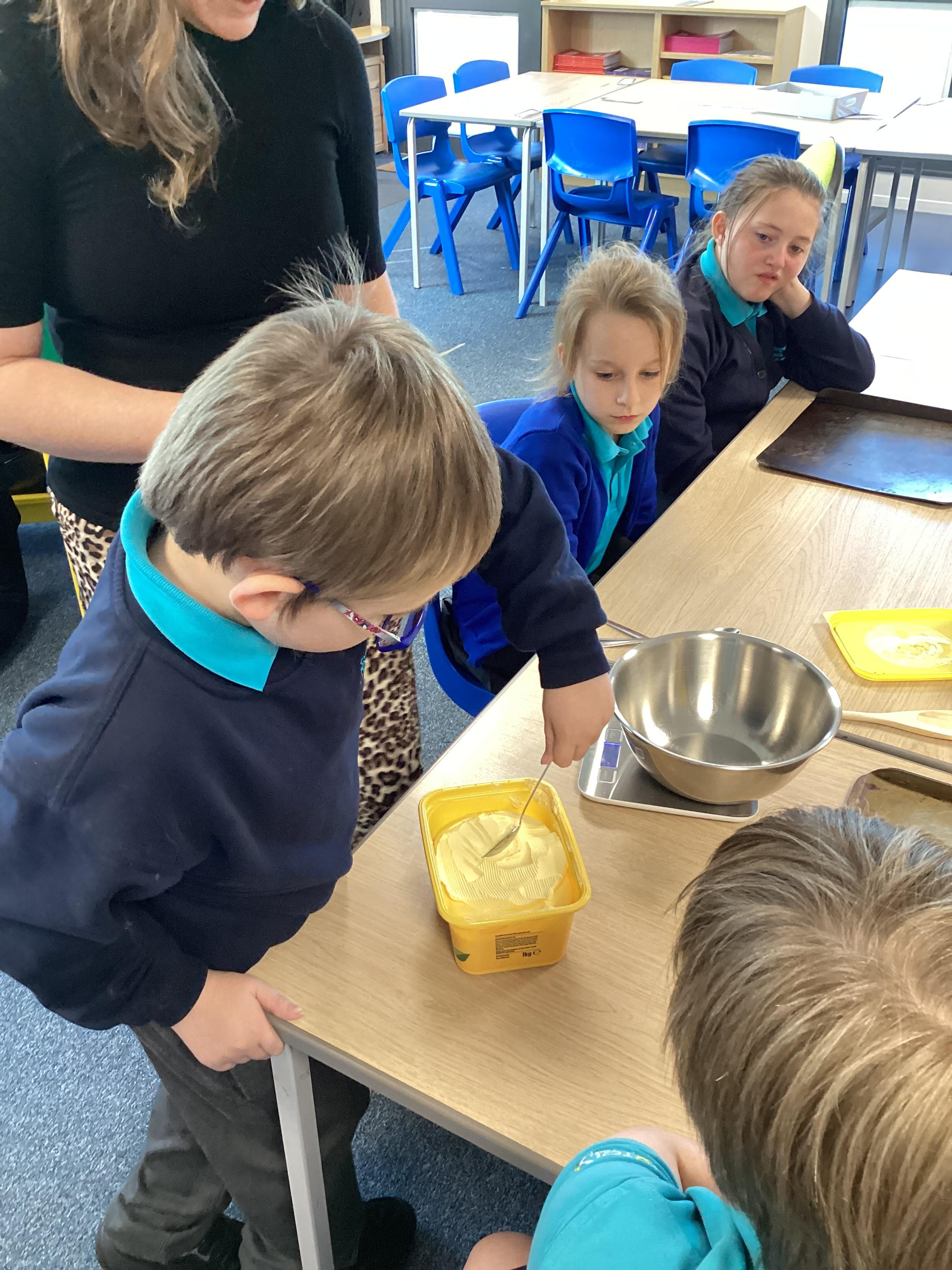 Wednesday 1st October 2025 - In Cookery today, we made some cakes. We took our time measuring out the ingredients. We then took turns to mix the ingredients and put the mixture into the cake cases.