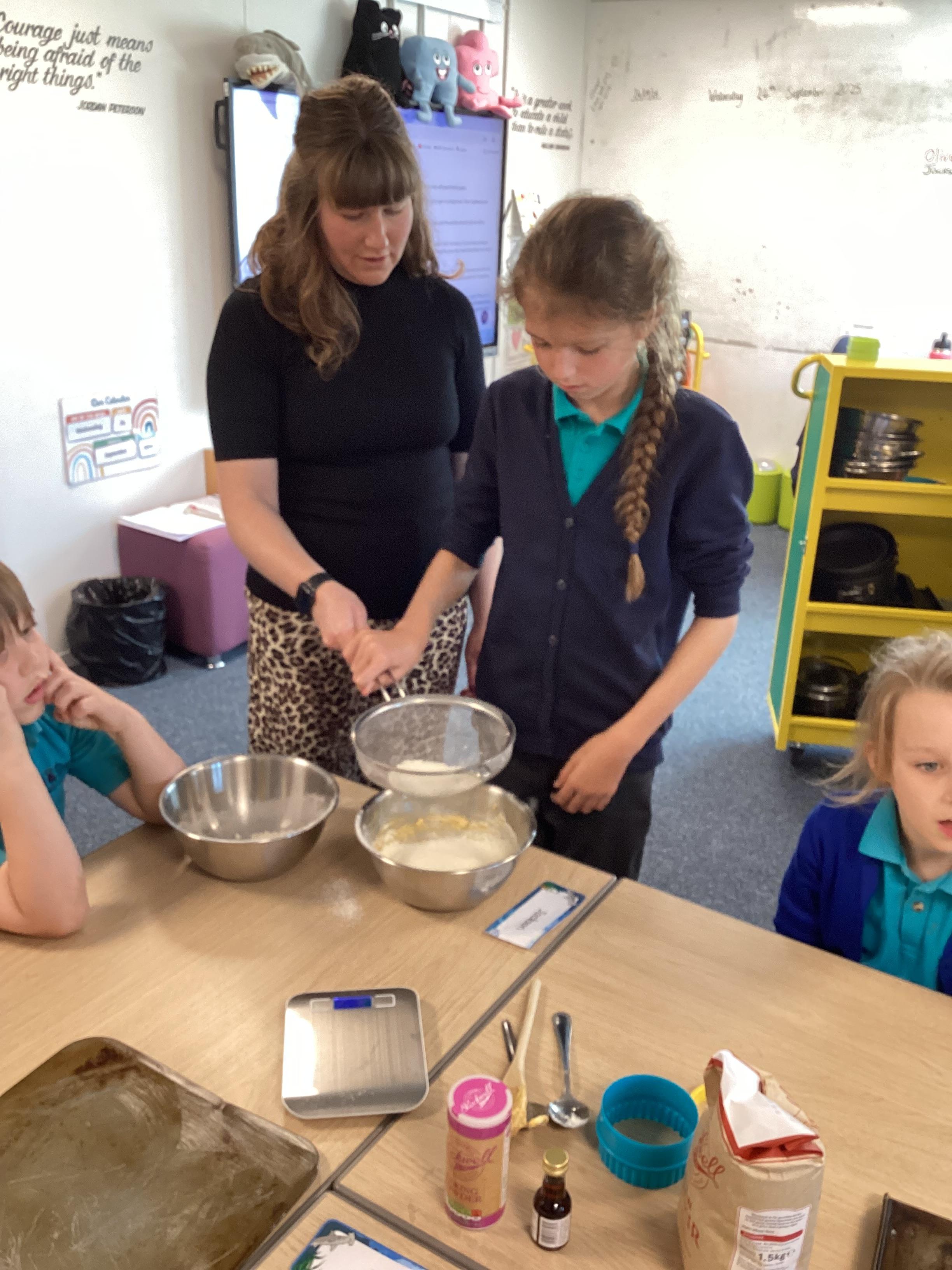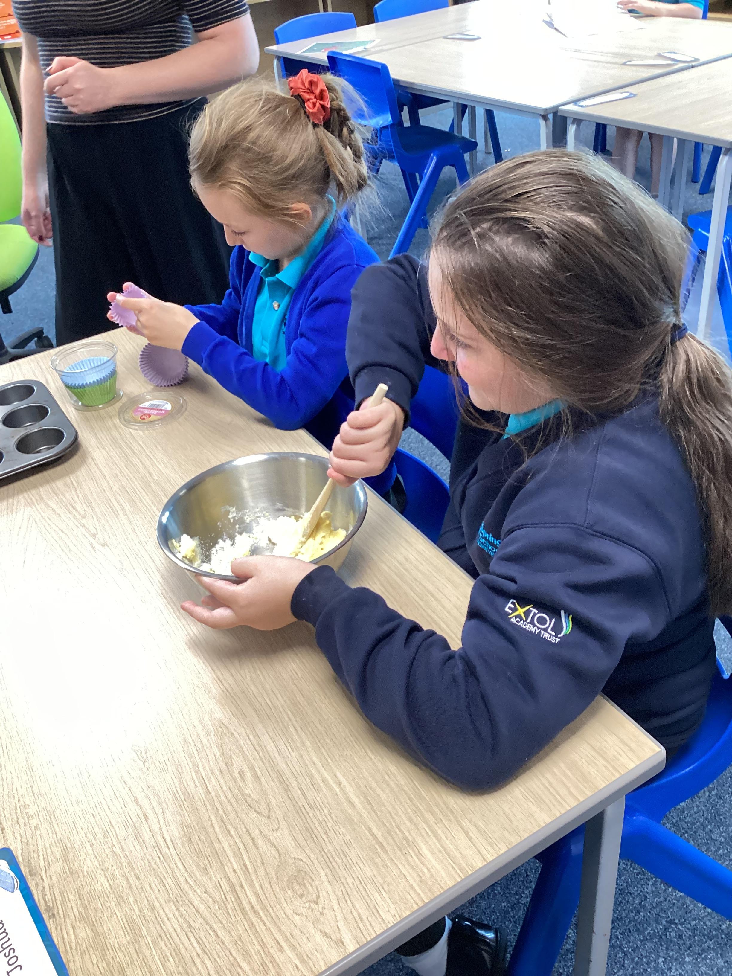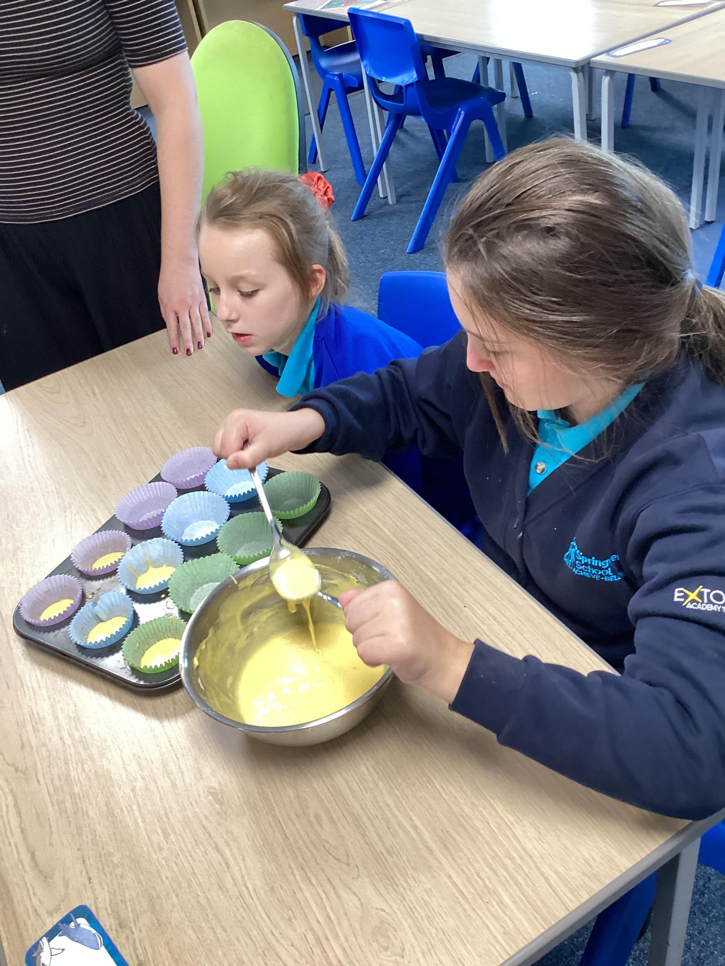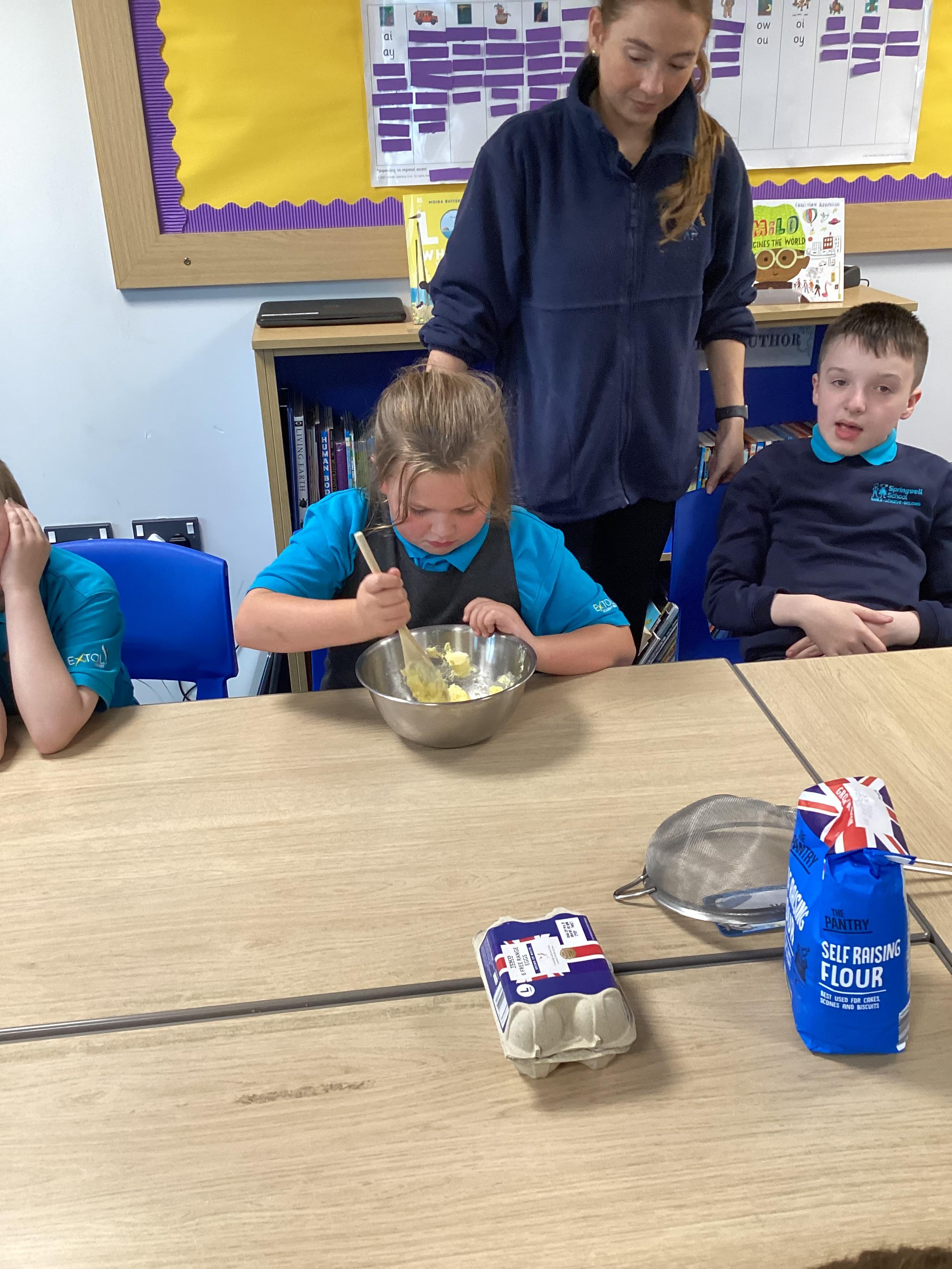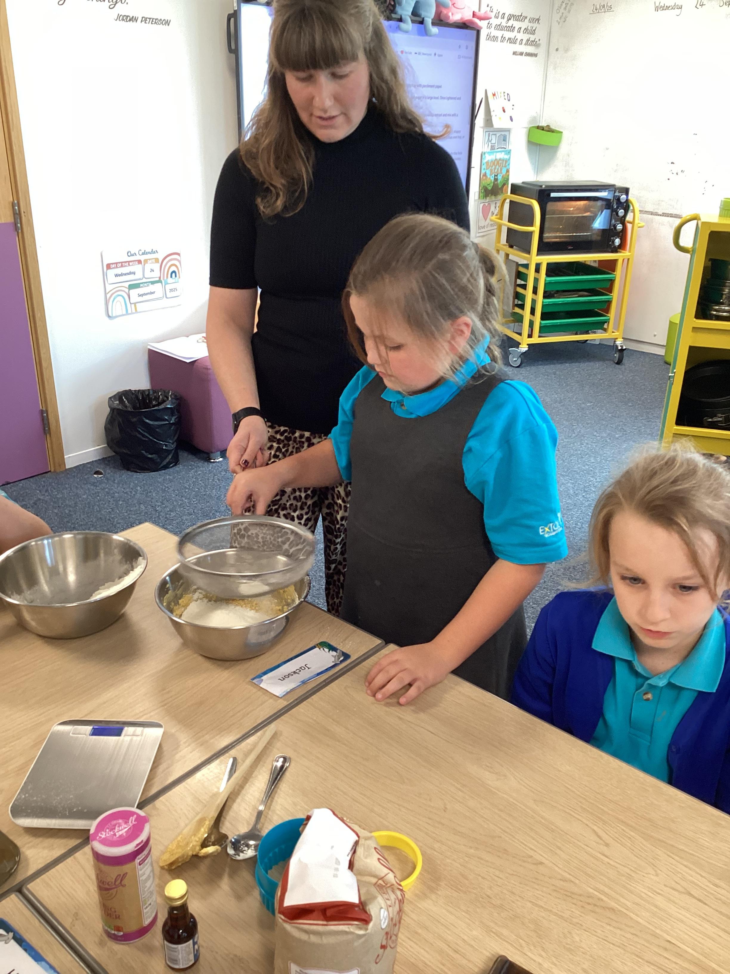 Wednesday 1st October 2025 - In Cookery today, we made some cakes. We took our time measuring out the ingredients. We then took turns to mix the ingredients and put the mixture into the cake cases.