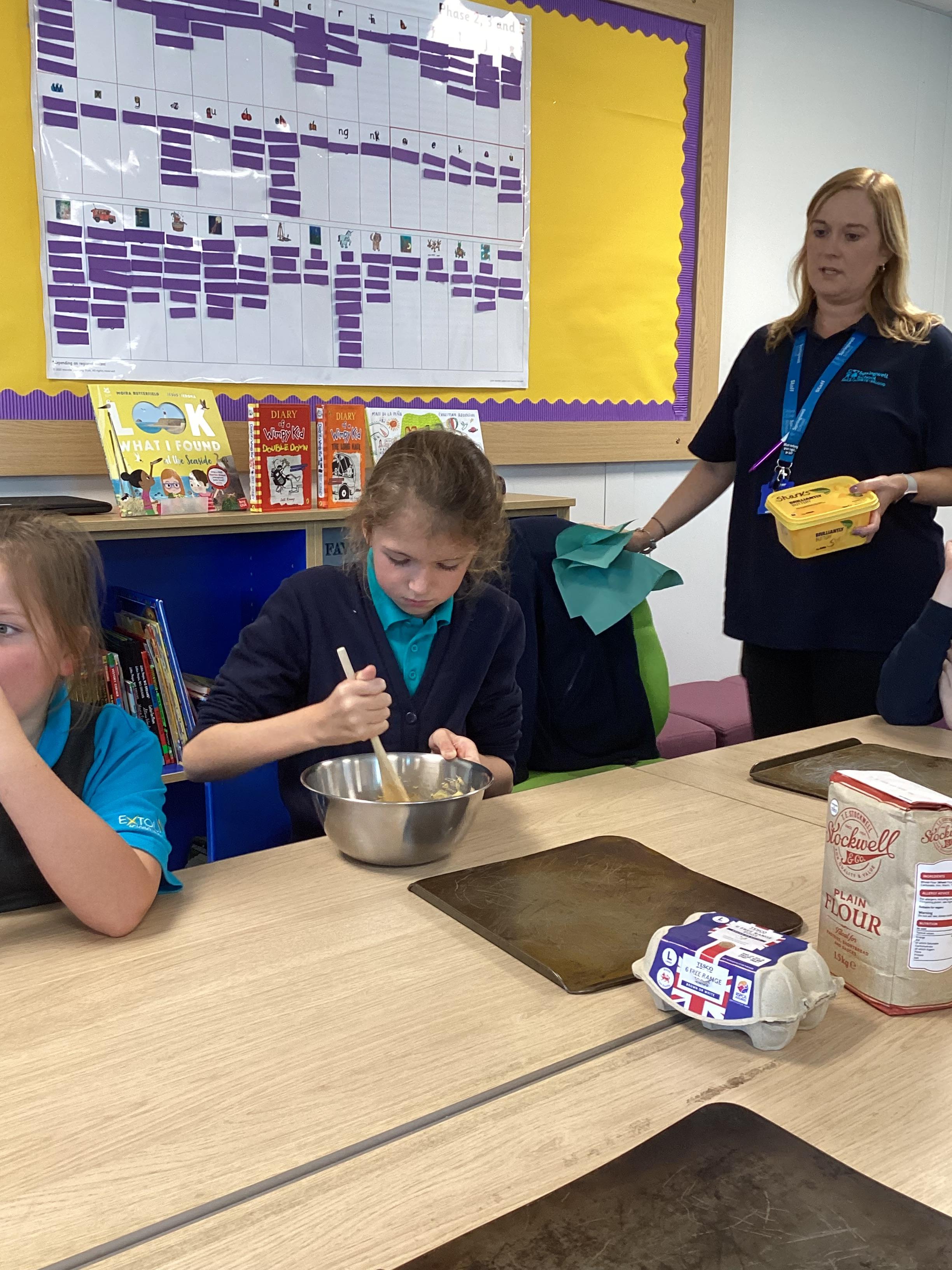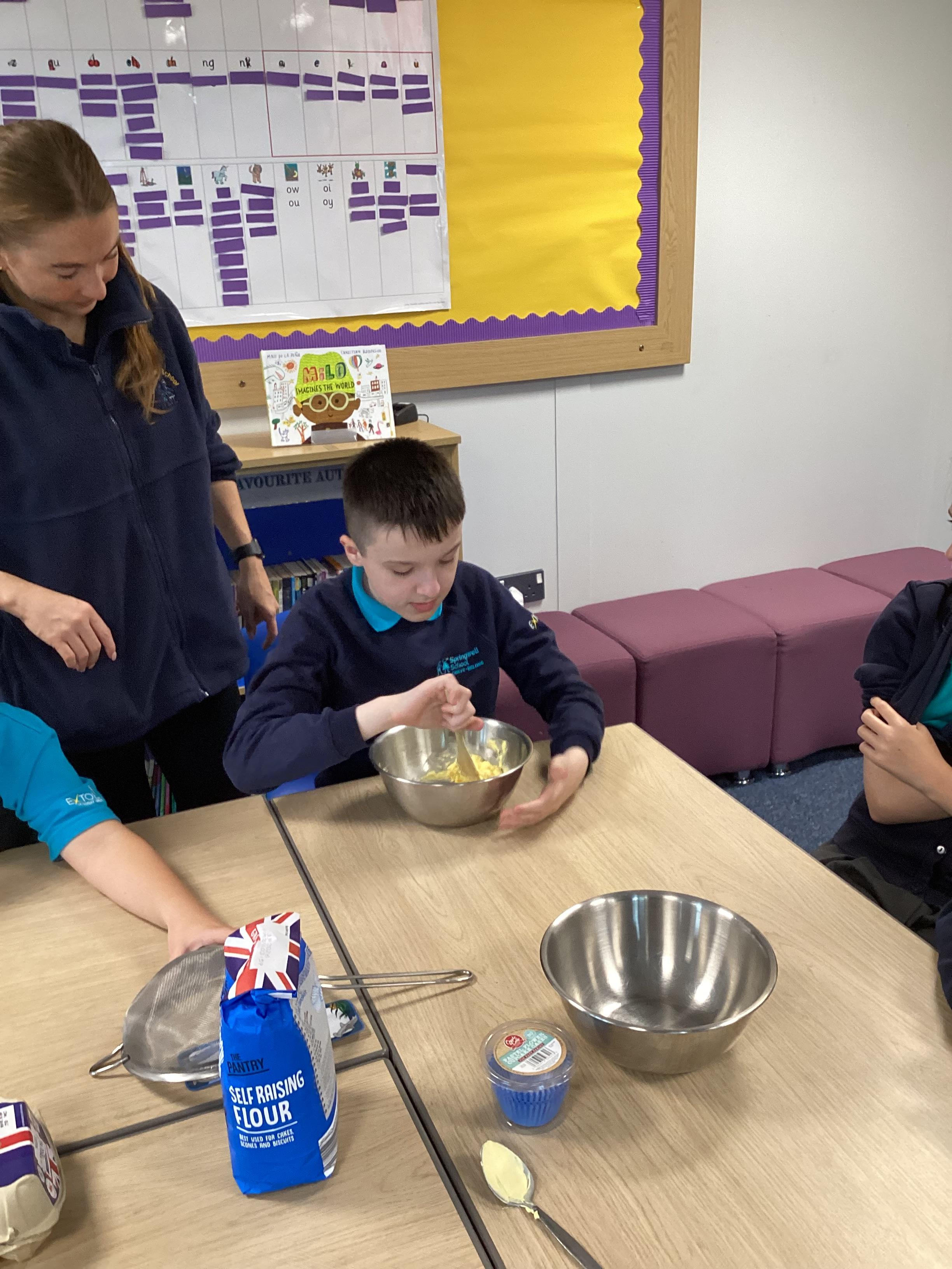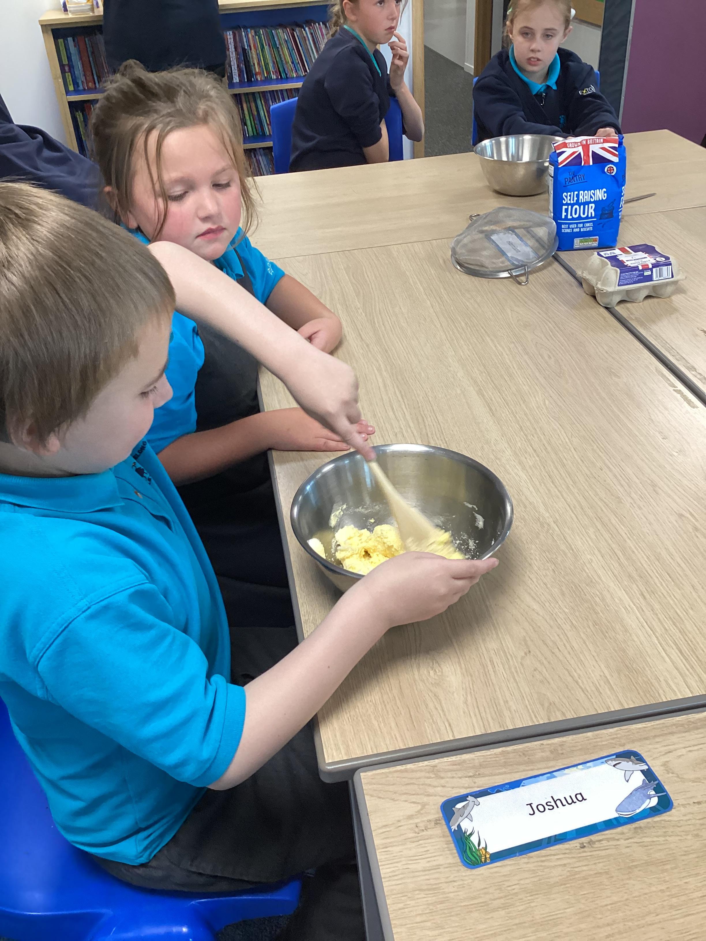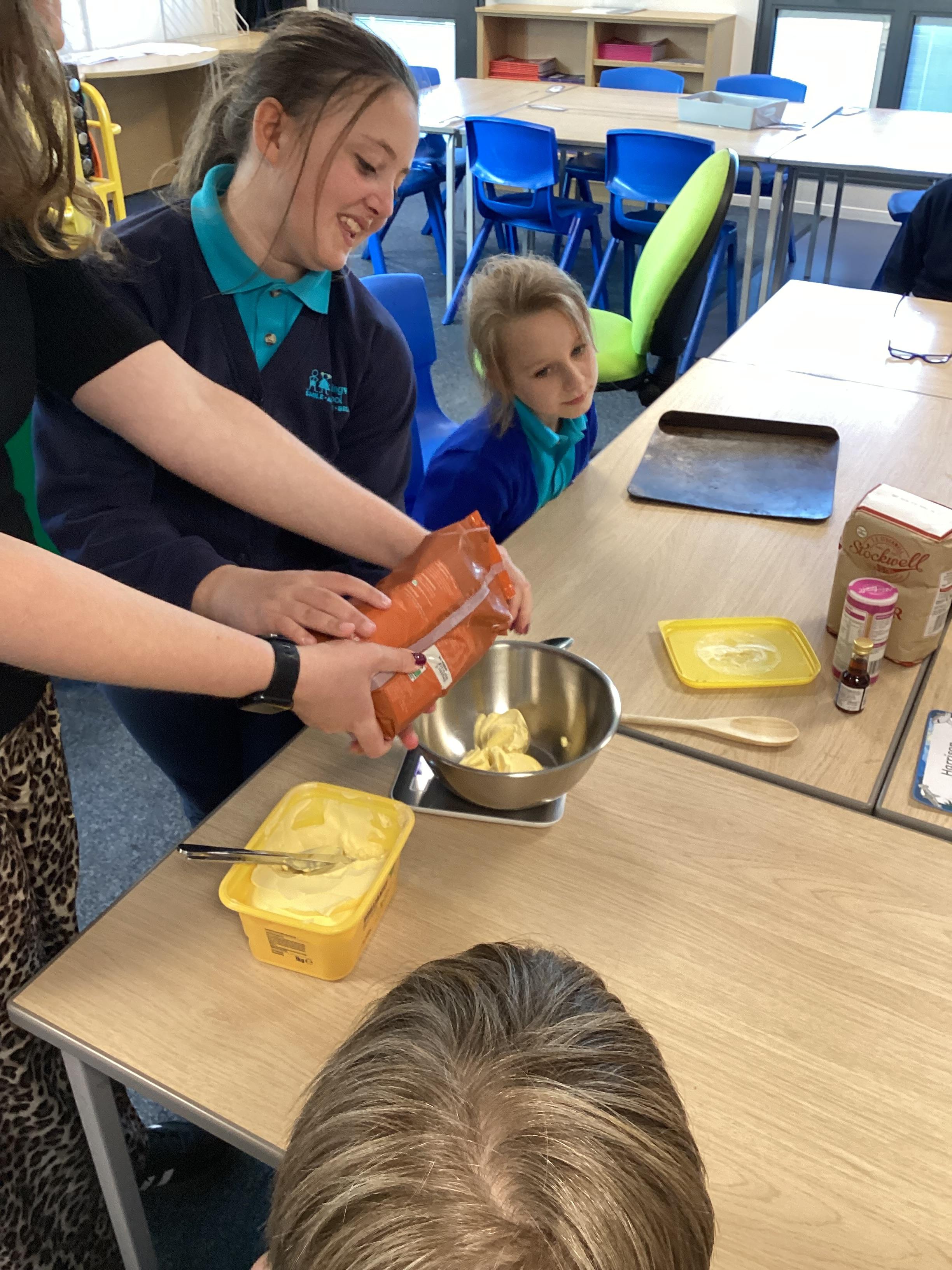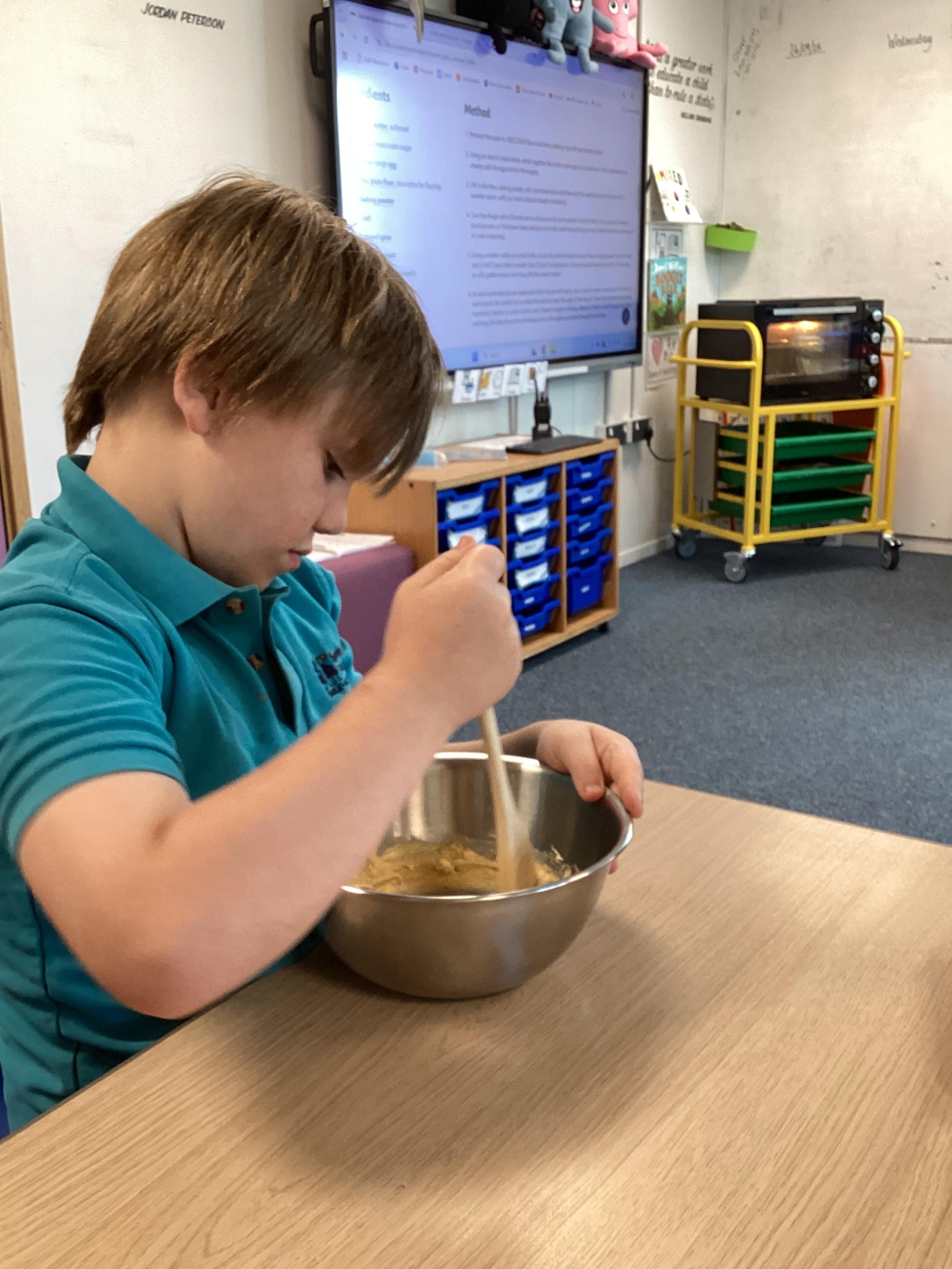 Wednesday 1st October 2025 - In Cookery today, we made some cakes. We took our time measuring out the ingredients. We then took turns to mix the ingredients and put the mixture into the cake cases.