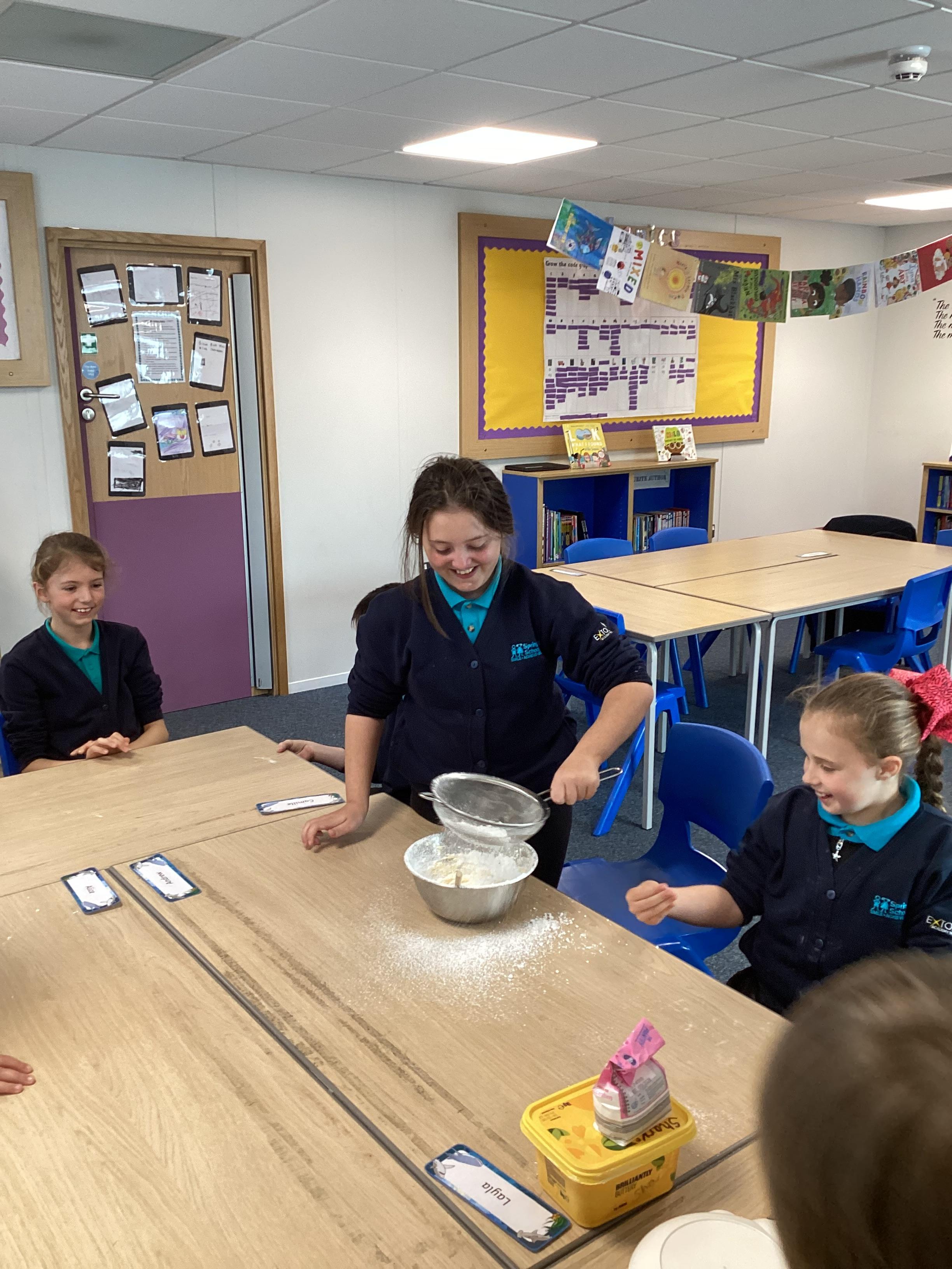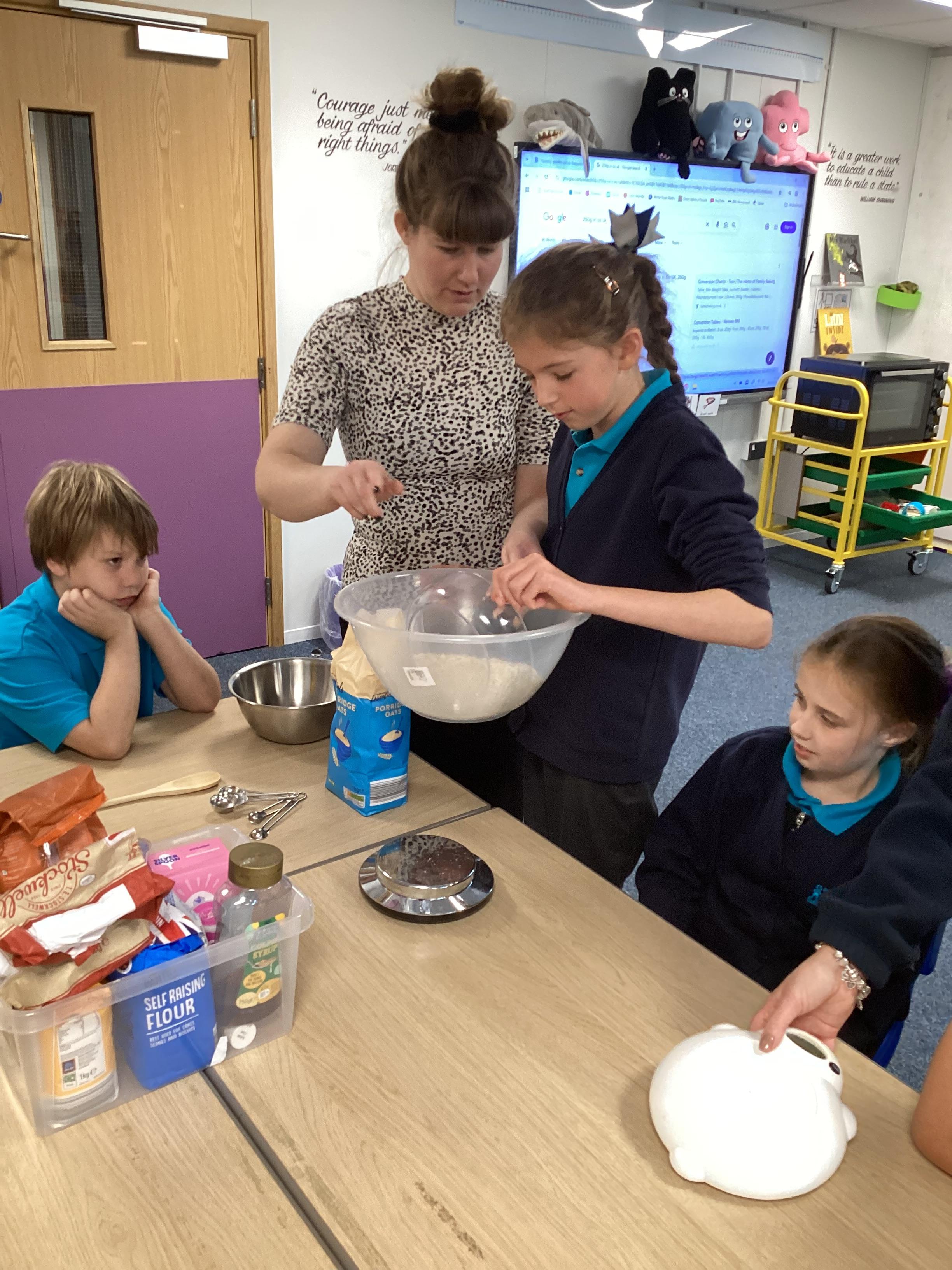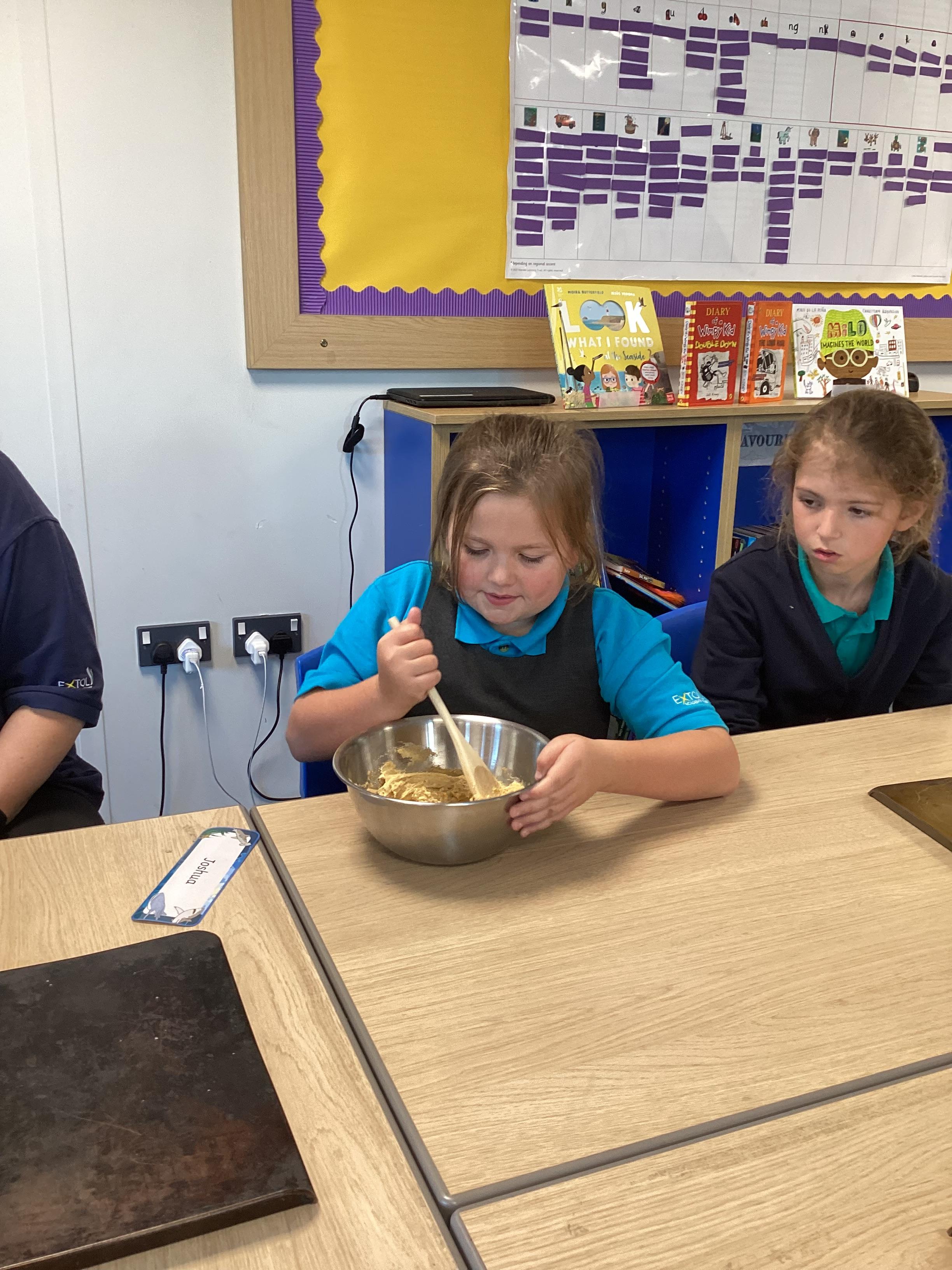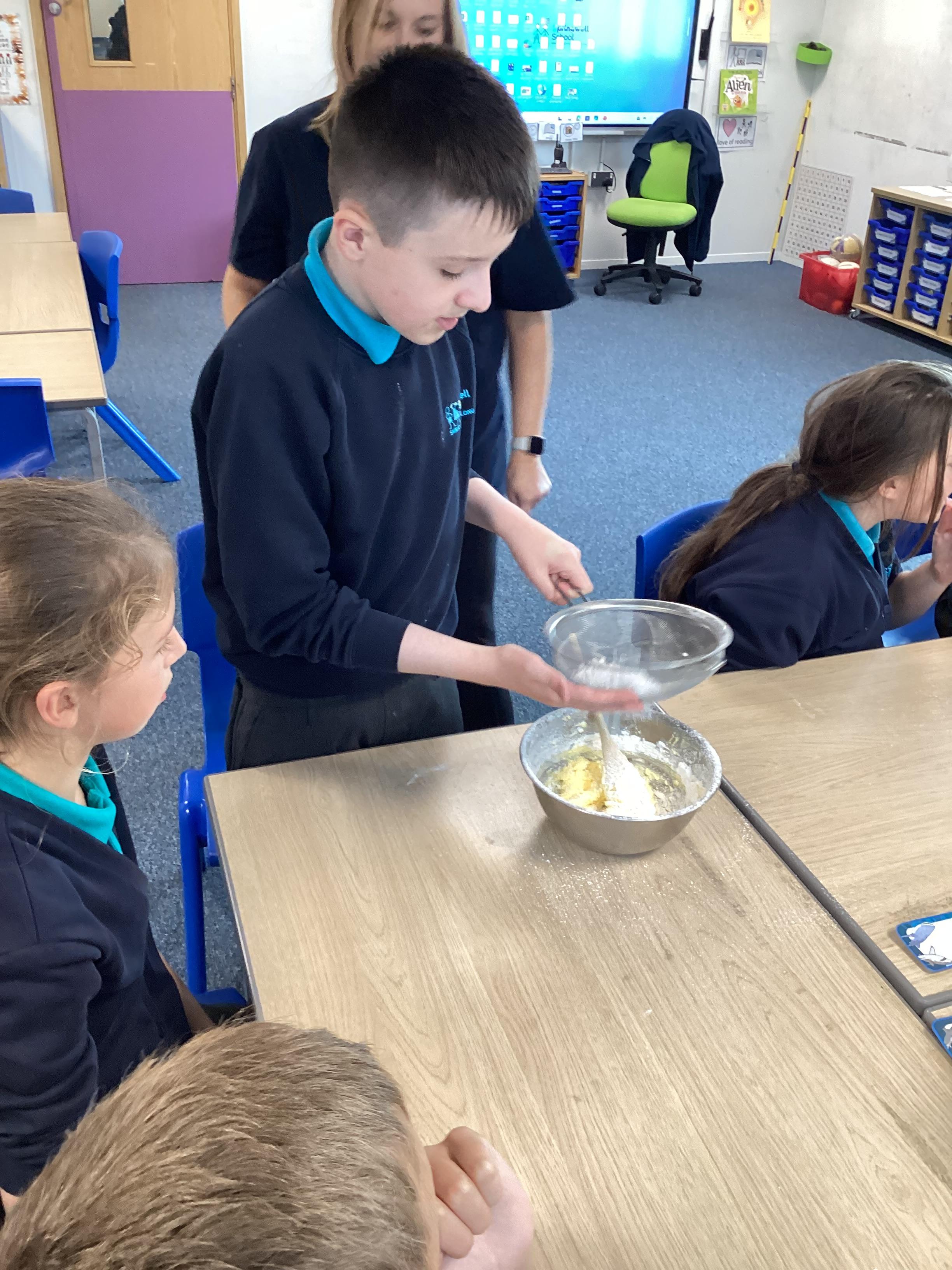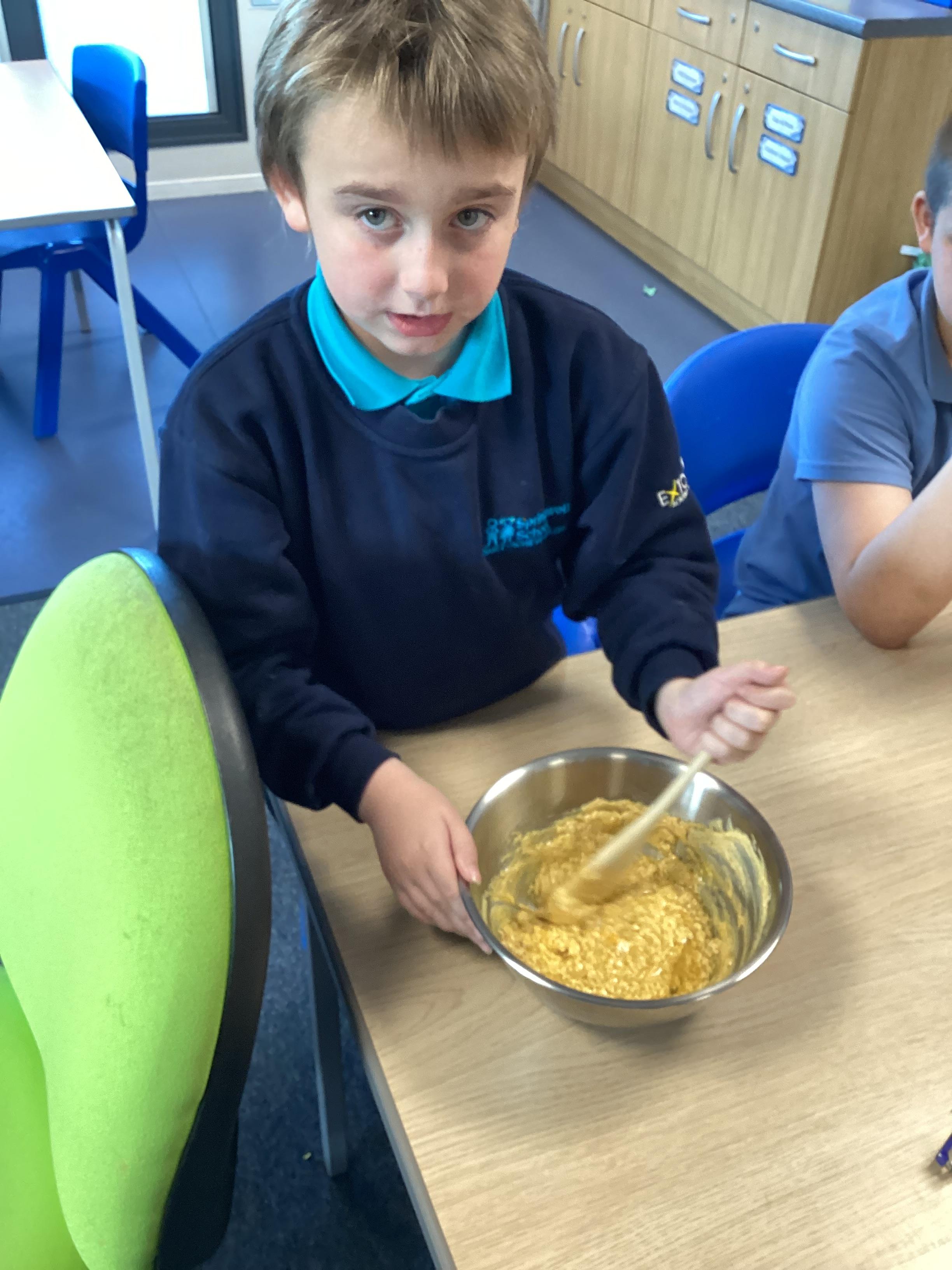 Wednesday 1st October 2025 - In Cookery today, we made some cakes. We took our time measuring out the ingredients. We then took turns to mix the ingredients and put the mixture into the cake cases.