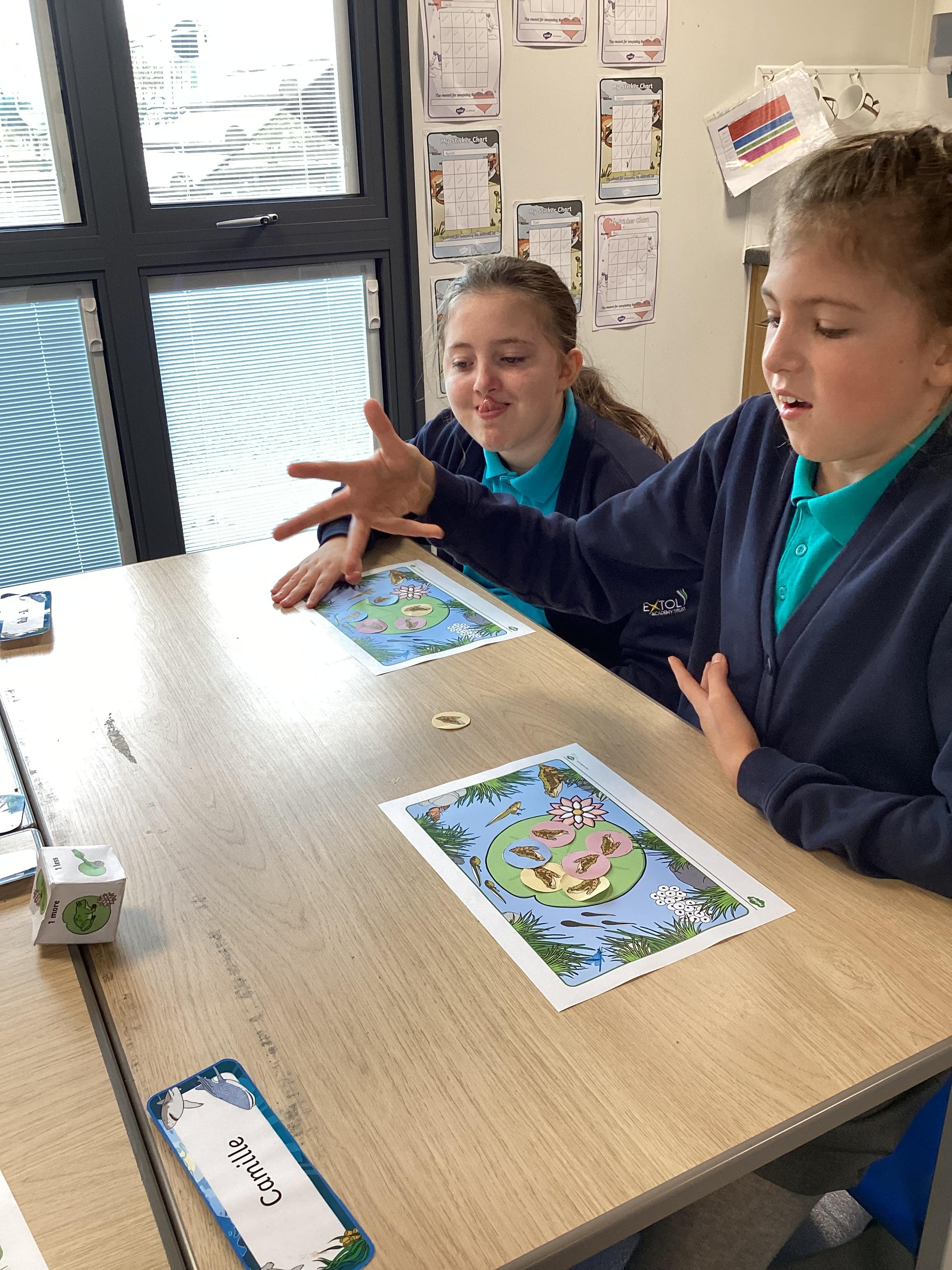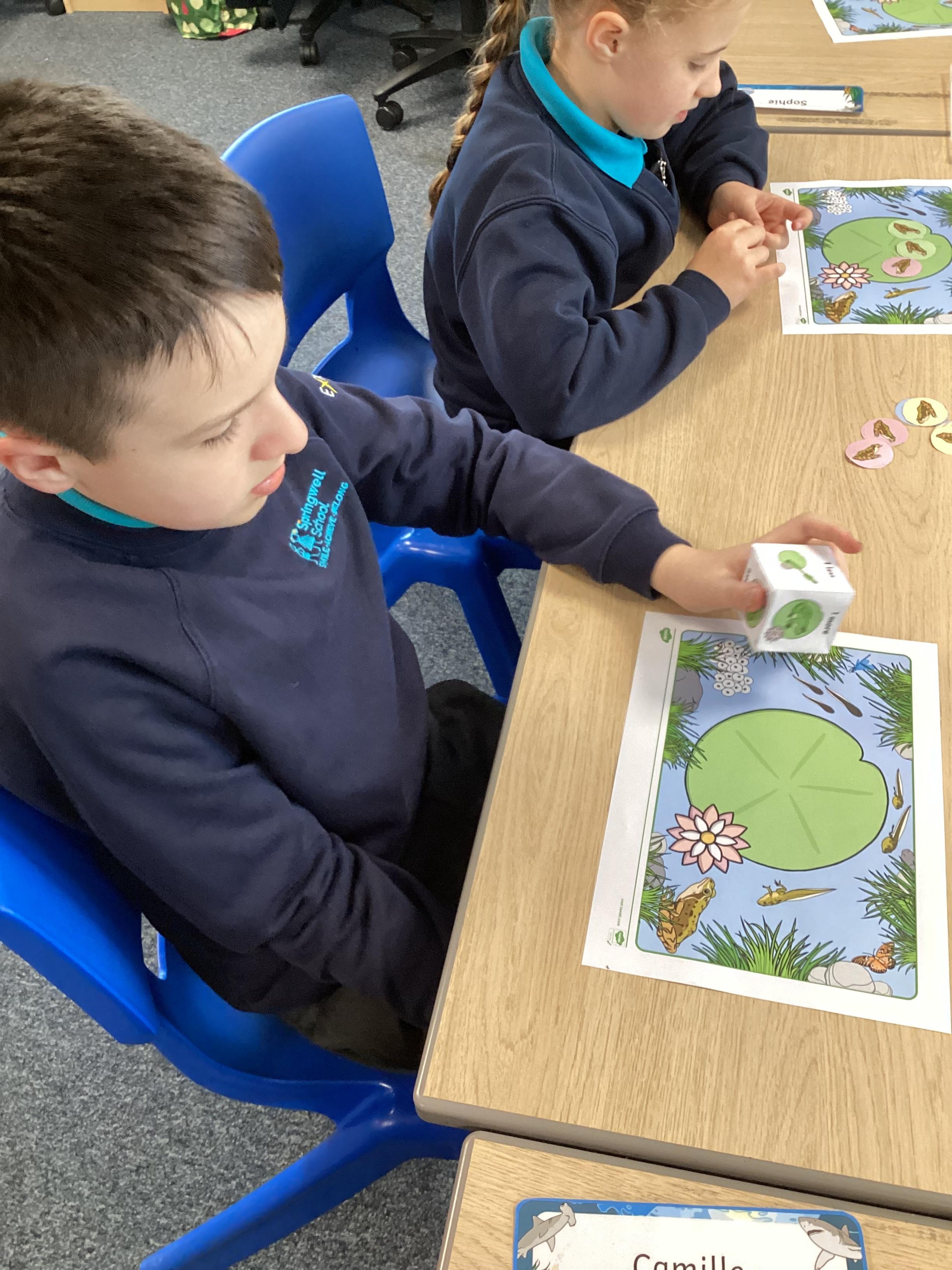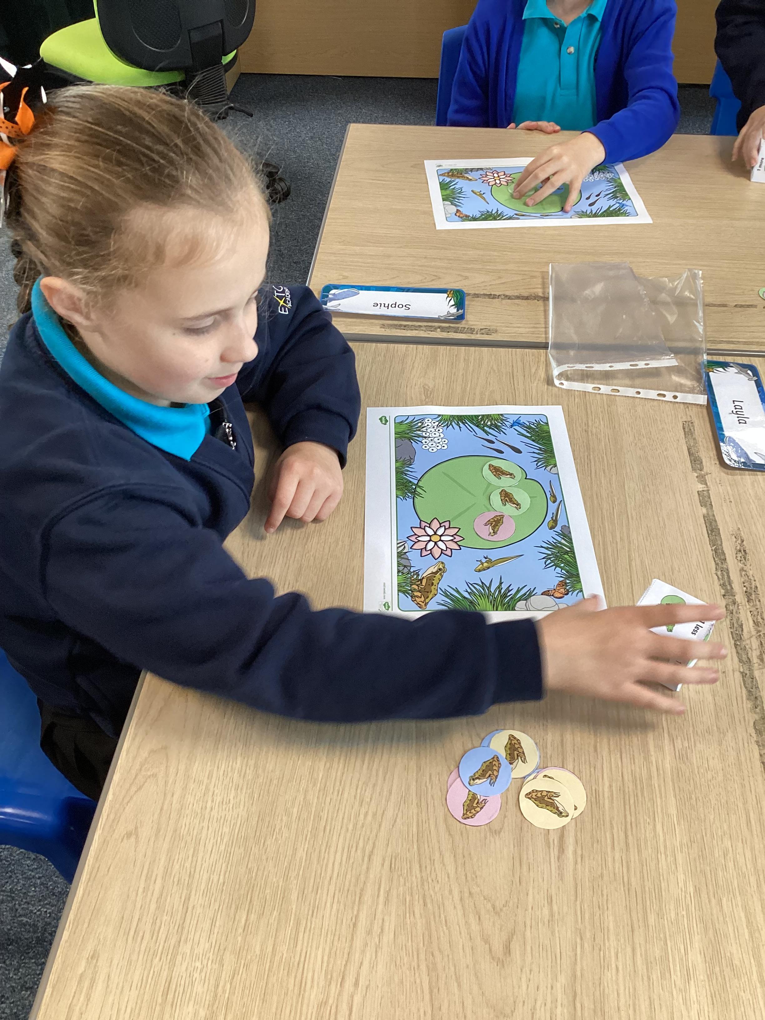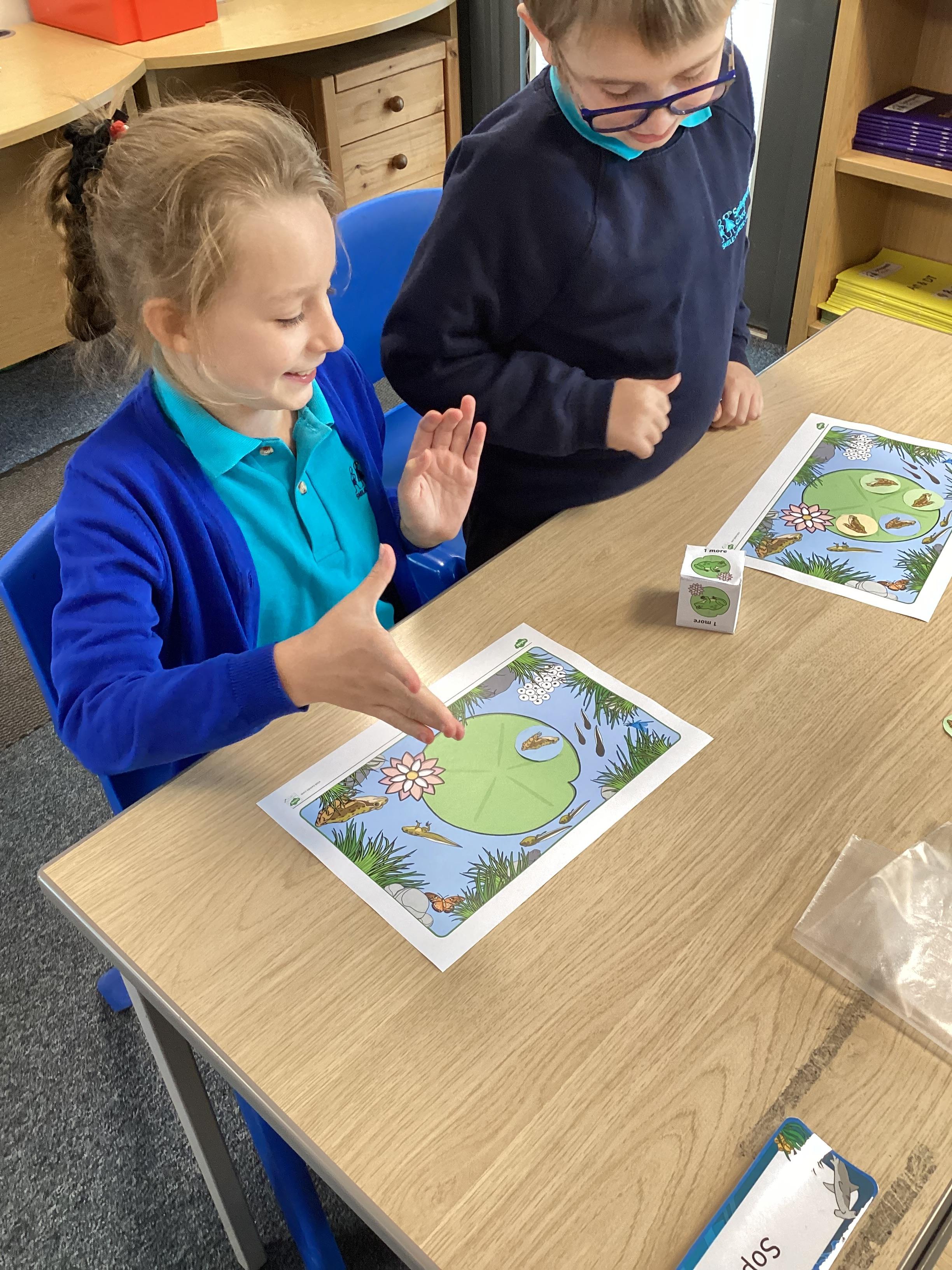 Monday 13th October 2025 - In Maths today, we played some different board games. One More & One Less Frog Game, where we had to roll a dice and add one more or one less frogs to the lily pads. Another game where we rolled the dice, then whichever square we landed on, we had to say the amount, counting the hundreds, tens and ones. We have some very competitive children in Shark class!