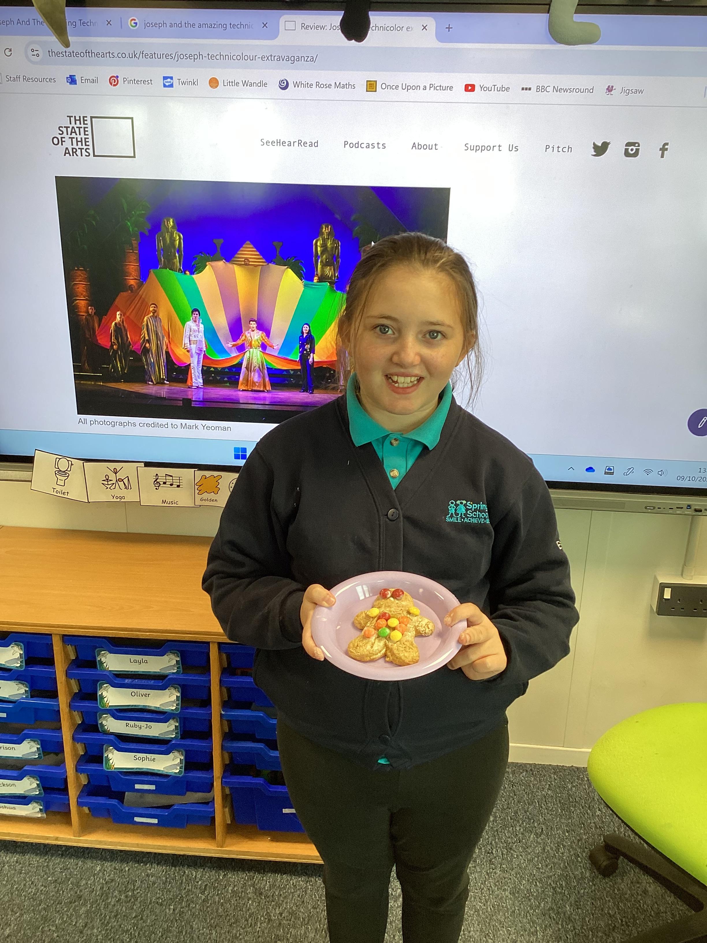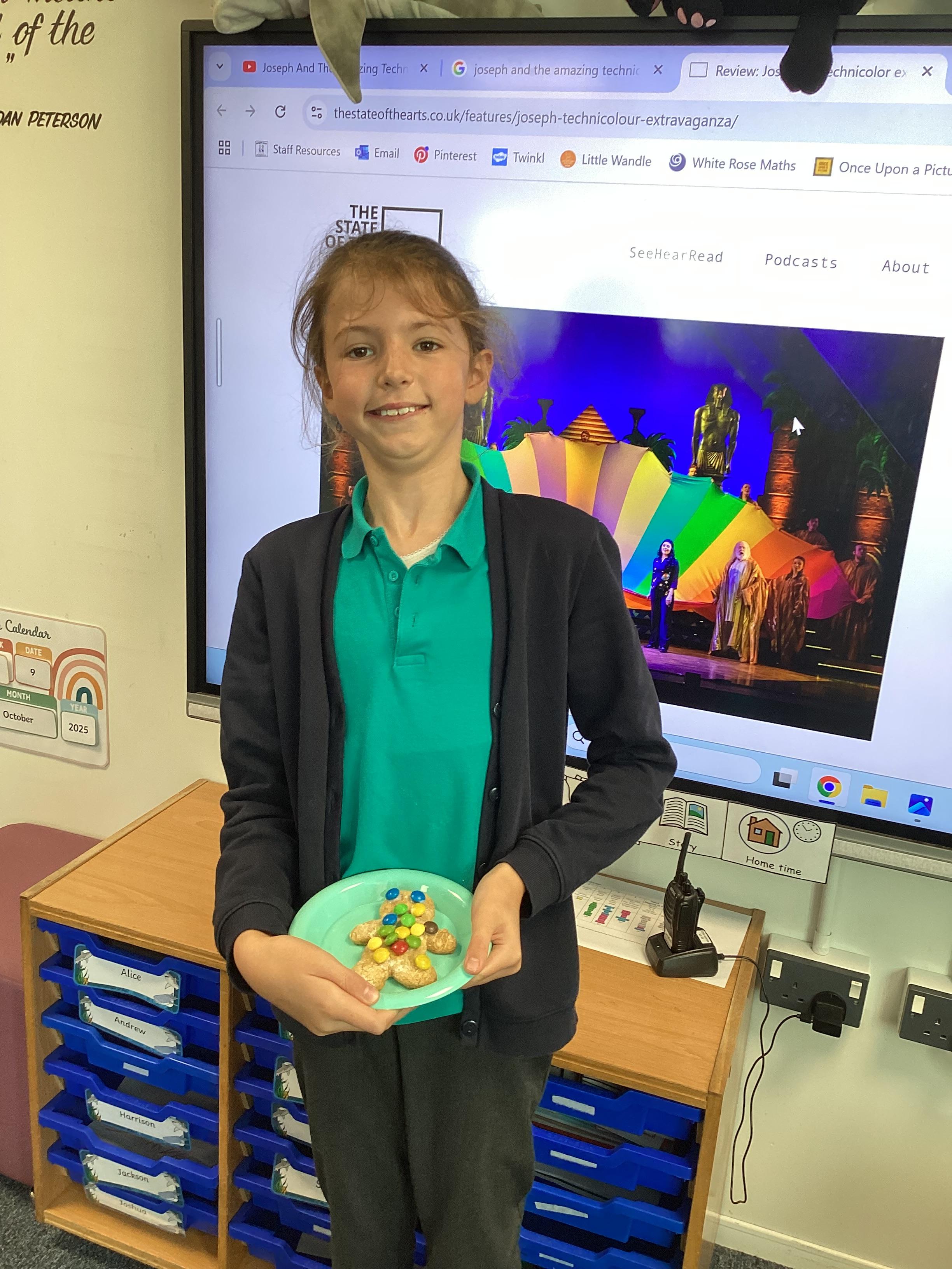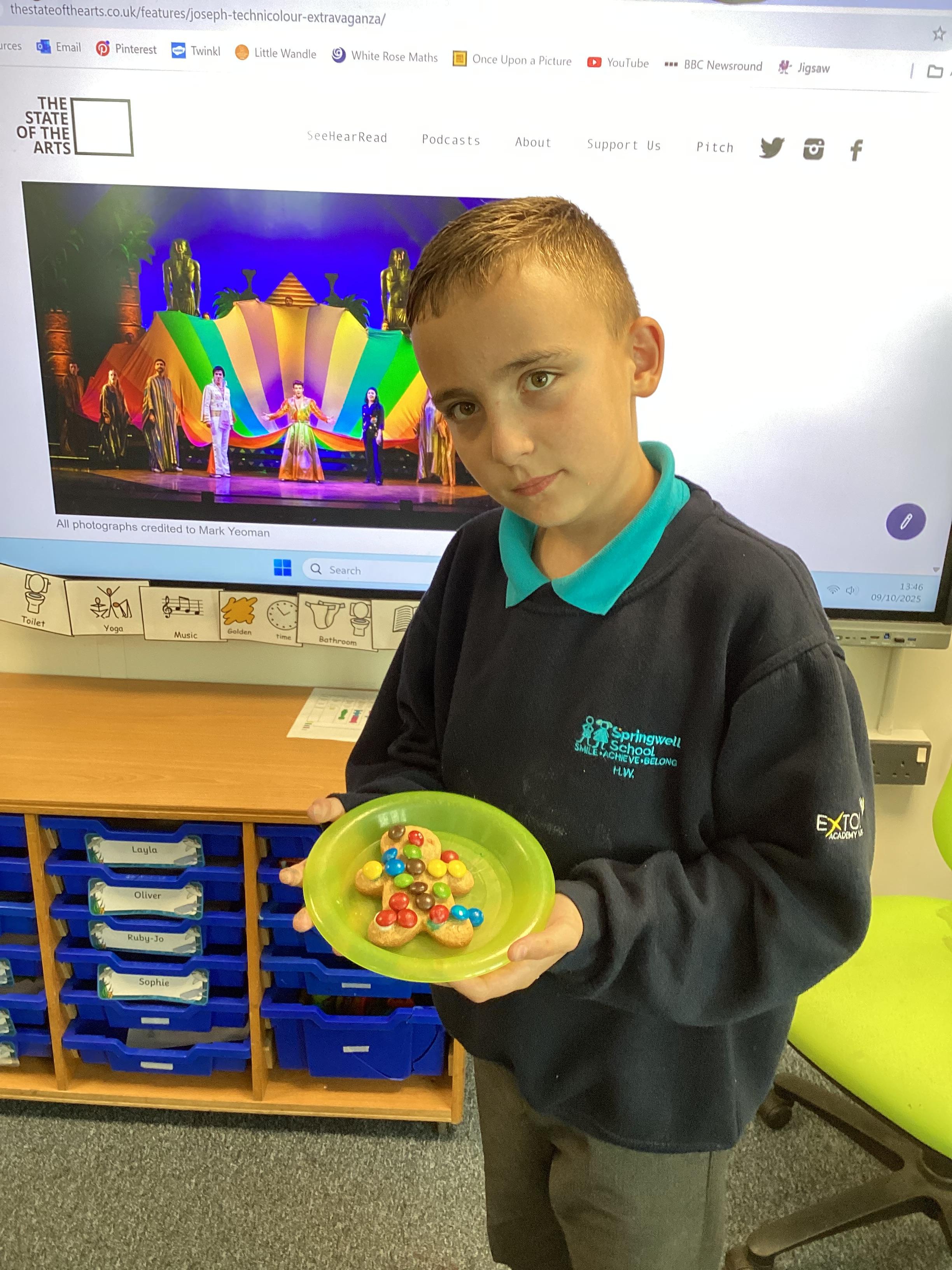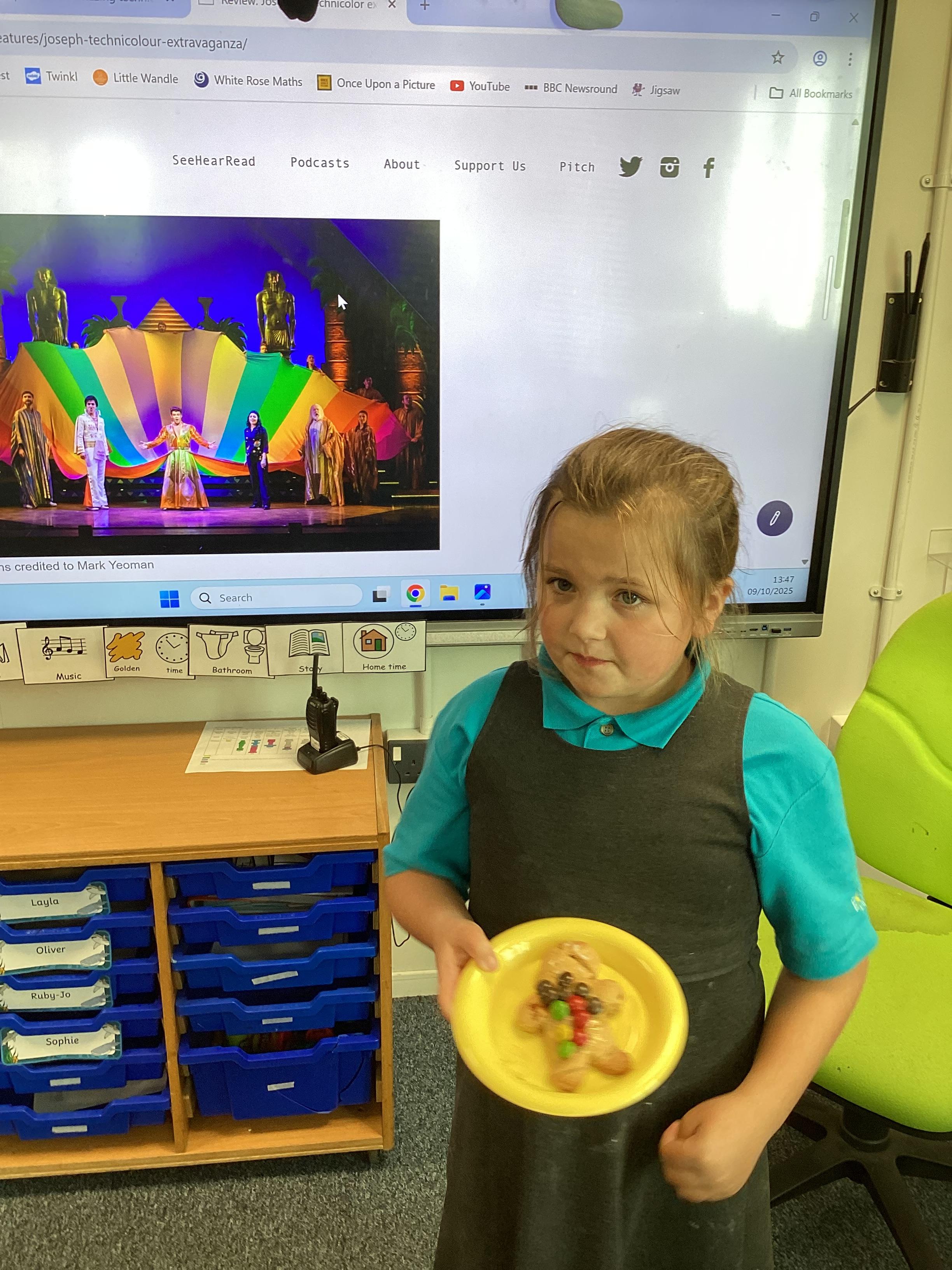 Thursday 9th October 2025 - In Music today, we made gingerbread men which we later decorated to look like Joseph in his colourful coat. We then began to watch the musical 'Joseph and His Technicoloured Dreamcoat'. It was fantastic - lots of singing along too!