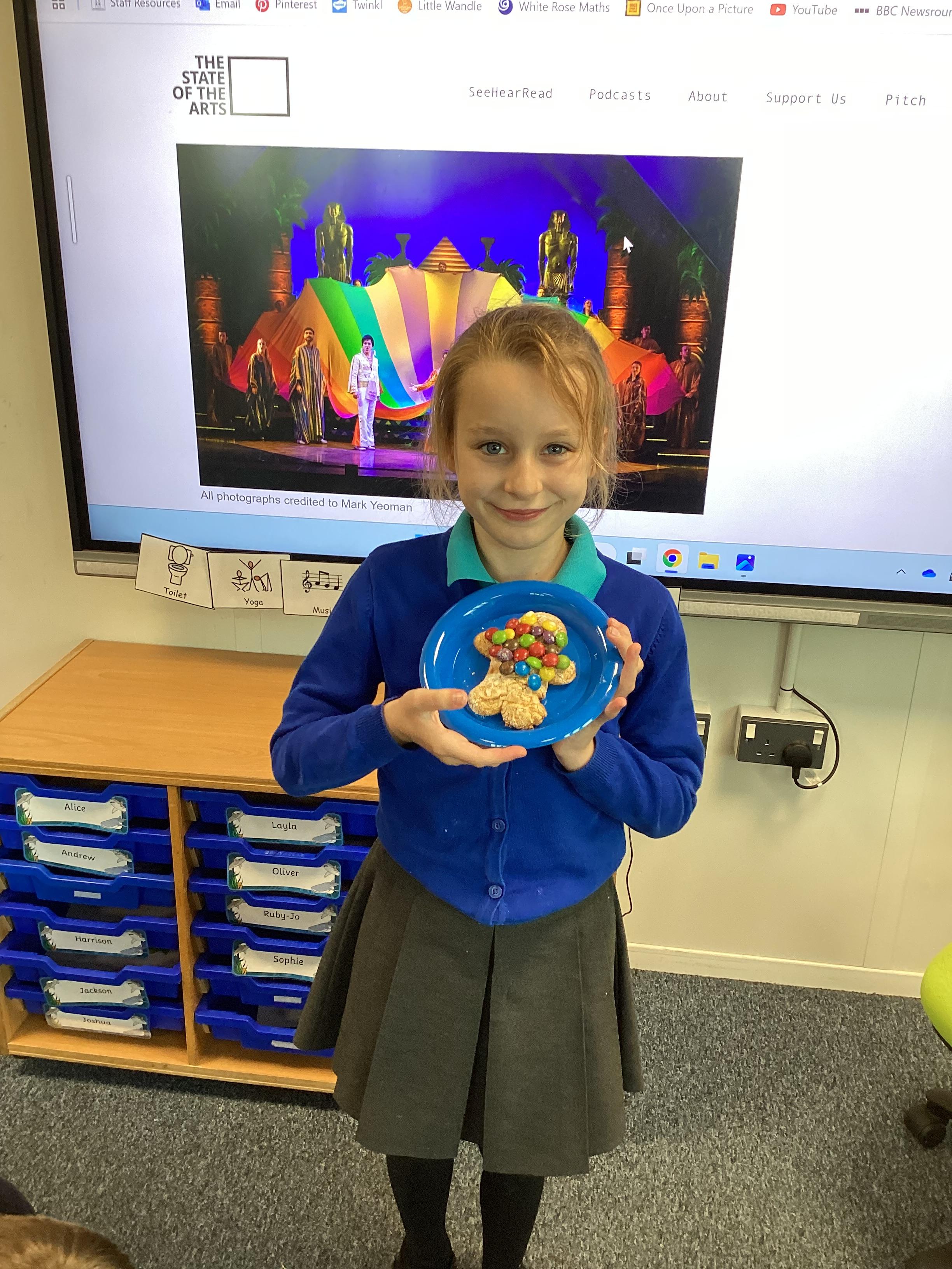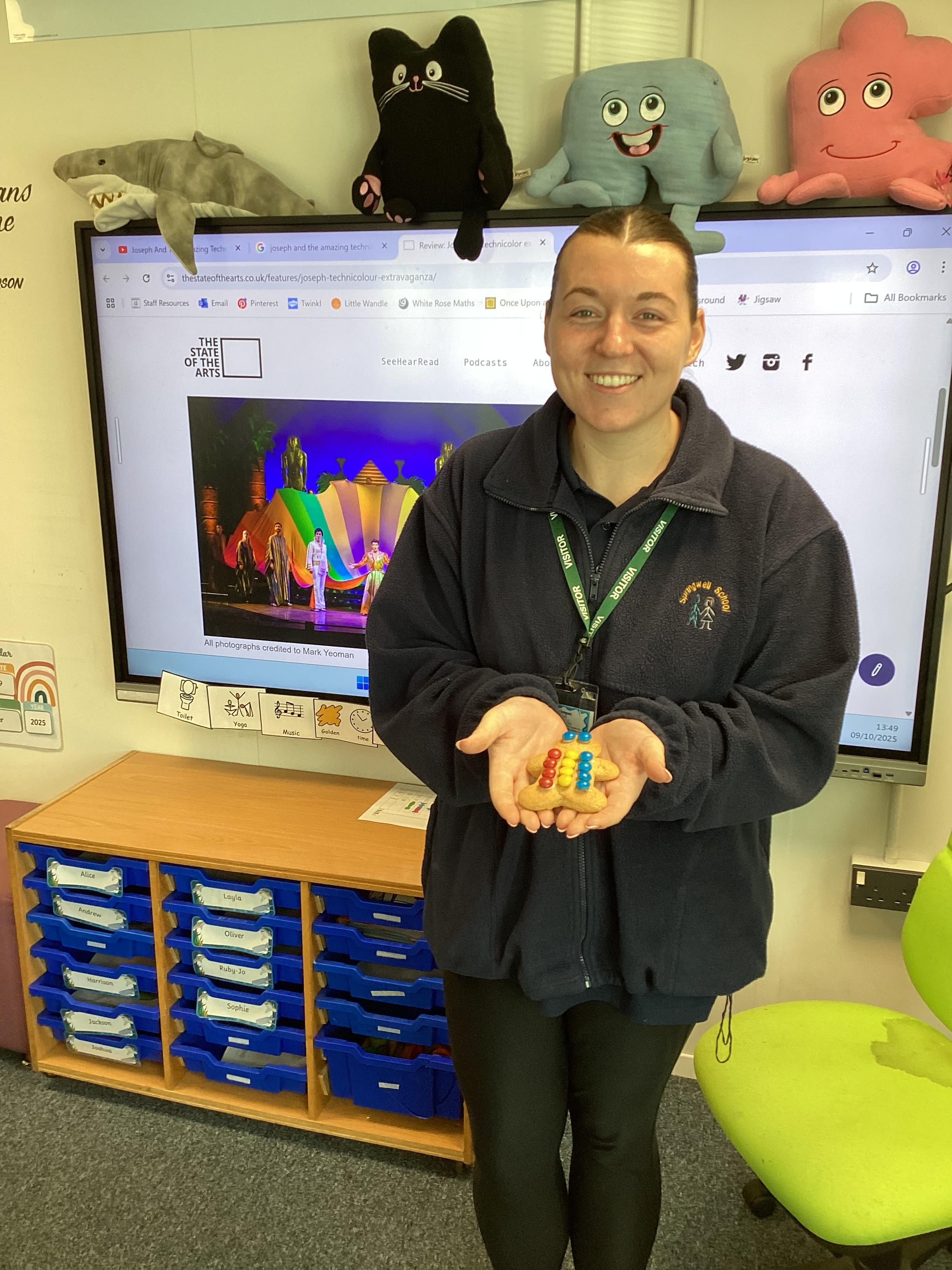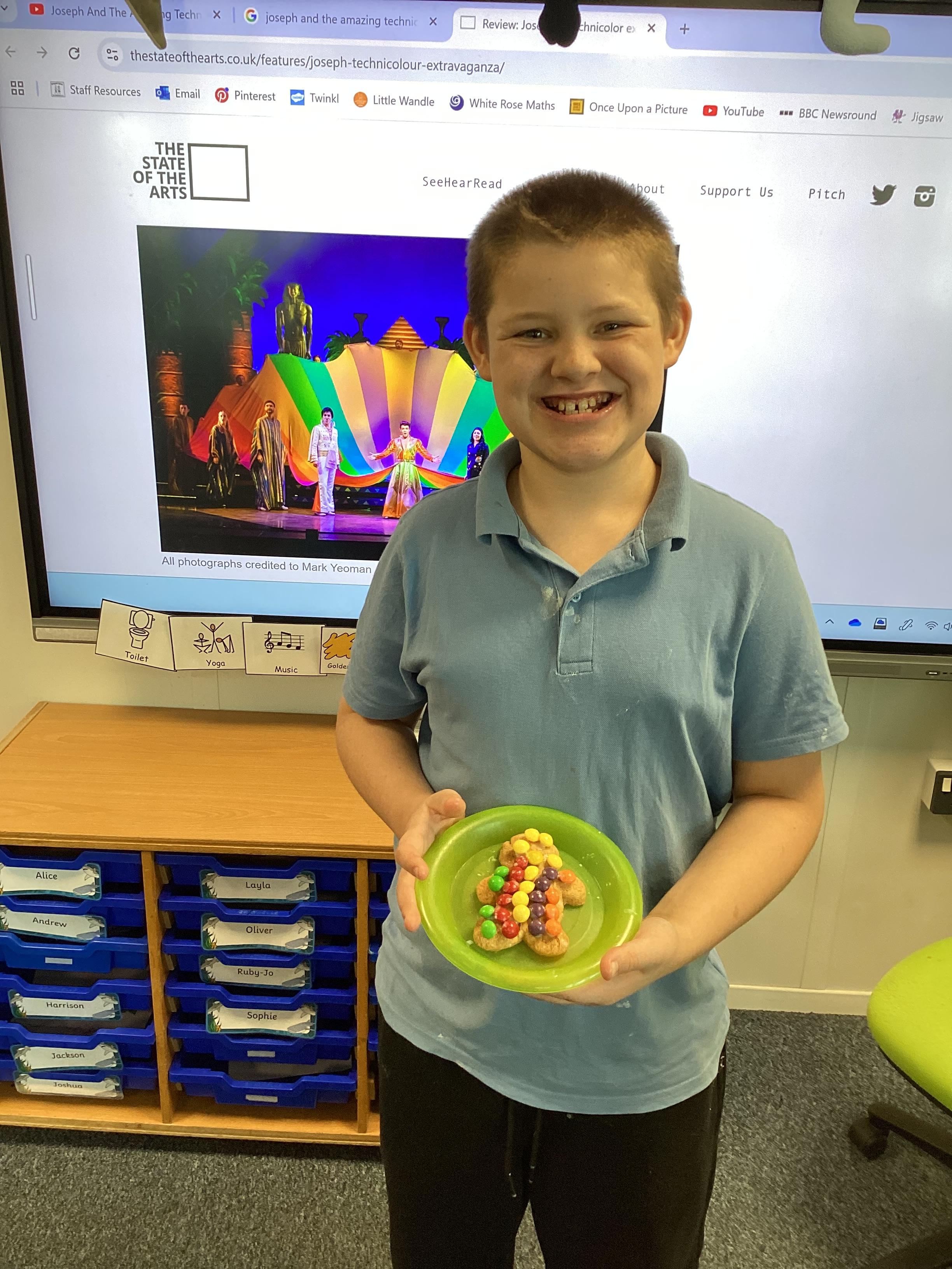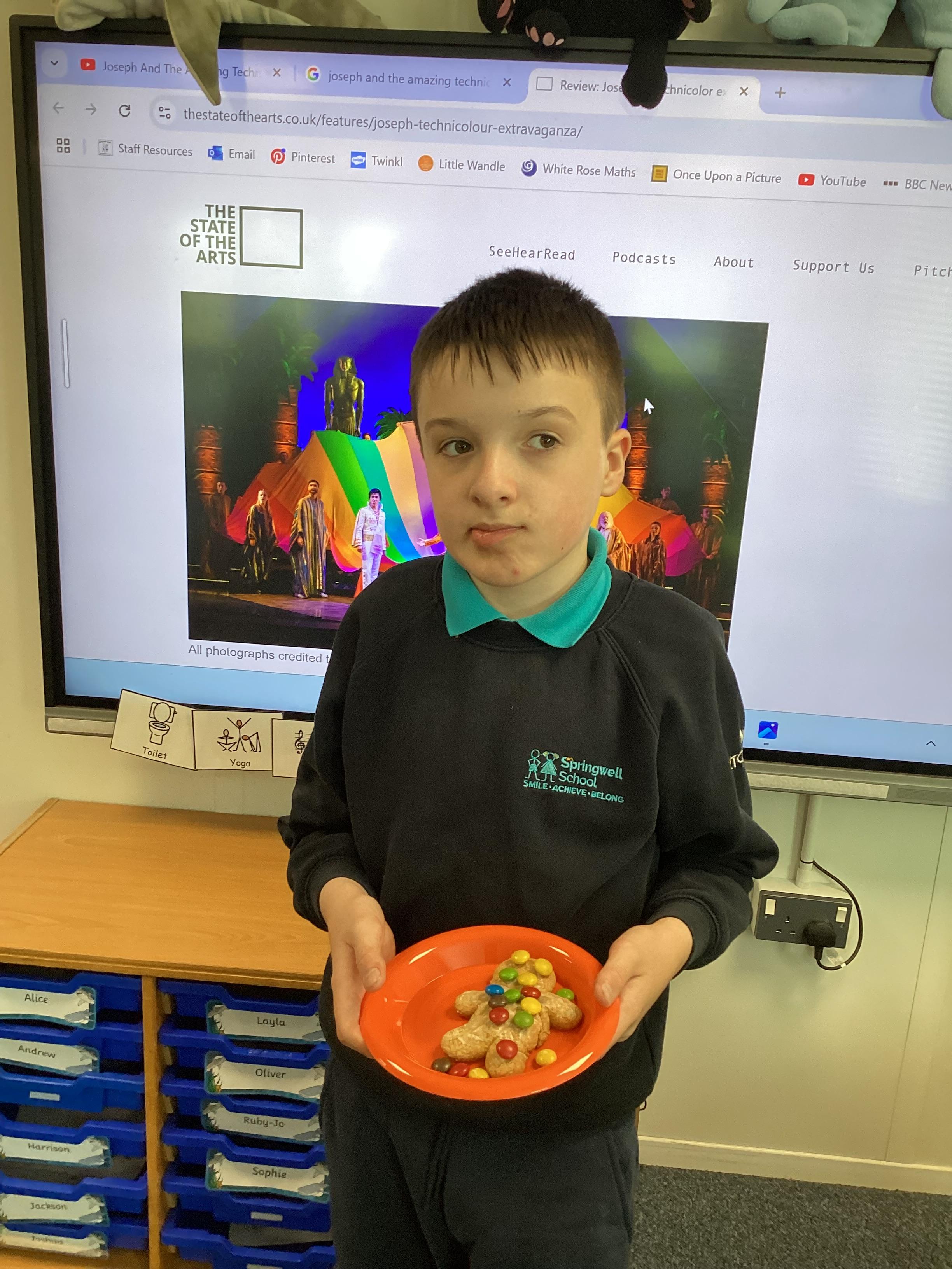 Thursday 9th October 2025 - In Music today, we made gingerbread men which we later decorated to look like Joseph in his colourful coat. We then began to watch the musical 'Joseph and His Technicoloured Dreamcoat'. It was fantastic - lots of singing along too!