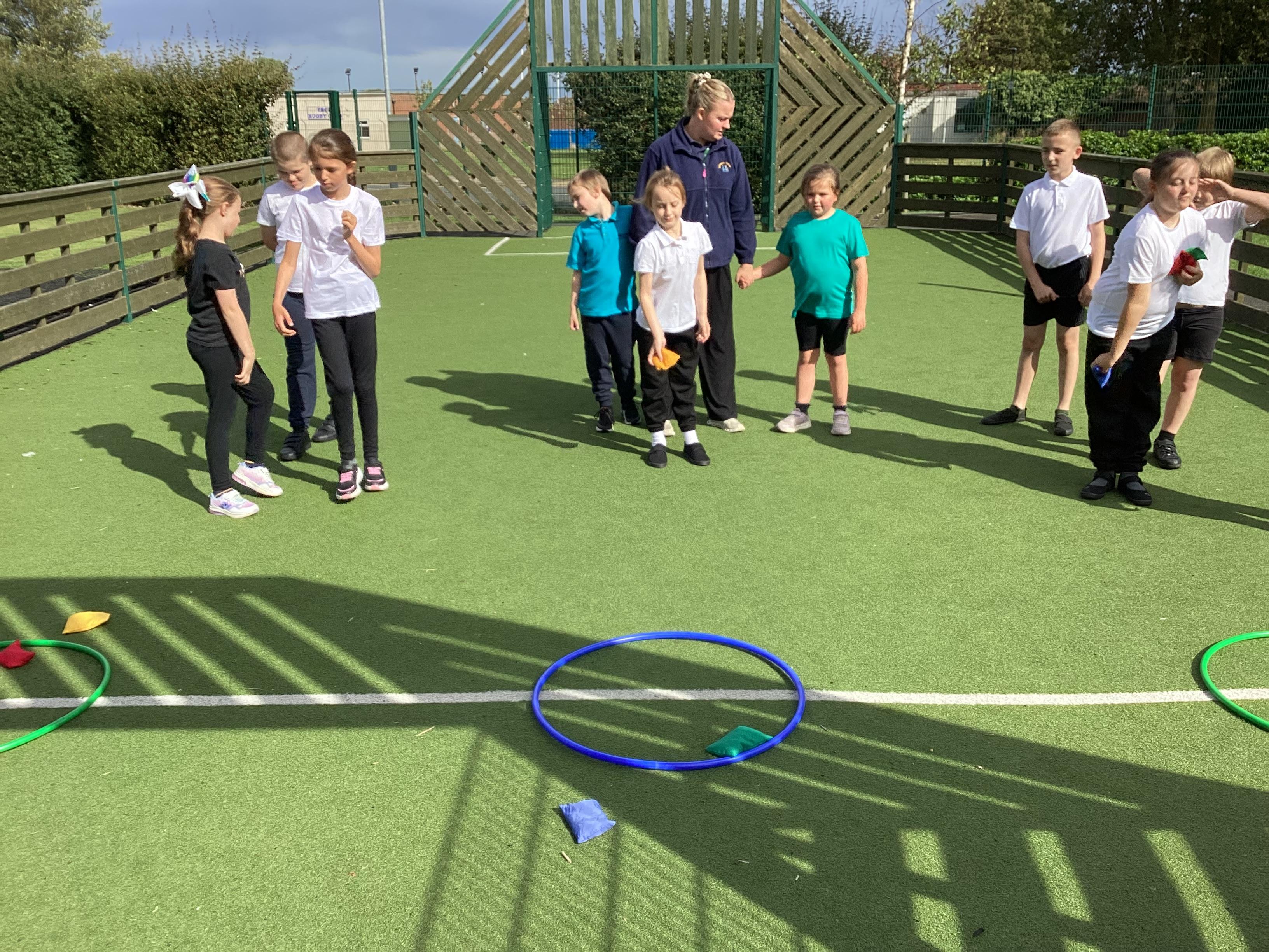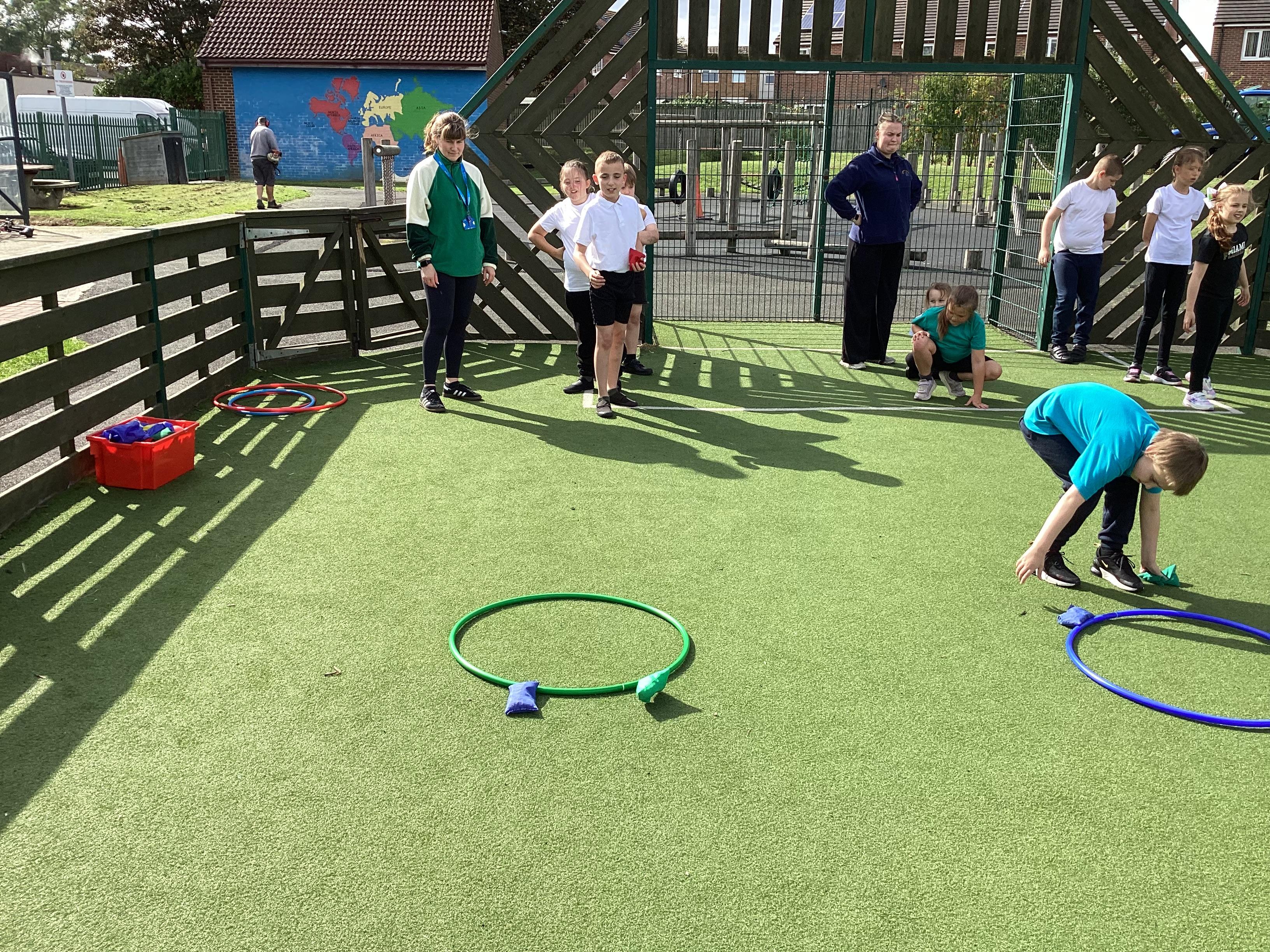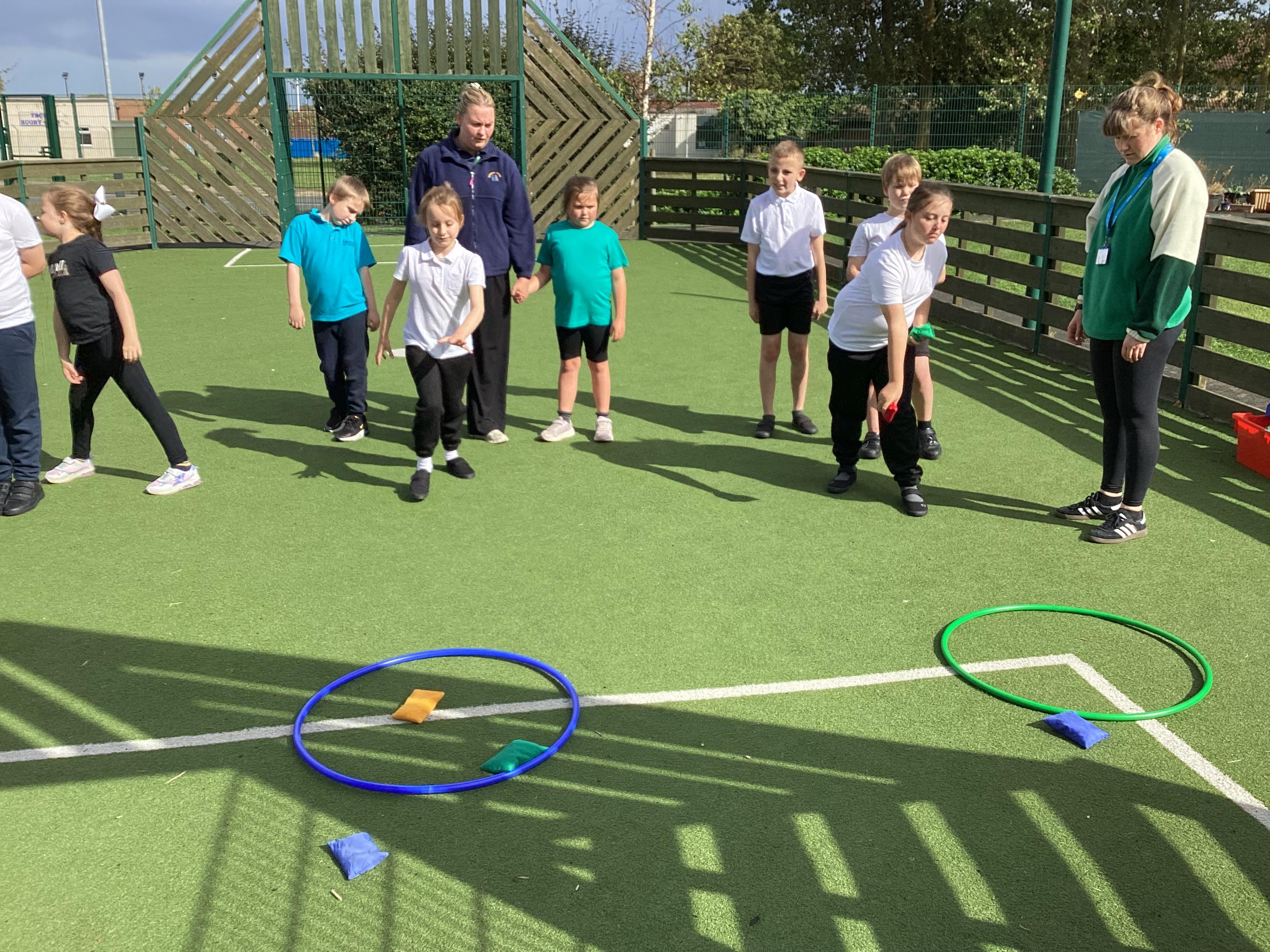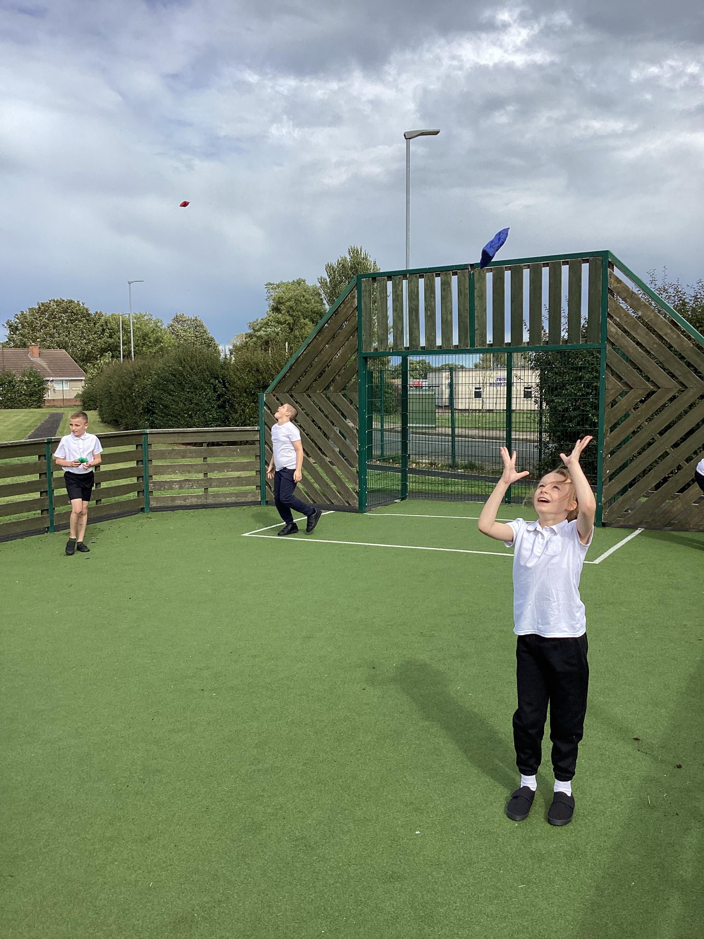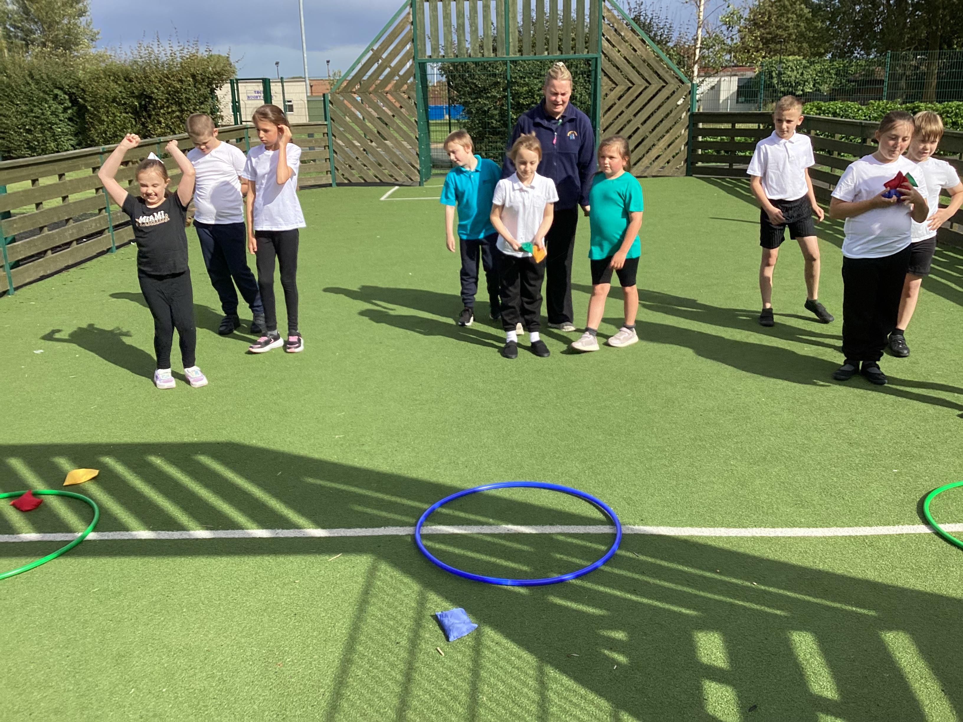 Thursday 11th September 2025 - In PE today, we have been practising our throwing. We were throwing beanbags high and low. We then took turn to throw beanbags into hoops.