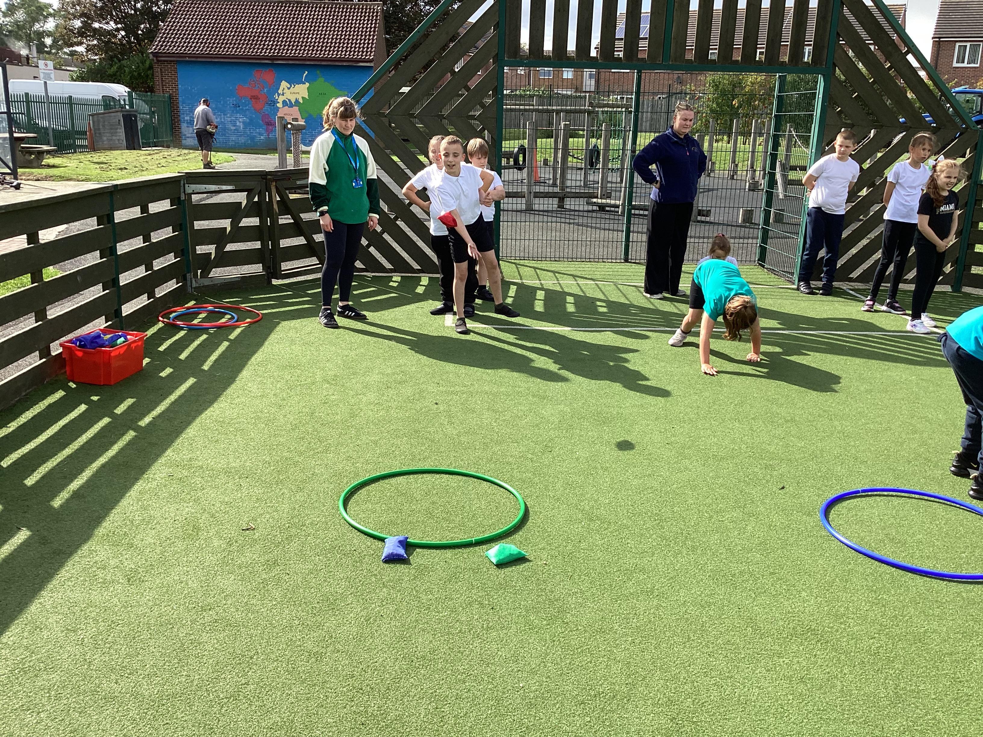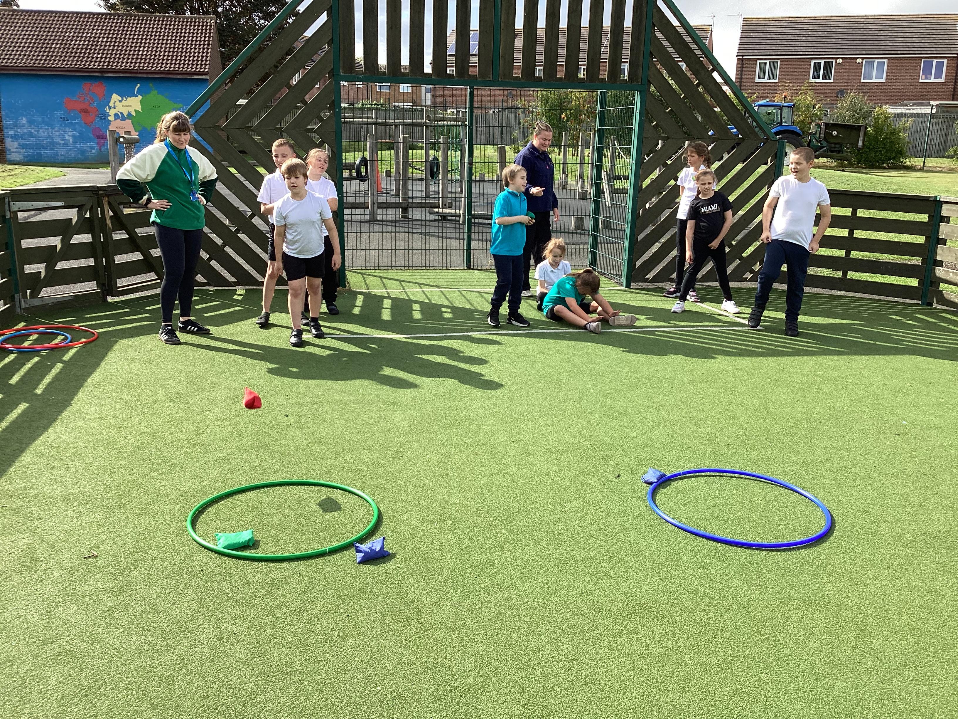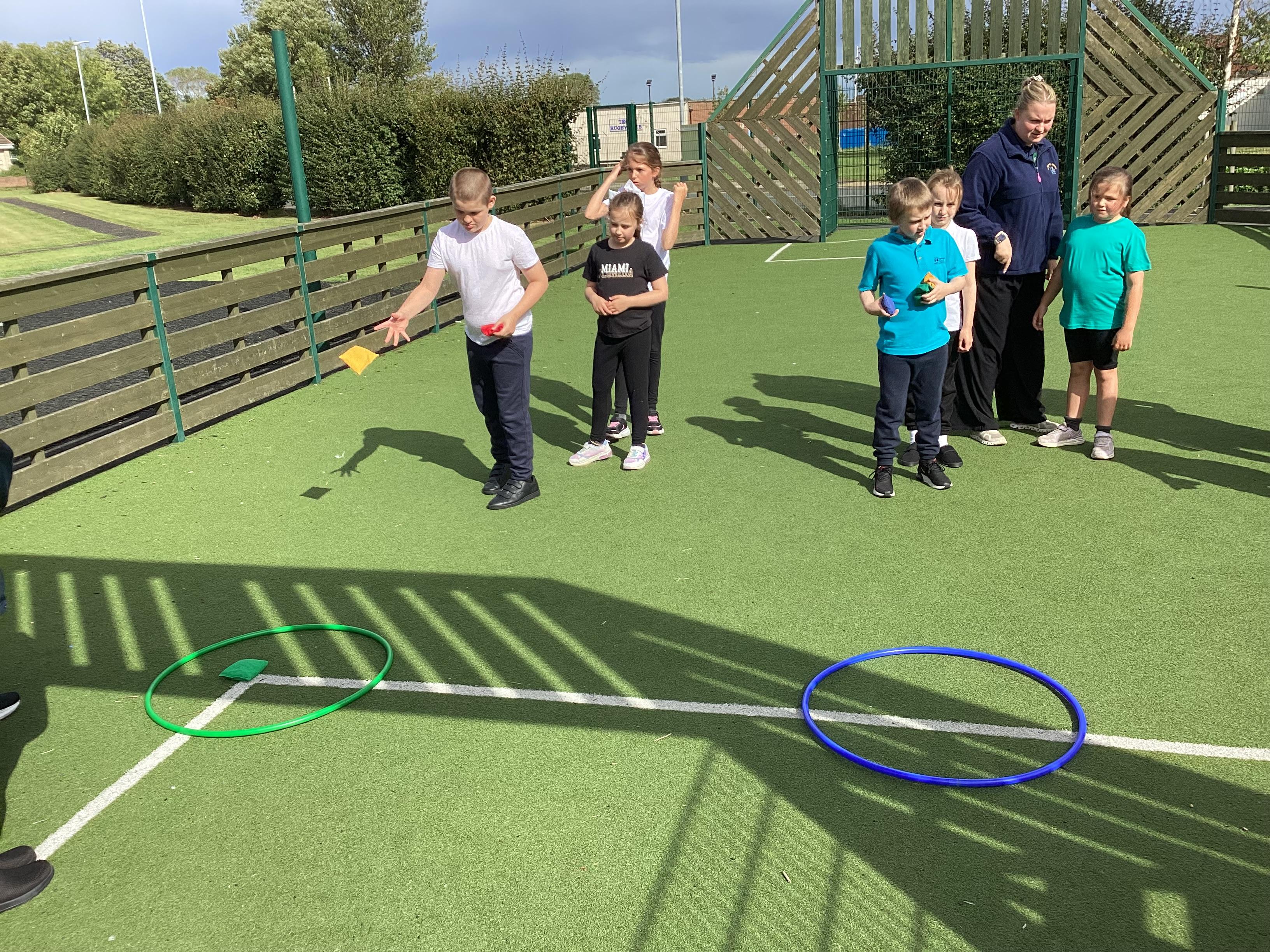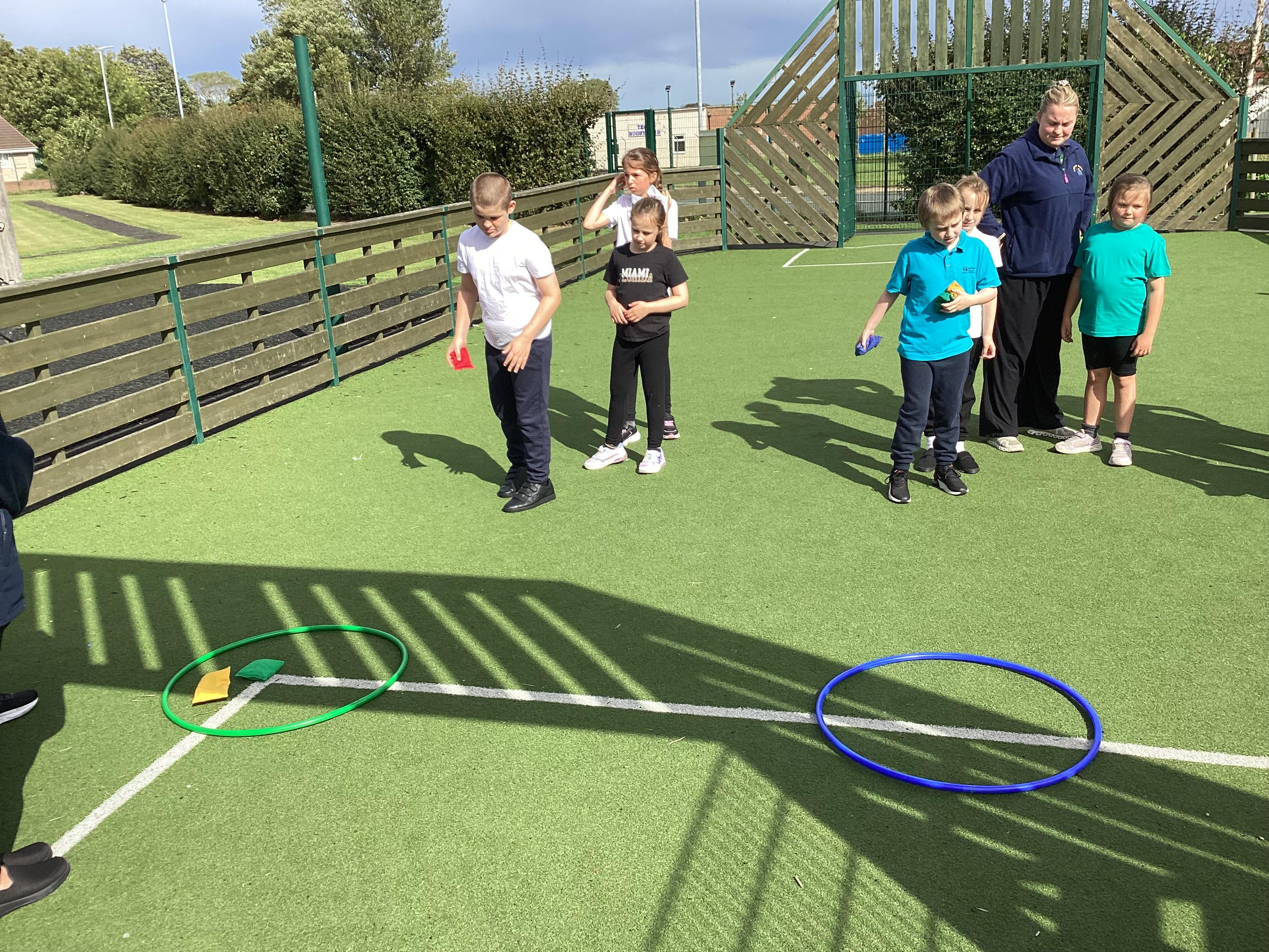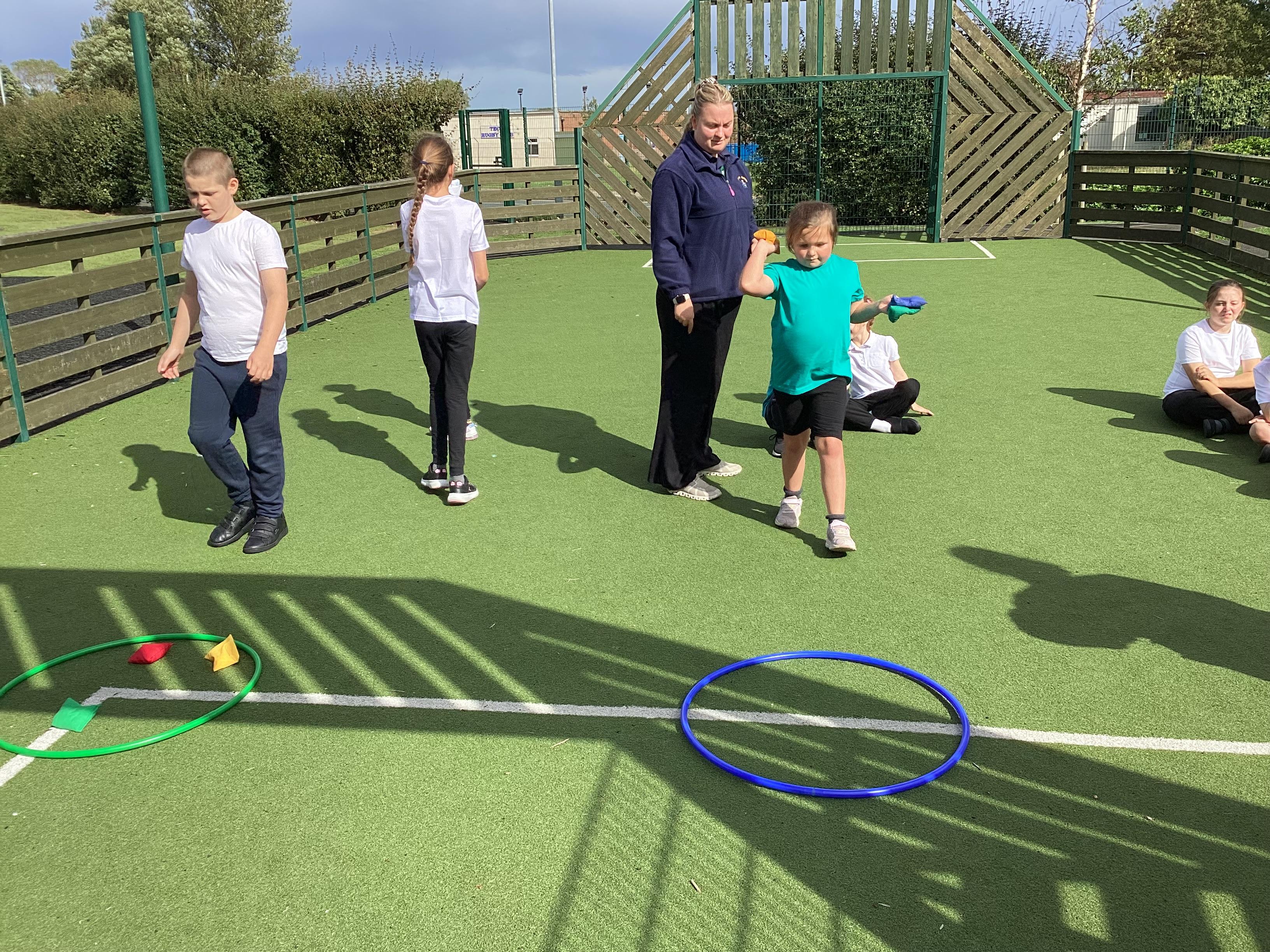 Thursday 11th September 2025 - In PE today, we have been practising our throwing. We were throwing beanbags high and low. We then took turn to throw beanbags into hoops.