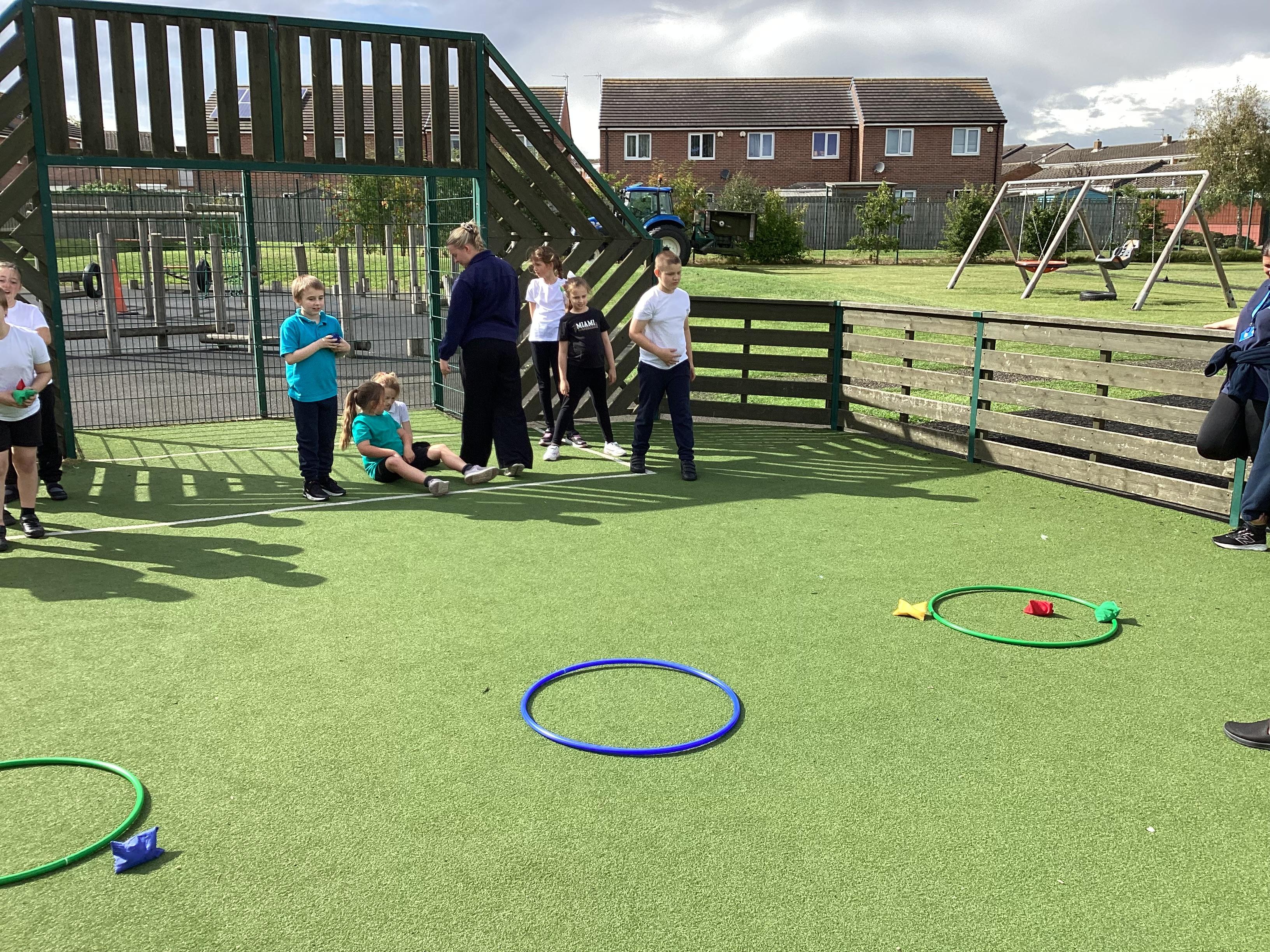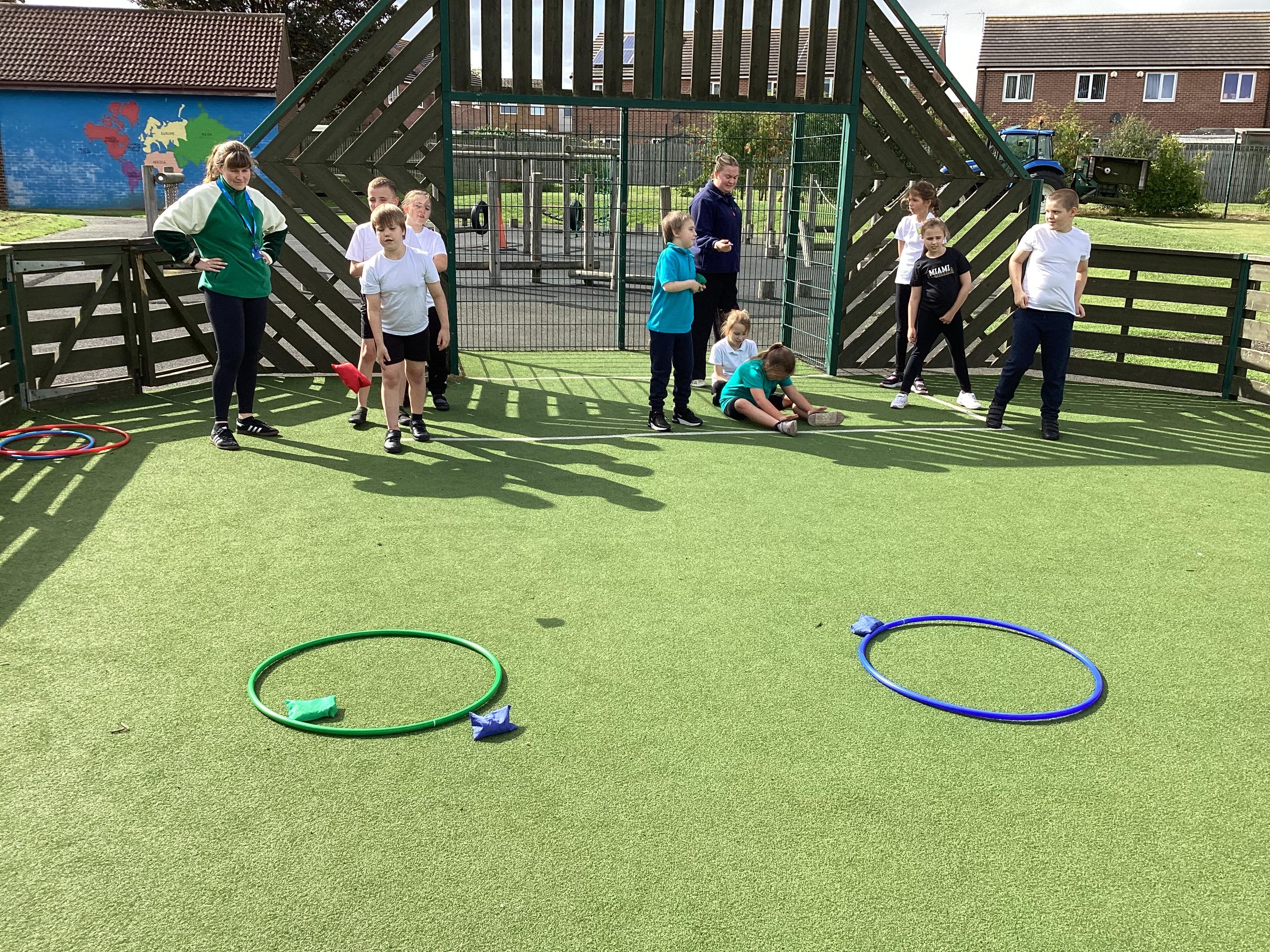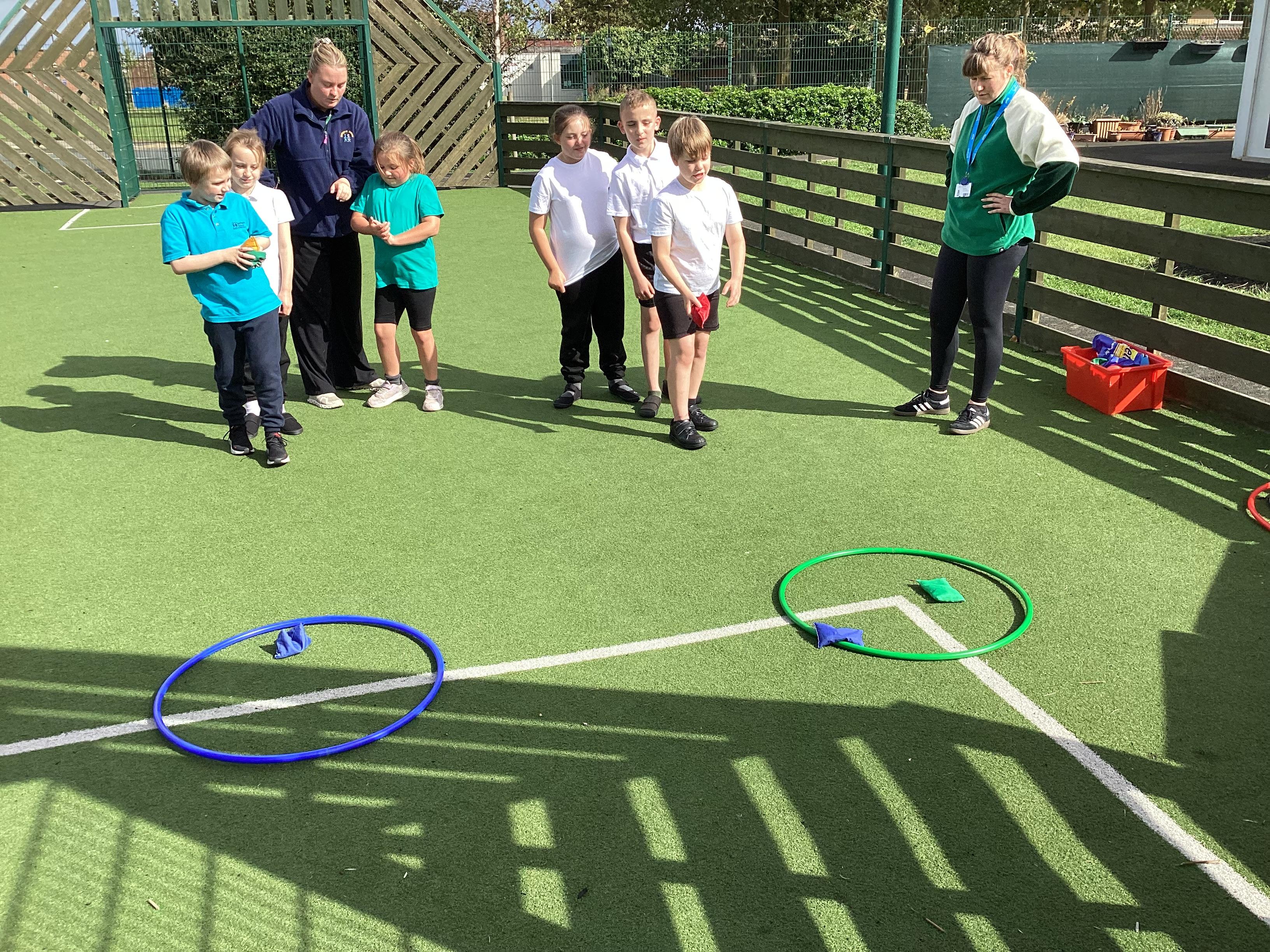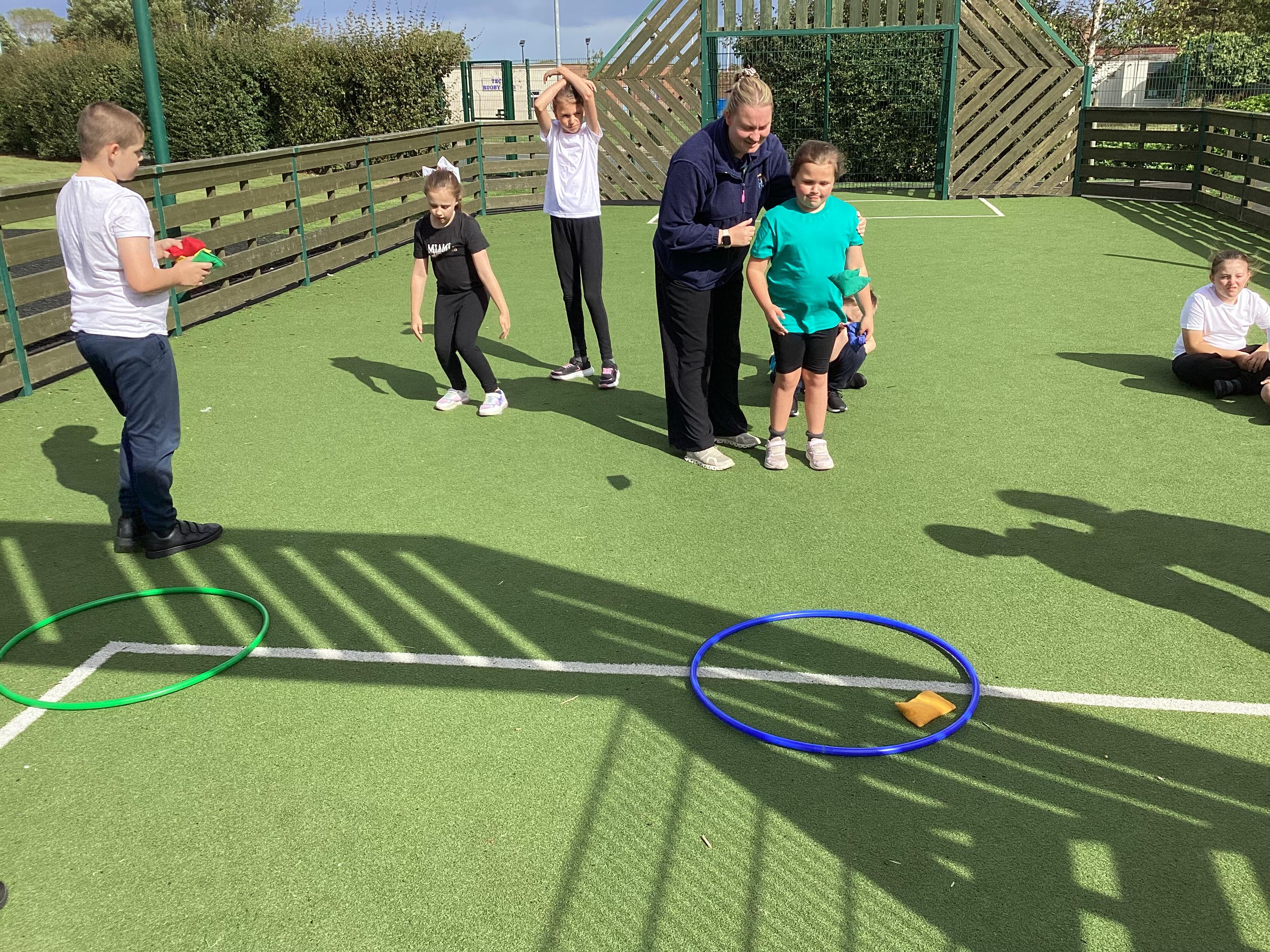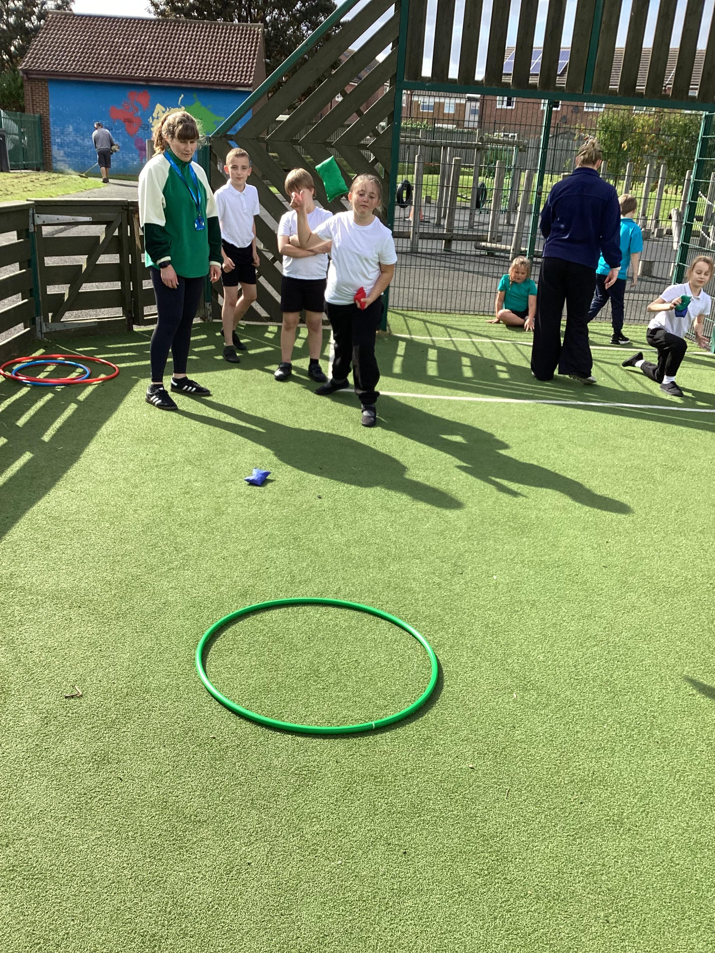 Thursday 11th September 2025 - In PE today, we have been practising our throwing. We were throwing beanbags high and low. We then took turn to throw beanbags into hoops.