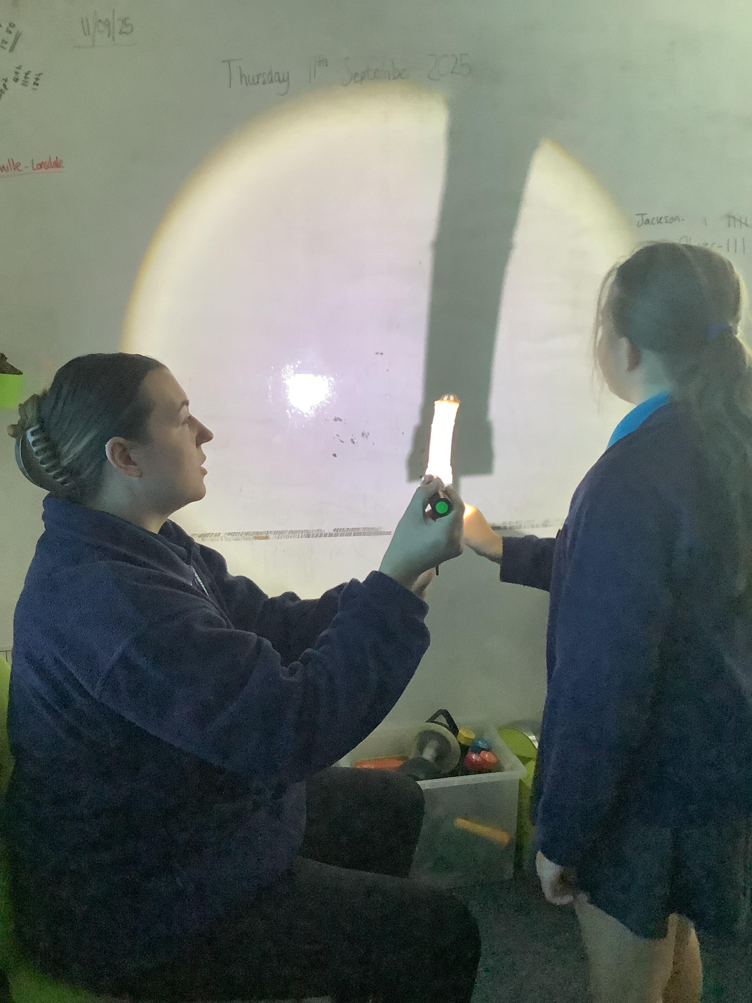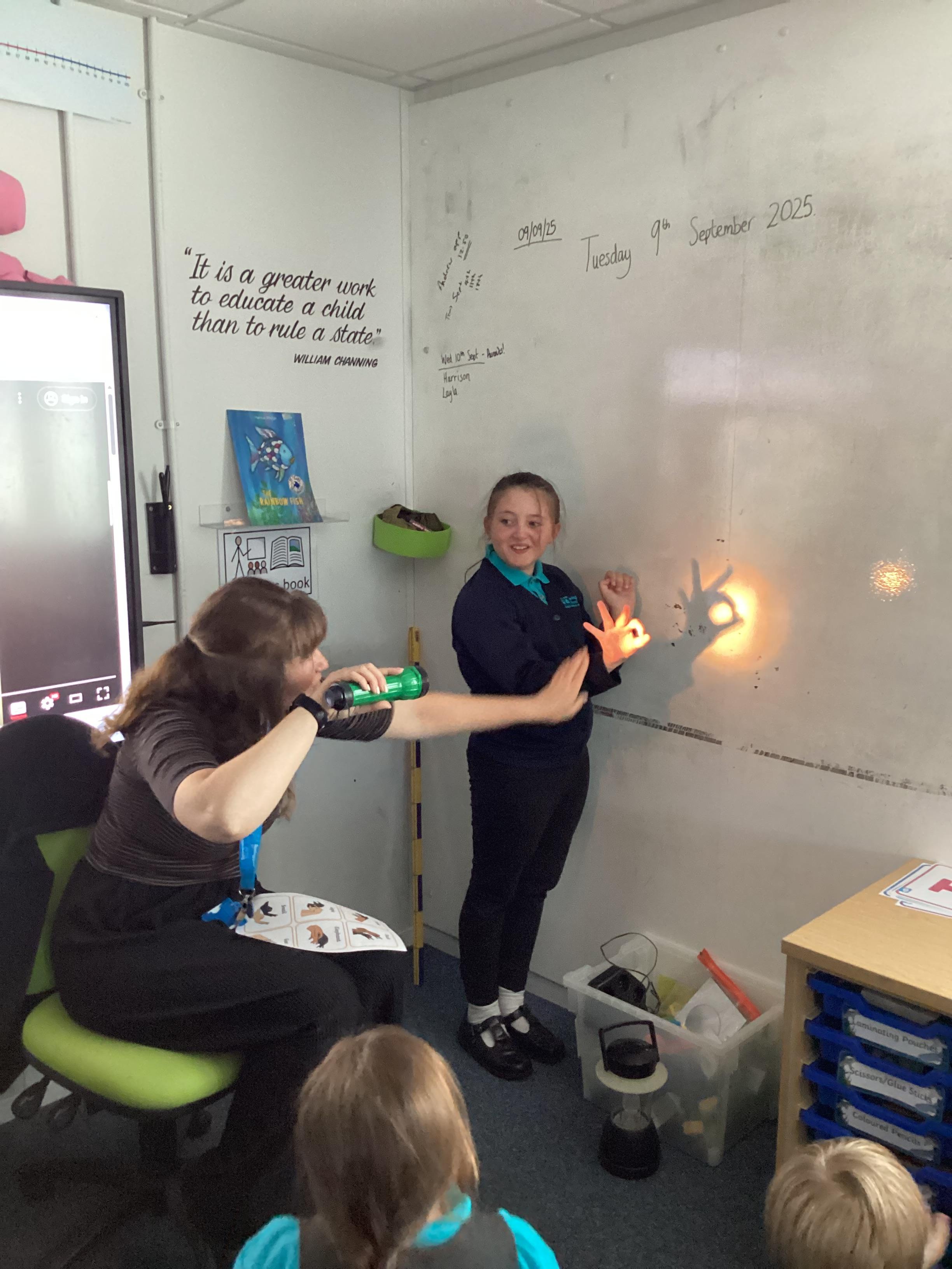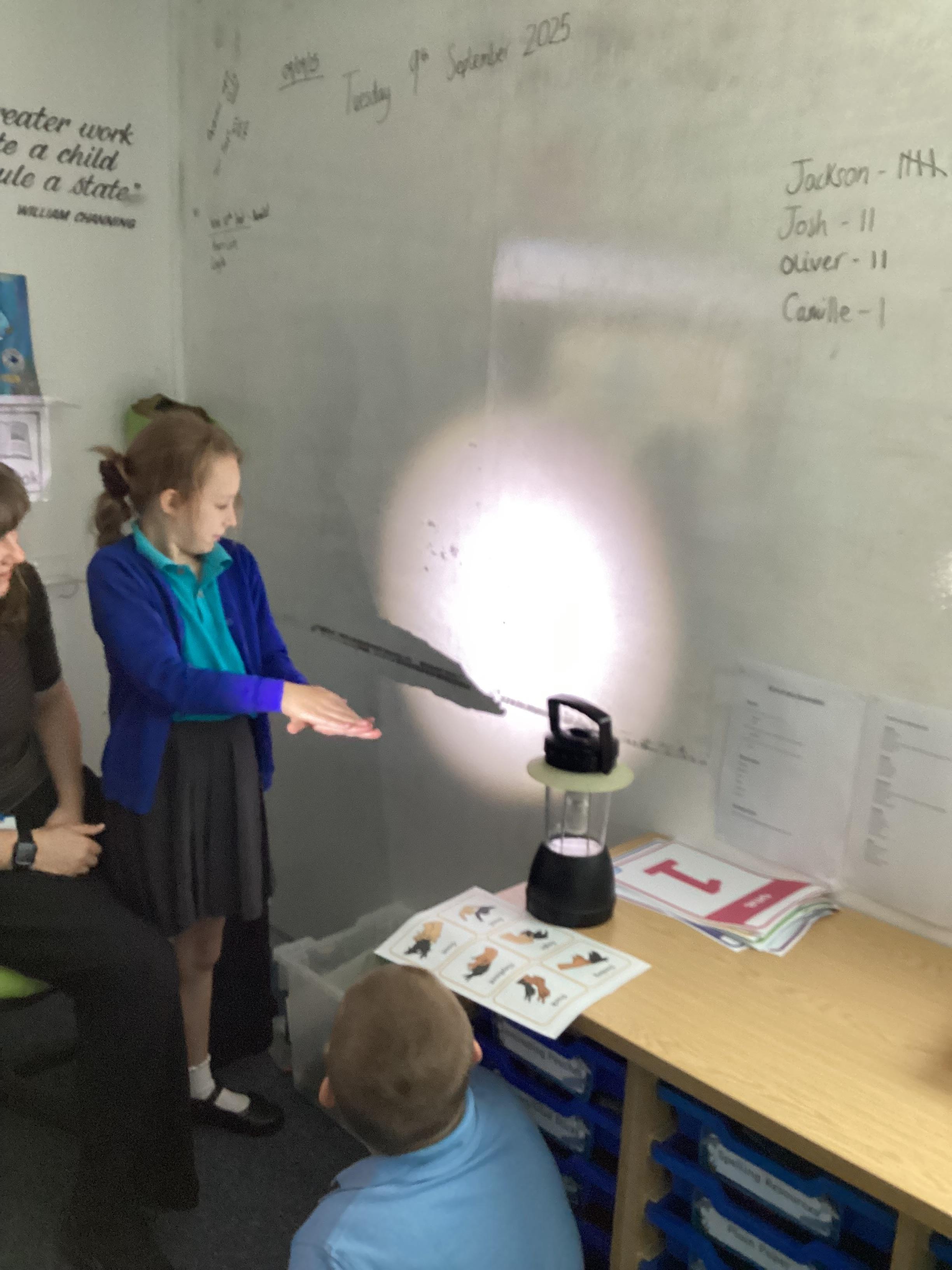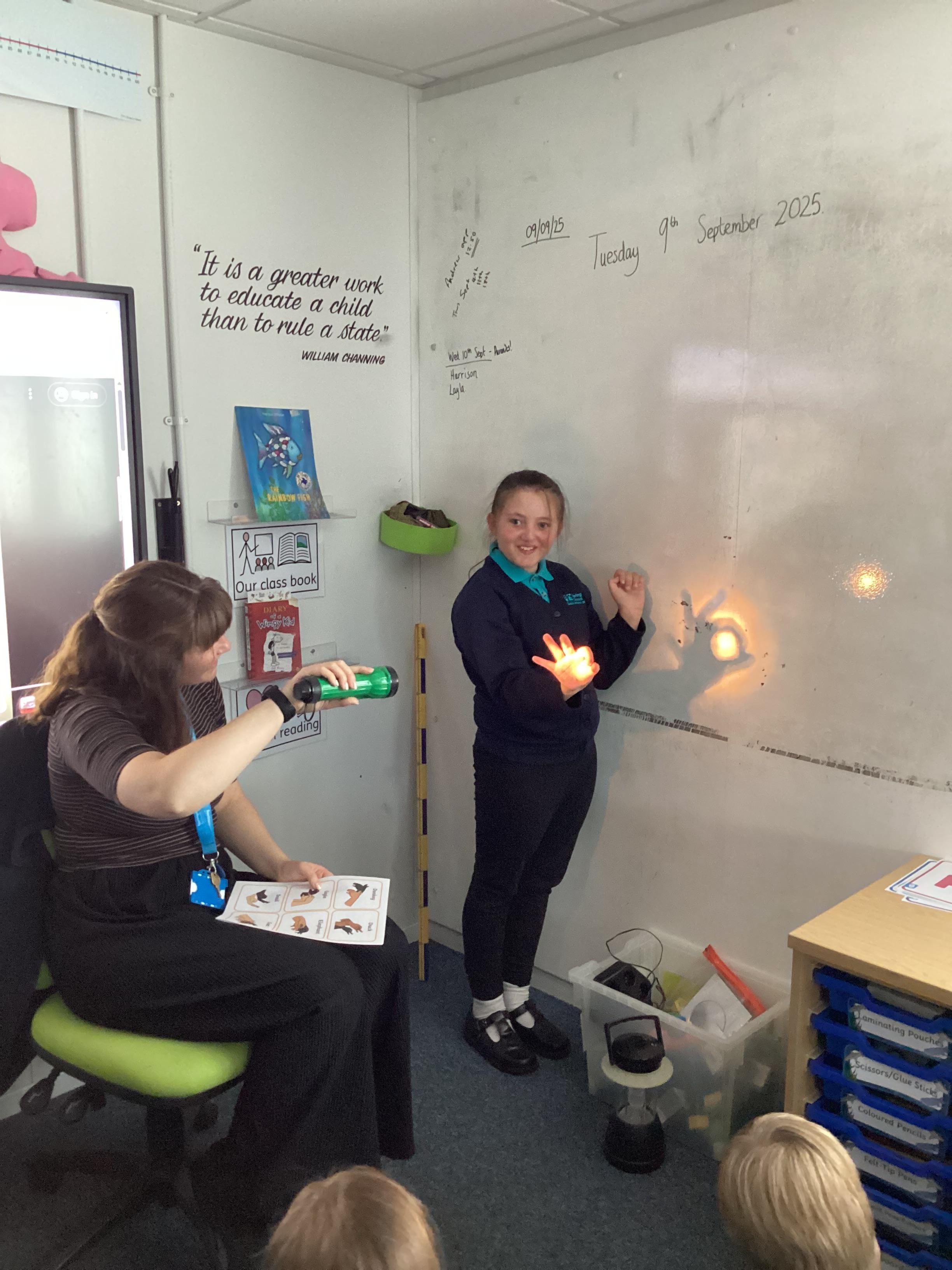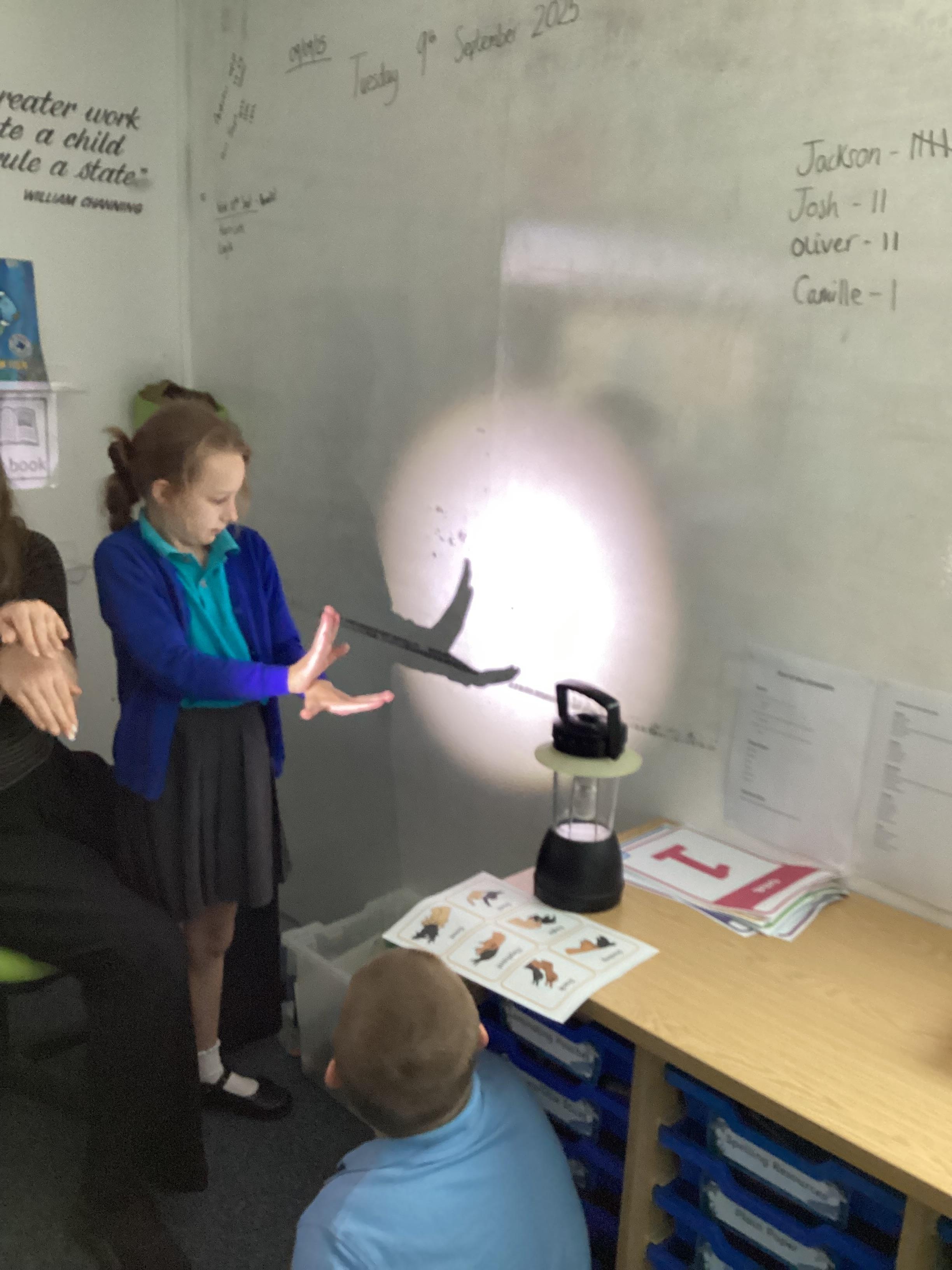 Tuesday 9th September 2025 - In Science this week we are learning all about light sources. Today, we have been talking all about shadows and how they are made. We used torches and our hands to make hand puppets. We then went into the school yard and made various shaped shadows using the sun. This was a really fun lesson!