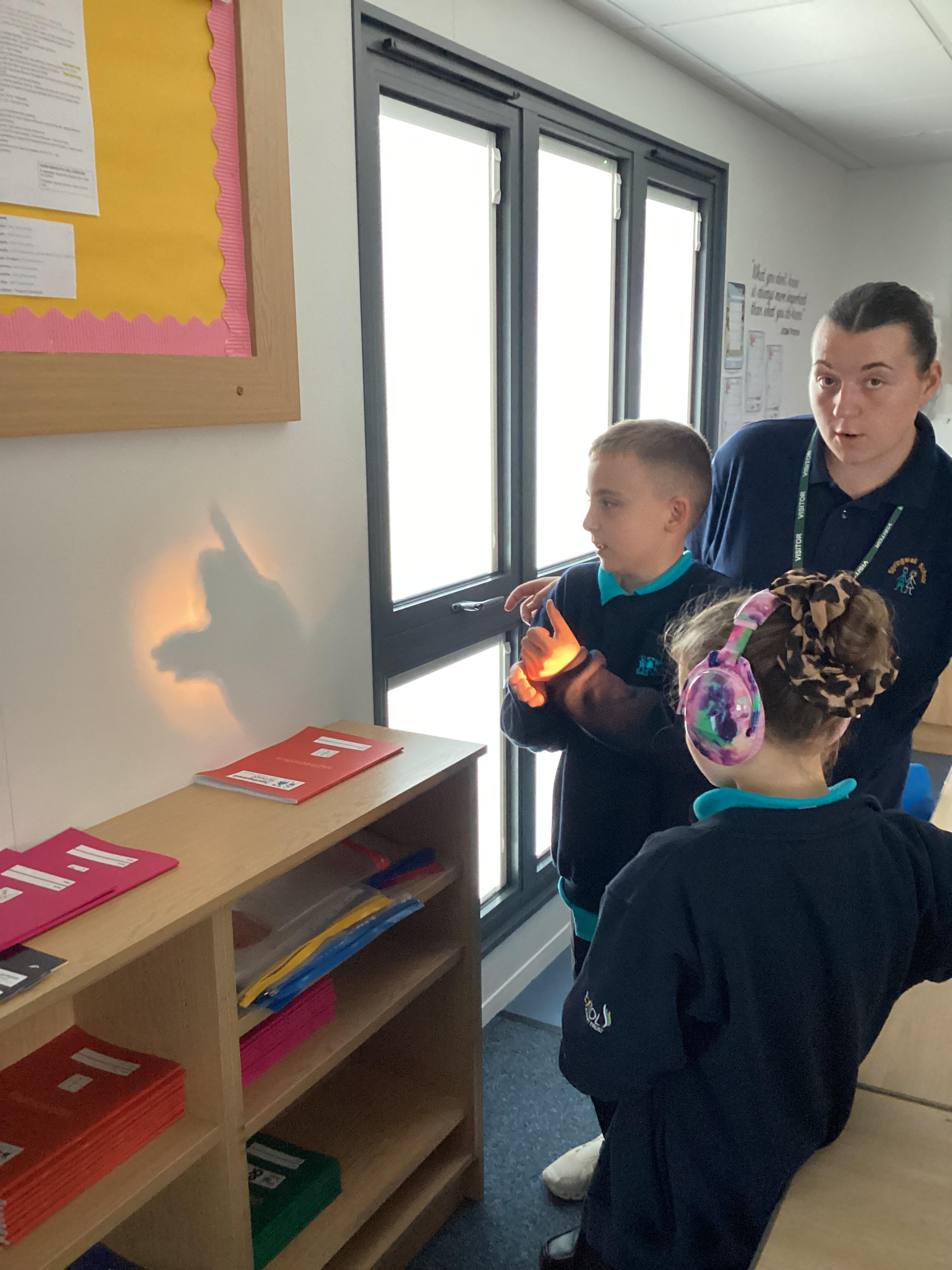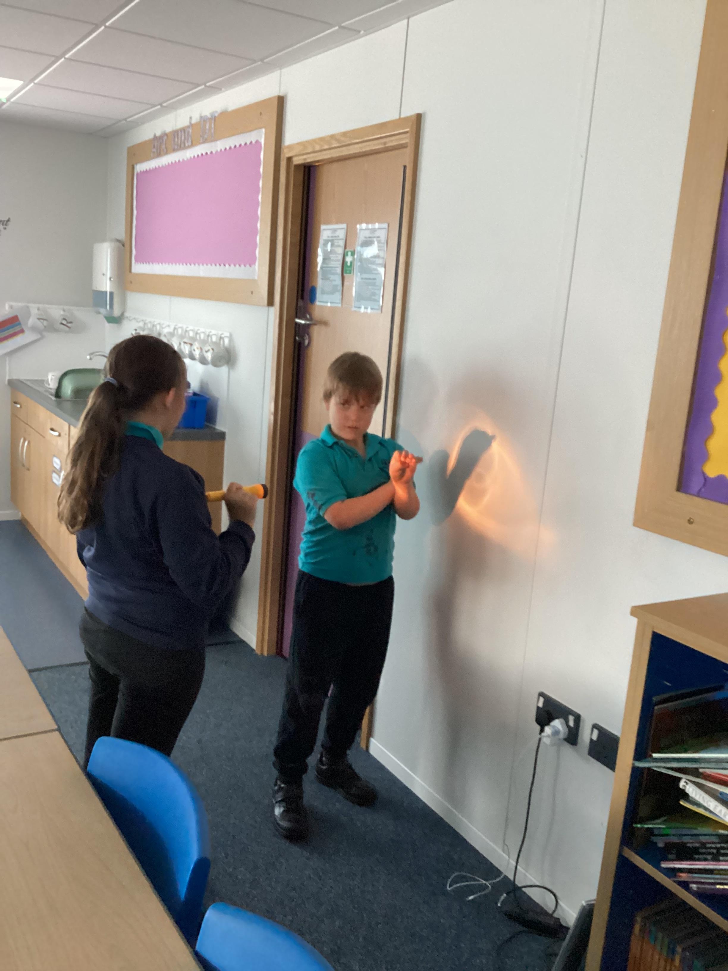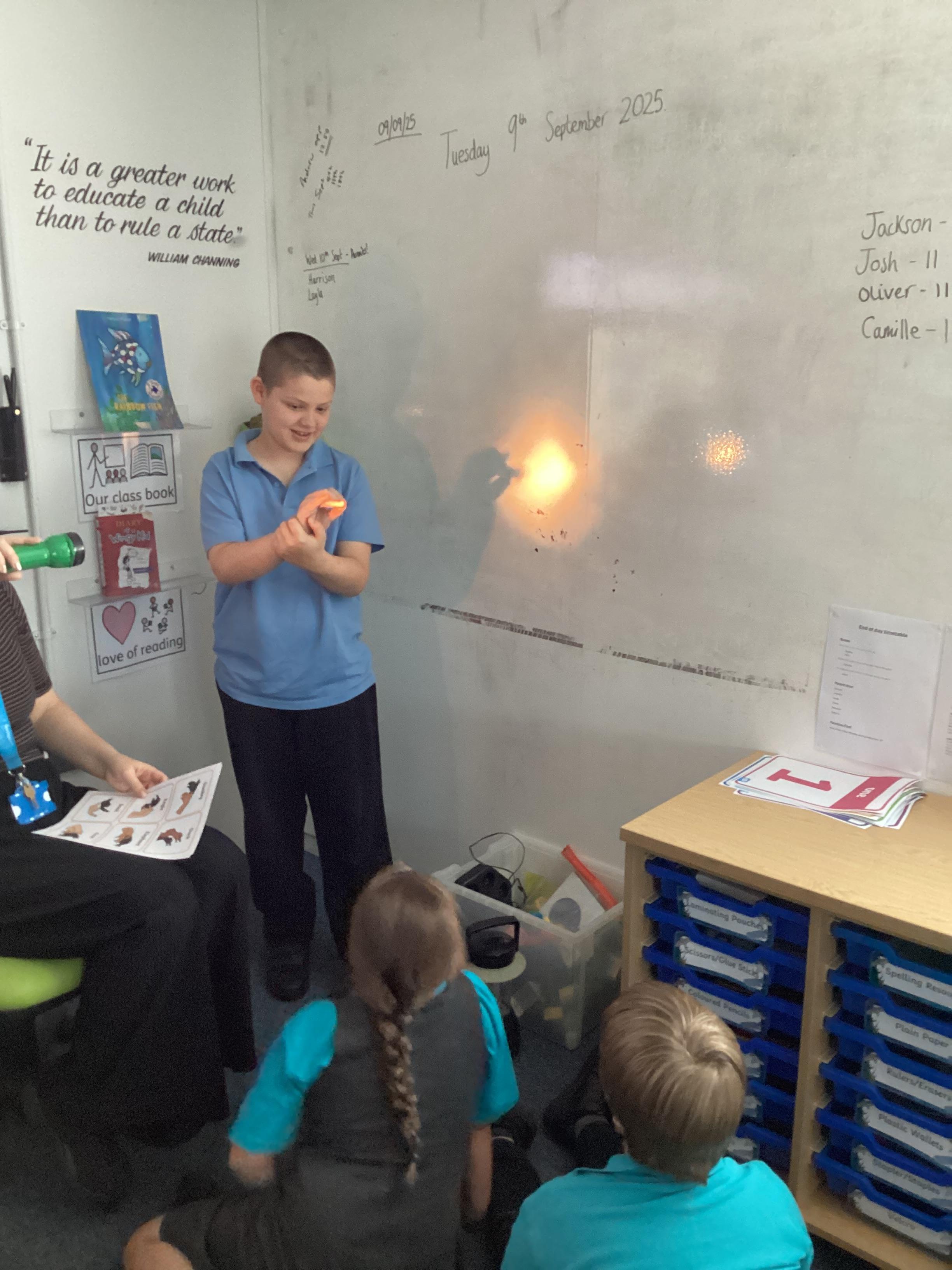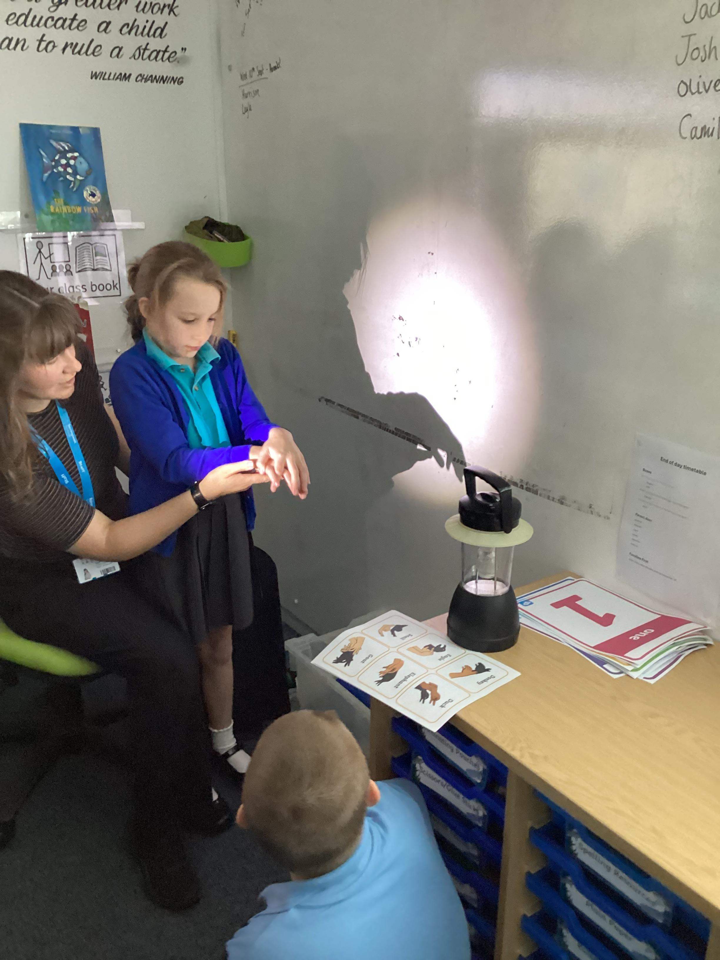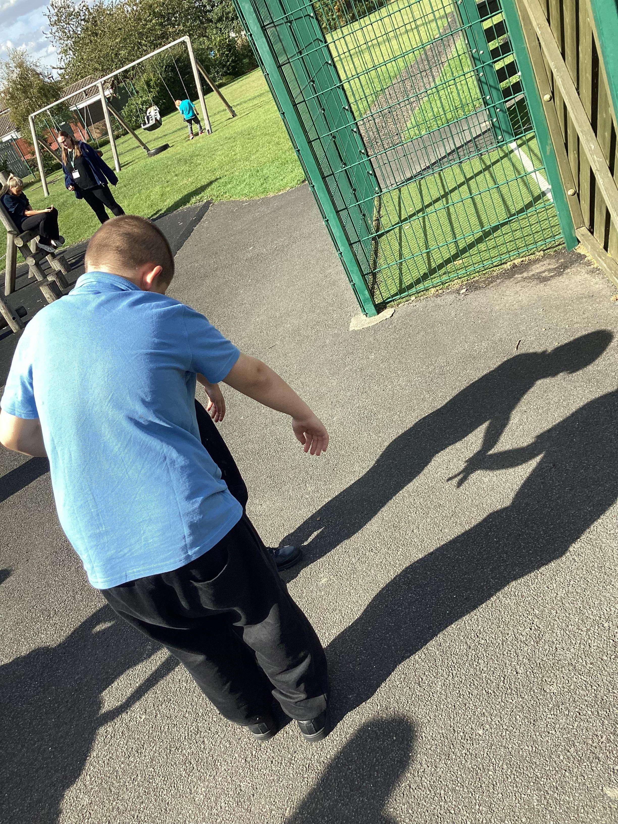 Tuesday 9th September 2025 - In Science this week we are learning all about light sources. Today, we have been talking all about shadows and how they are made. We used torches and our hands to make hand puppets. We then went into the school yard and made various shaped shadows using the sun. This was a really fun lesson!
