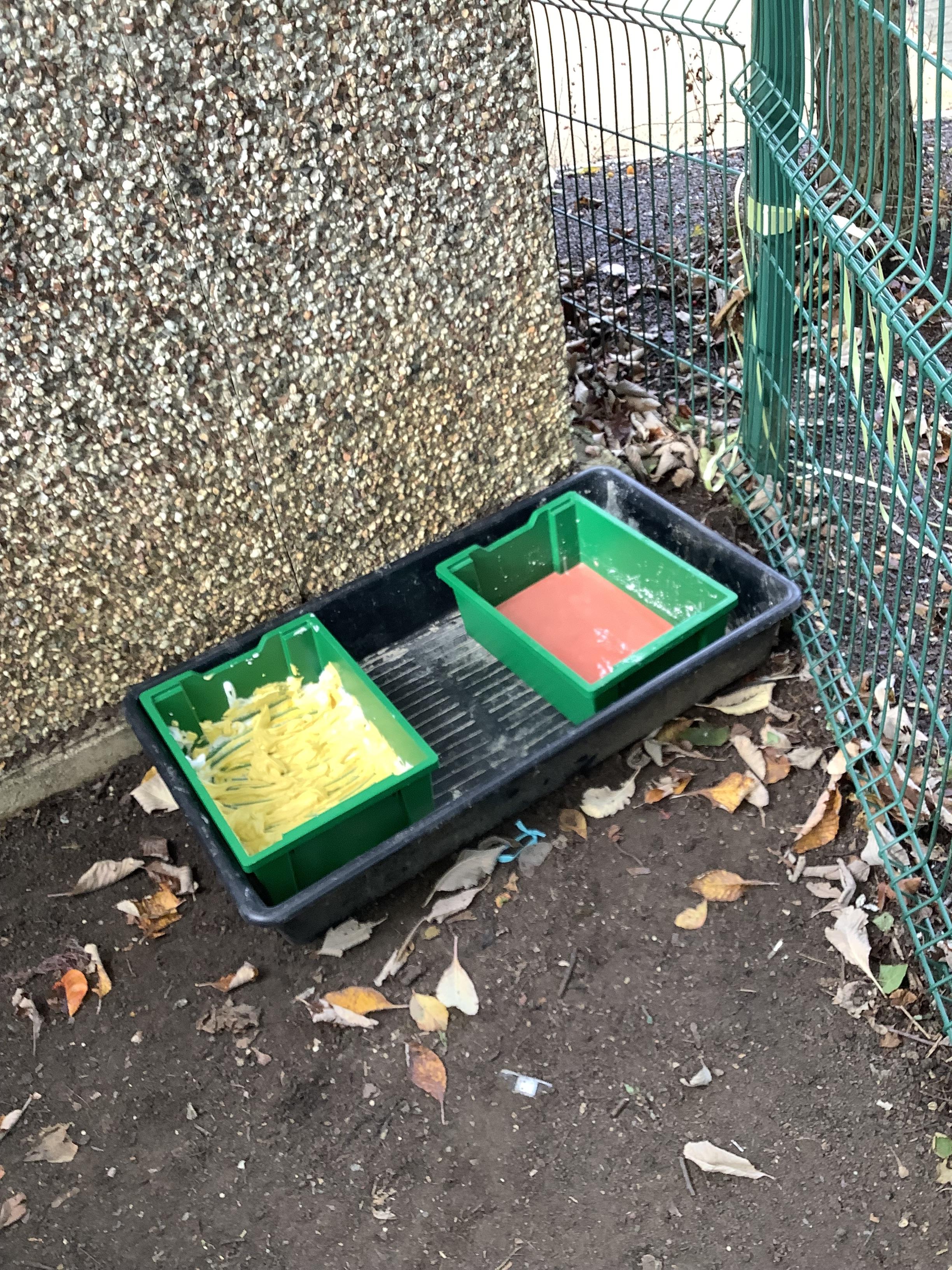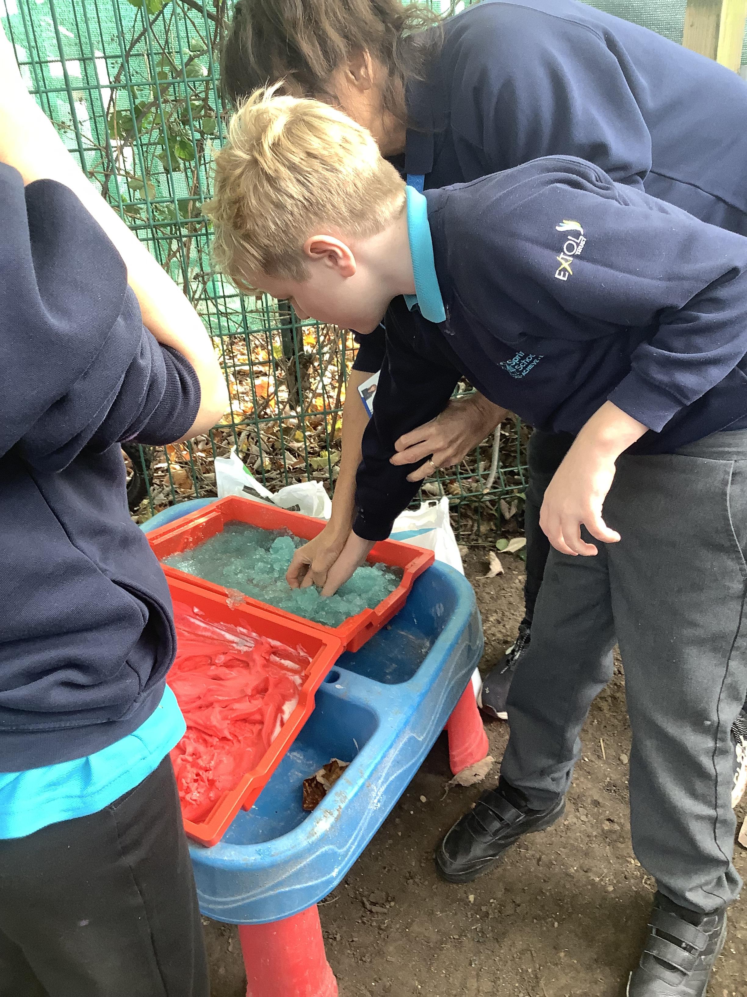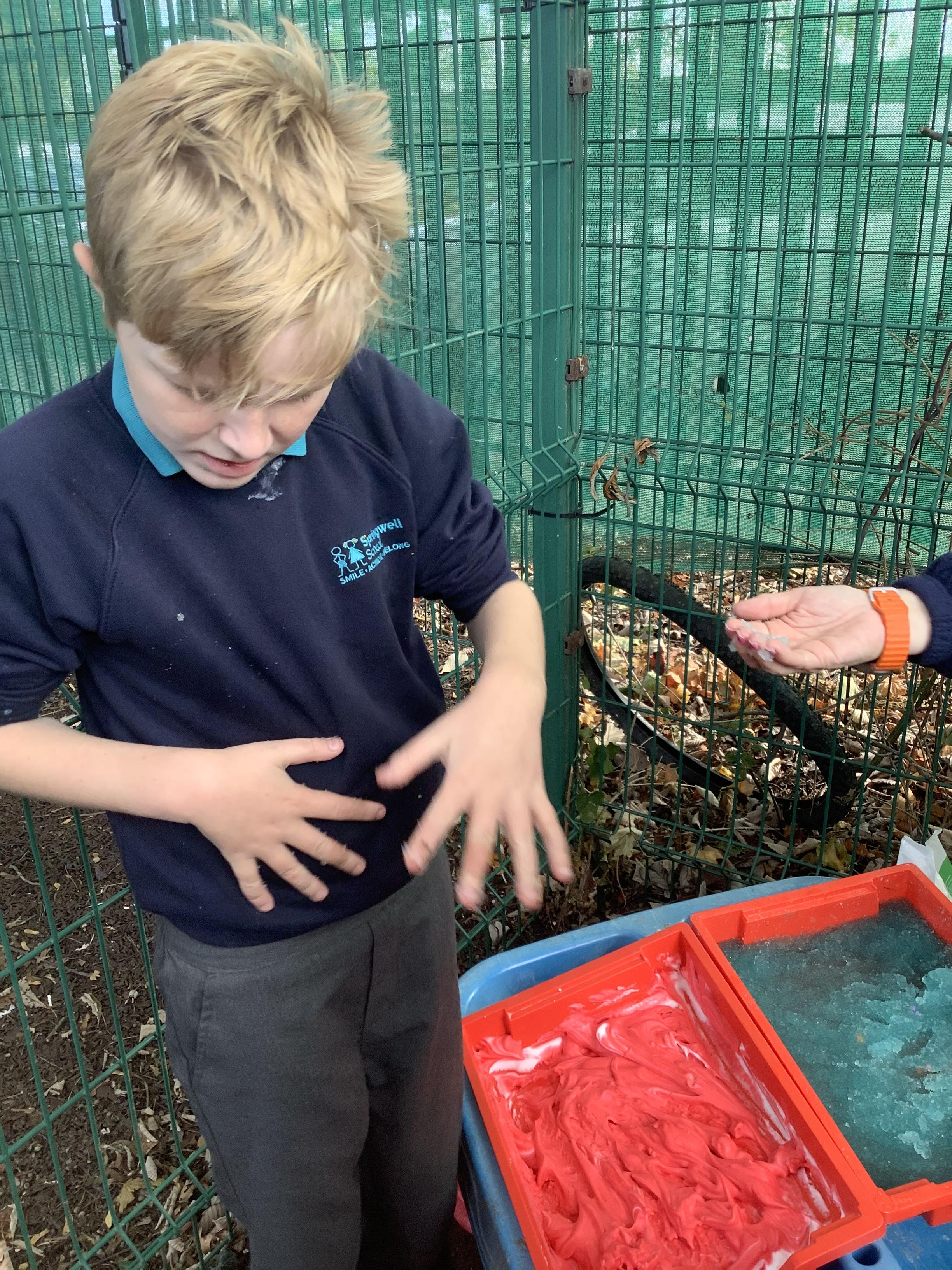 The children in Pangolin class enjoyed getting messy in our outdoor sensory corner, exploring the textures and colours with jelly, flour, shaving foam and paint.
