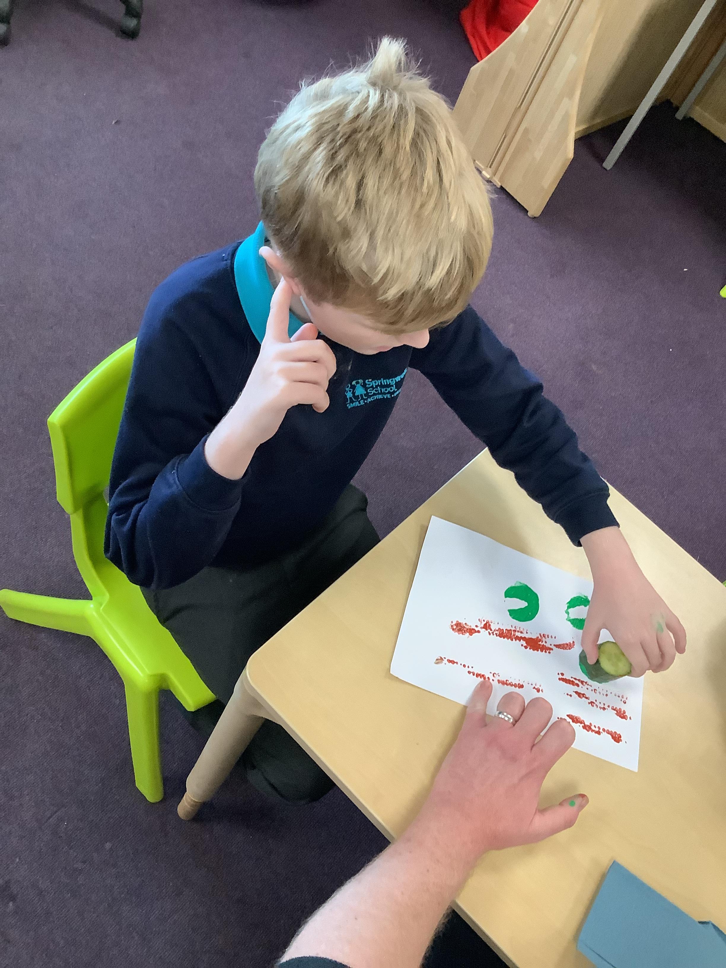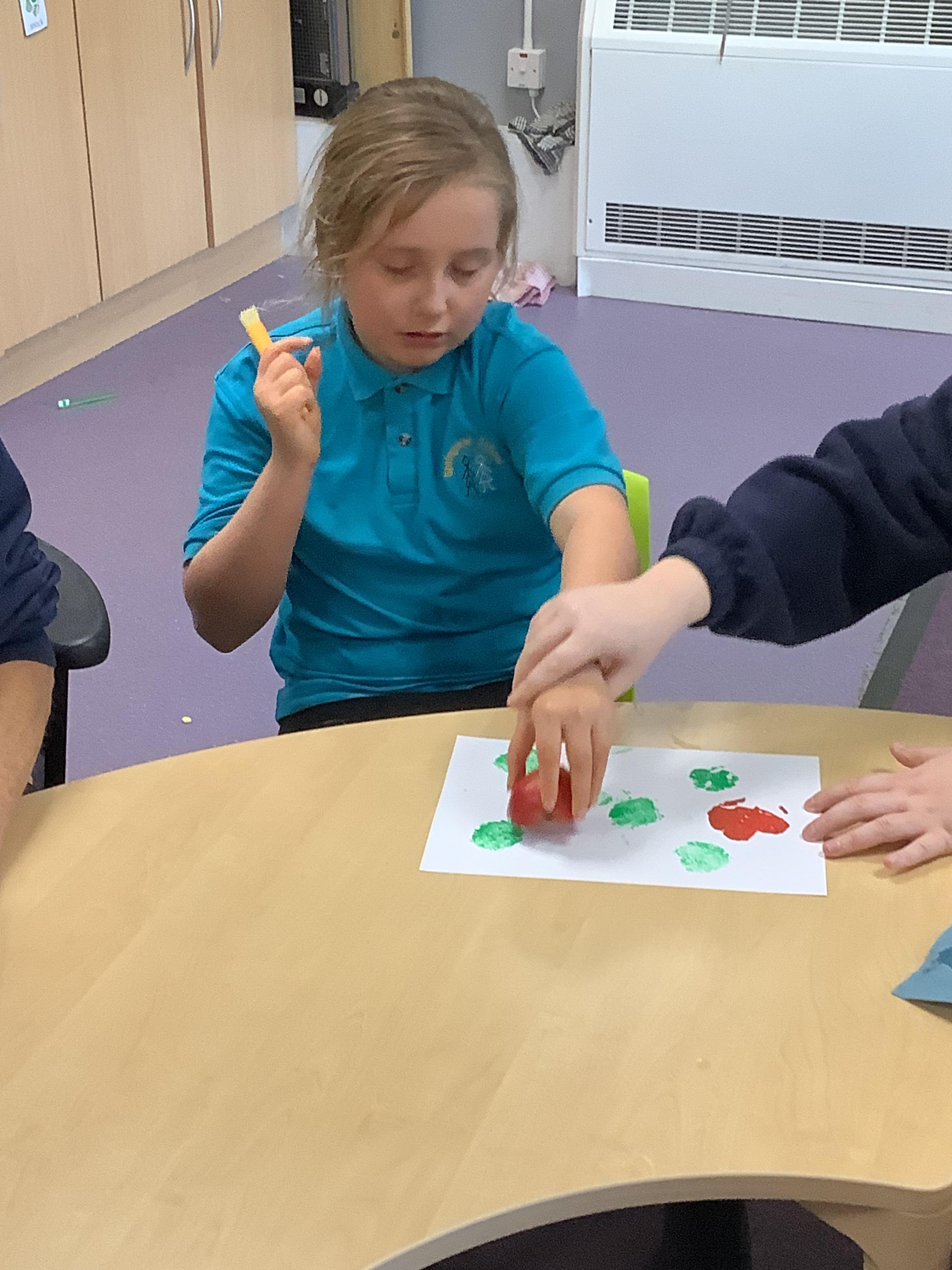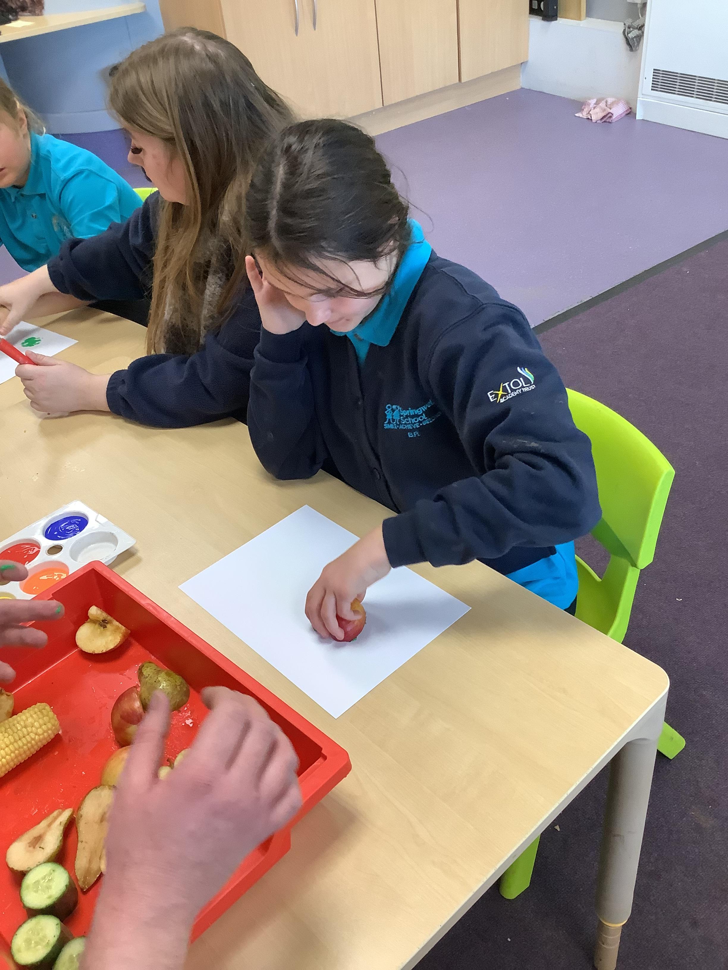Pangolin class enjoyed a trip to Aldi to buy some fruits and vegetables, when we arrived back at school the children sat together and explored the foods by smelling, touching and tasting each one. Following this each child chose a paint colour and piece of fruit to print with. All the children enjoyed this activity.