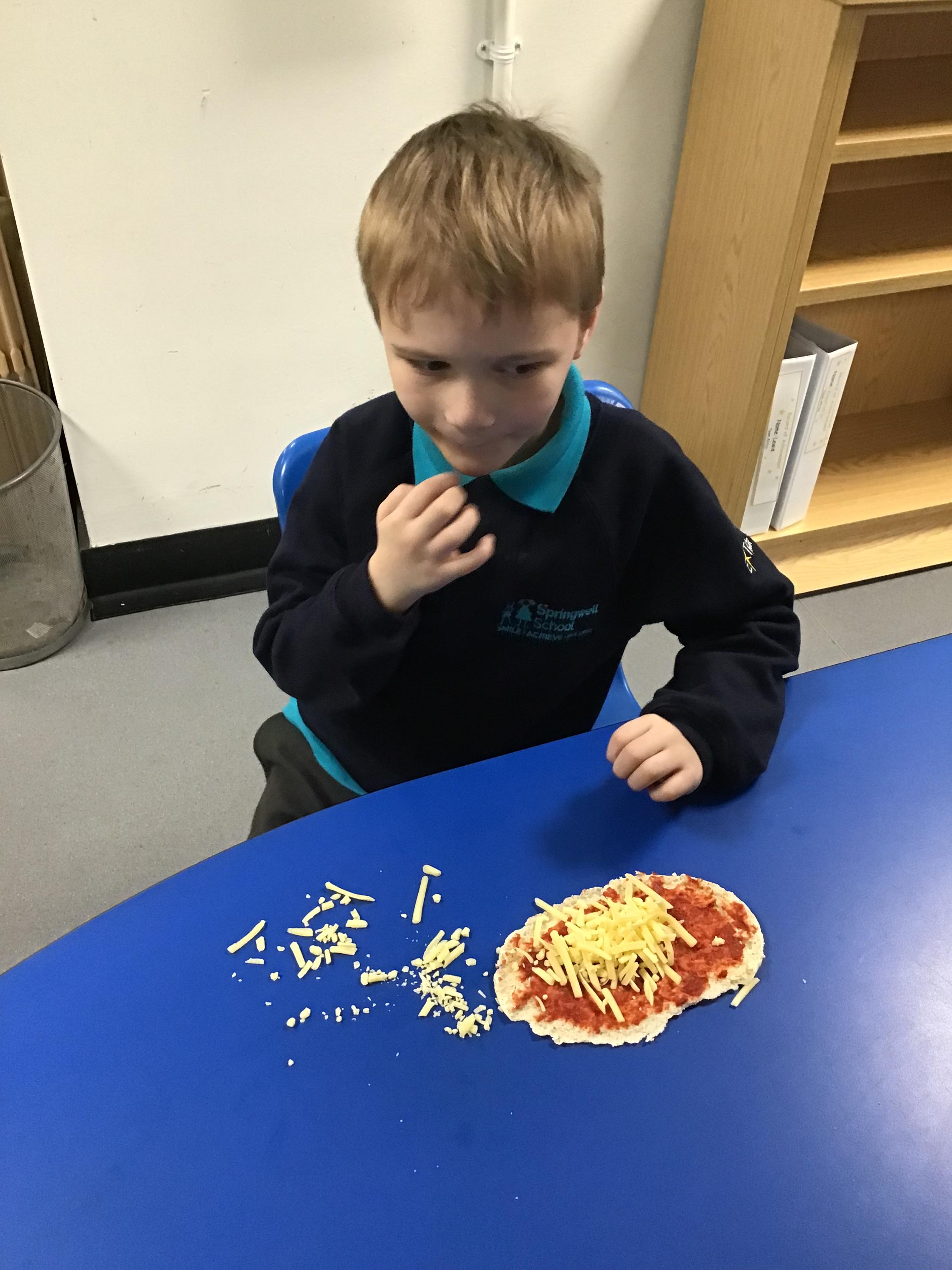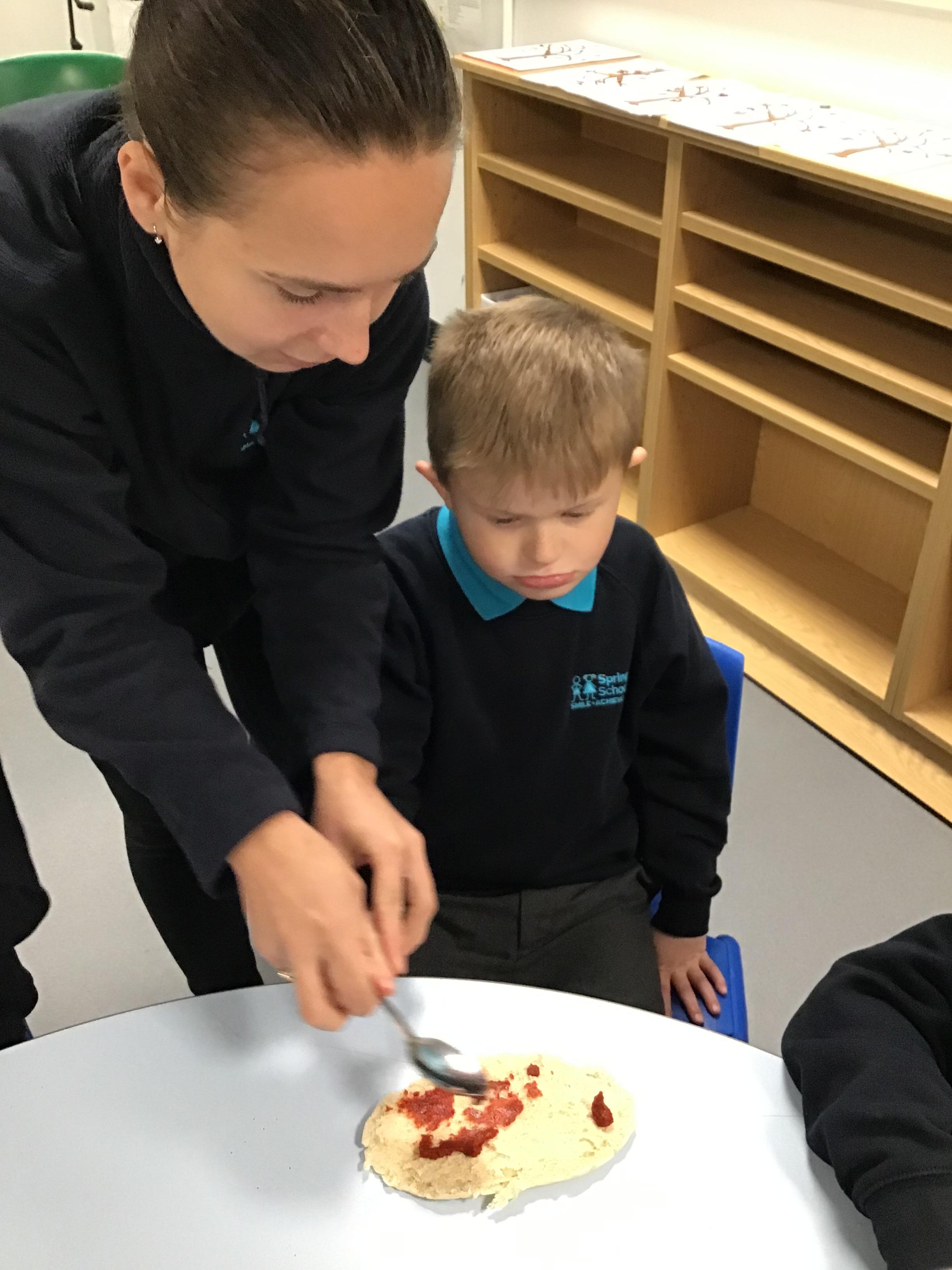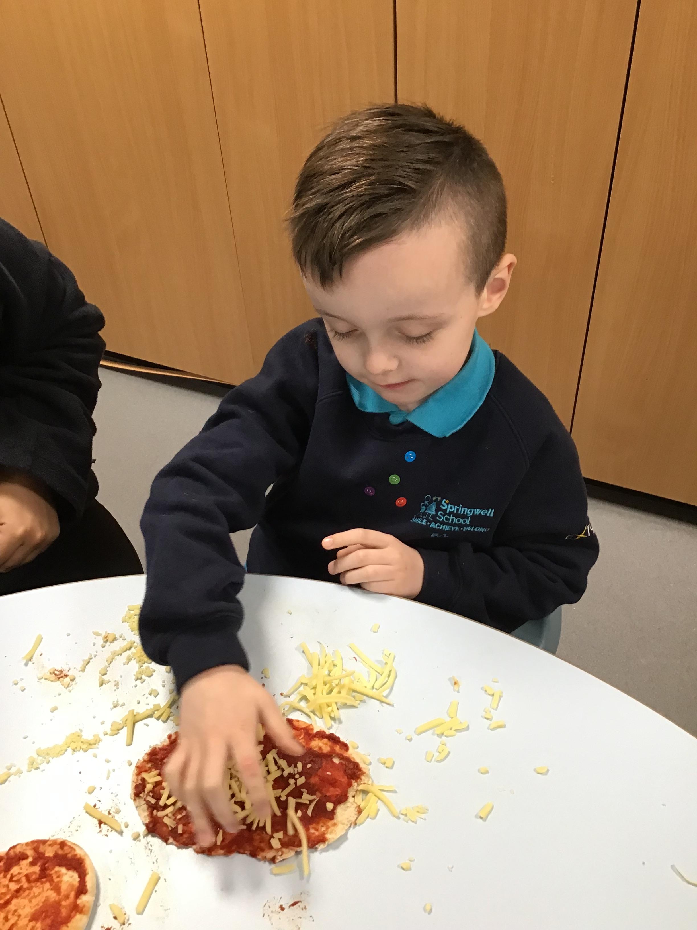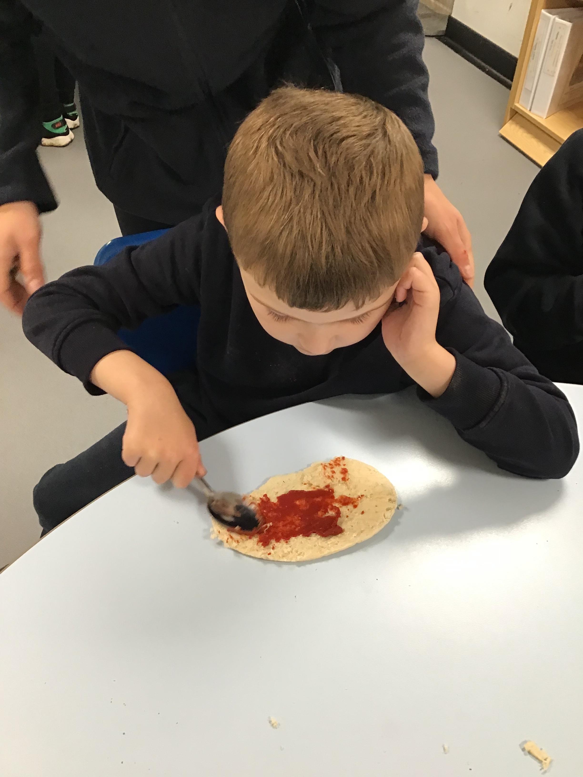 Today we made pizza. The children enjoyed exploring the different food we used to make their pizza.