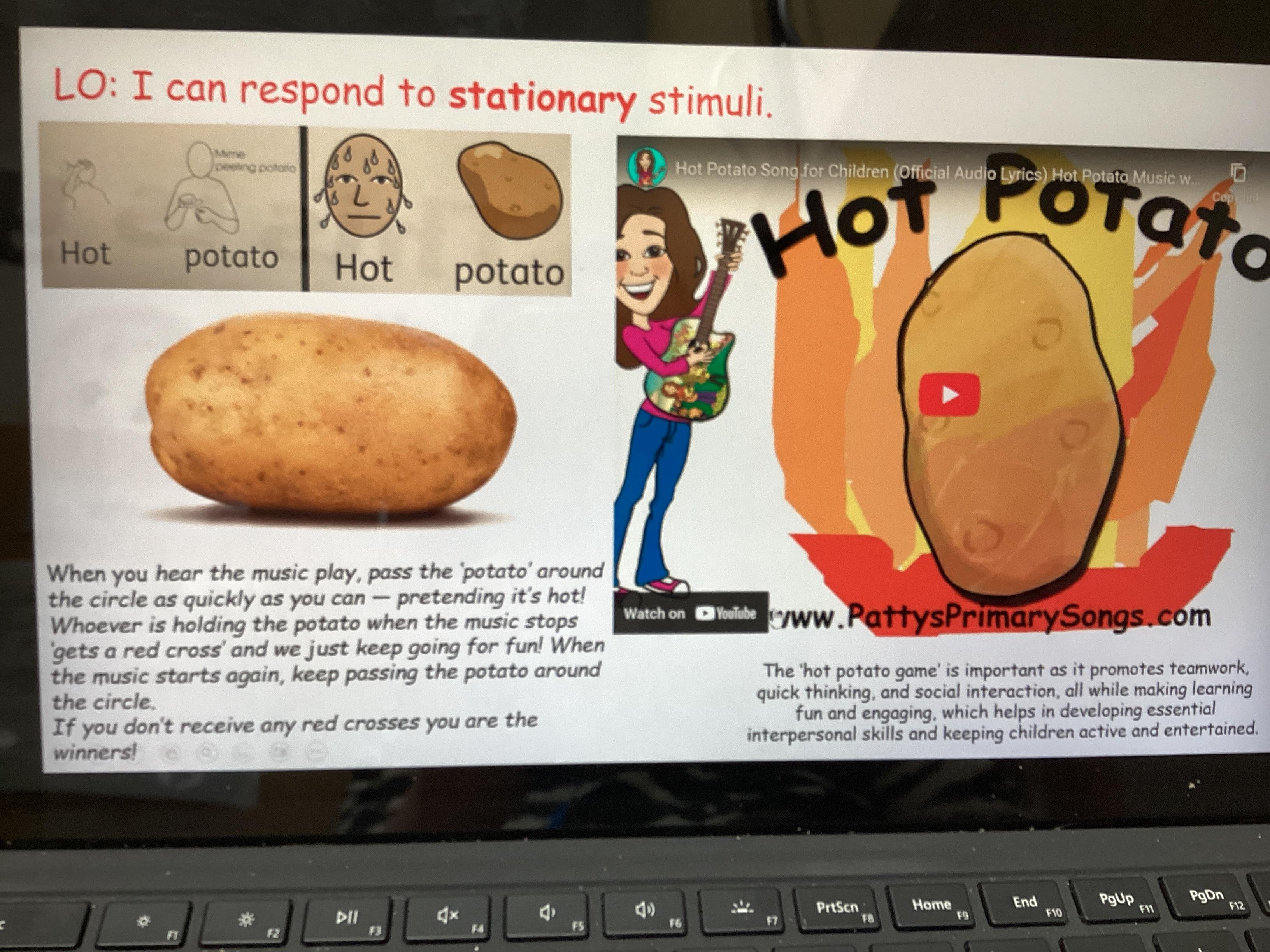 13.11.25 GEOGRAPHY The children have been responding to stimuli both stationary and moving objects. We have had lots of fun playing: 'Hot Potato'. The children sat in a circle and passed the objects around to their peers in turn to the music as quickly as they could — pretending it's hot! Whoever was holding the potato when the music stopped they got a 'red cross' and when the music started again, the children kept passing the potato around the circle. The children who didn't receive any red crosses were the winners!