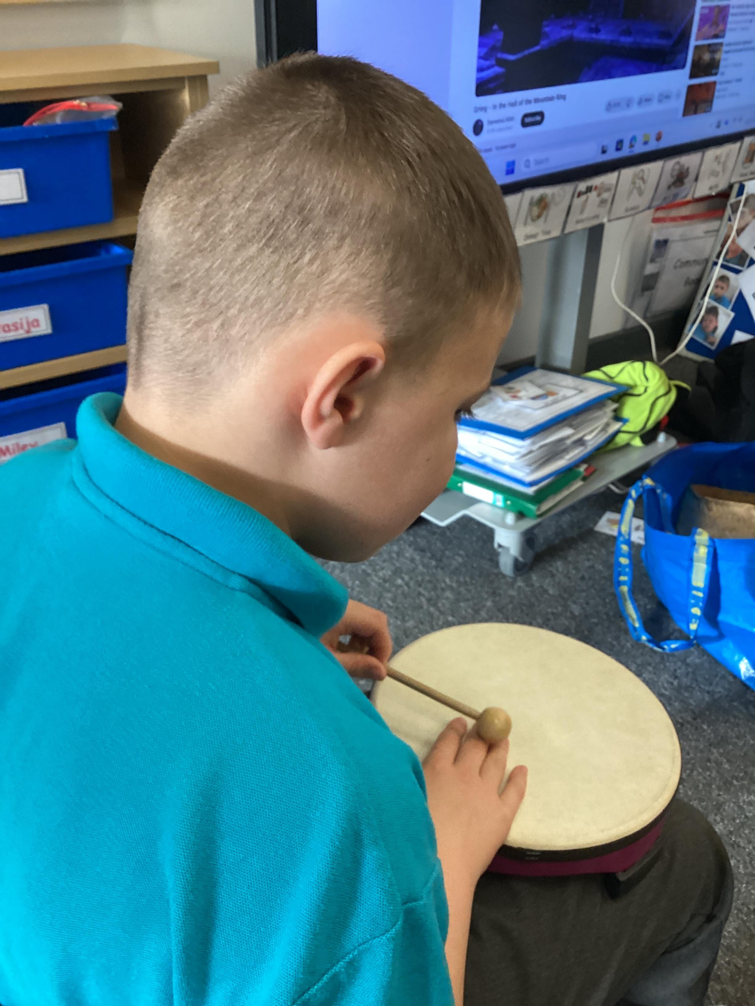 03.11.25 MUSIC: The music lady has visited our class this morning. She met our lovely Anaconda children and sang them an hello song. She brought a range of interesting instruments e.g. gogo, cowbell, baby drum, crocodile, ukulele etc. The children took it in turns to choose their preferred instrument. They played their instruments along to the song: ' In the Hall of the Mountain King'.