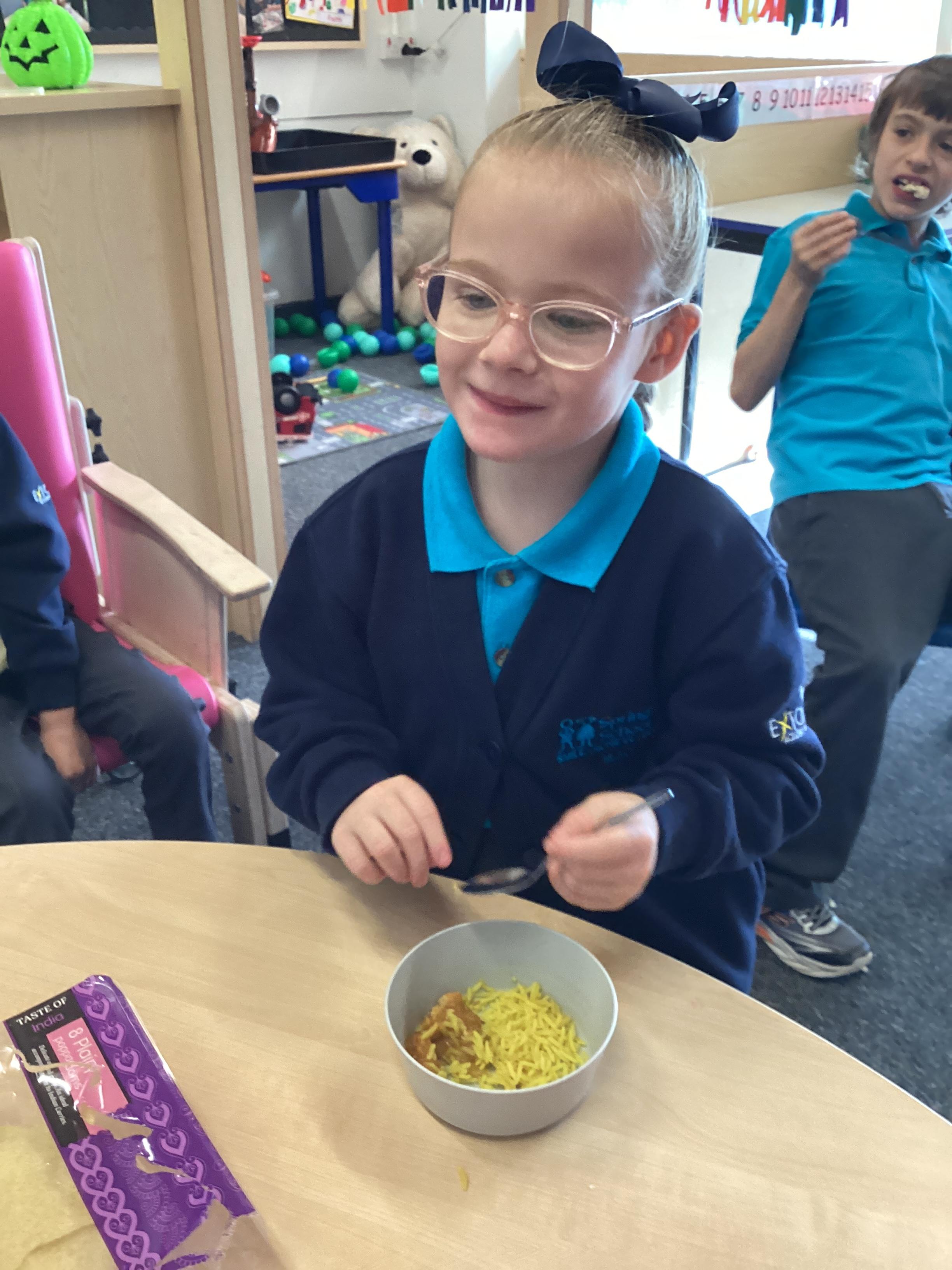 22.10.25 RE: DIWALI We have been learning about Diwali in RE. We discussed how Hindu's celebrate Diwali e.g. put diya lamps on, visit temple, draw rangoli patterns, have fireworks and family feast. We had our own mini-Diwali feast in class. The children tried some rice, chicken korma curry, naan breads and poppadom's.