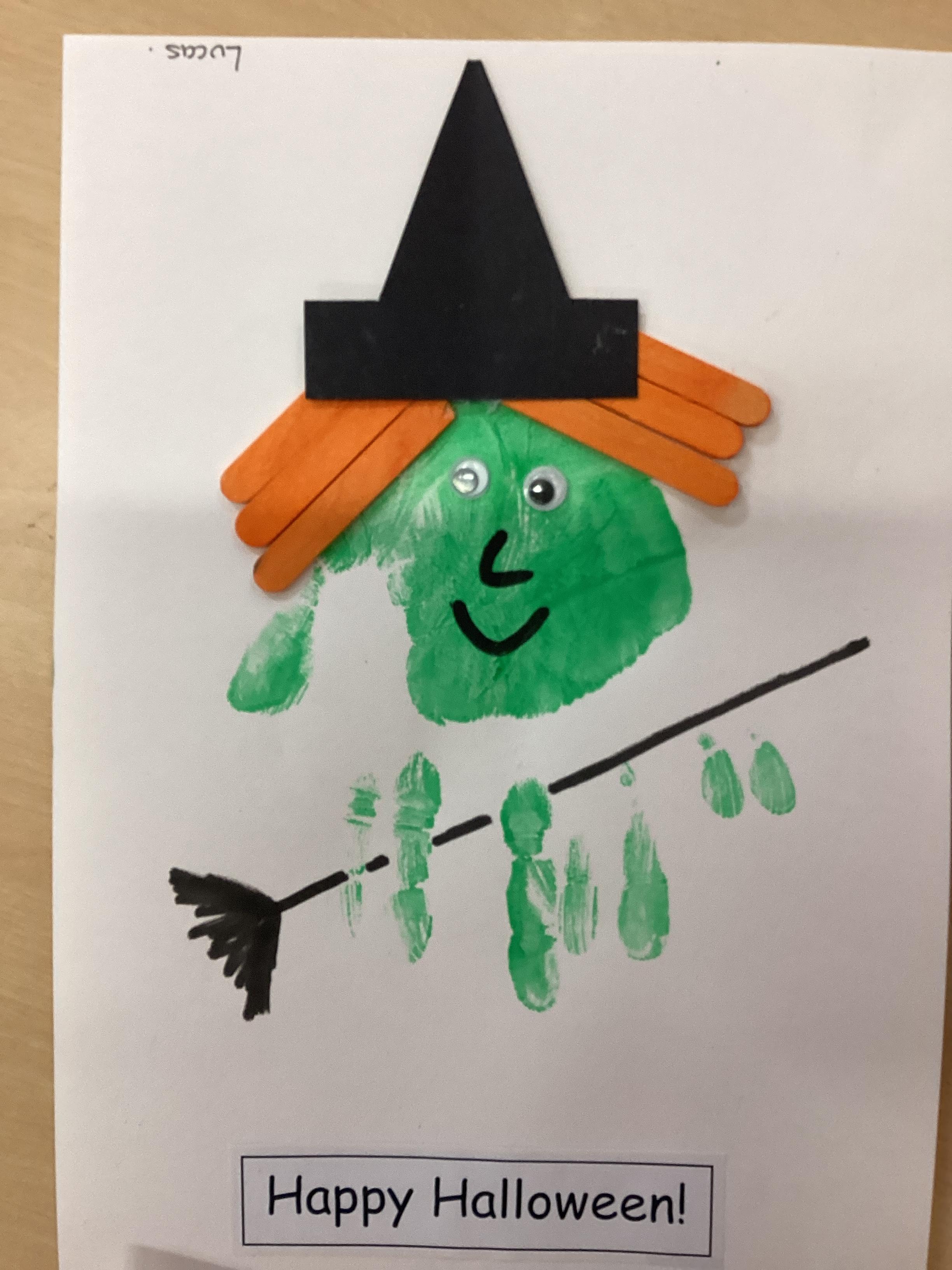21.10.25 ART: The children have enjoyed creating 'Halloween themed crafts'. We made pumpkin prints using orange paint and half of an apple. We made a green witch using our hand prints and orange lolly pop sticks for her hair.