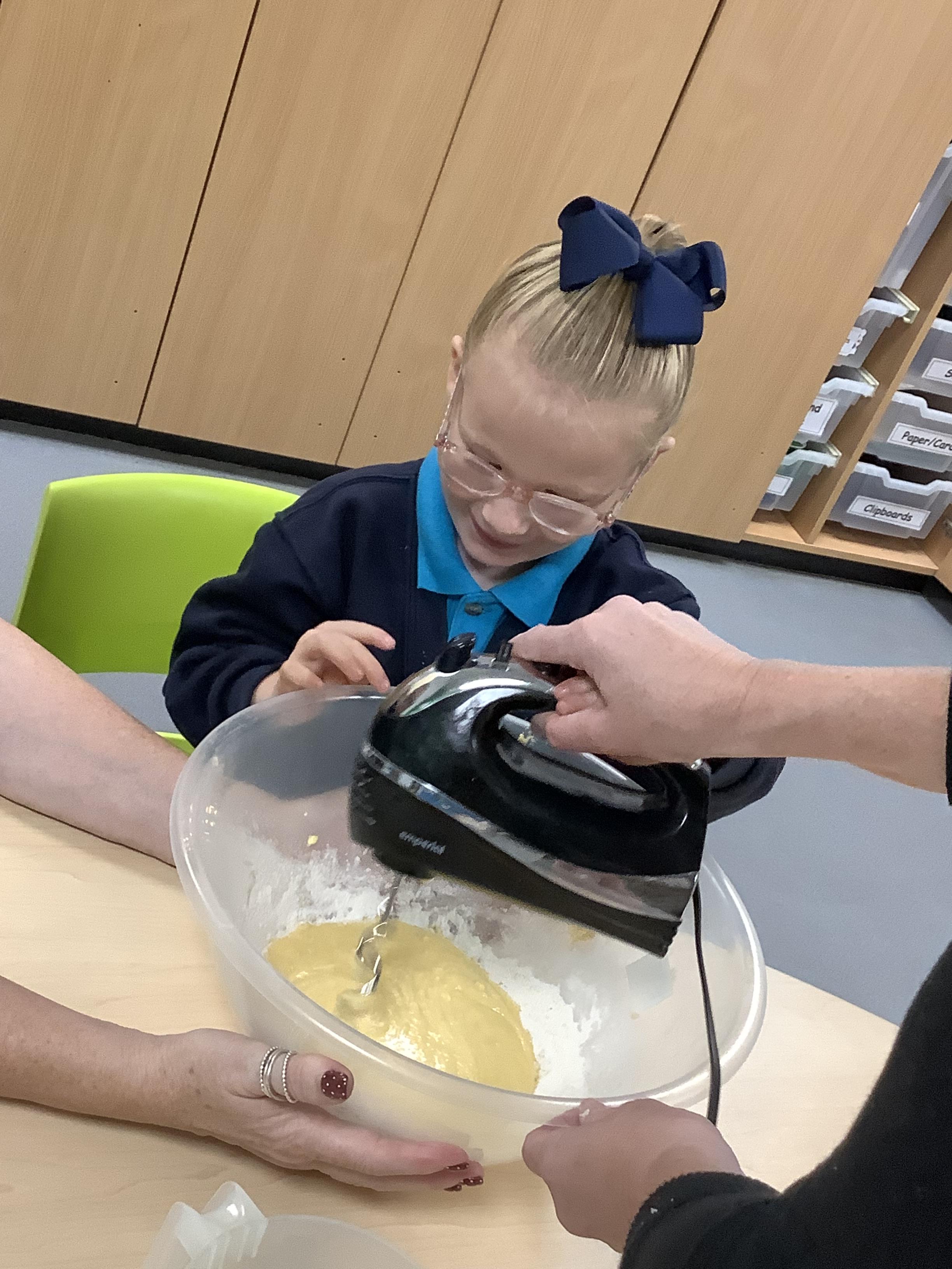 24.09.25 LITERACY/COMPUTING: We have been making cupcakes this morning. All the children listened carefully and followed instructions. They actively helped to weigh out the ingredients, crack the eggs, pour the ingredients in to the bowl etc. The children loved helping their teacher to mix up the cake mixture using an electric whisk.