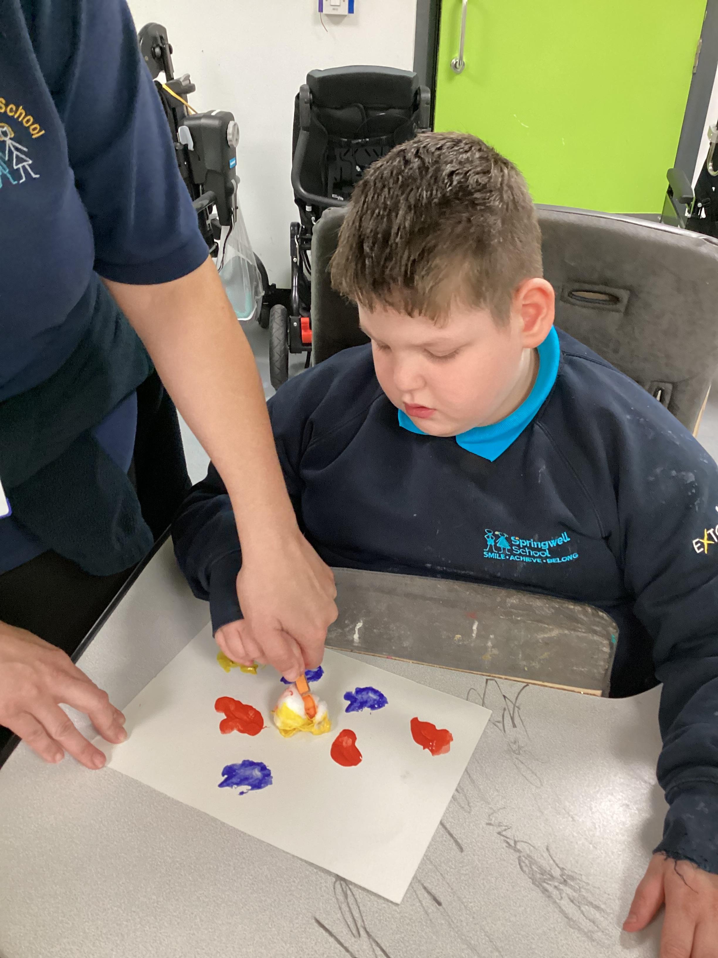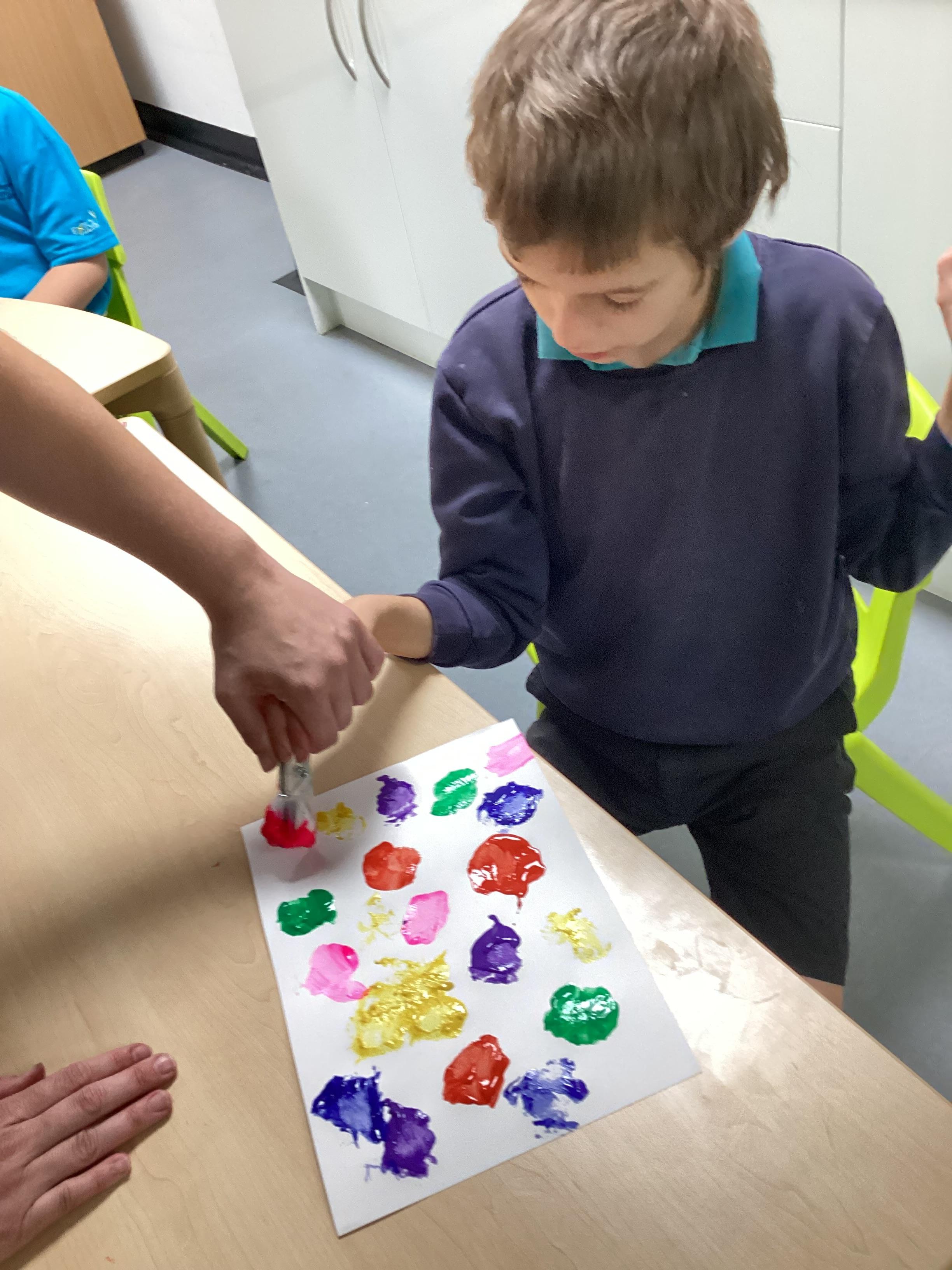 11.09.25 MUSIC & ART We have been singing the song: 'I can sing a rainbow'. We have been identifying the colours in the rainbow. Then the children painted a picture using these colours, with pegs attached to cotton wool balls.