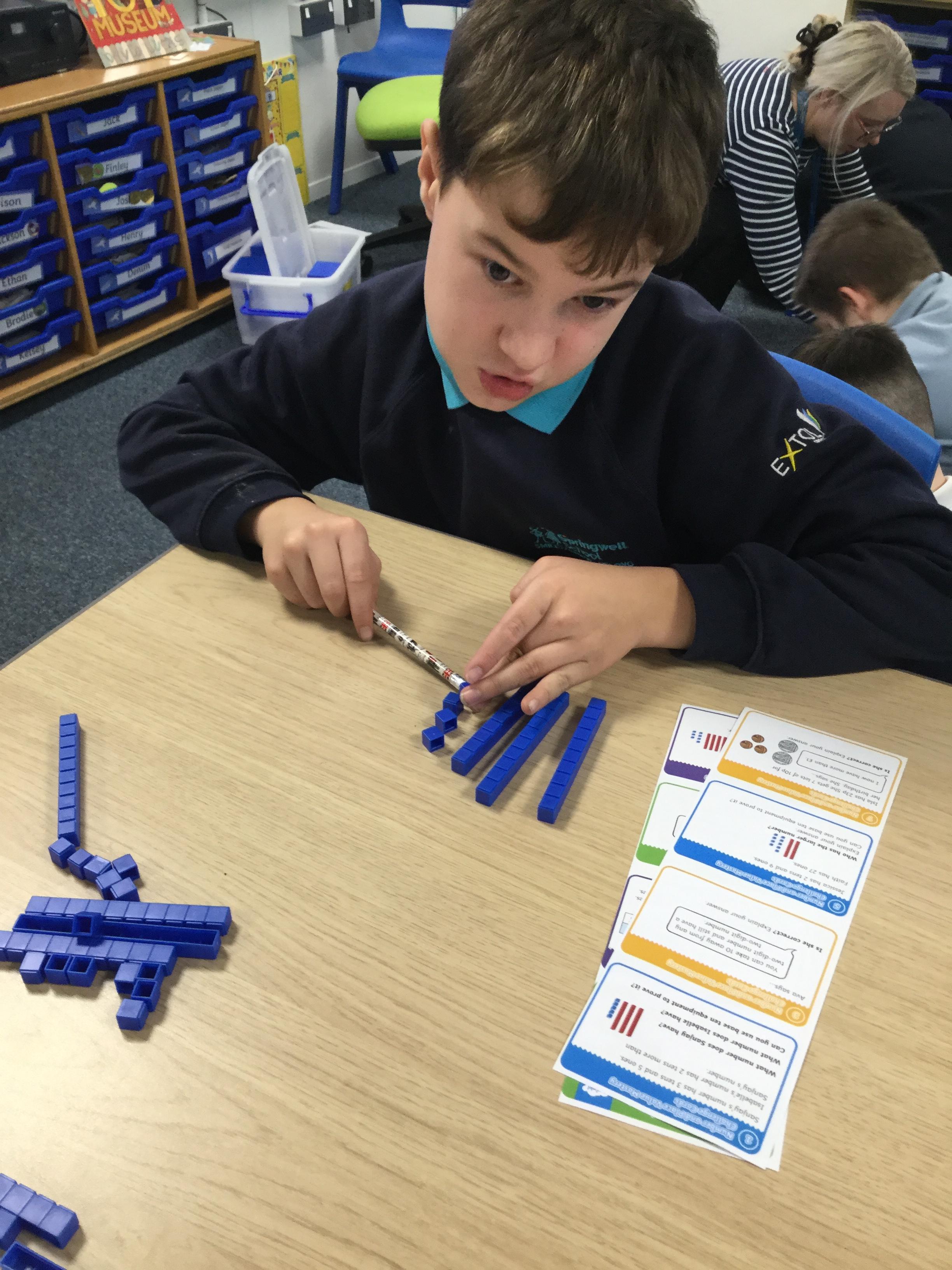 We have been working on our understanding of place value and using Base 10 to make numbers up to 100. We made comparisons to find the greater number.