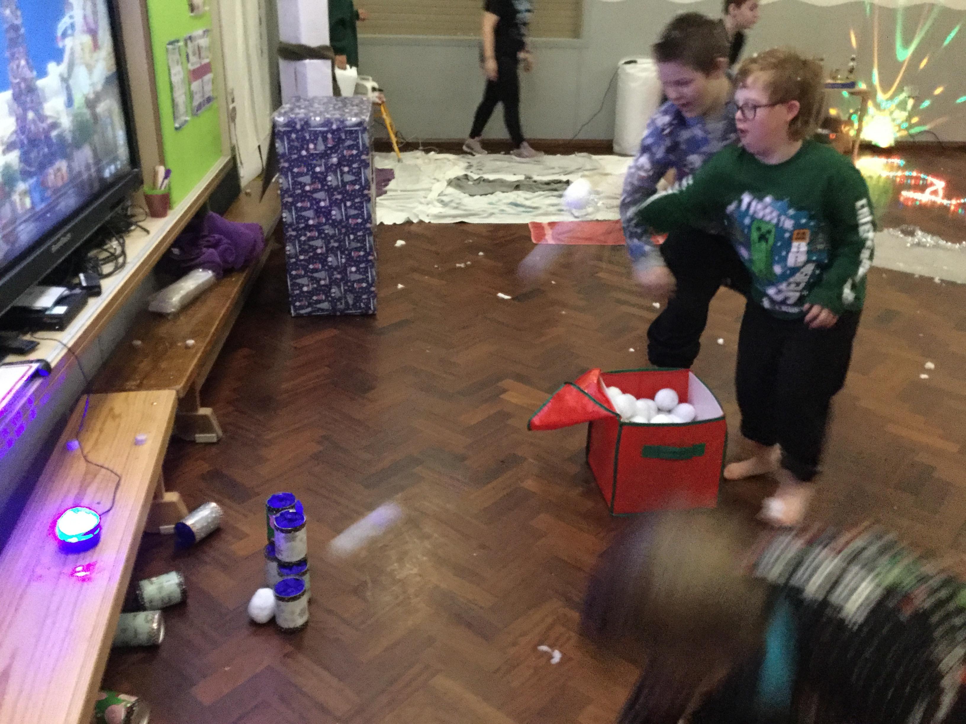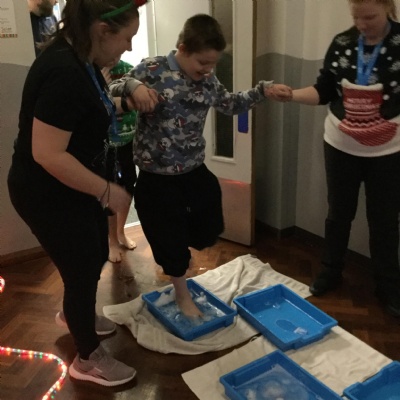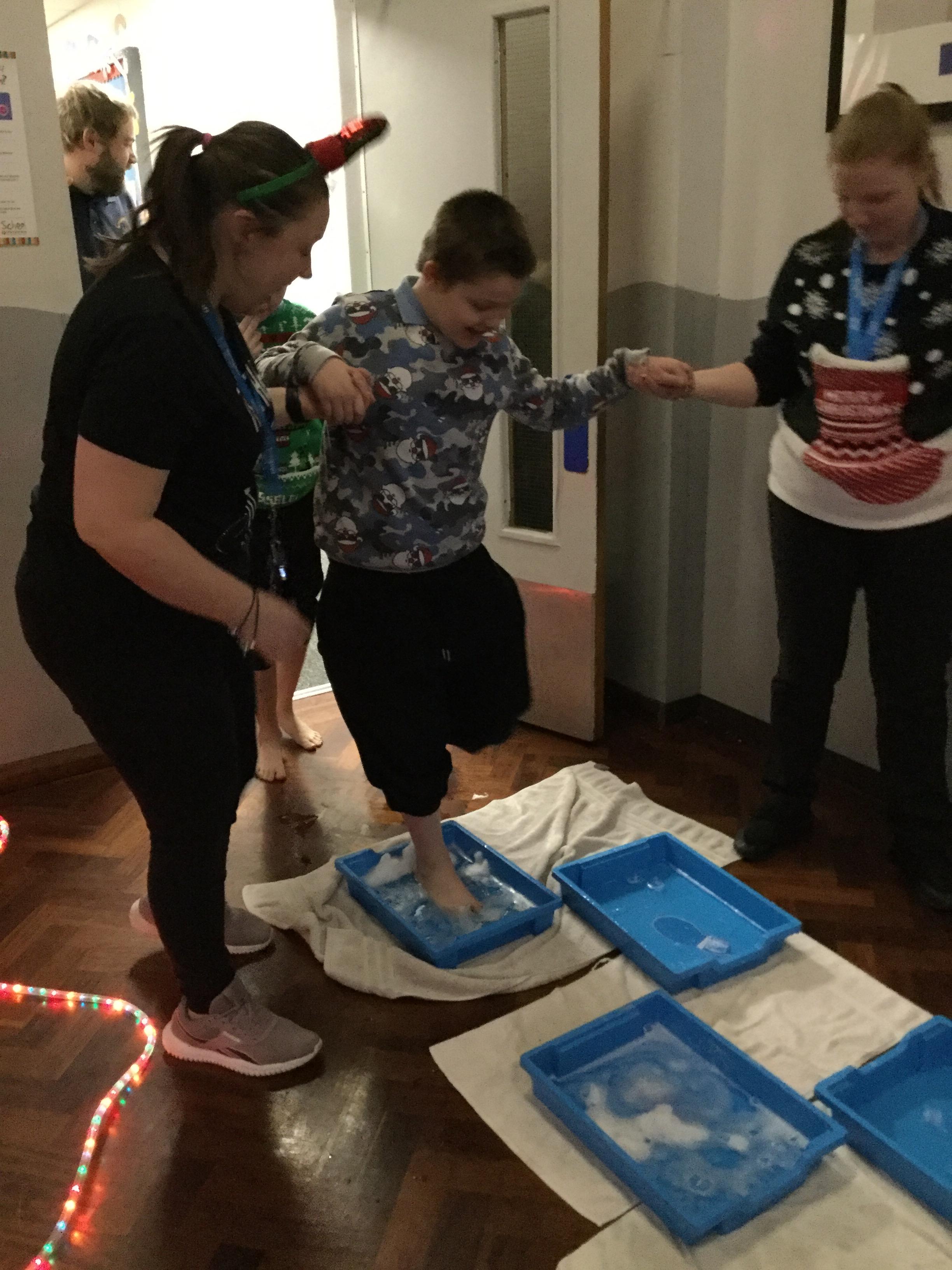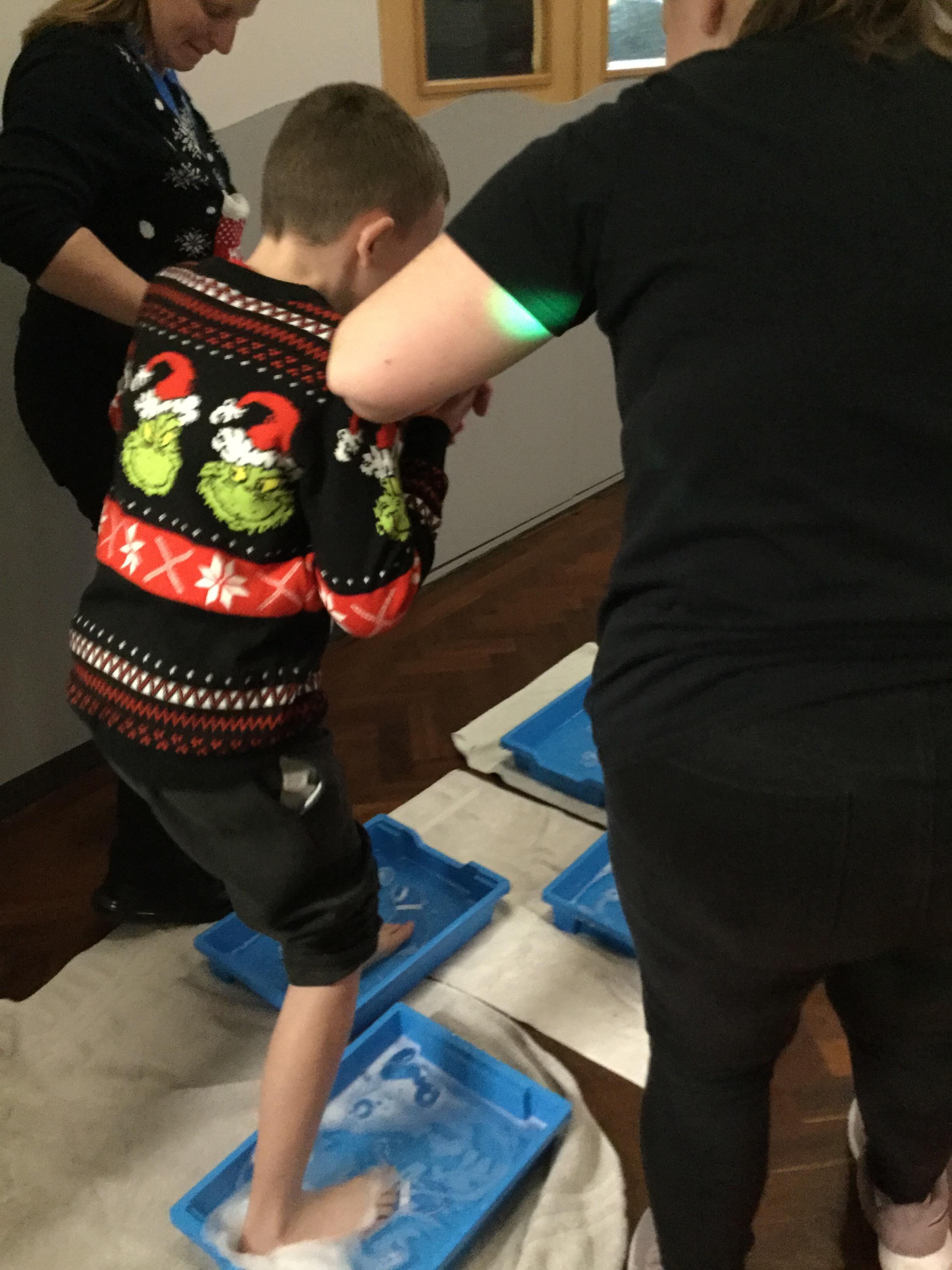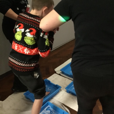 We took part Christmas activities which included some sensory experiences. We loved stepping into the icy cold trays and dancing in the snow foam. We took part in a treasure hunt to win a prize and practised our snowball throwing skills by knocking down cans. At the end, we created a special decoration which we could take home.