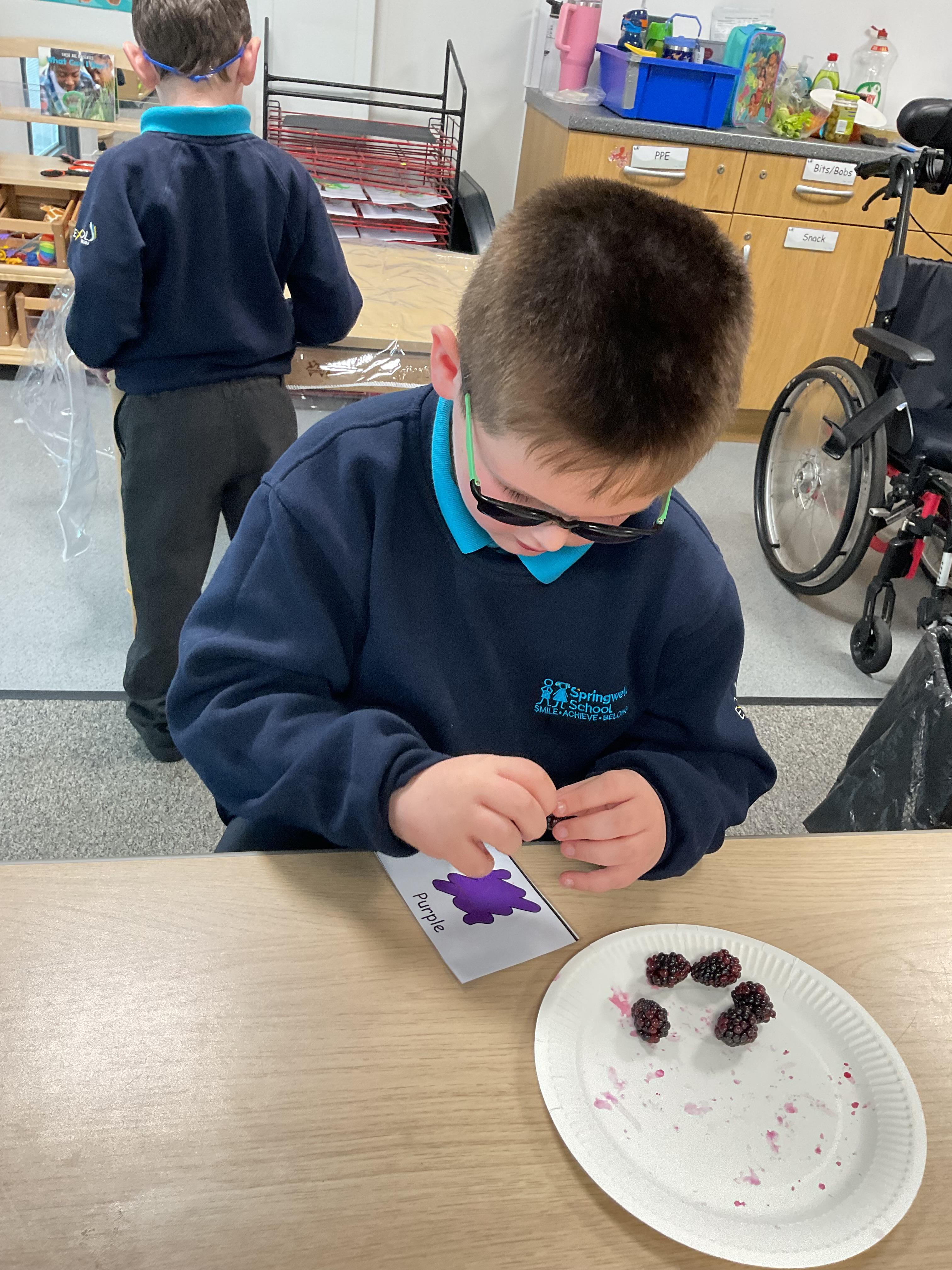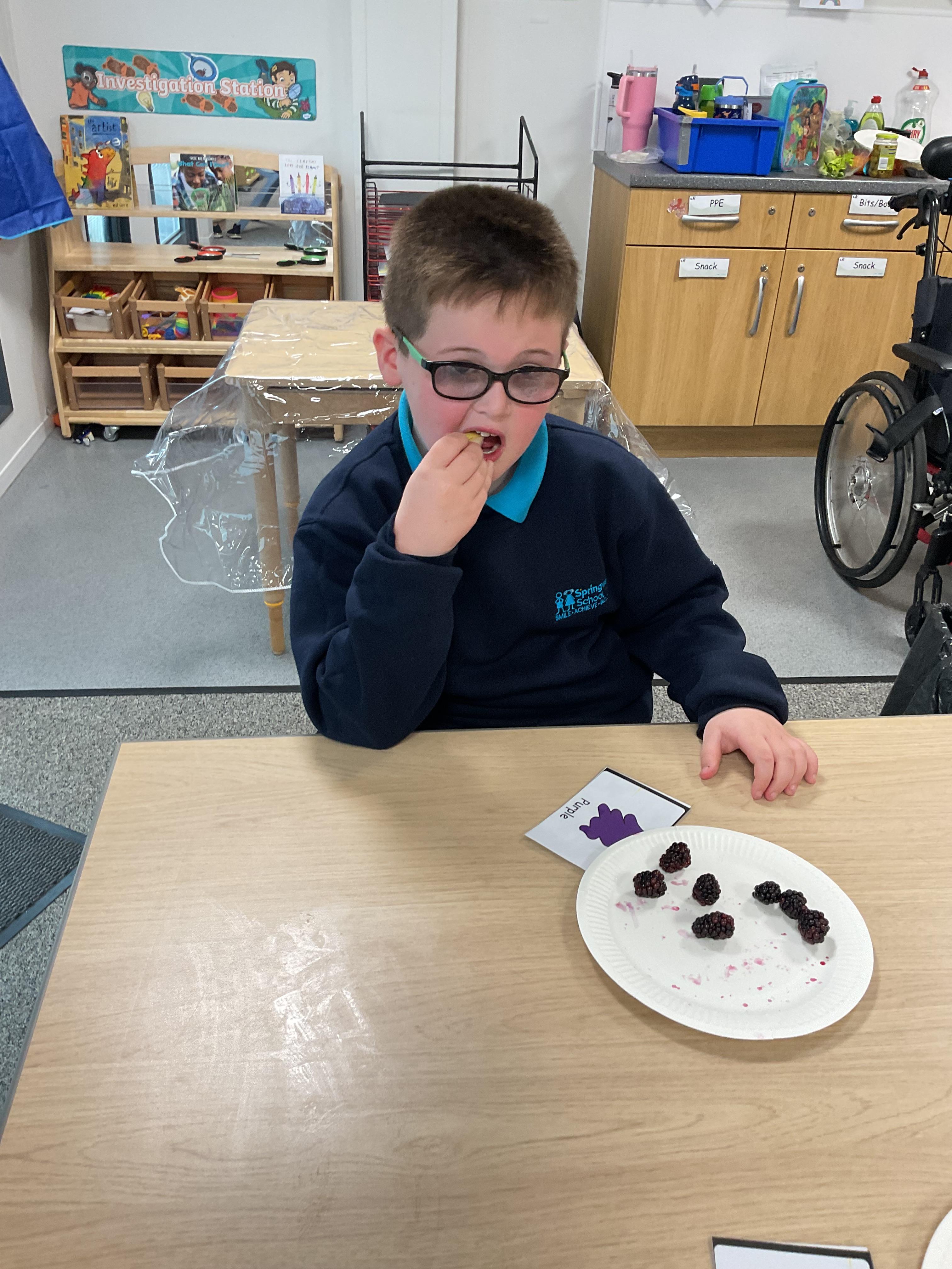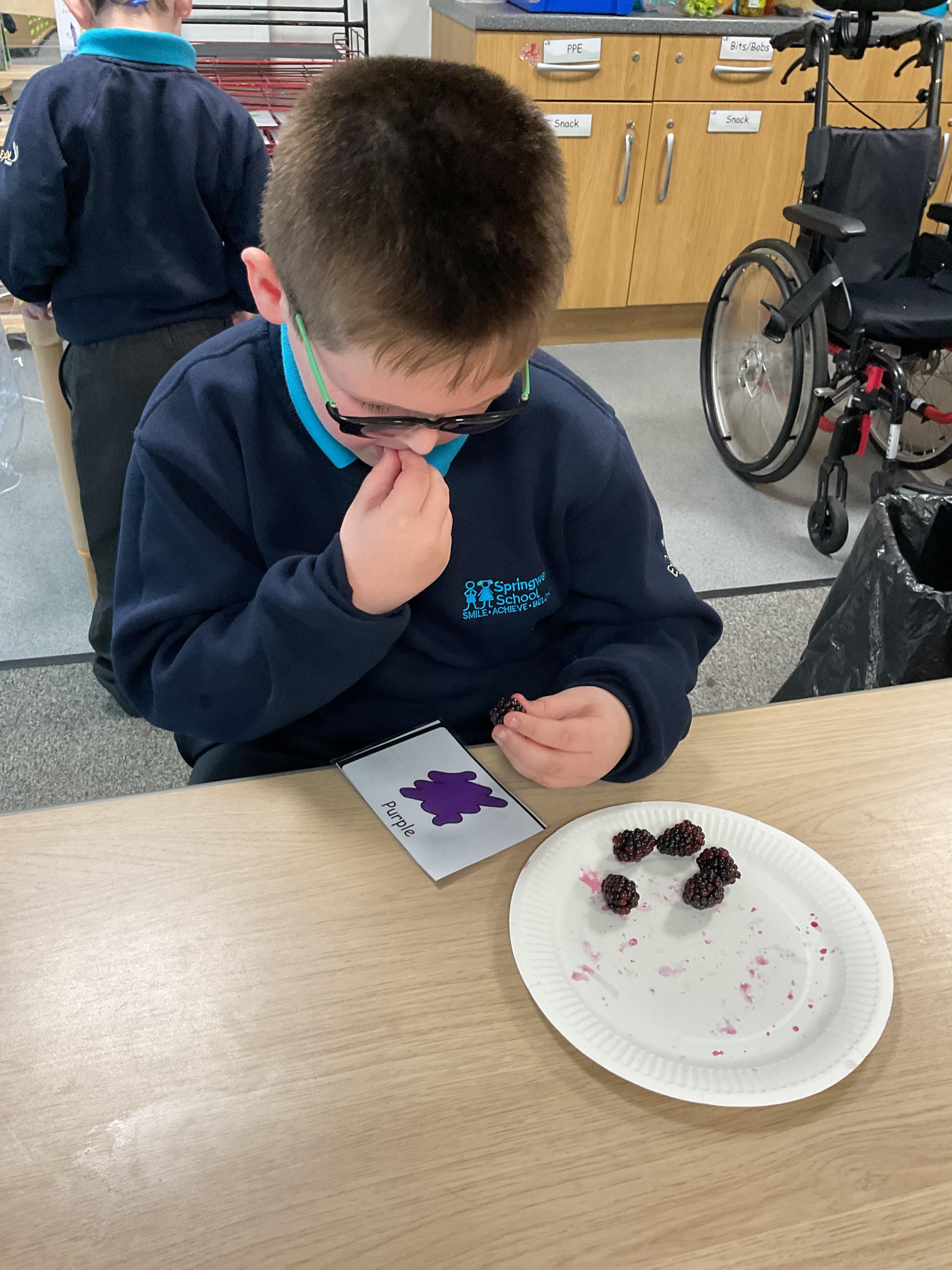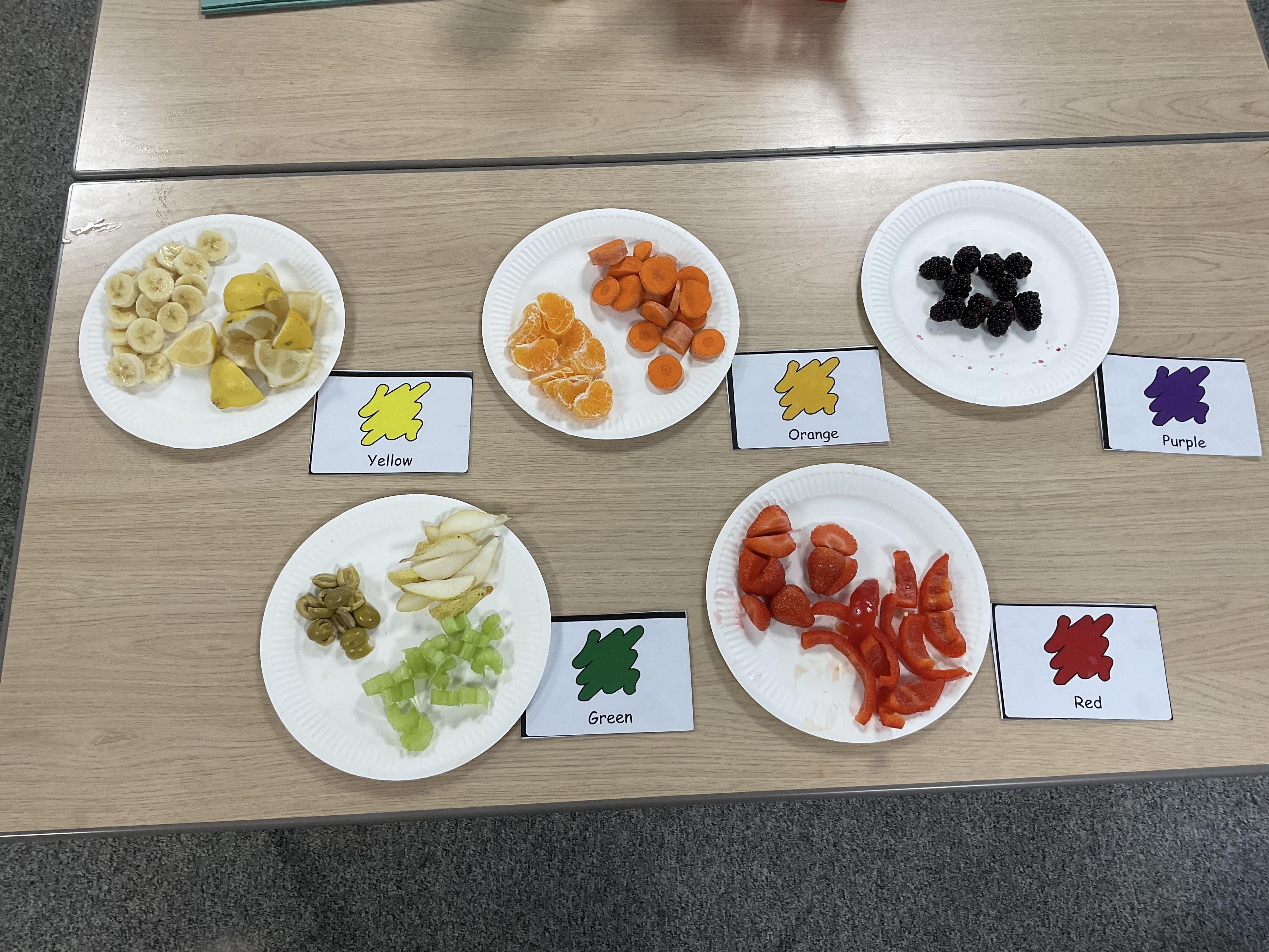 As part of our story 'Which Food Will You Choose?', we tried some different coloured foods. We made choices and expressed our likes and dislikes for the different foods. Blackberries were very popular!