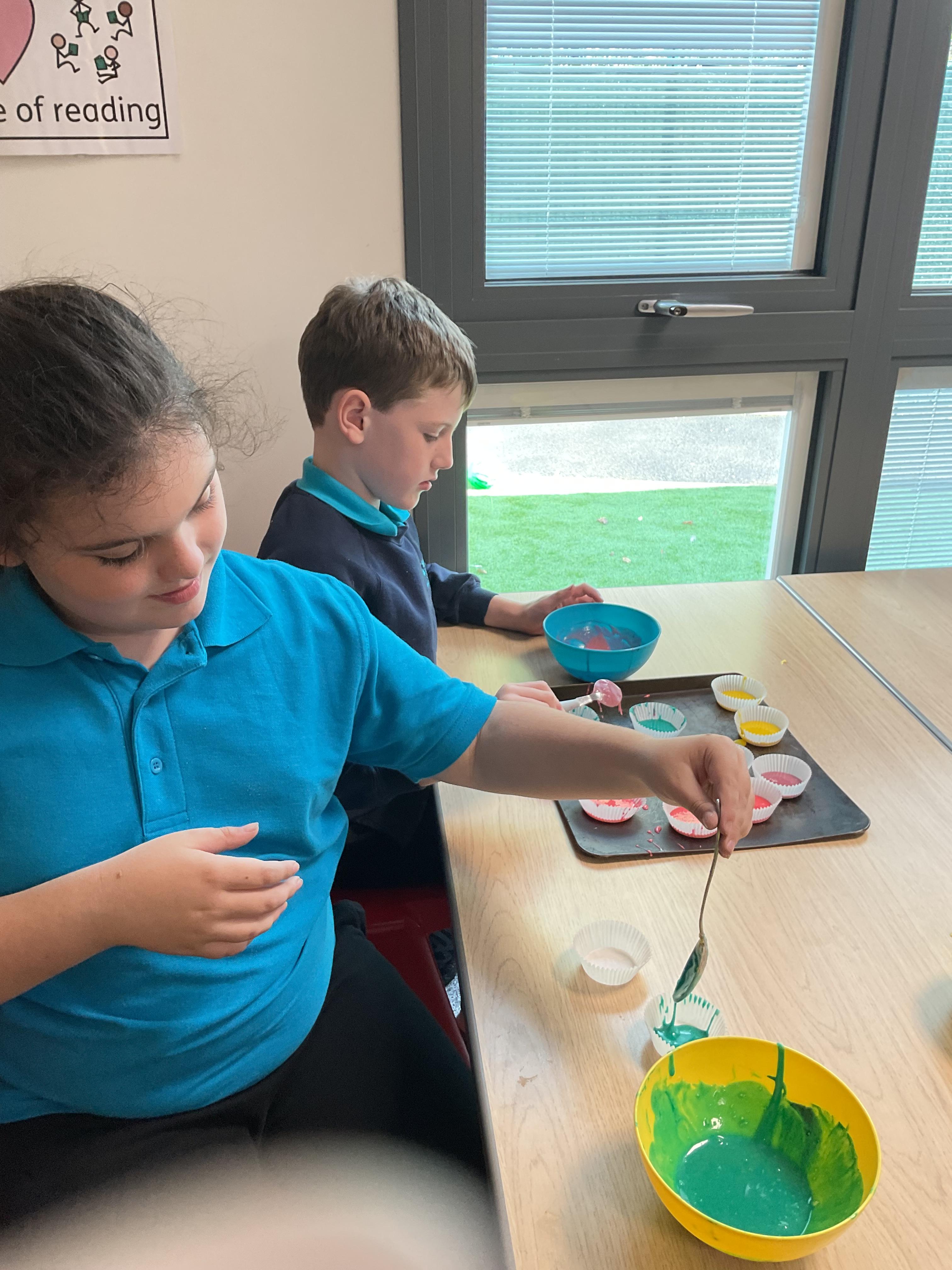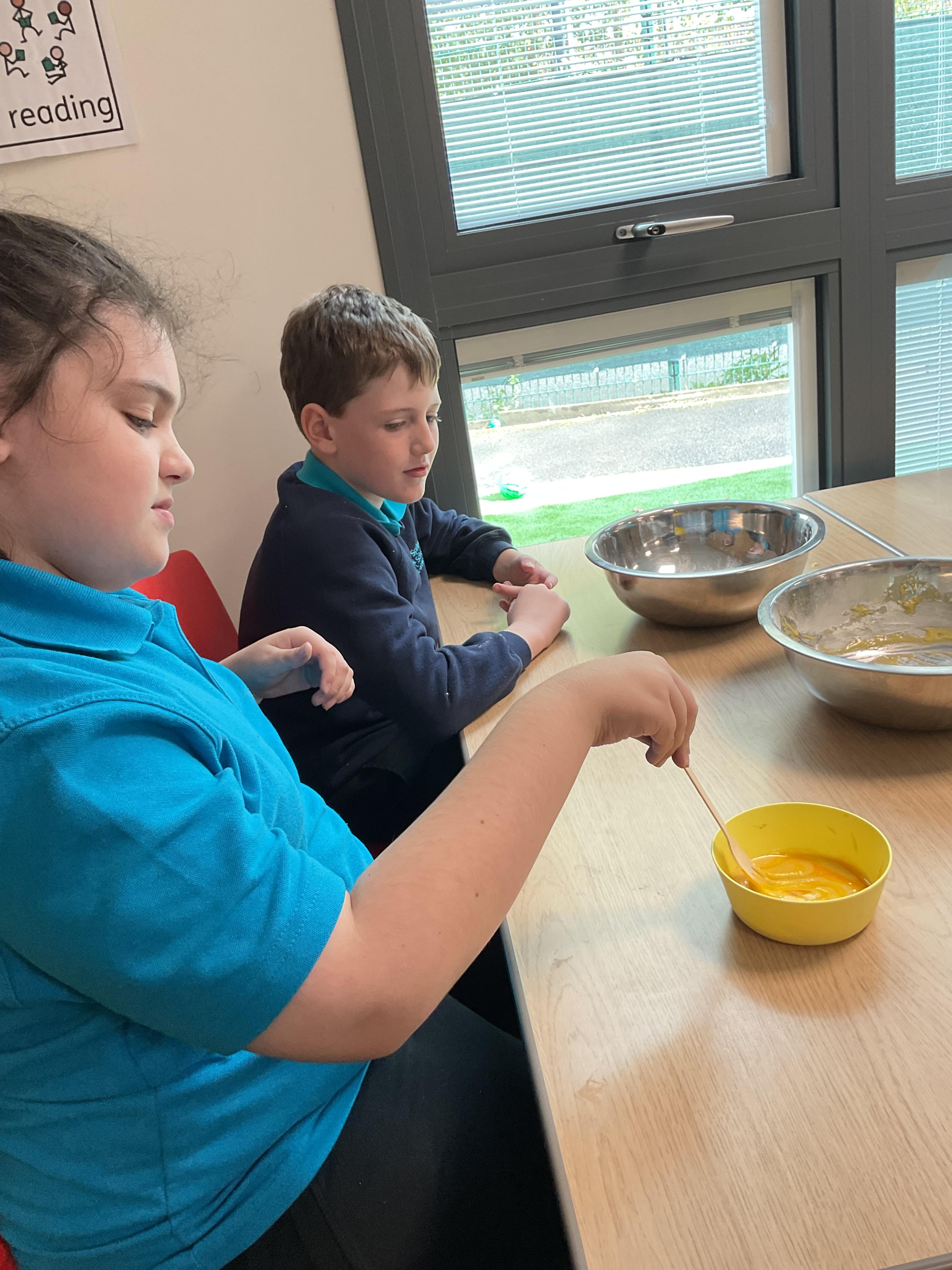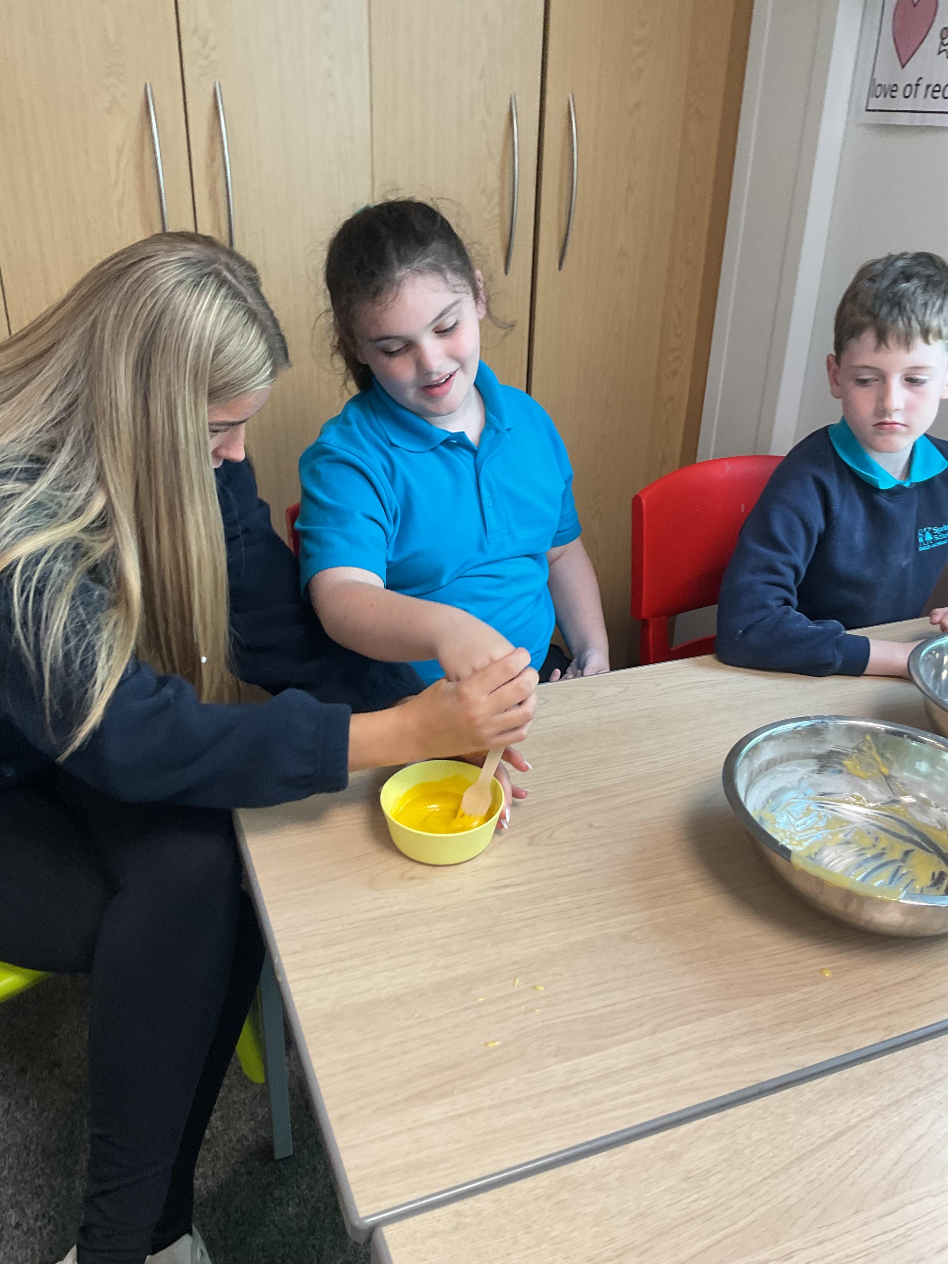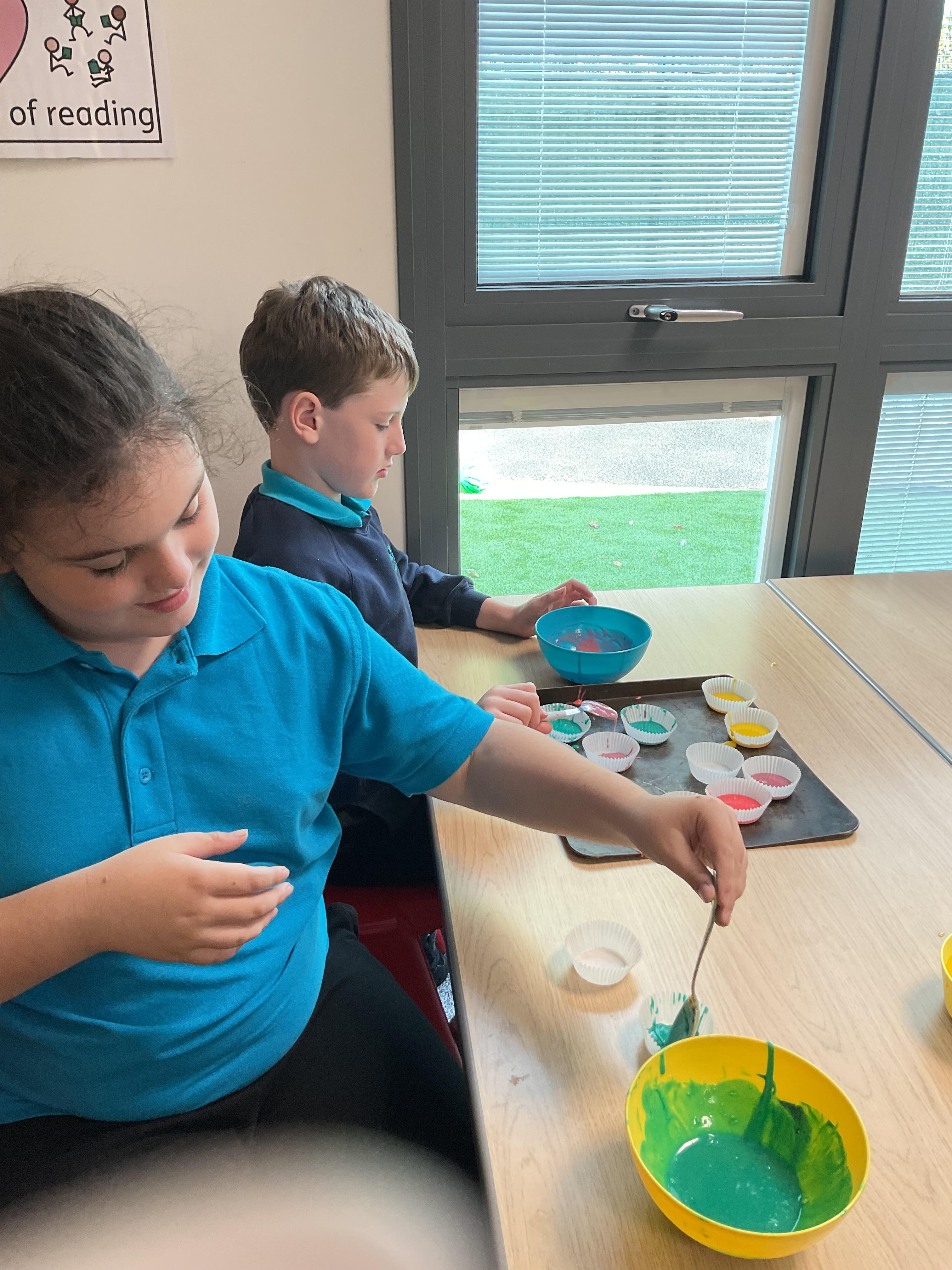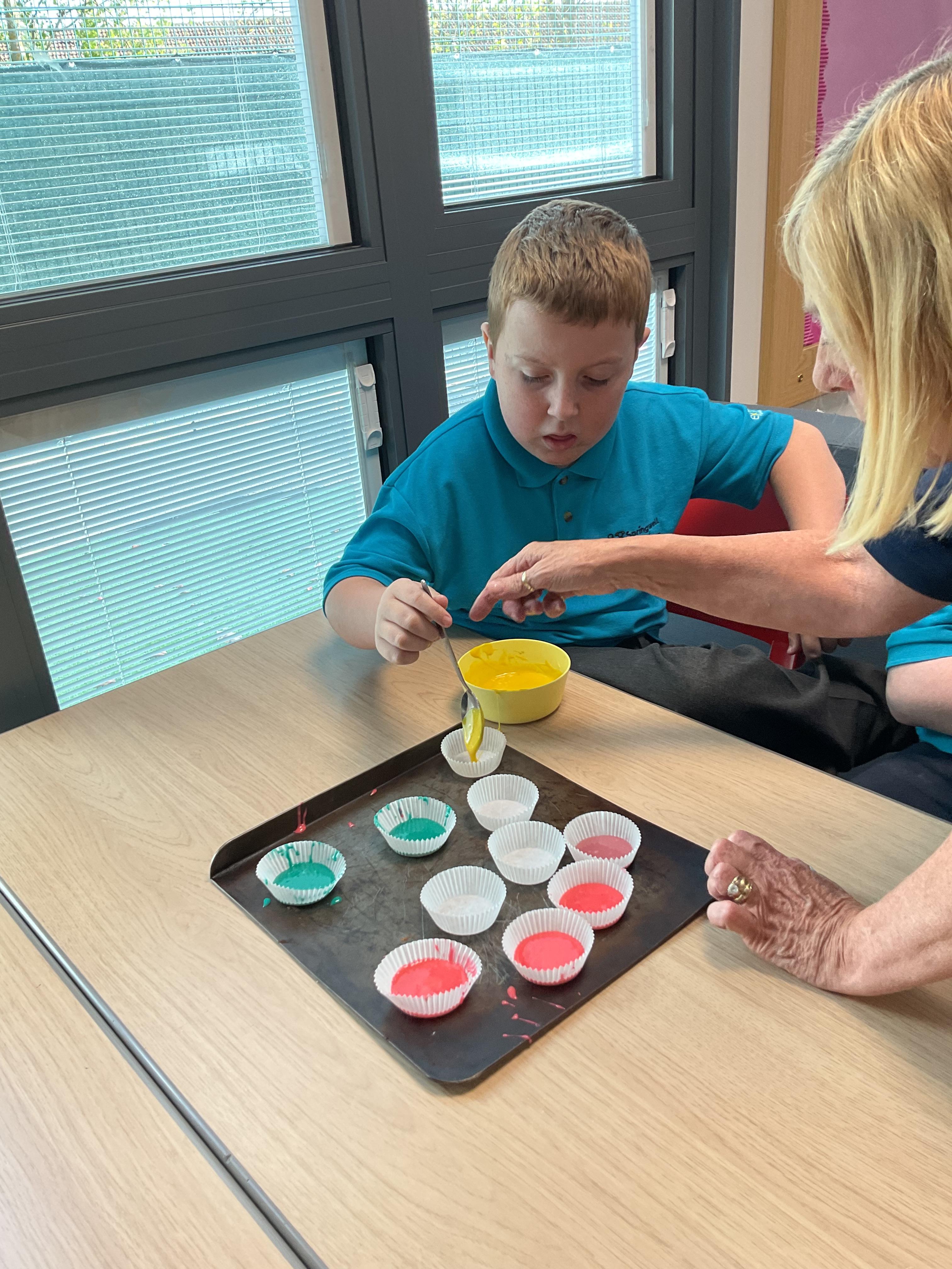 Pandas enjoyed DT with Annette this week. They worked together to make rainbow cakes by measuring out the ingredients and mixing them altogether.
