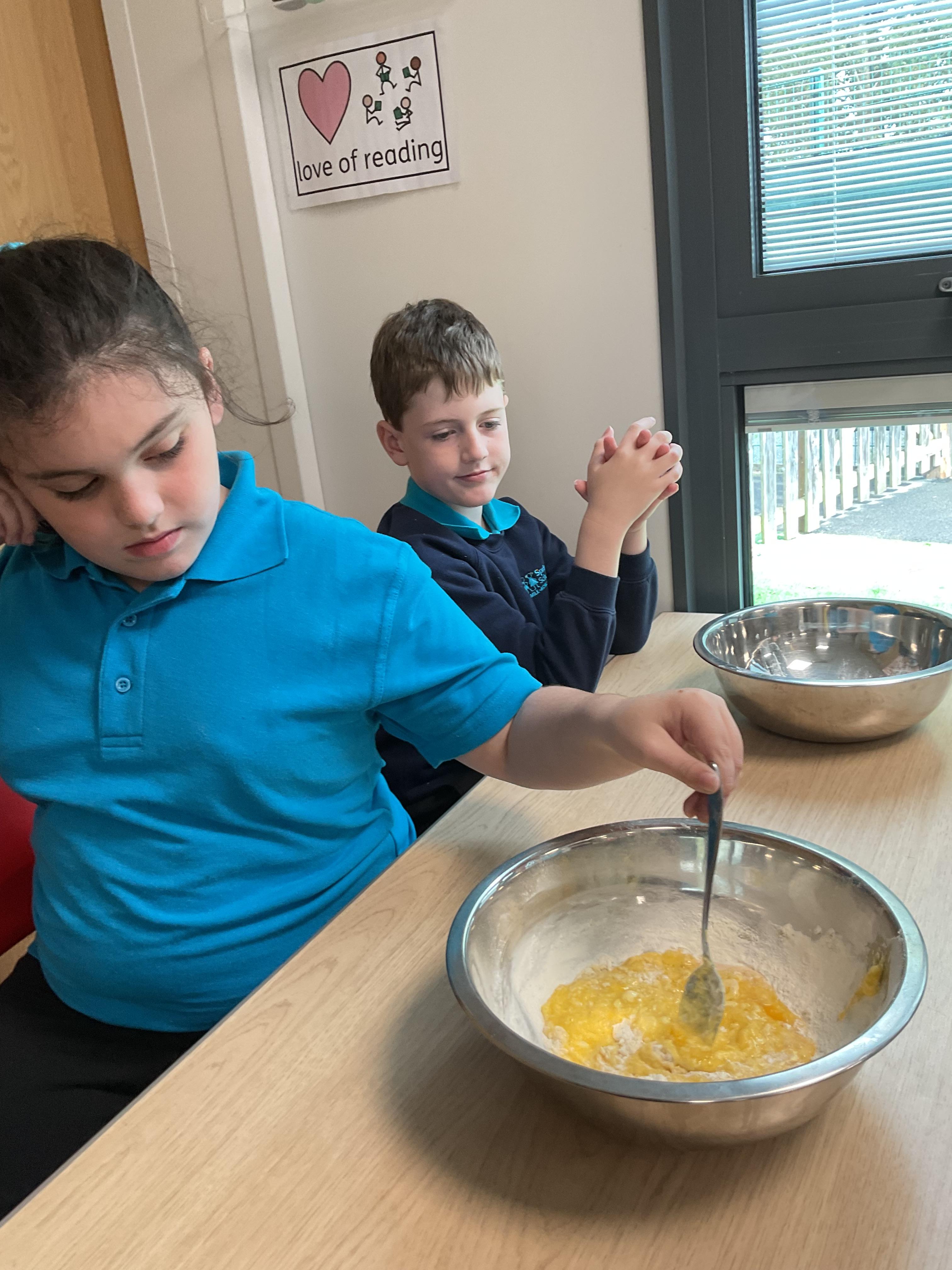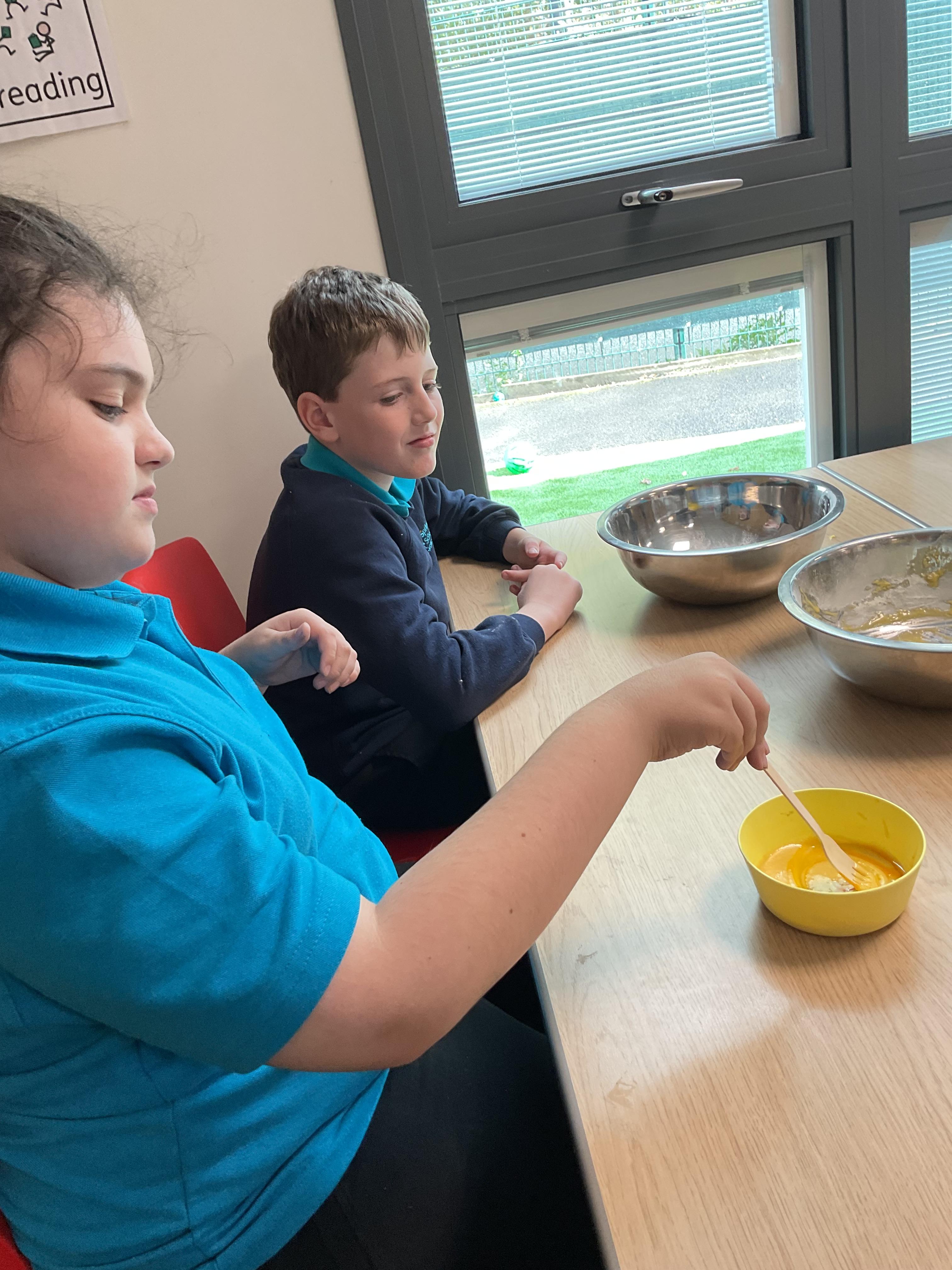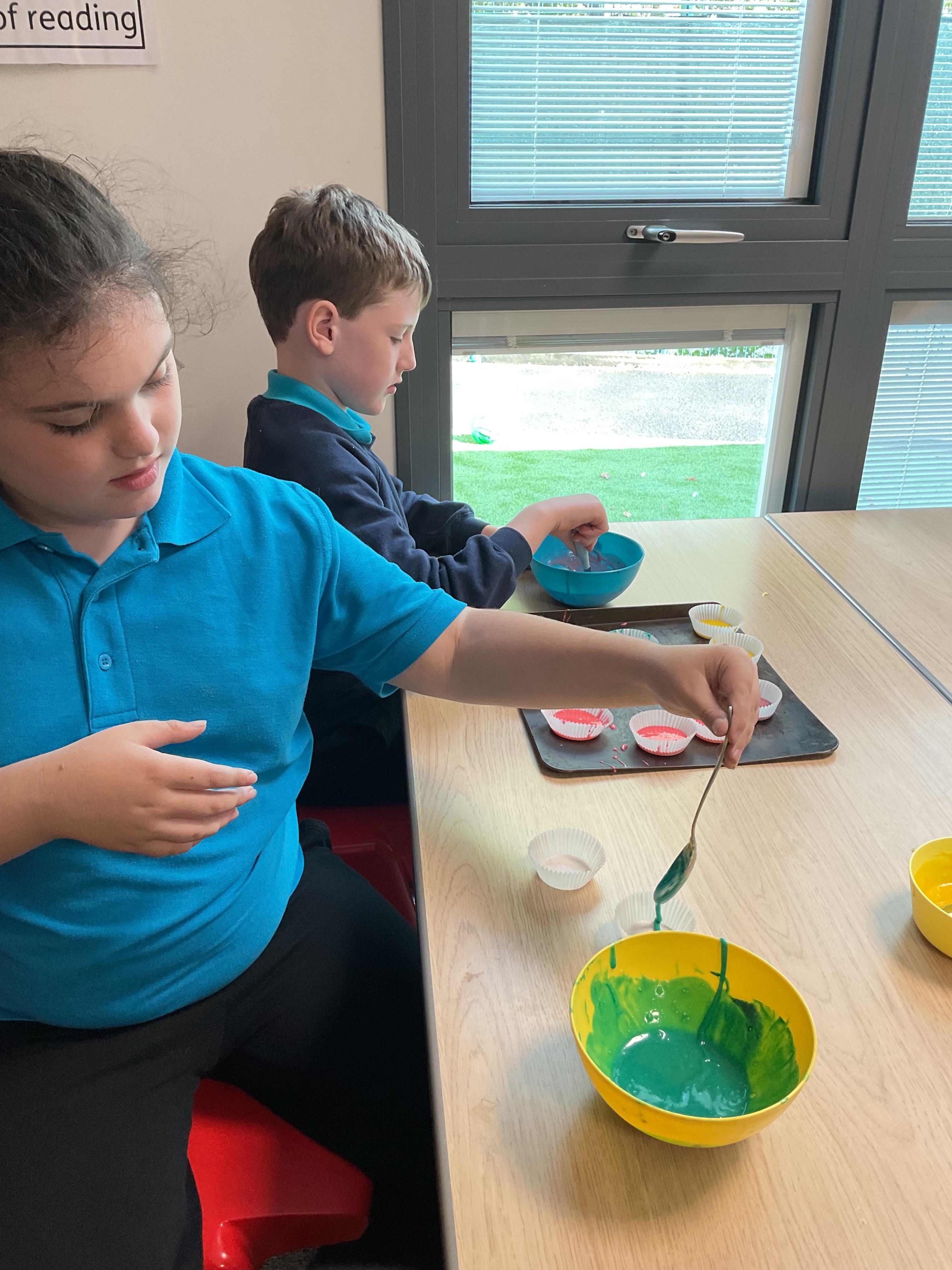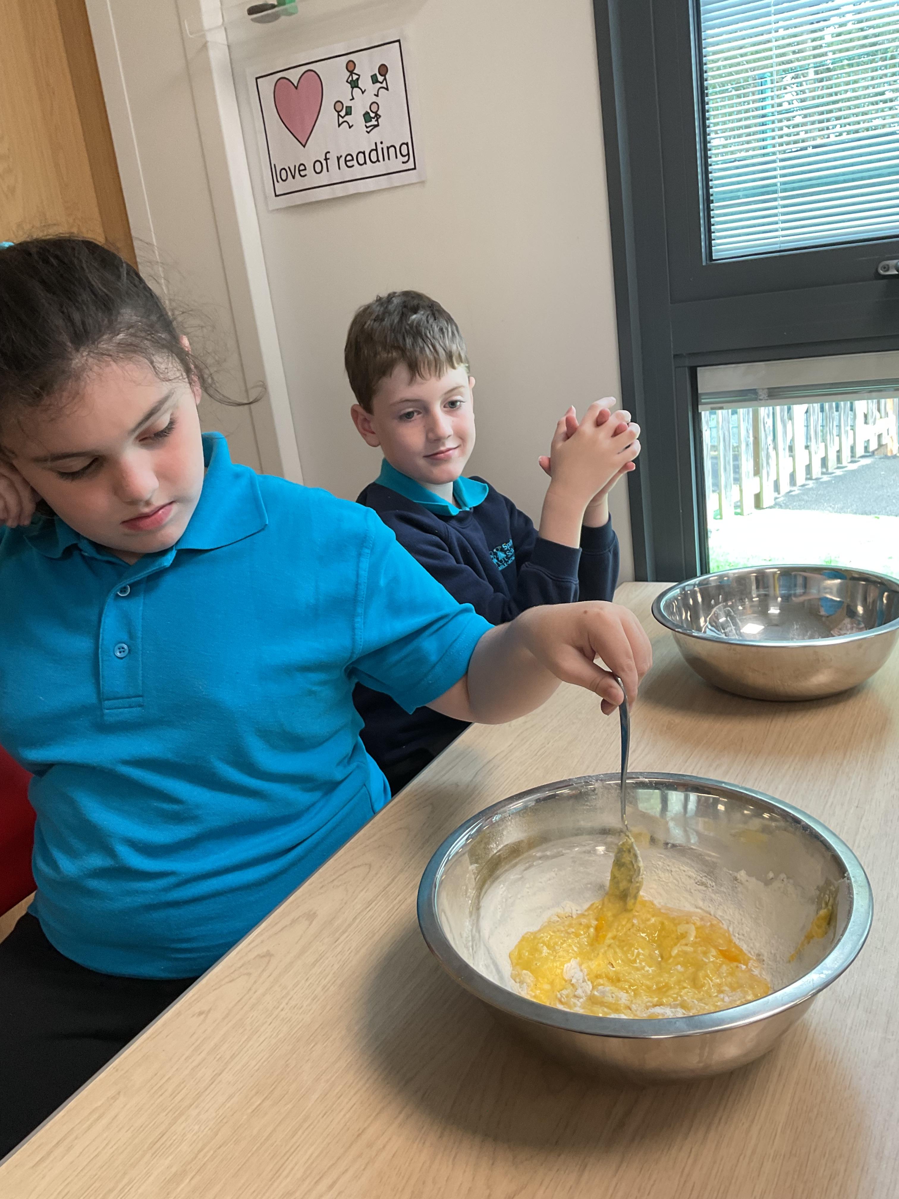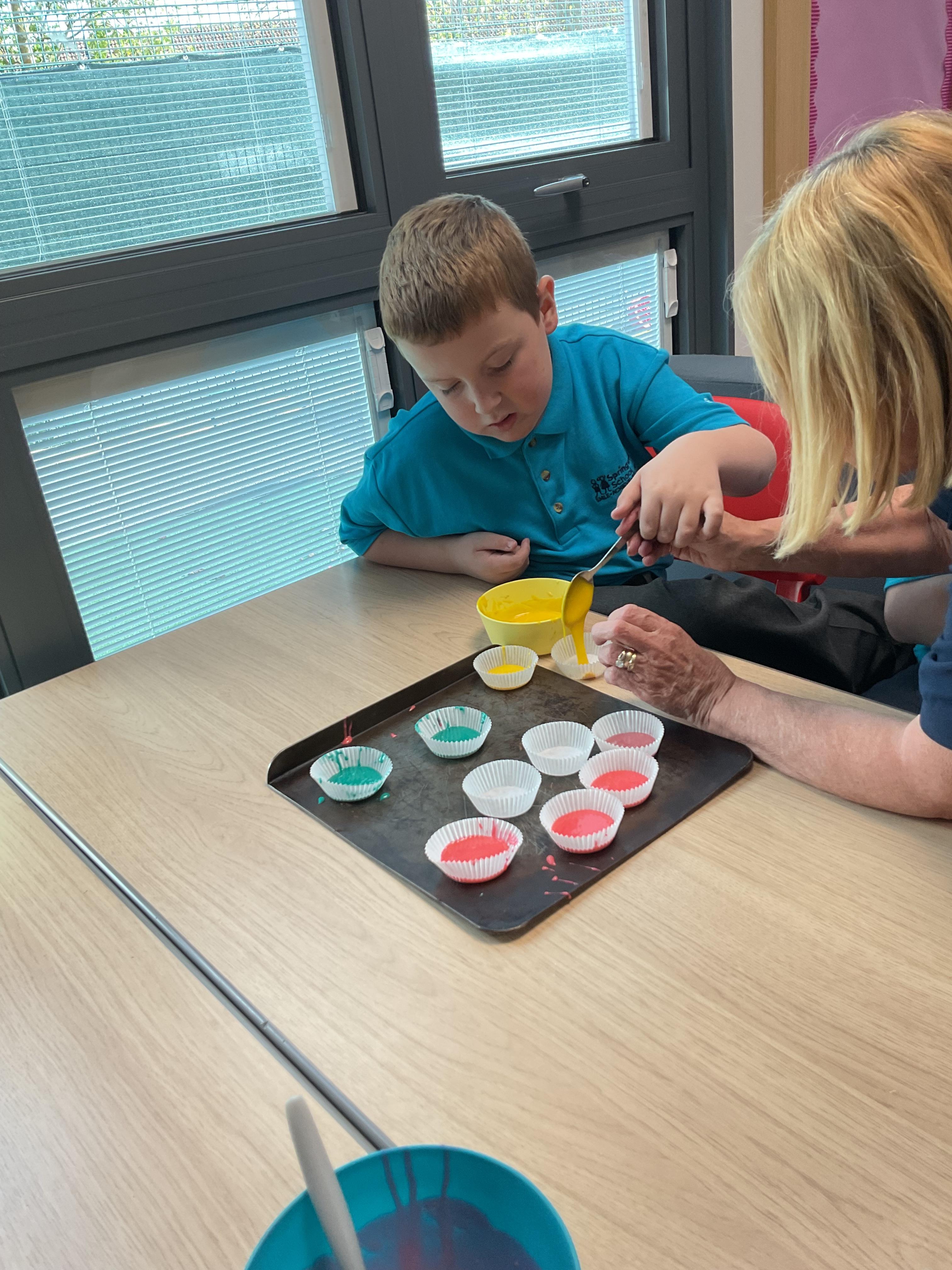 Pandas enjoyed DT with Annette this week. They worked together to make rainbow cakes by measuring out the ingredients and mixing them altogether.