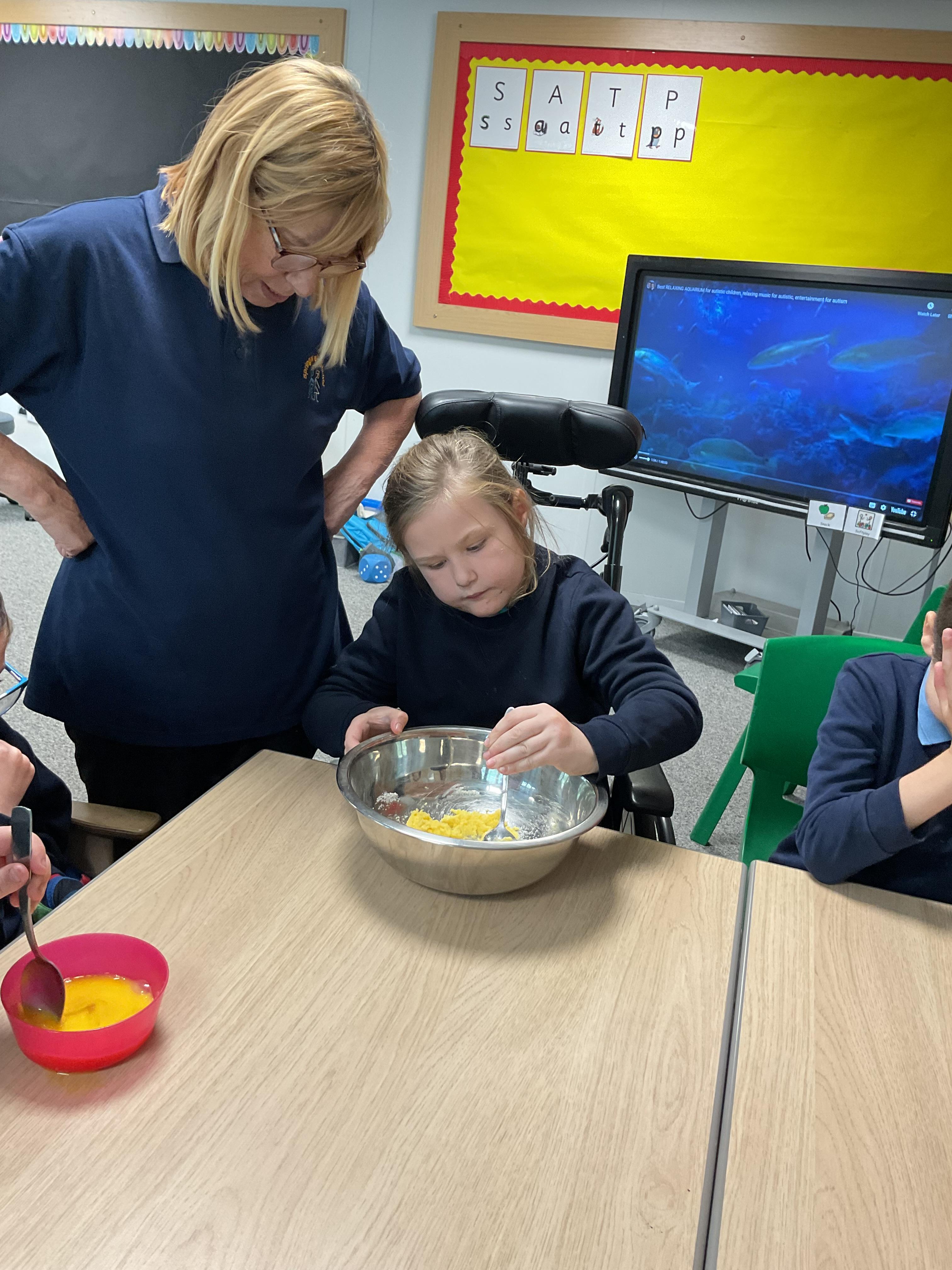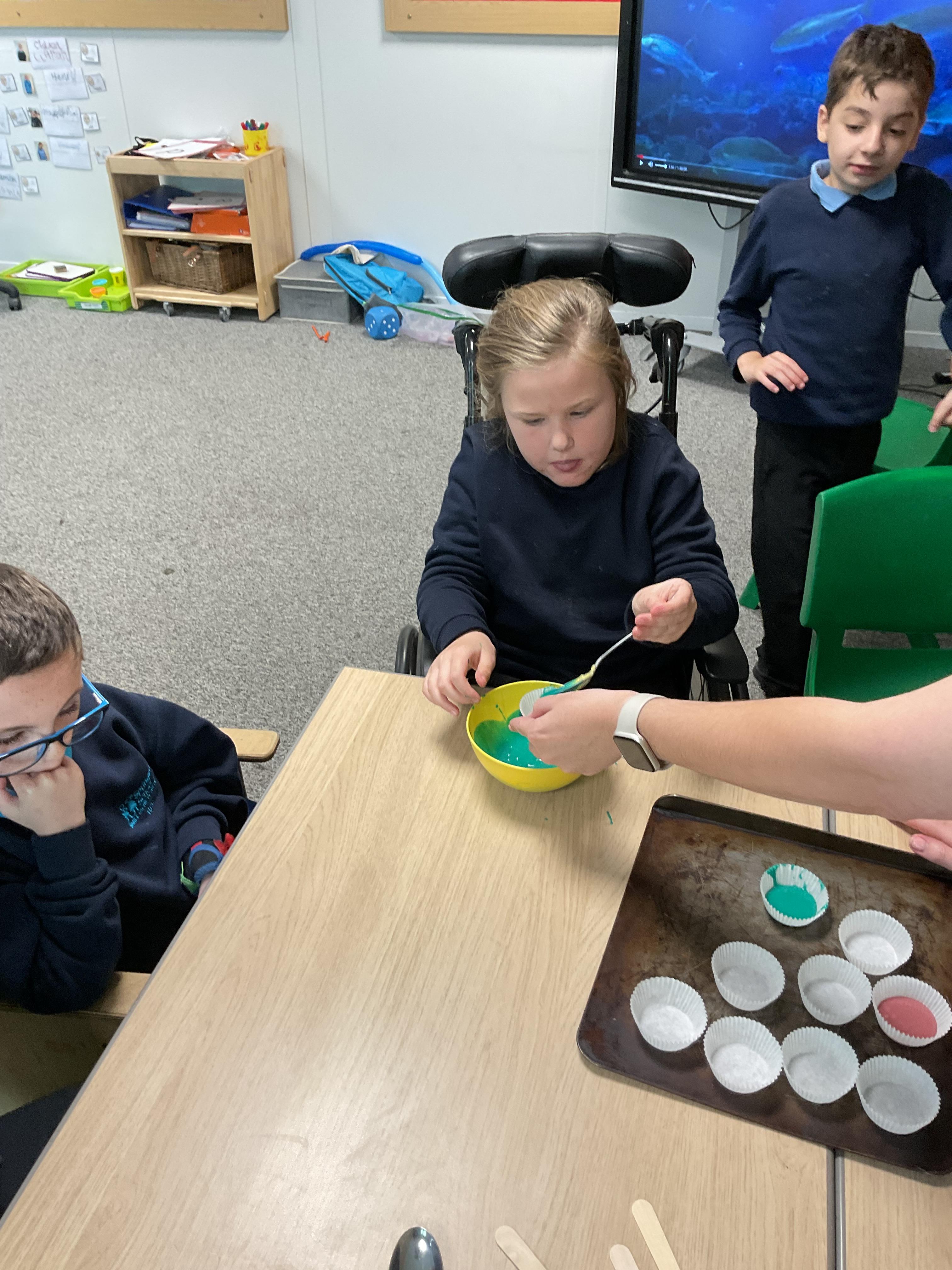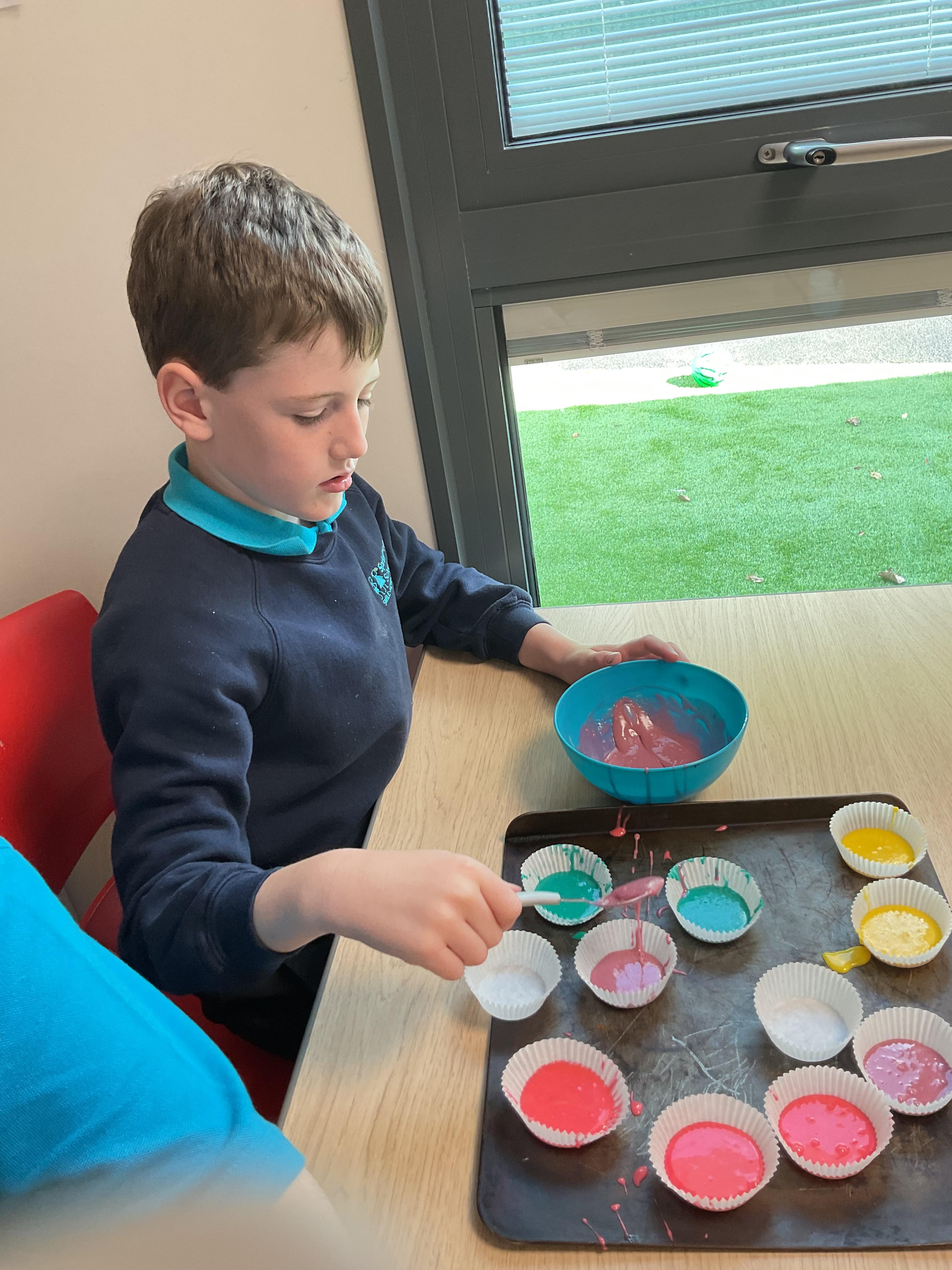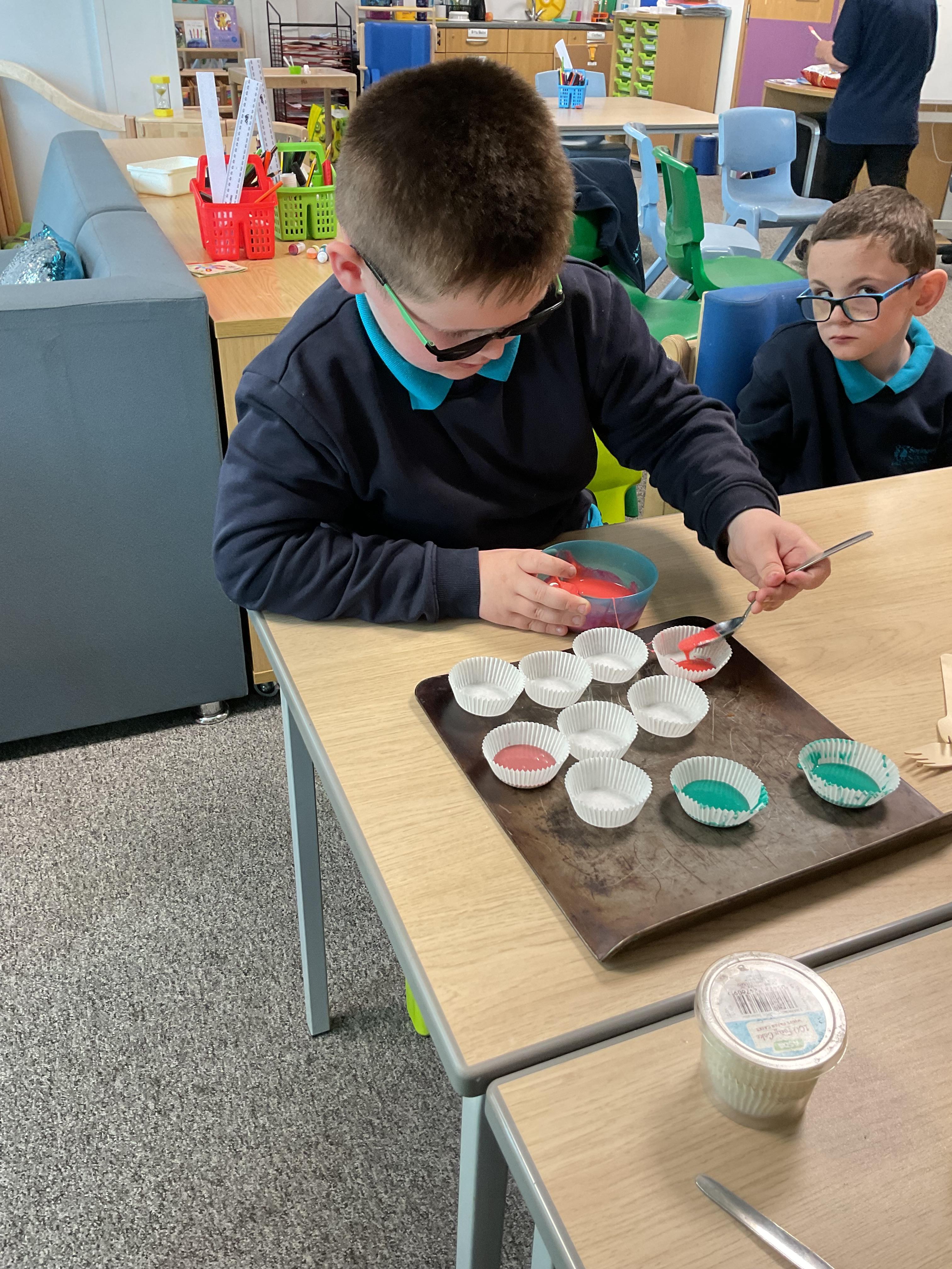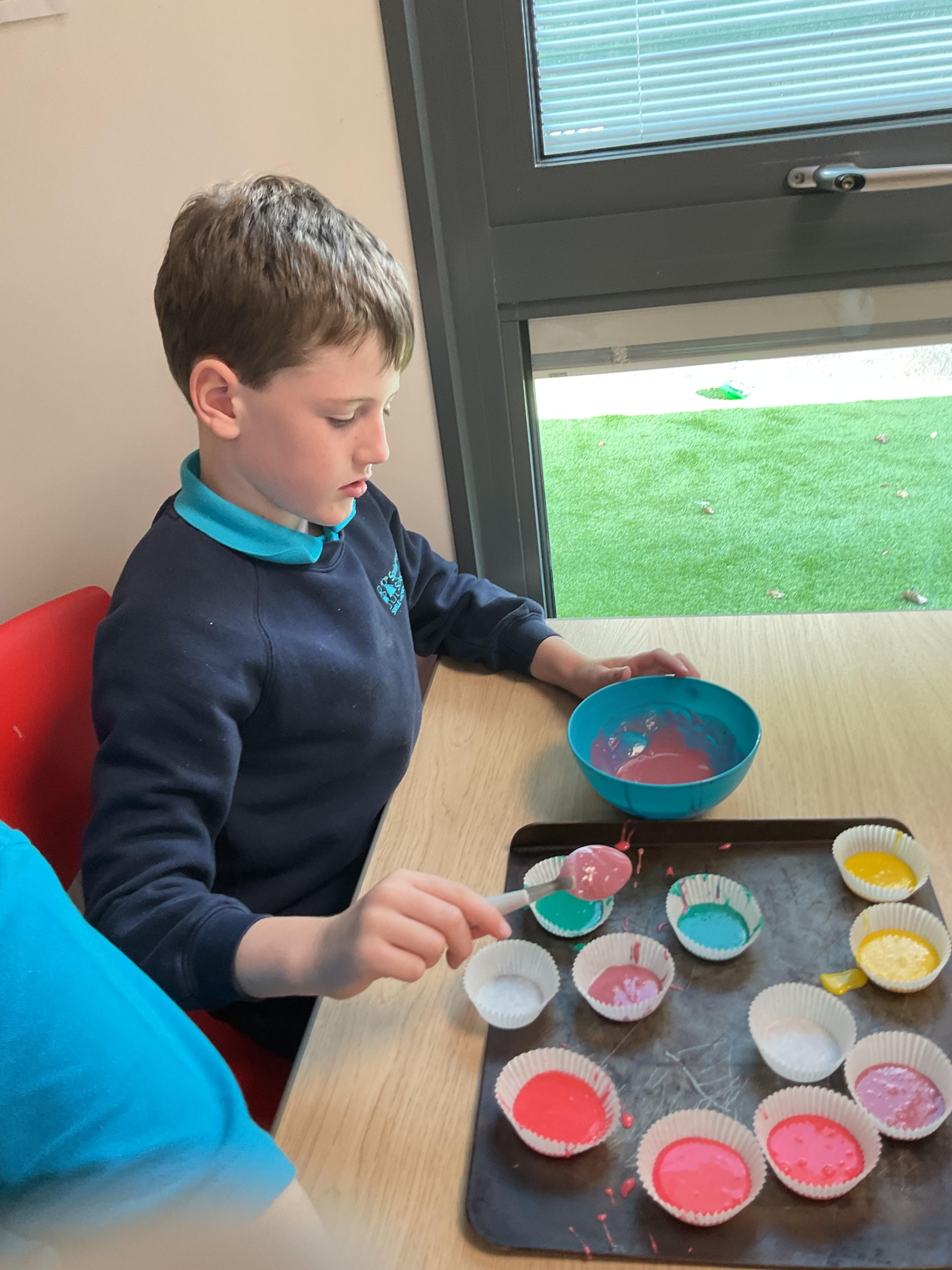Pandas enjoyed DT with Annette this week. They worked together to make rainbow cakes by measuring out the ingredients and mixing them altogether.