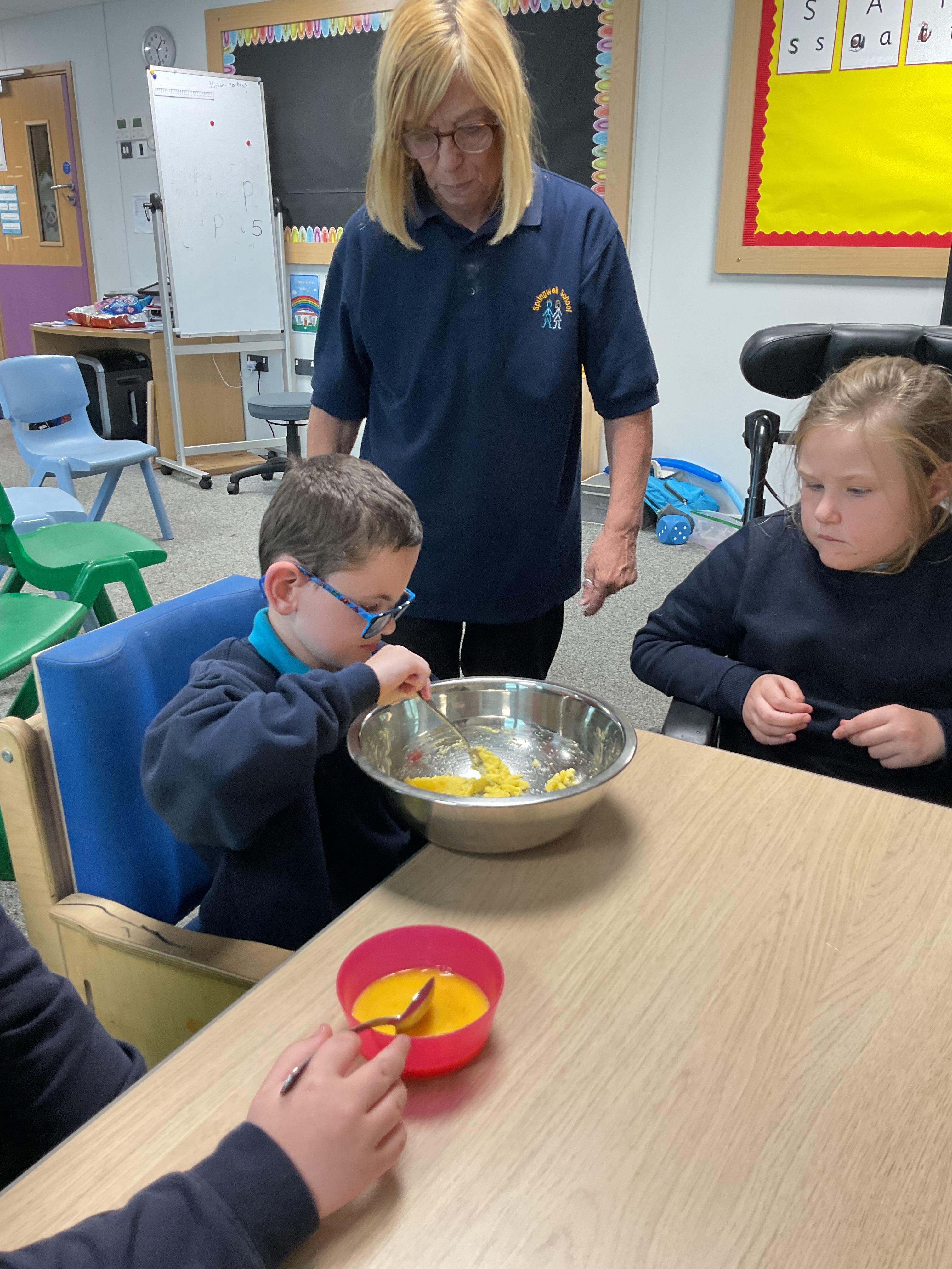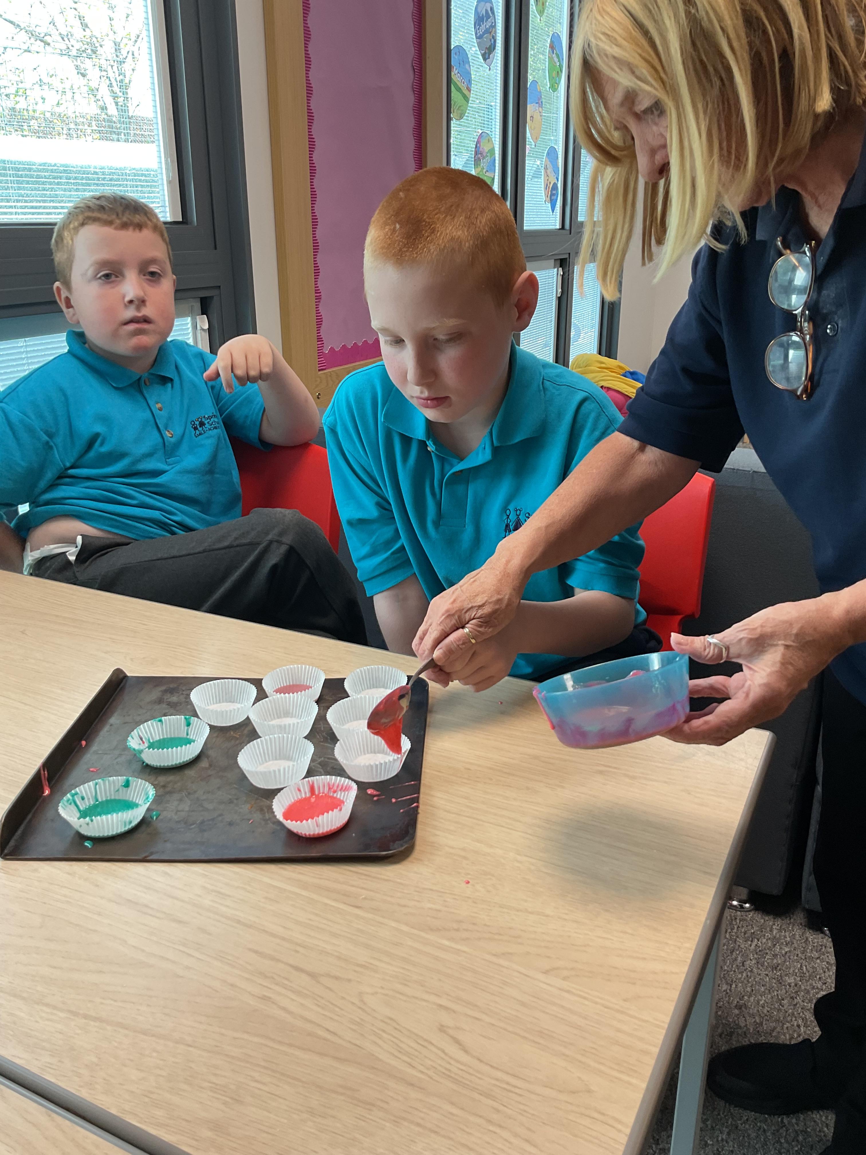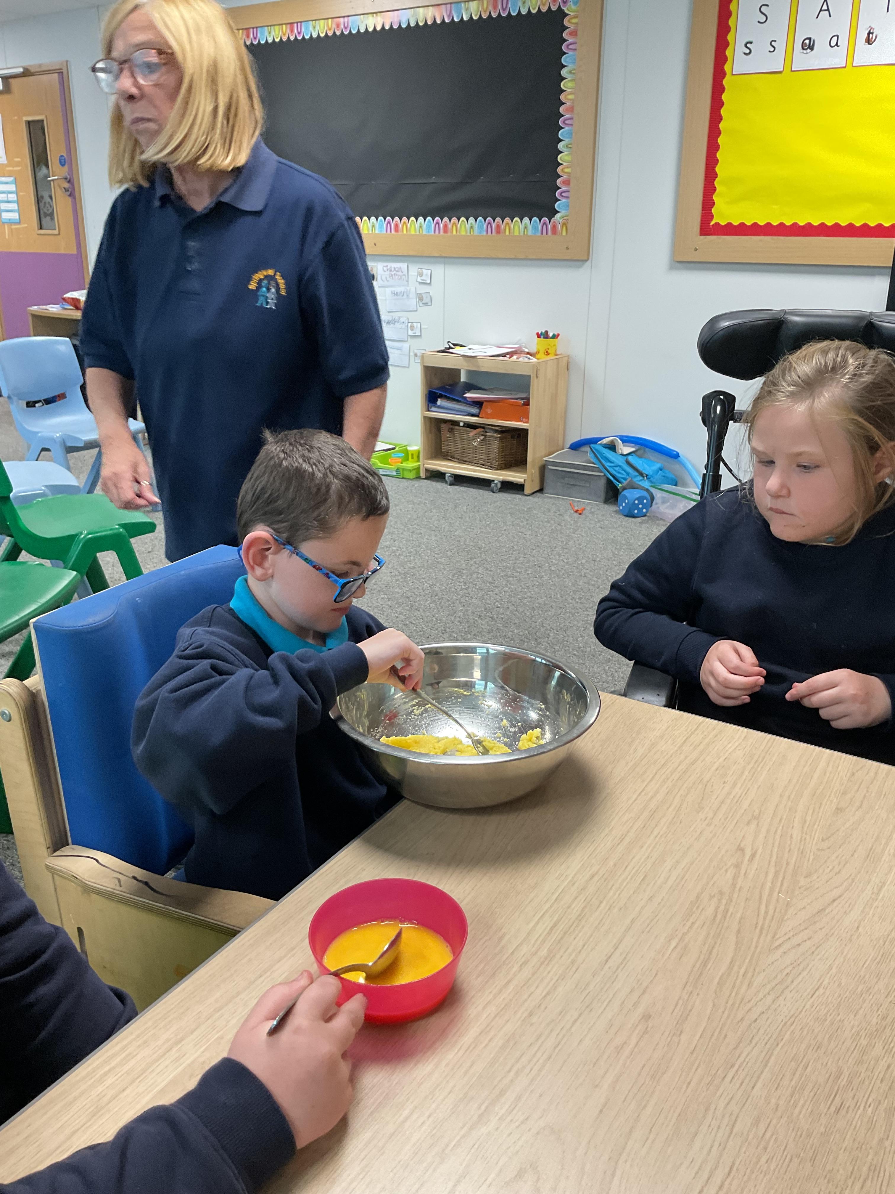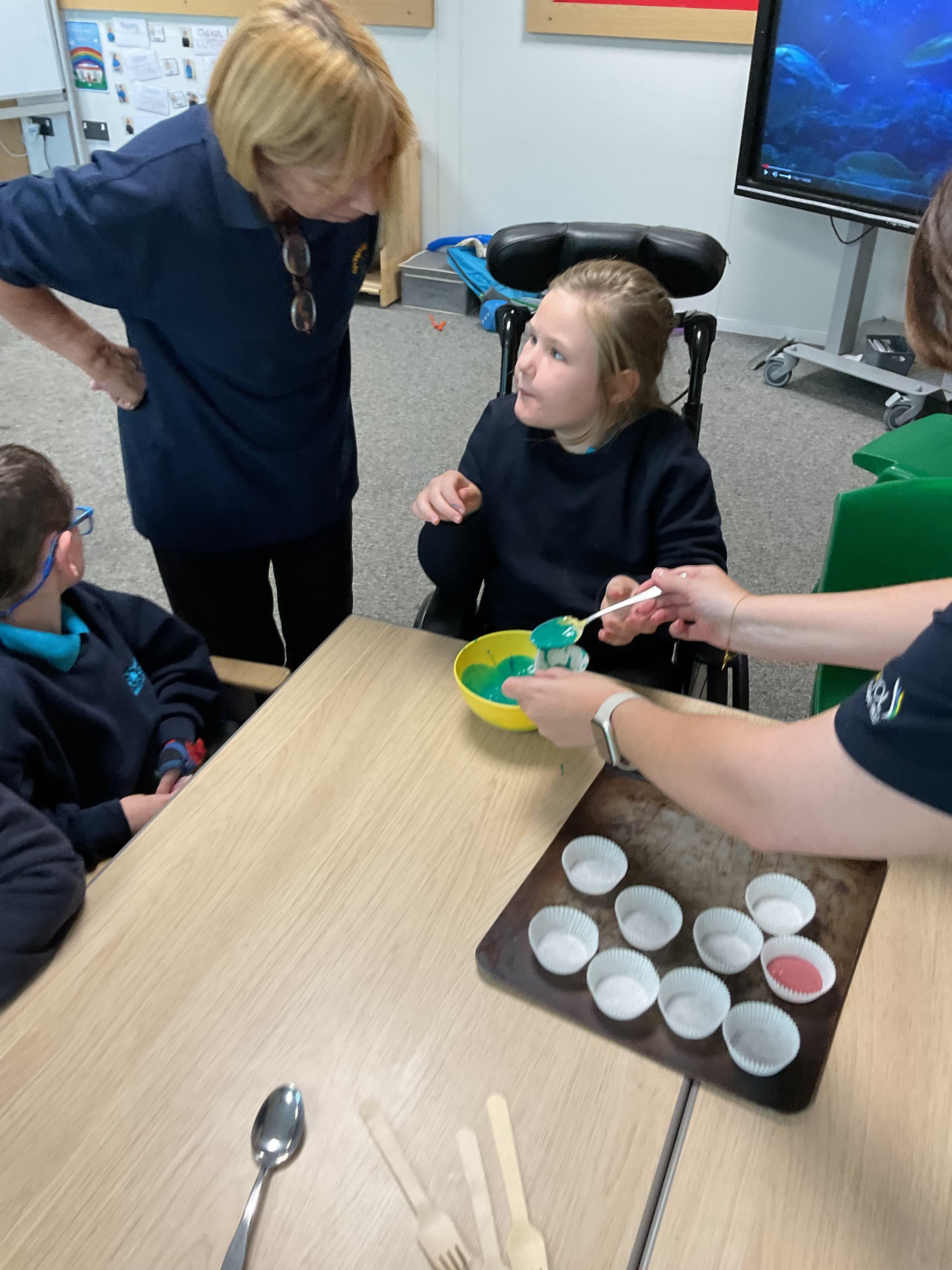 Pandas enjoyed DT with Annette this week. They worked together to make rainbow cakes by measuring out the ingredients and mixing them altogether.