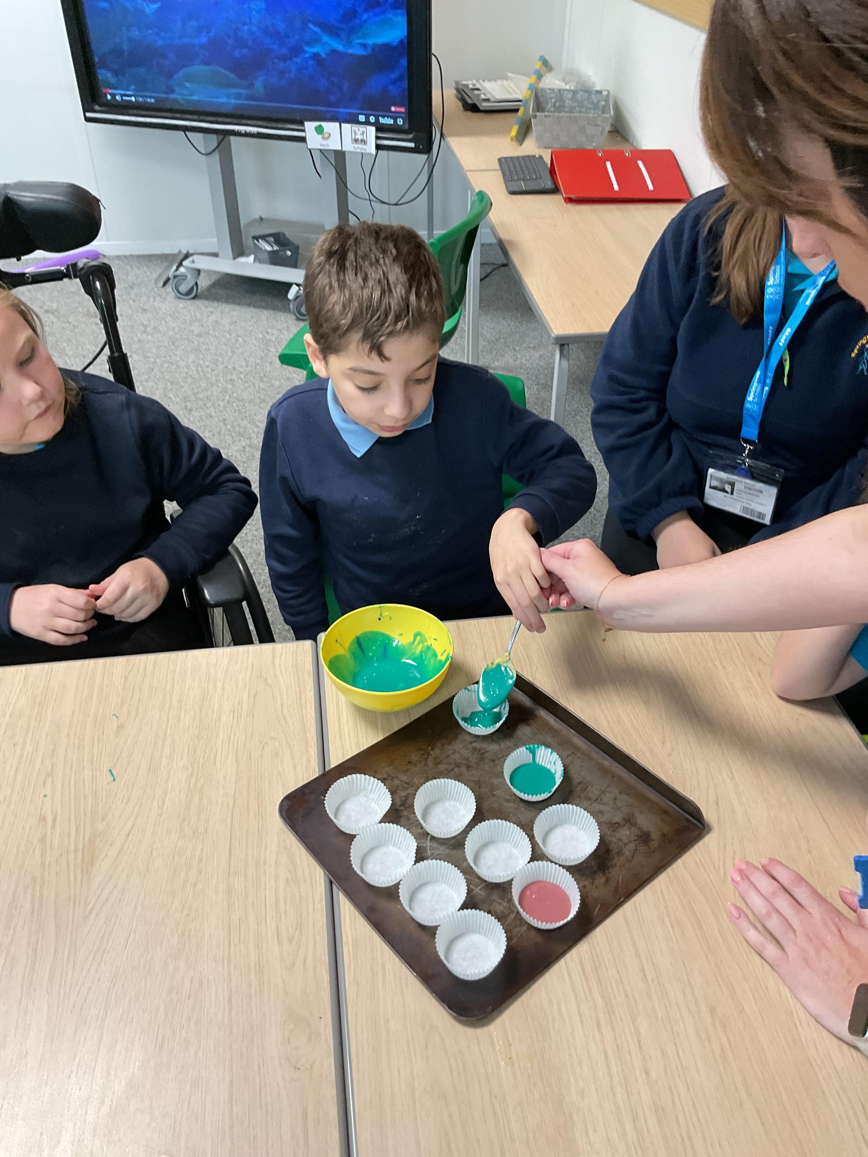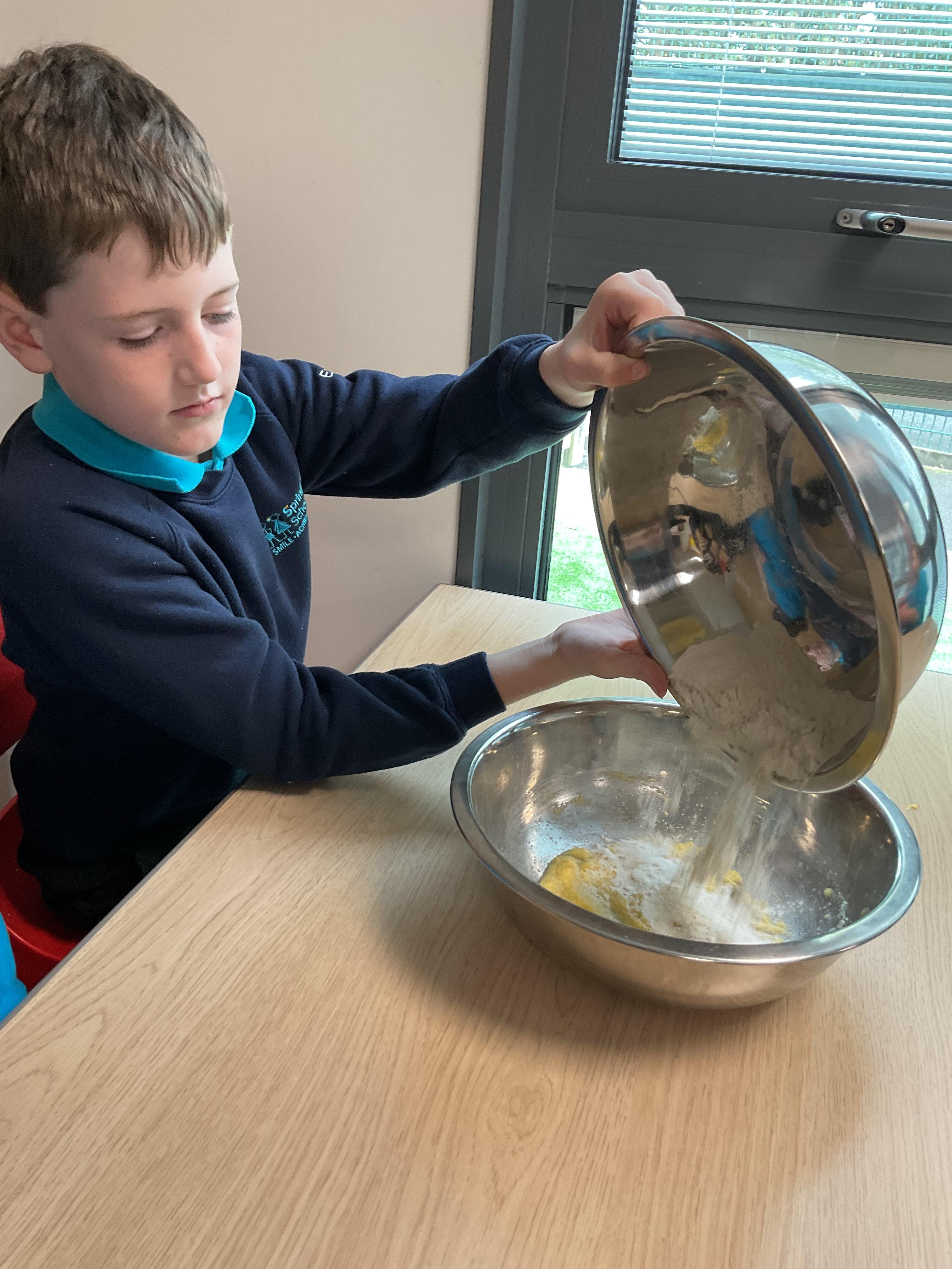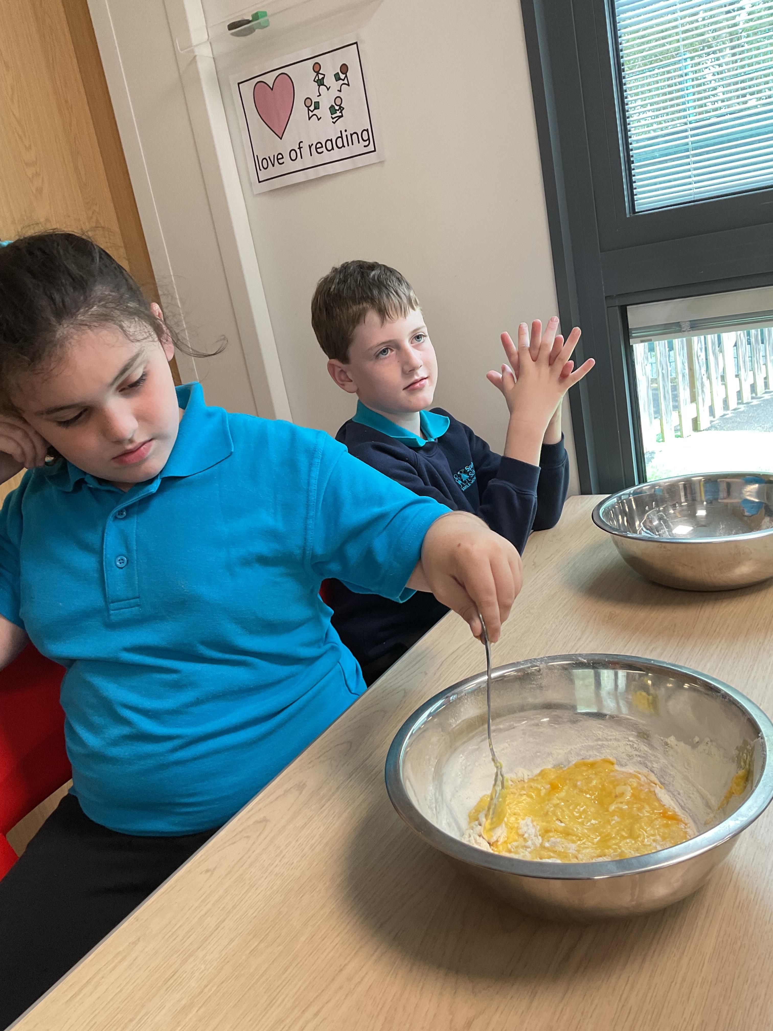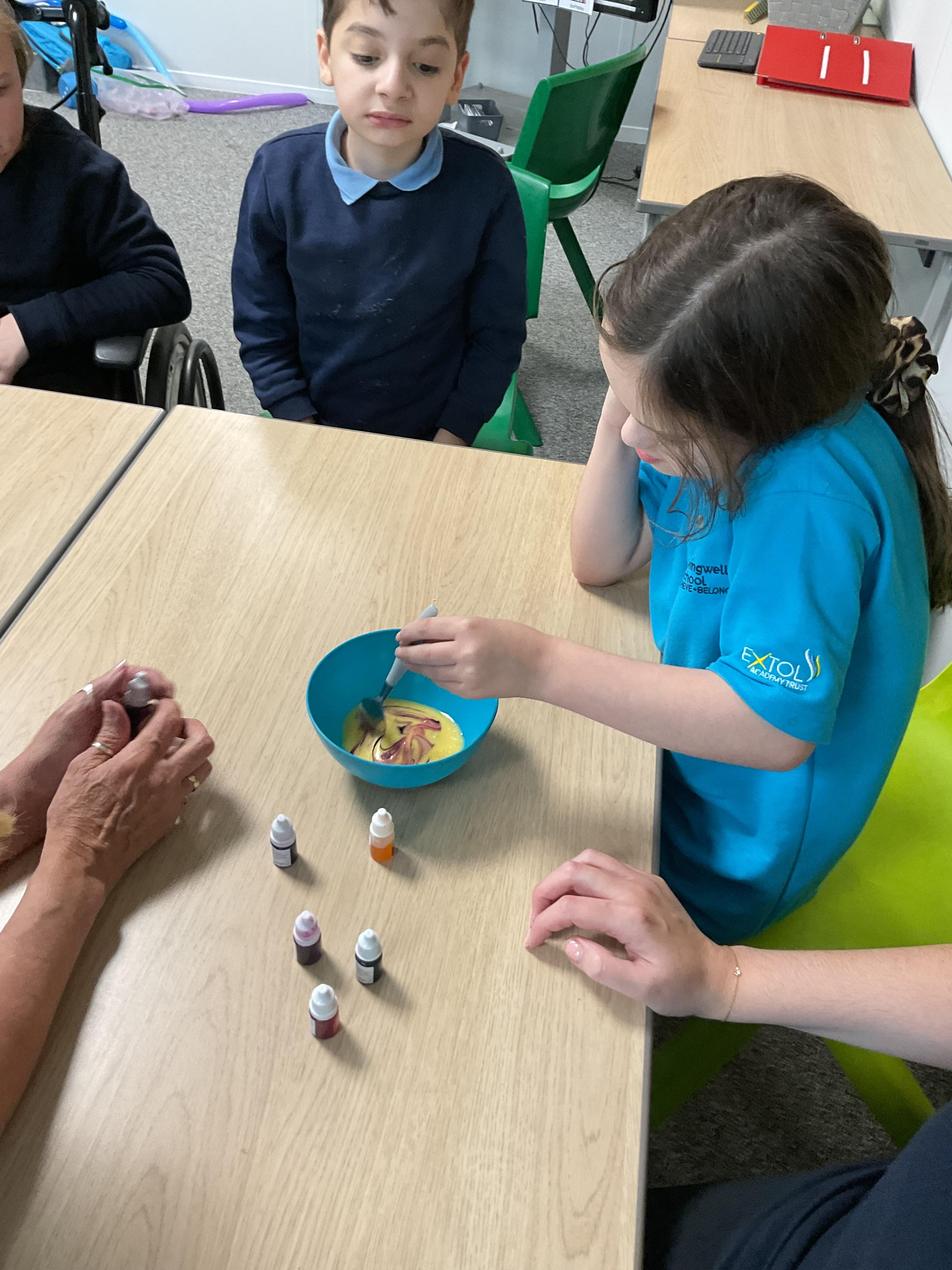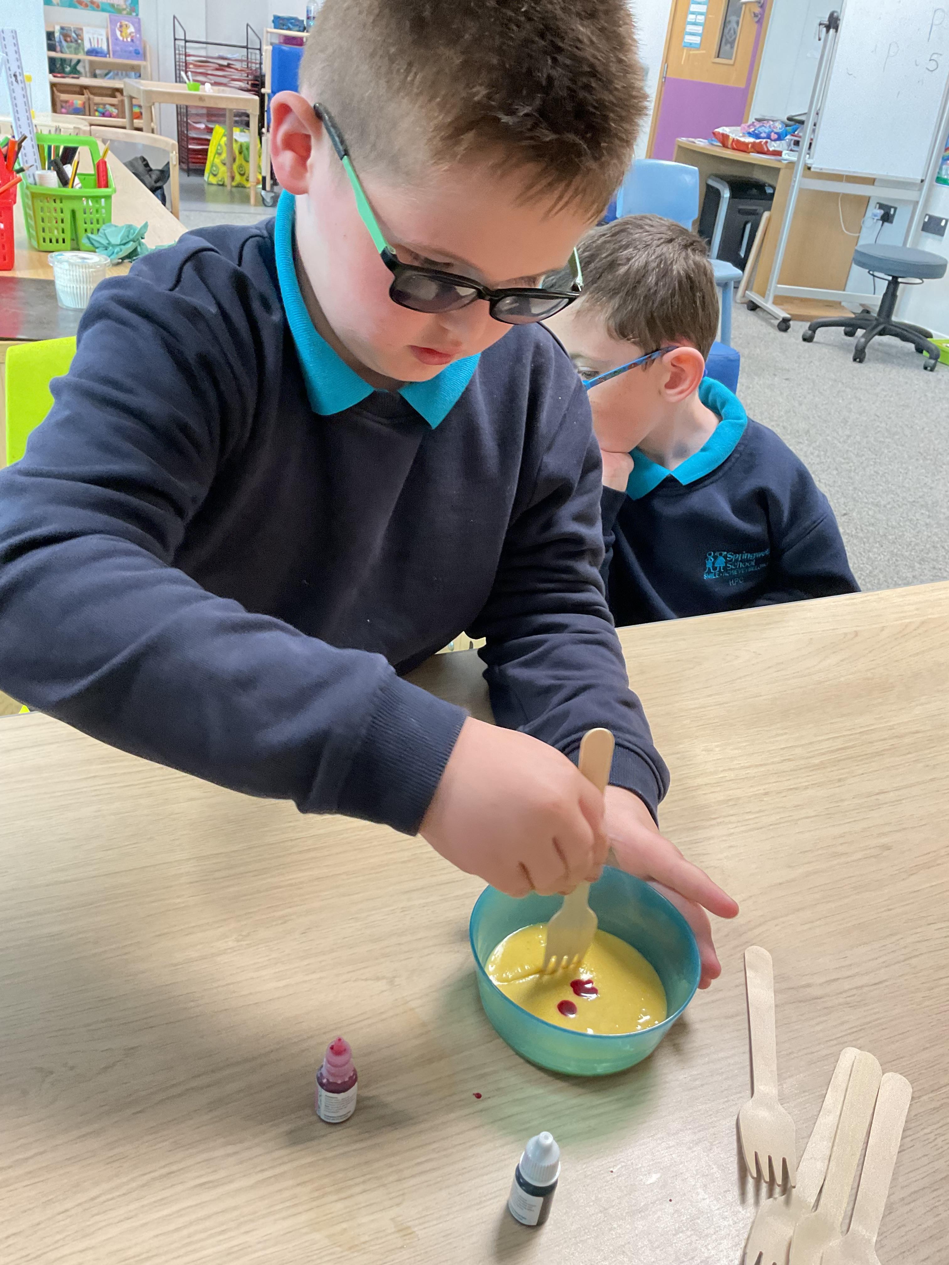 Pandas enjoyed DT with Annette this week. They worked together to make rainbow cakes by measuring out the ingredients and mixing them altogether.