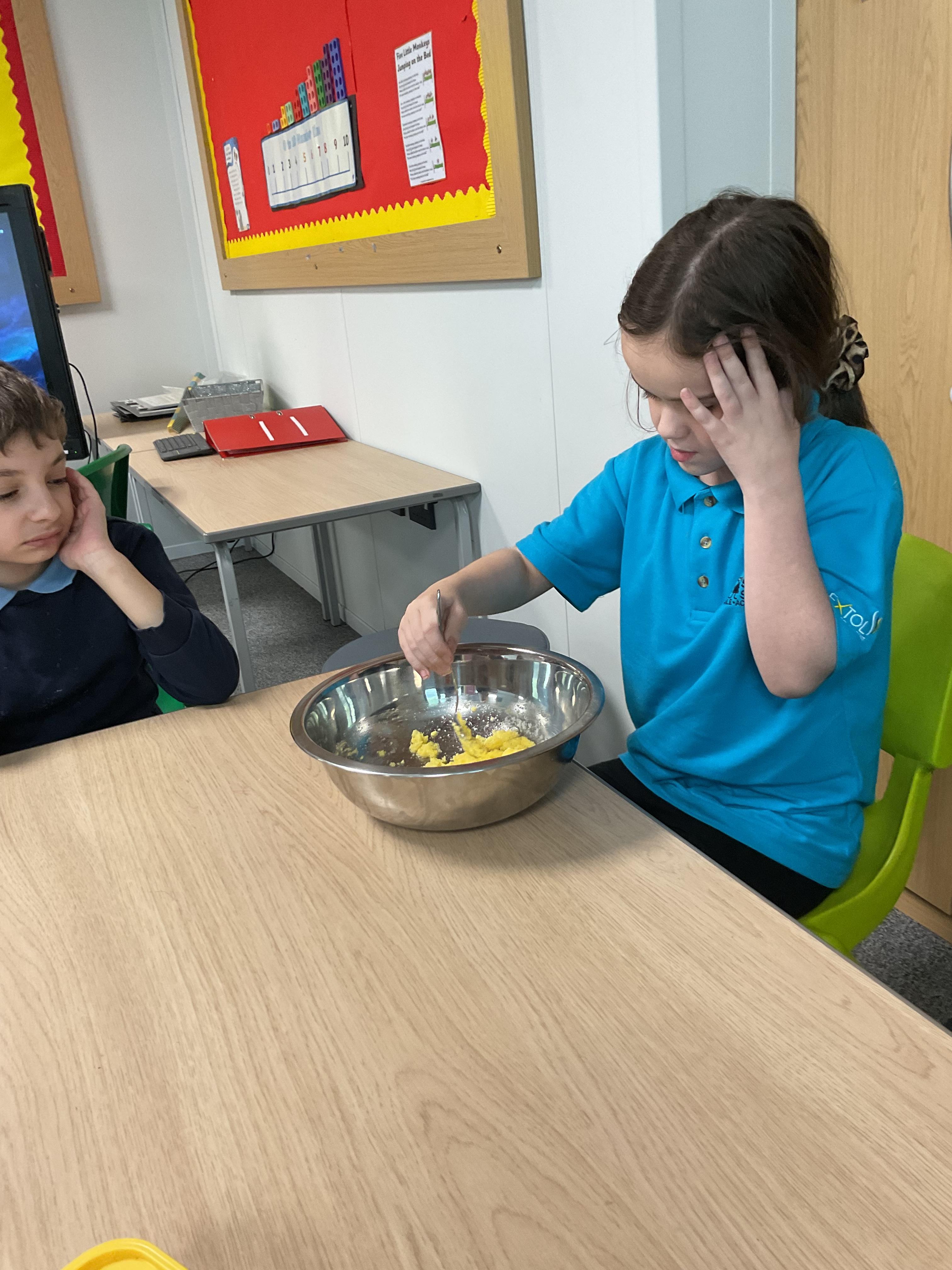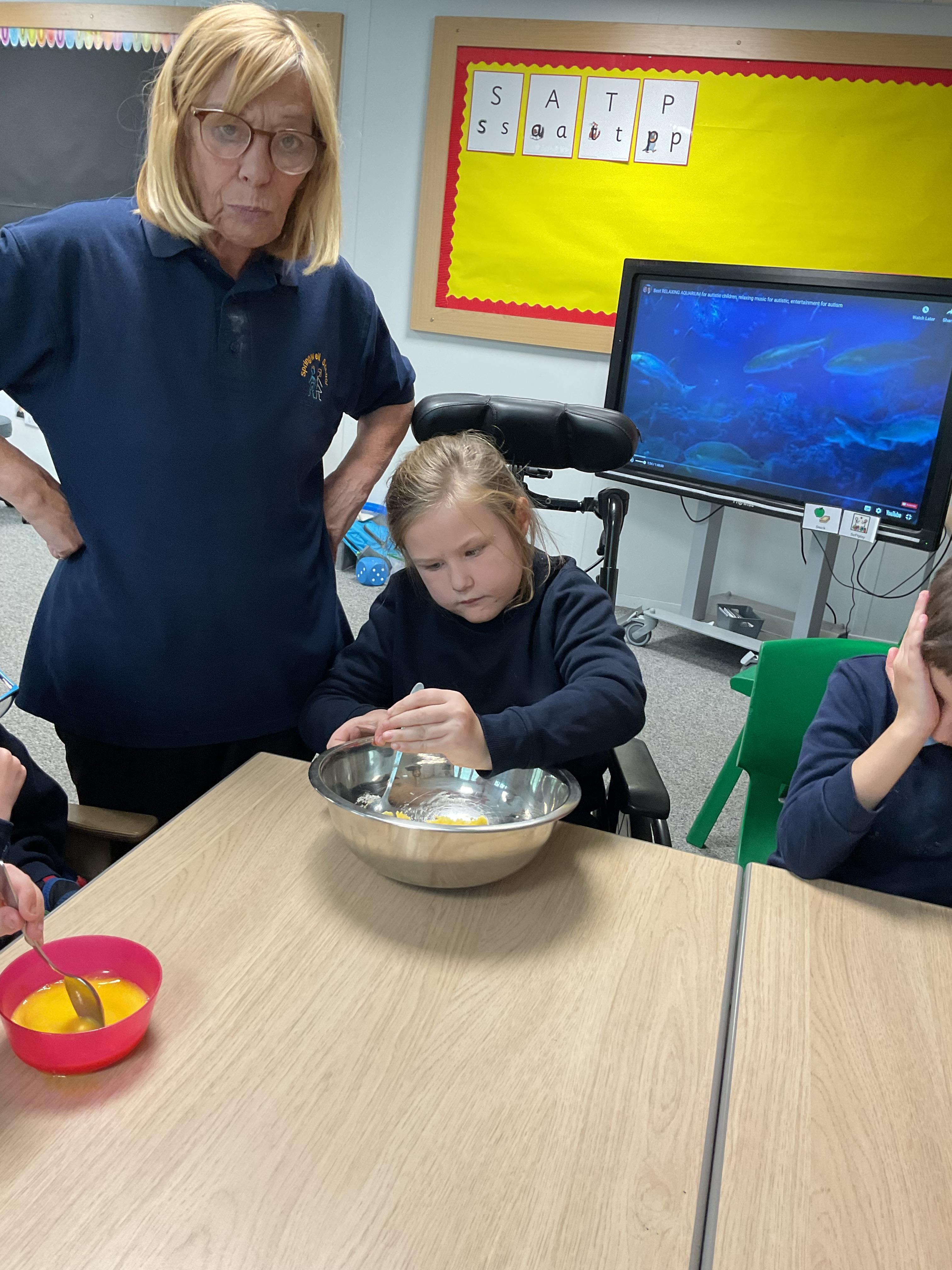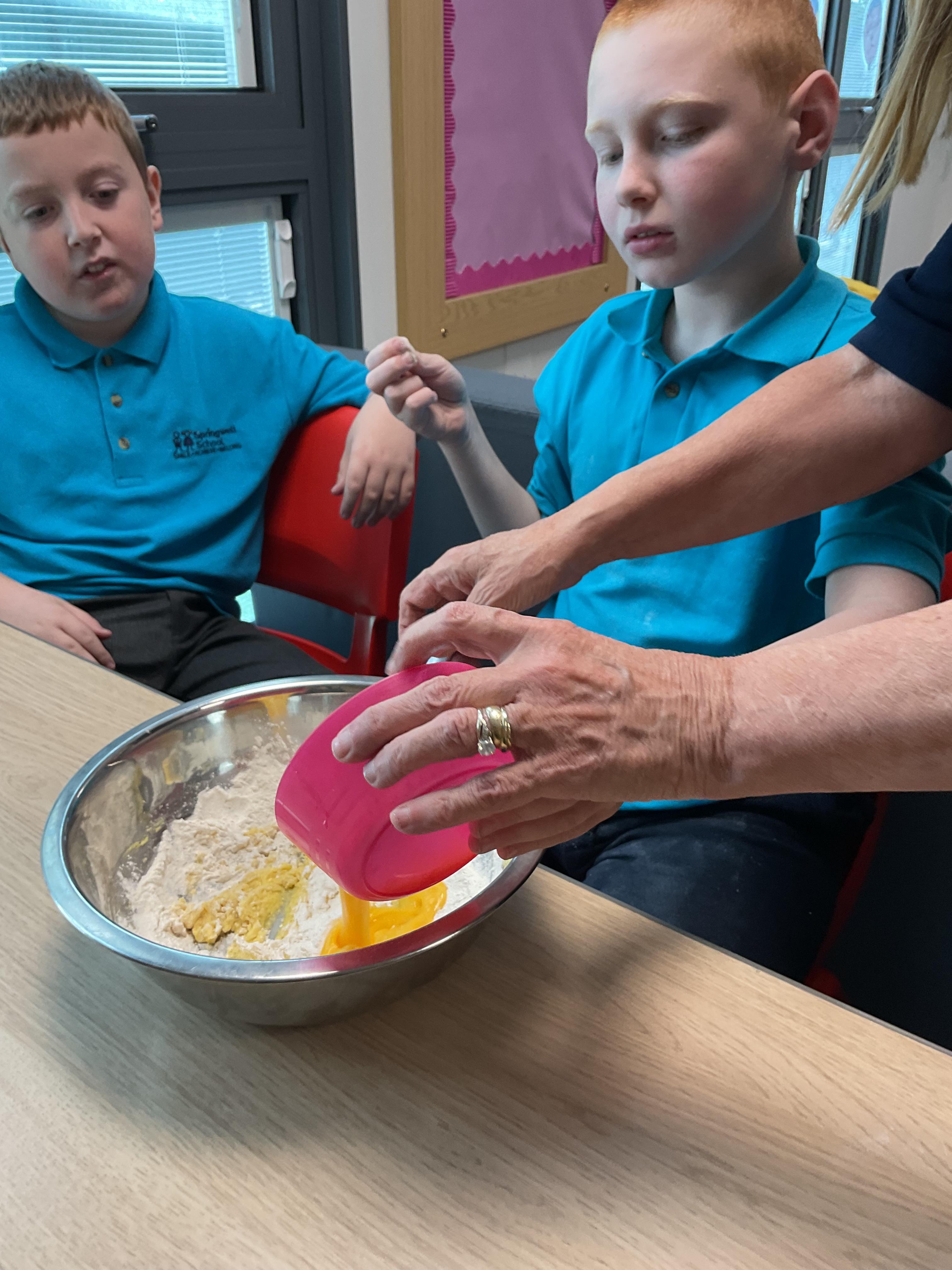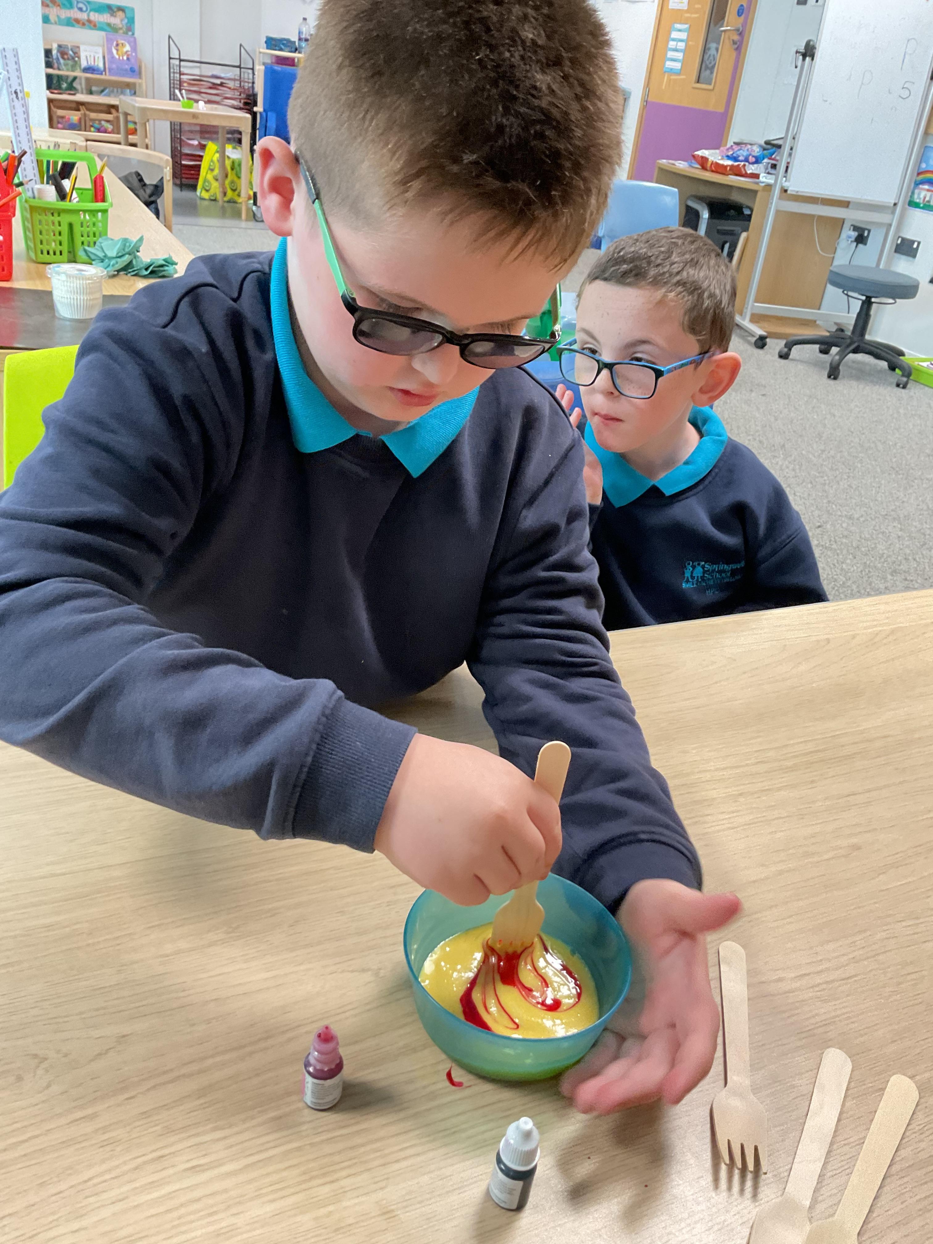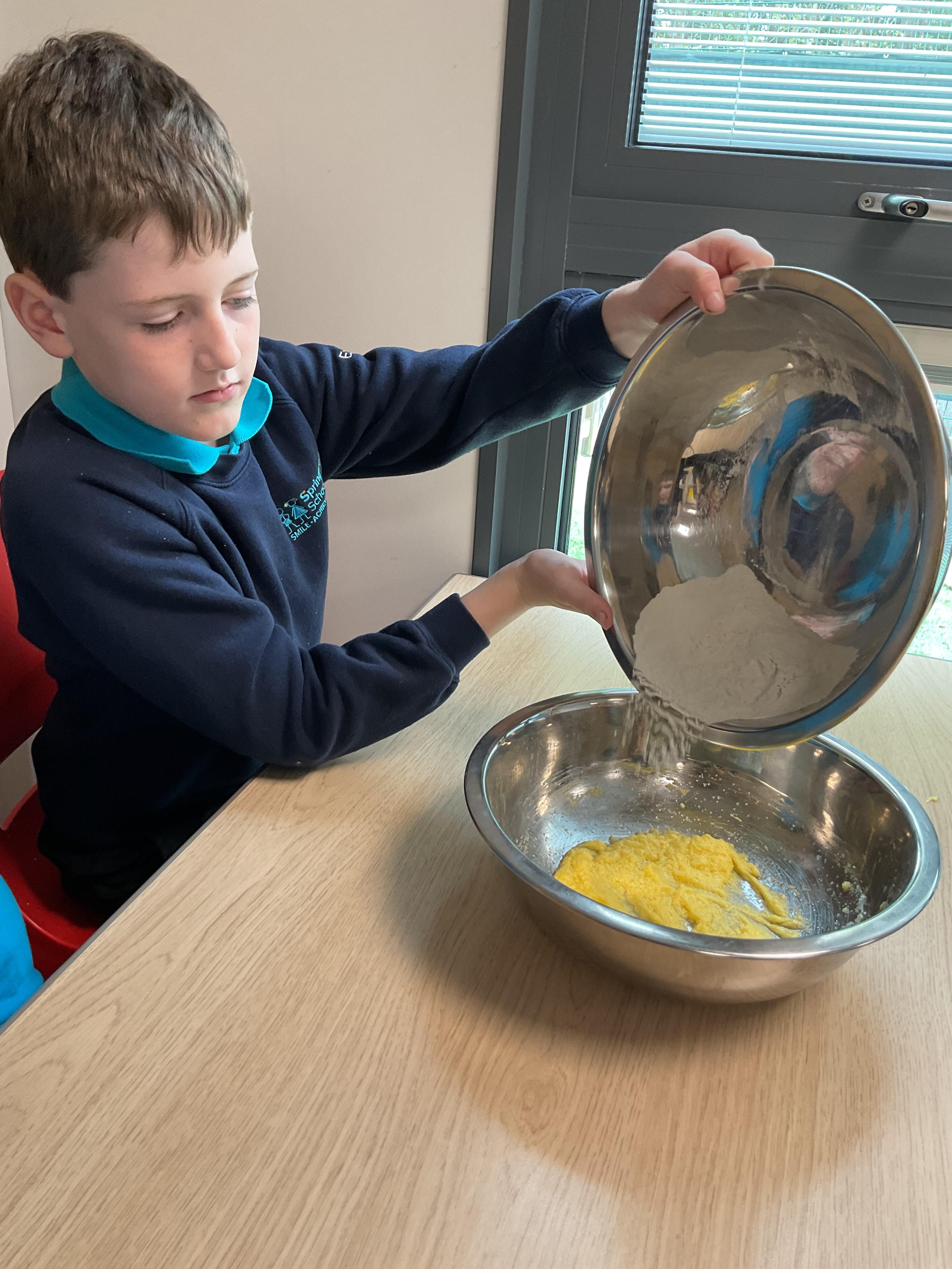 Pandas enjoyed DT with Annette this week. They worked together to make rainbow cakes by measuring out the ingredients and mixing them altogether.